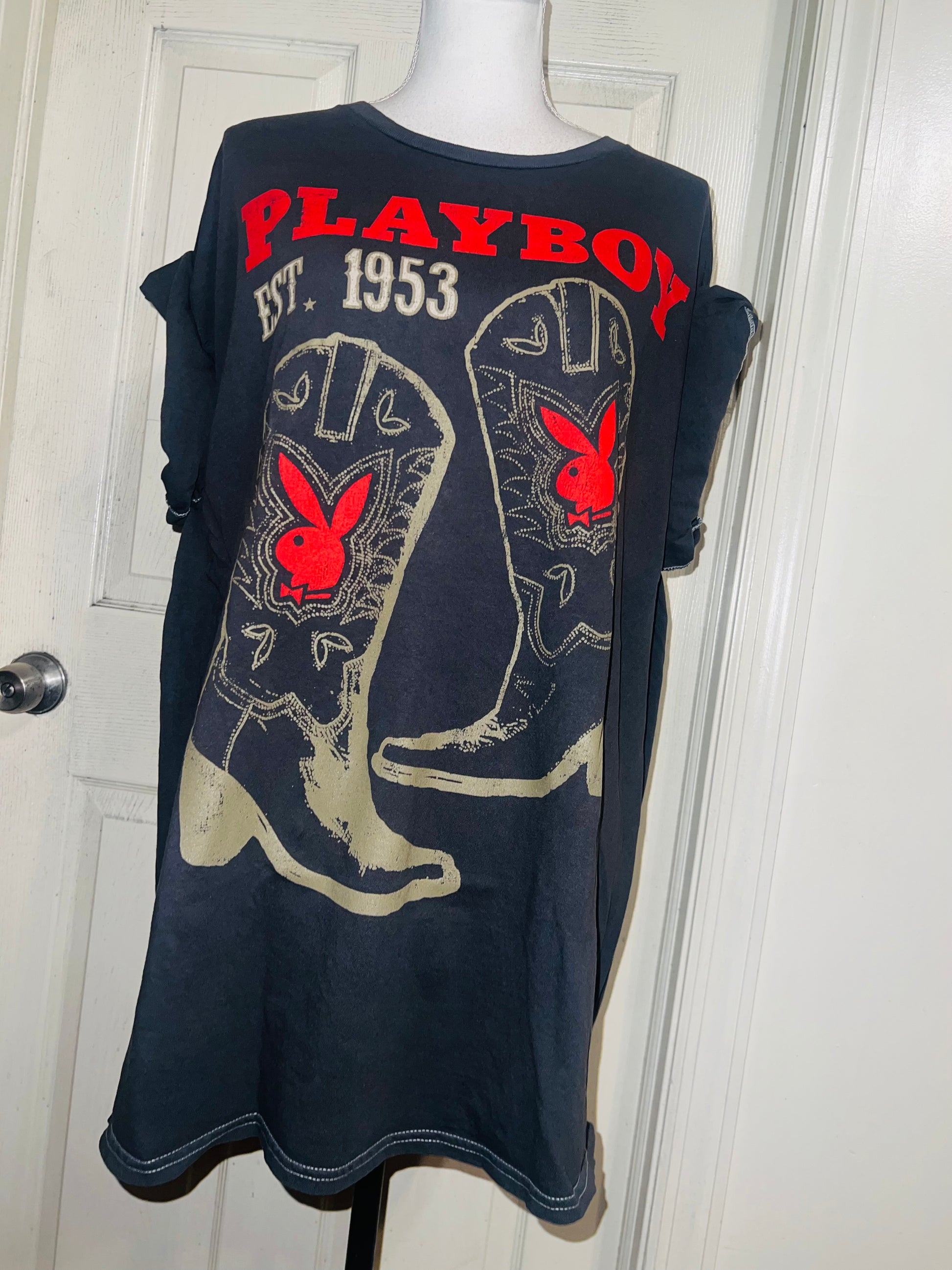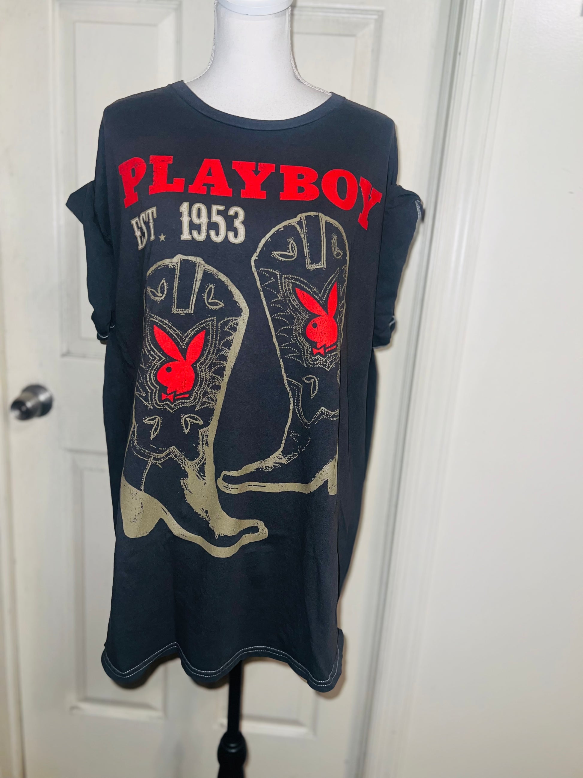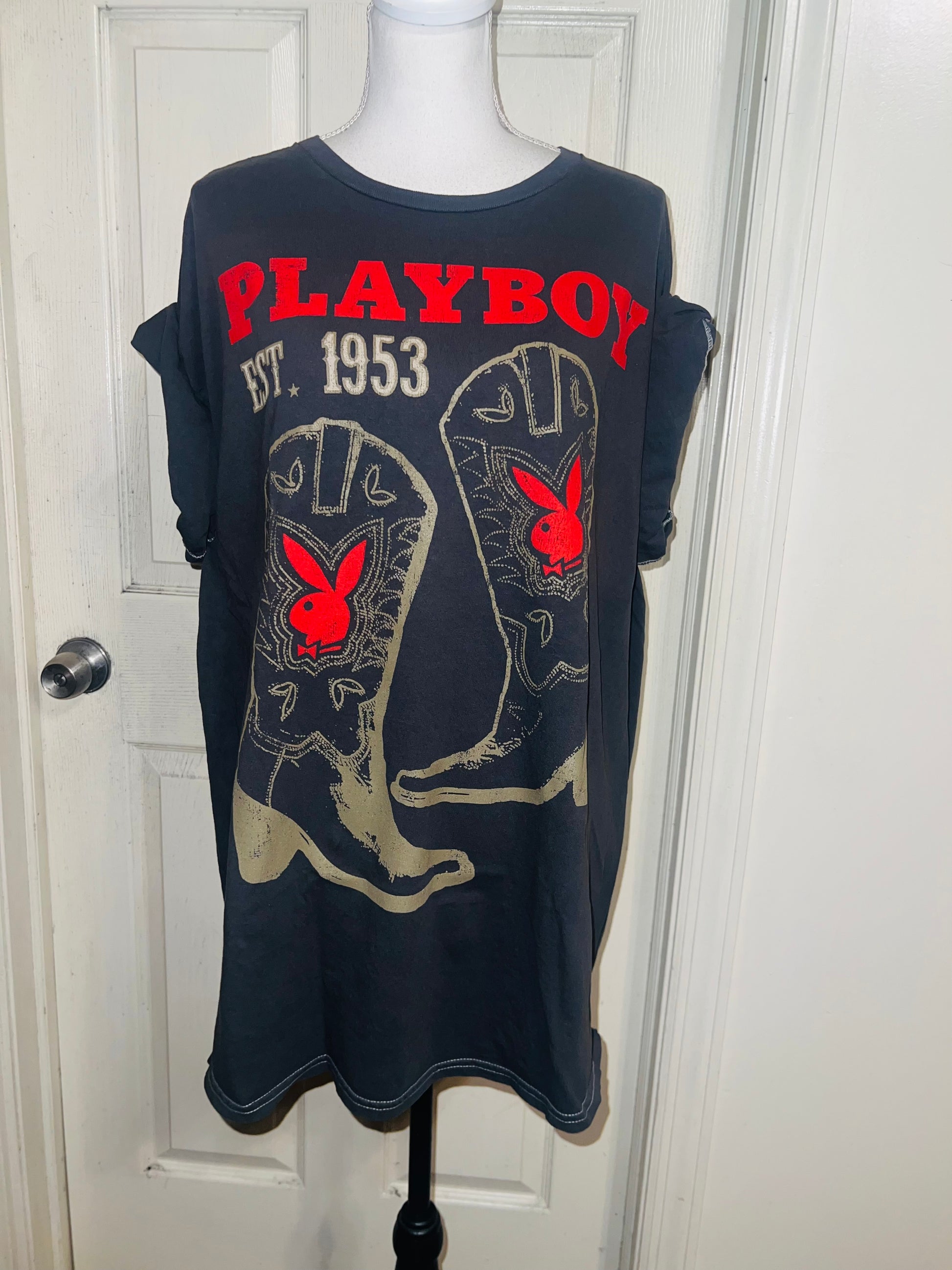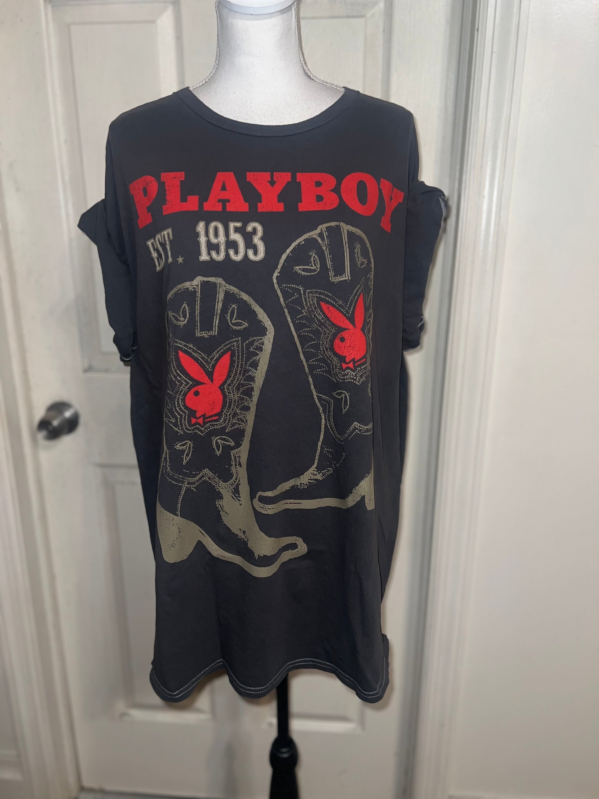 This is now a preorder. Please allow extra processing time. A dark charcoal grey Playboy tee with cowboy boots with bunnies and 1953. Size 1X, oversized.