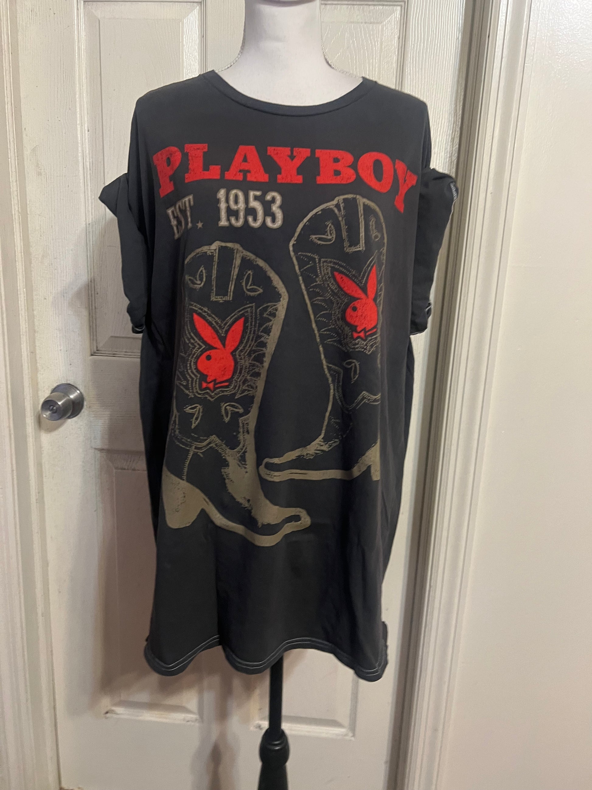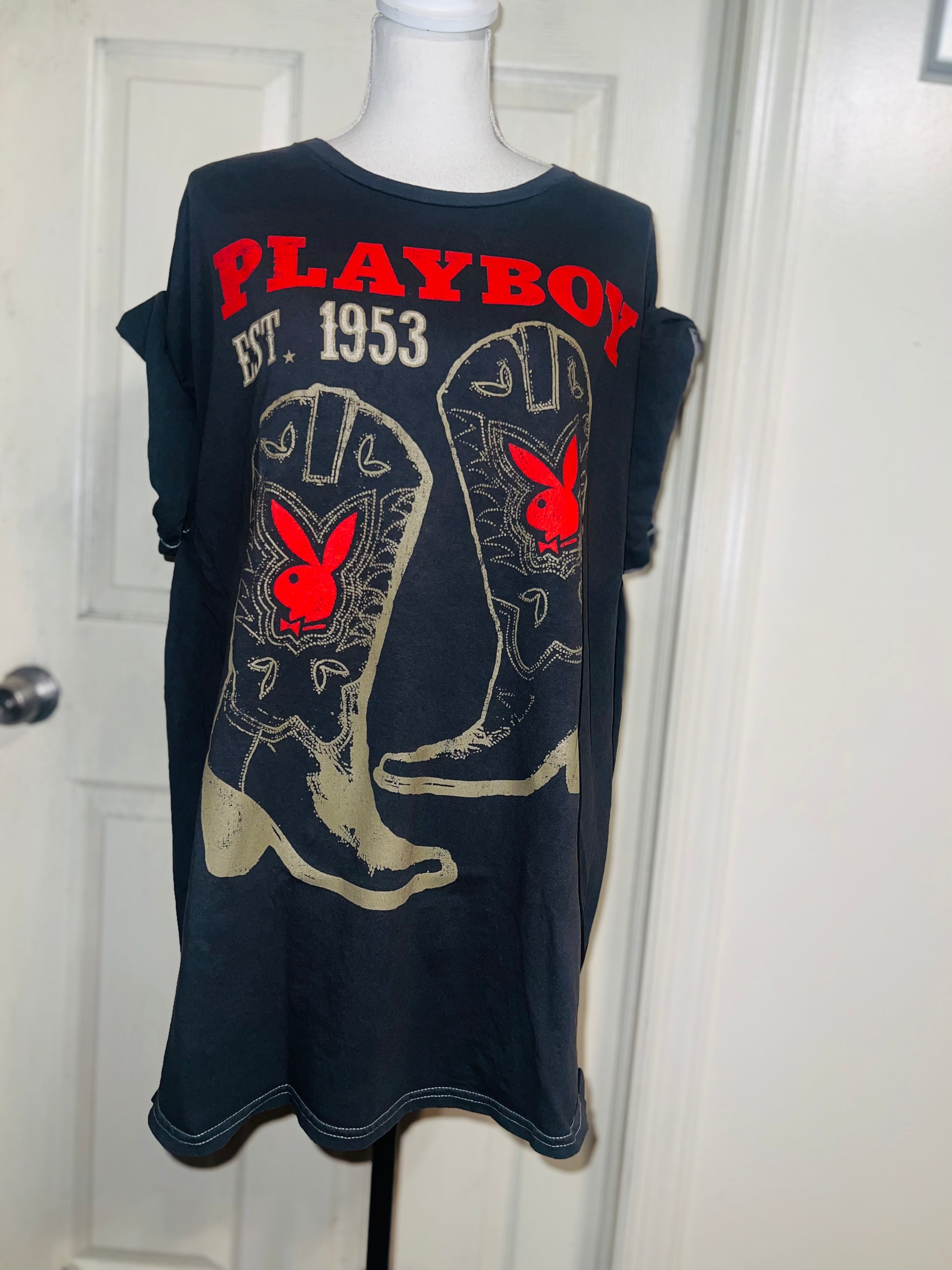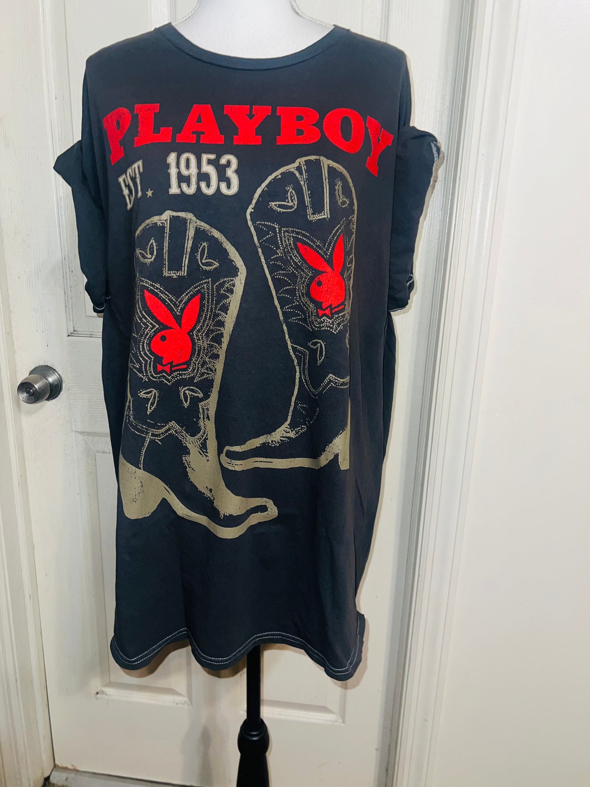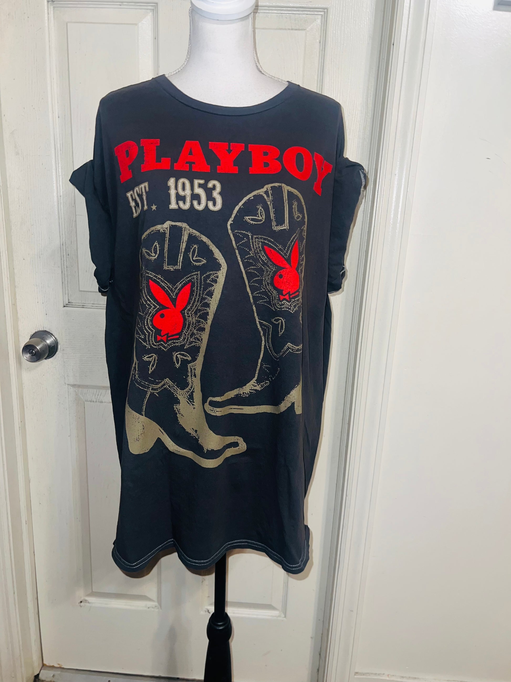 This is now a preorder. Please allow extra processing time. A dark charcoal grey Playboy tee with cowboy boots with bunnies and 1953. Size 1X, oversized.