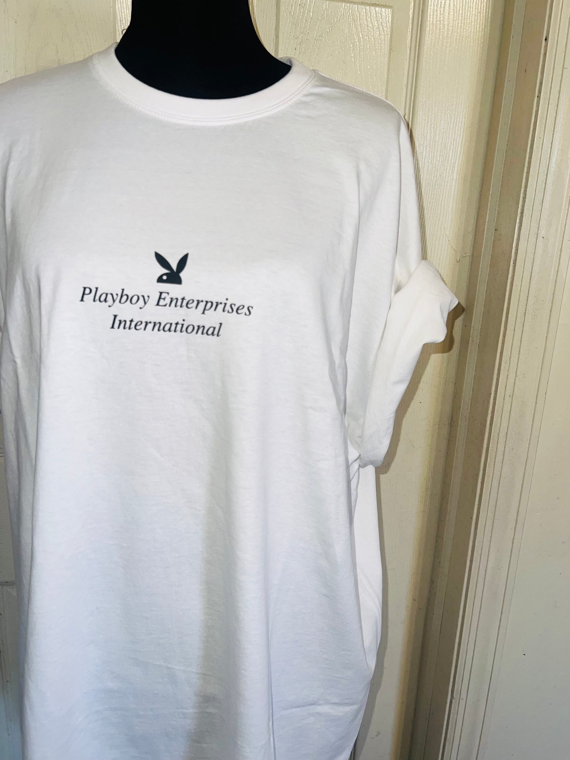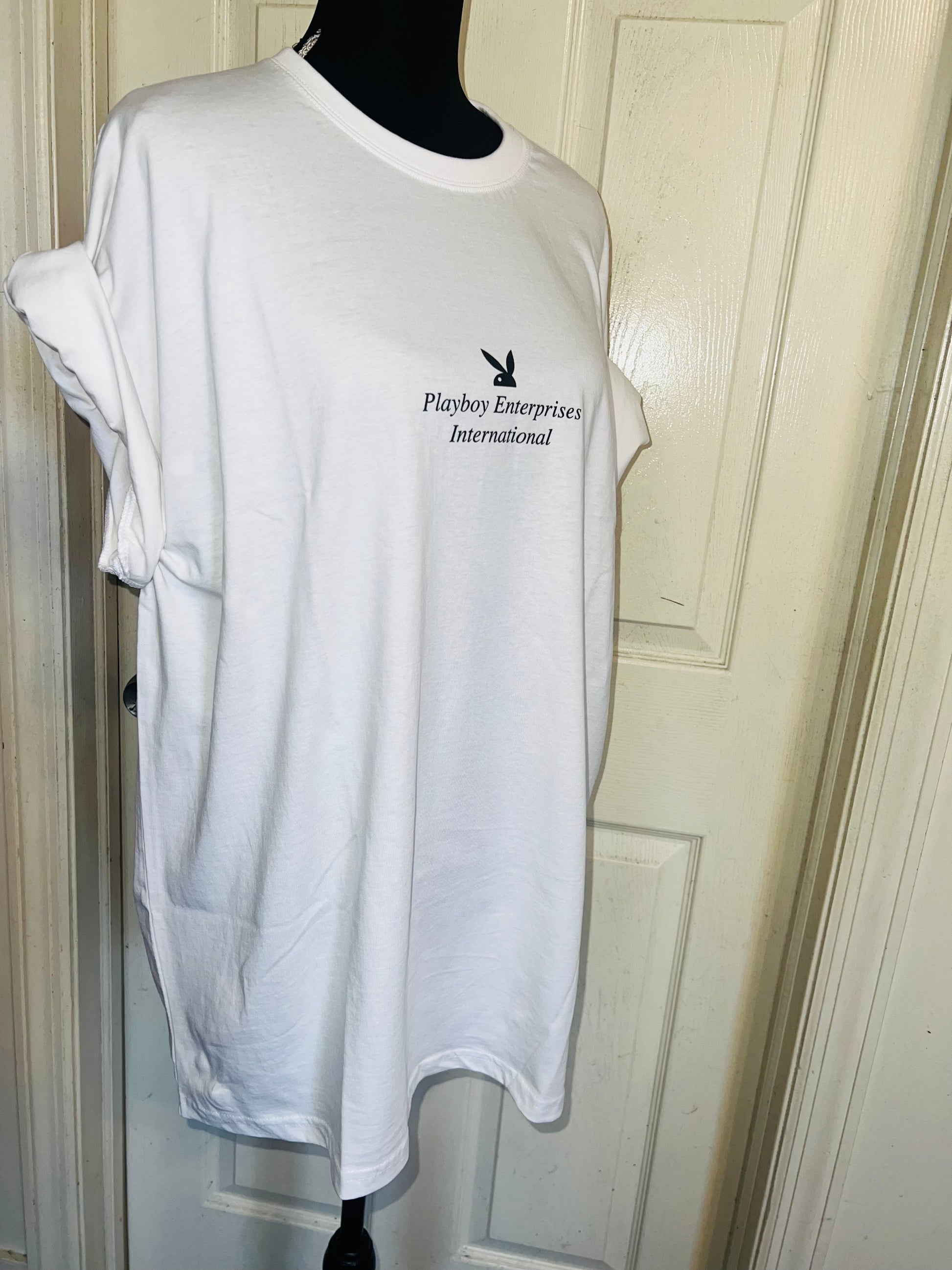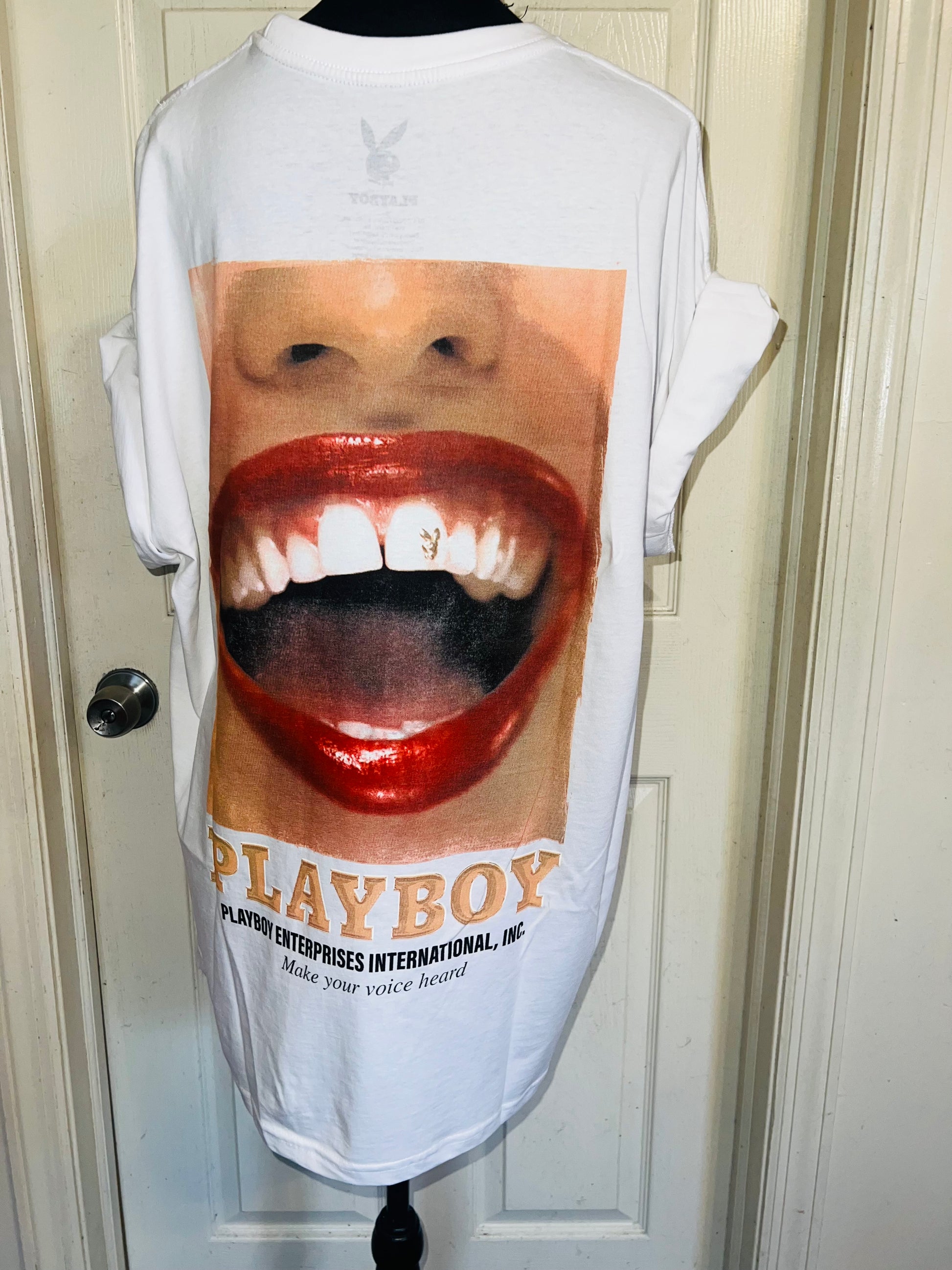 A white Playboy double sided tee with a sick photo of a model screaming with the quote “Make your voices heard.” Size L/XL, oversized.