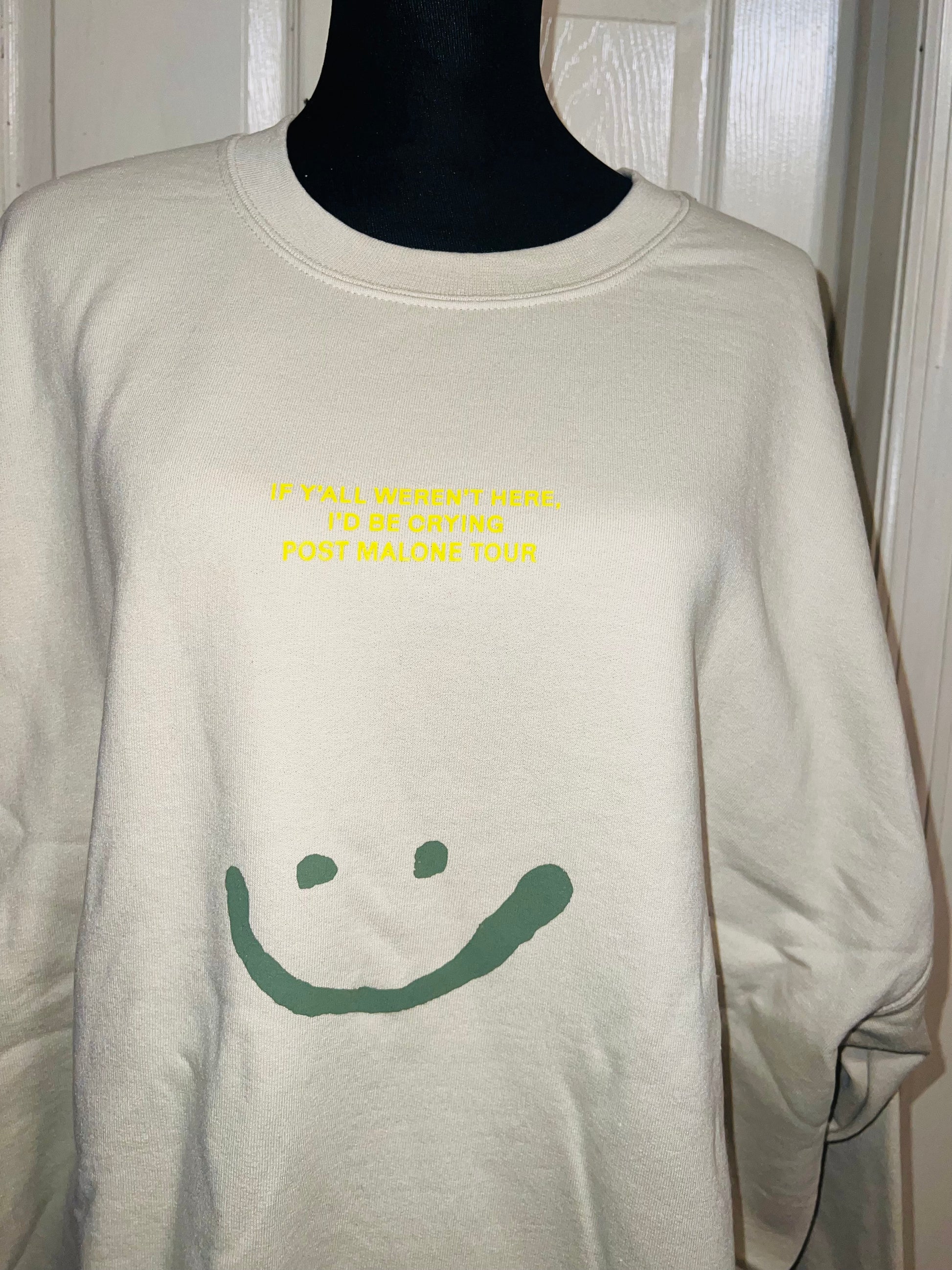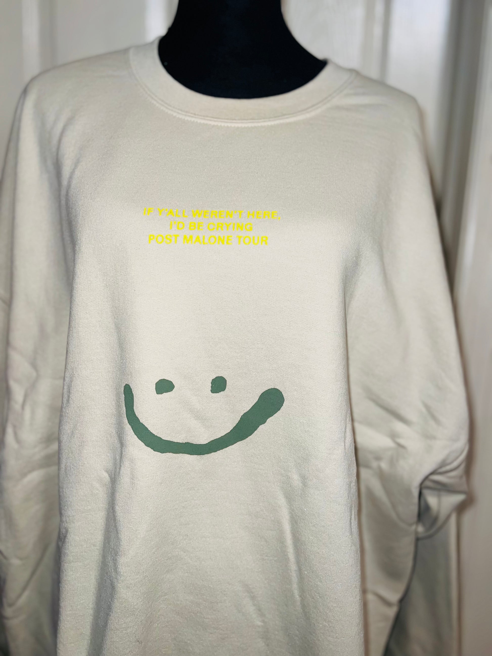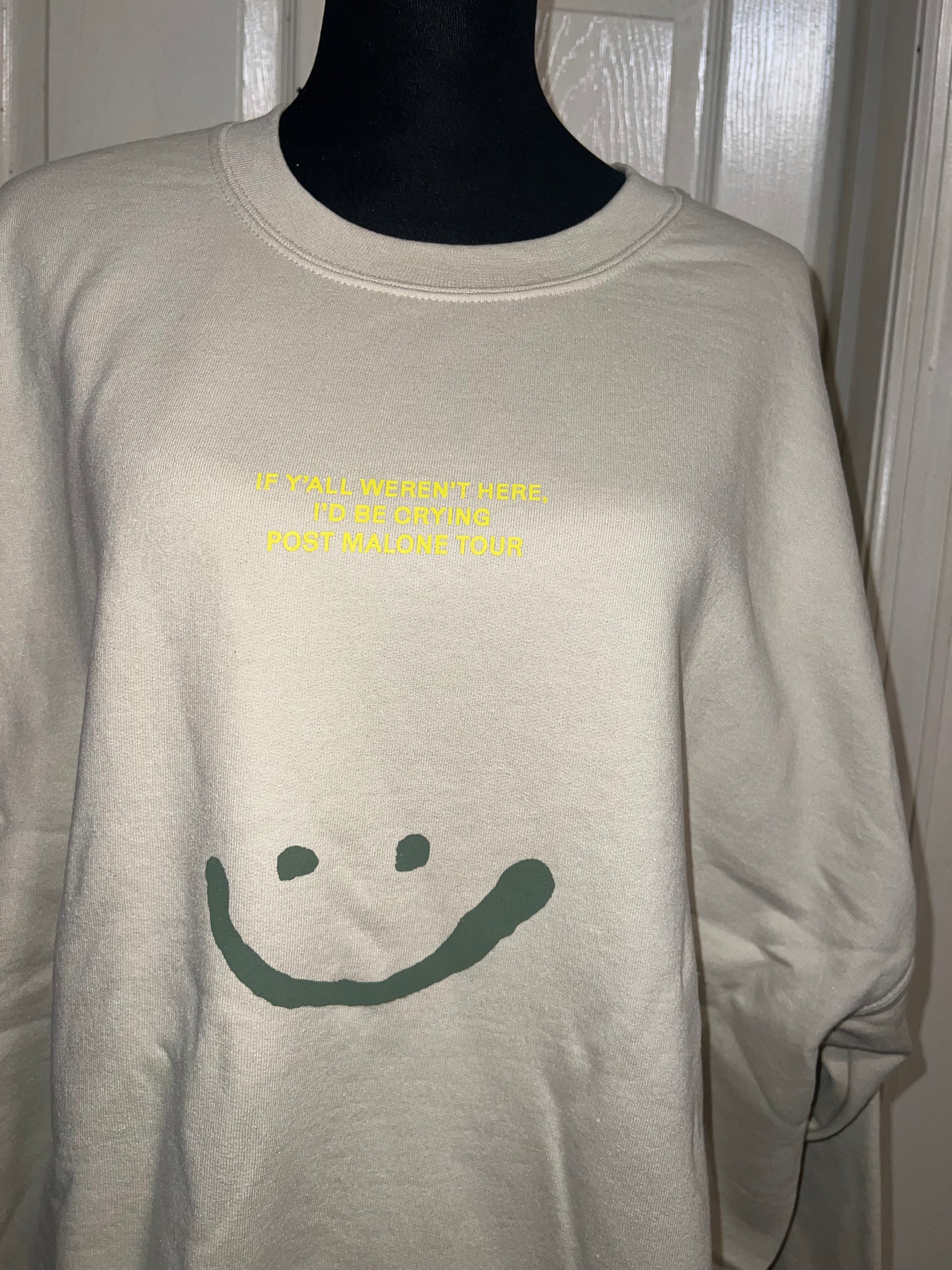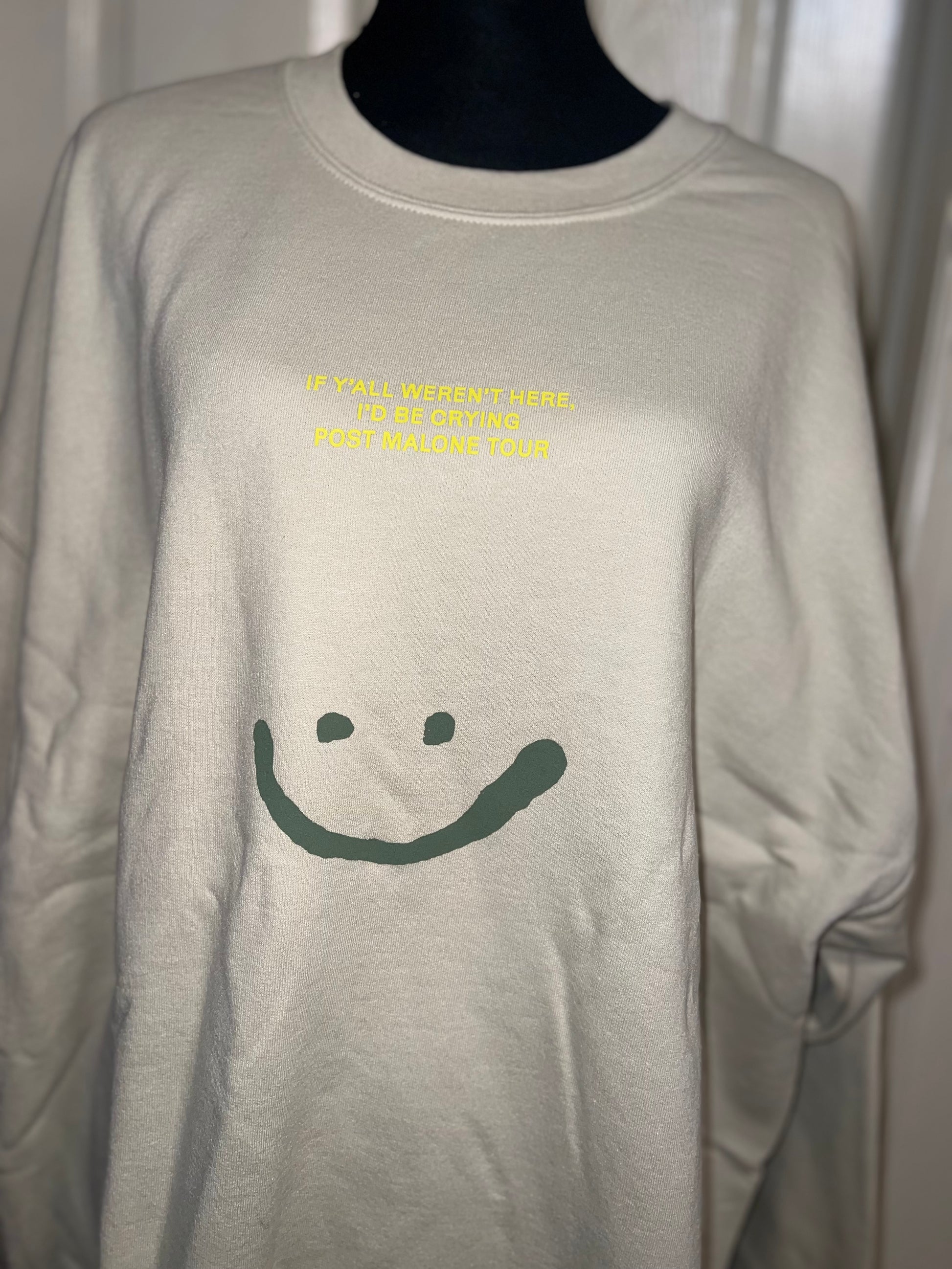 This is now a preorder. Please allow extra processing time. A beige/tan Post Malone tour sweatshirt. “If yall weren’t here, I’d be crying.” On the back has the usual Post Malone graphic at the top. Size XL, oversized. SO soft and comfortable.