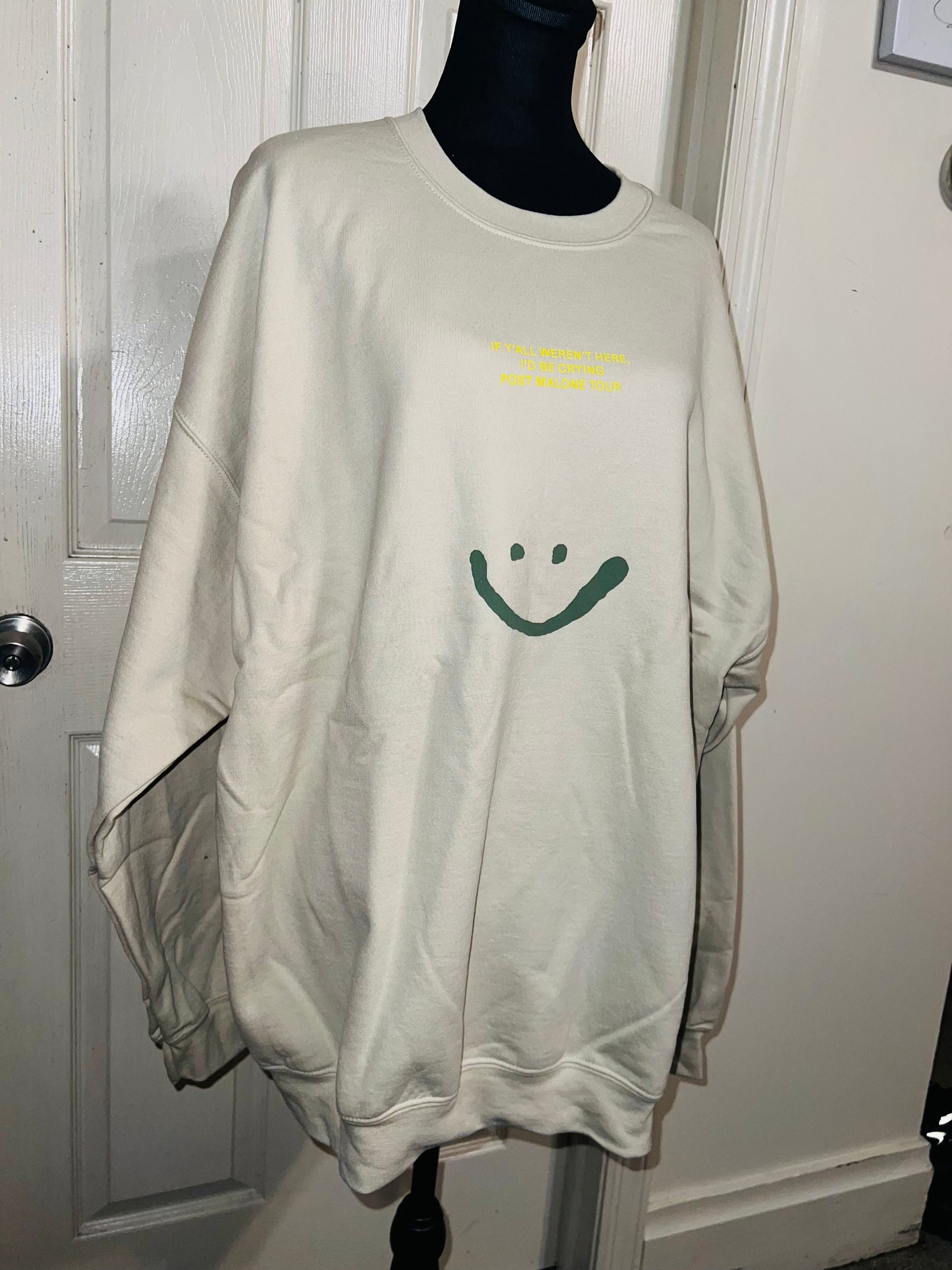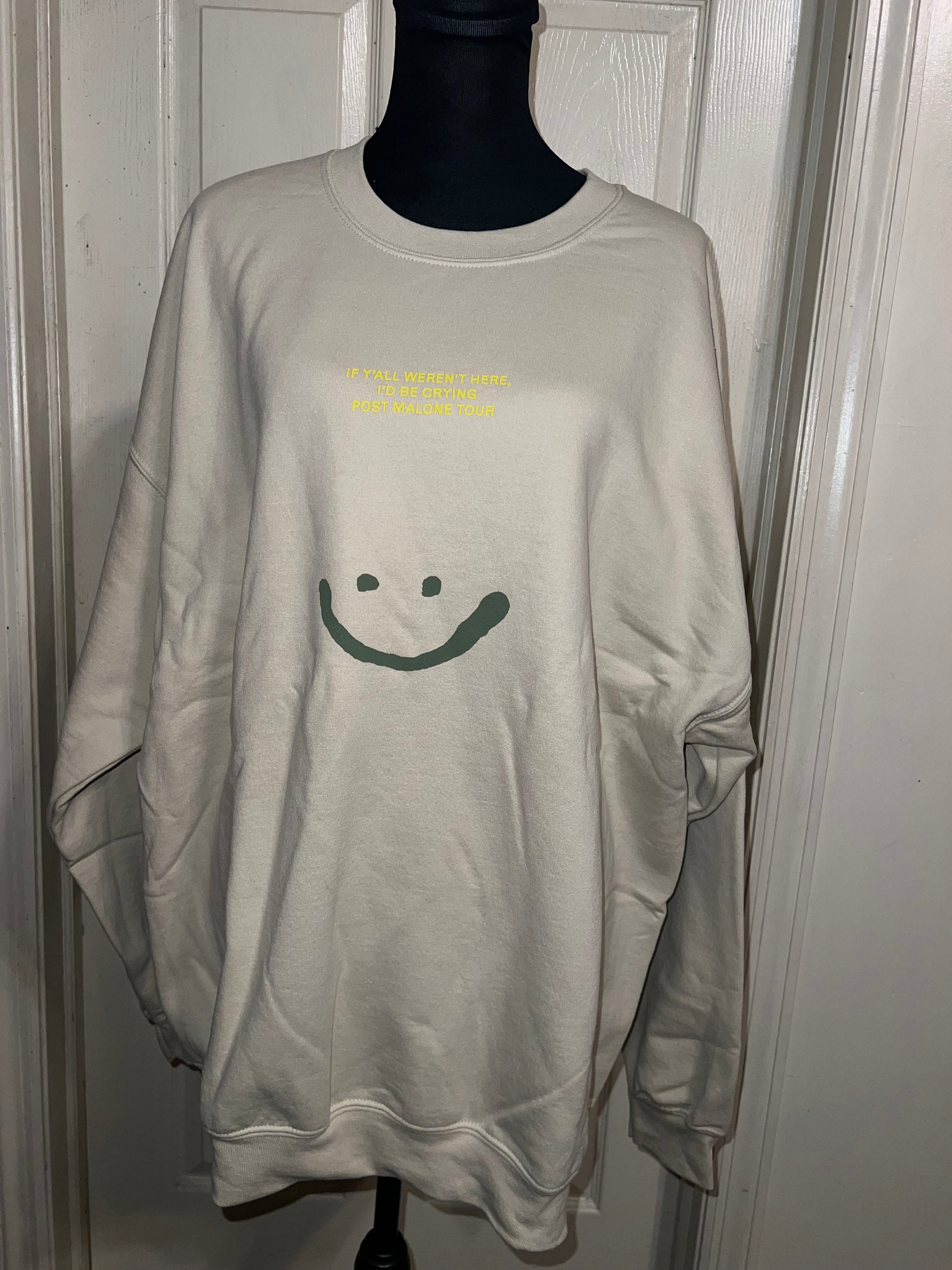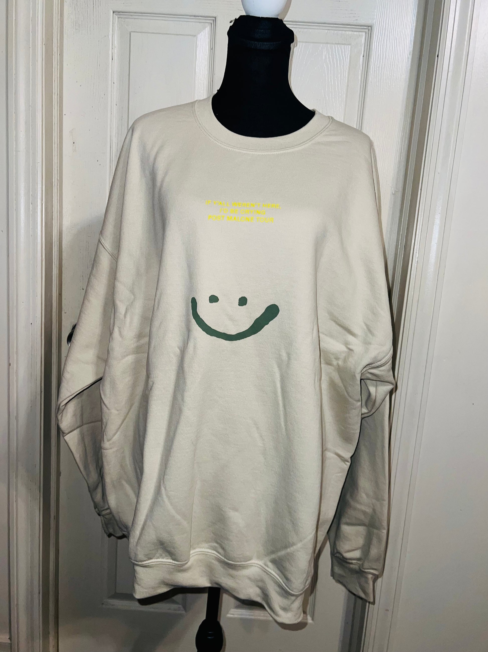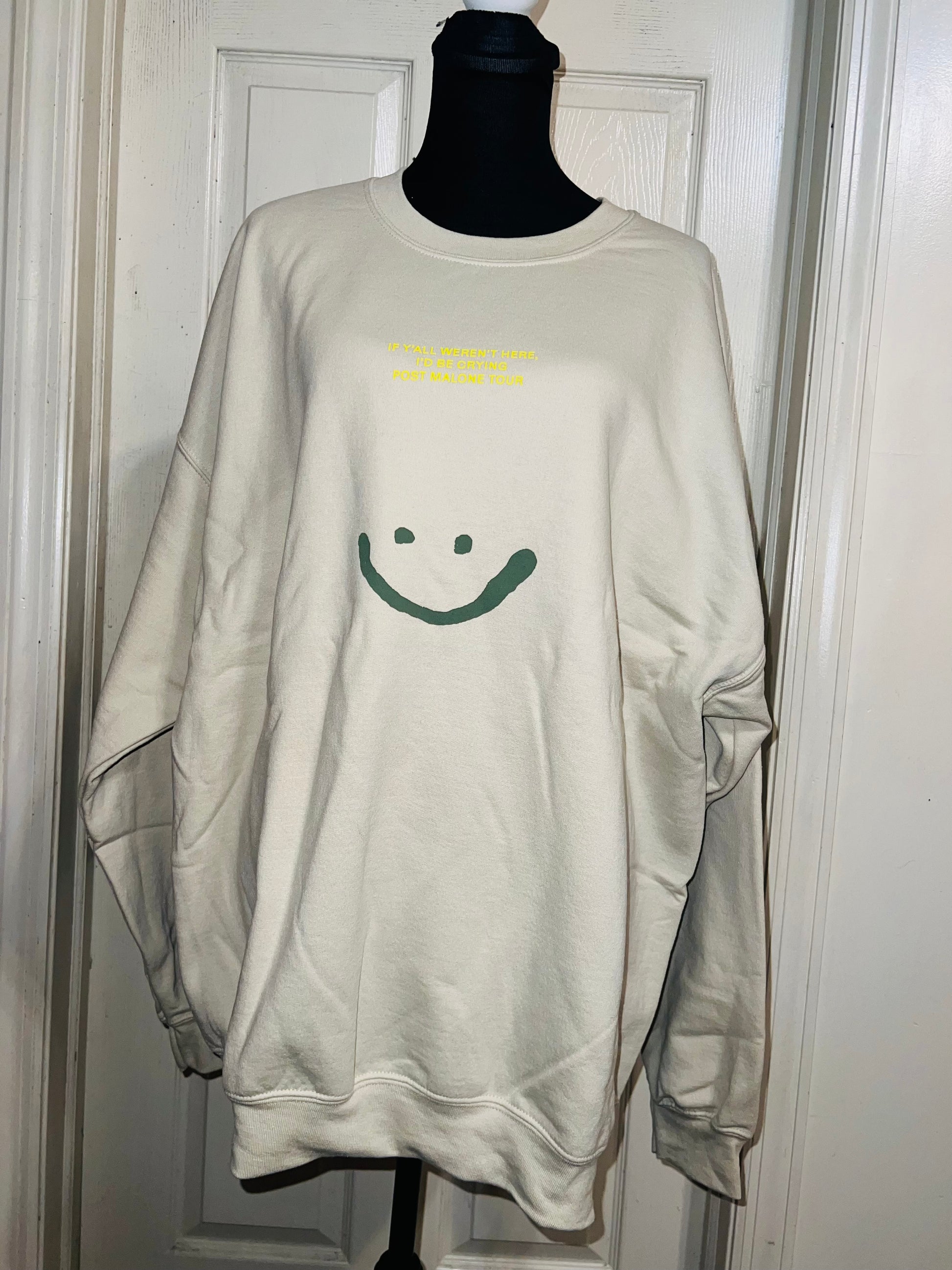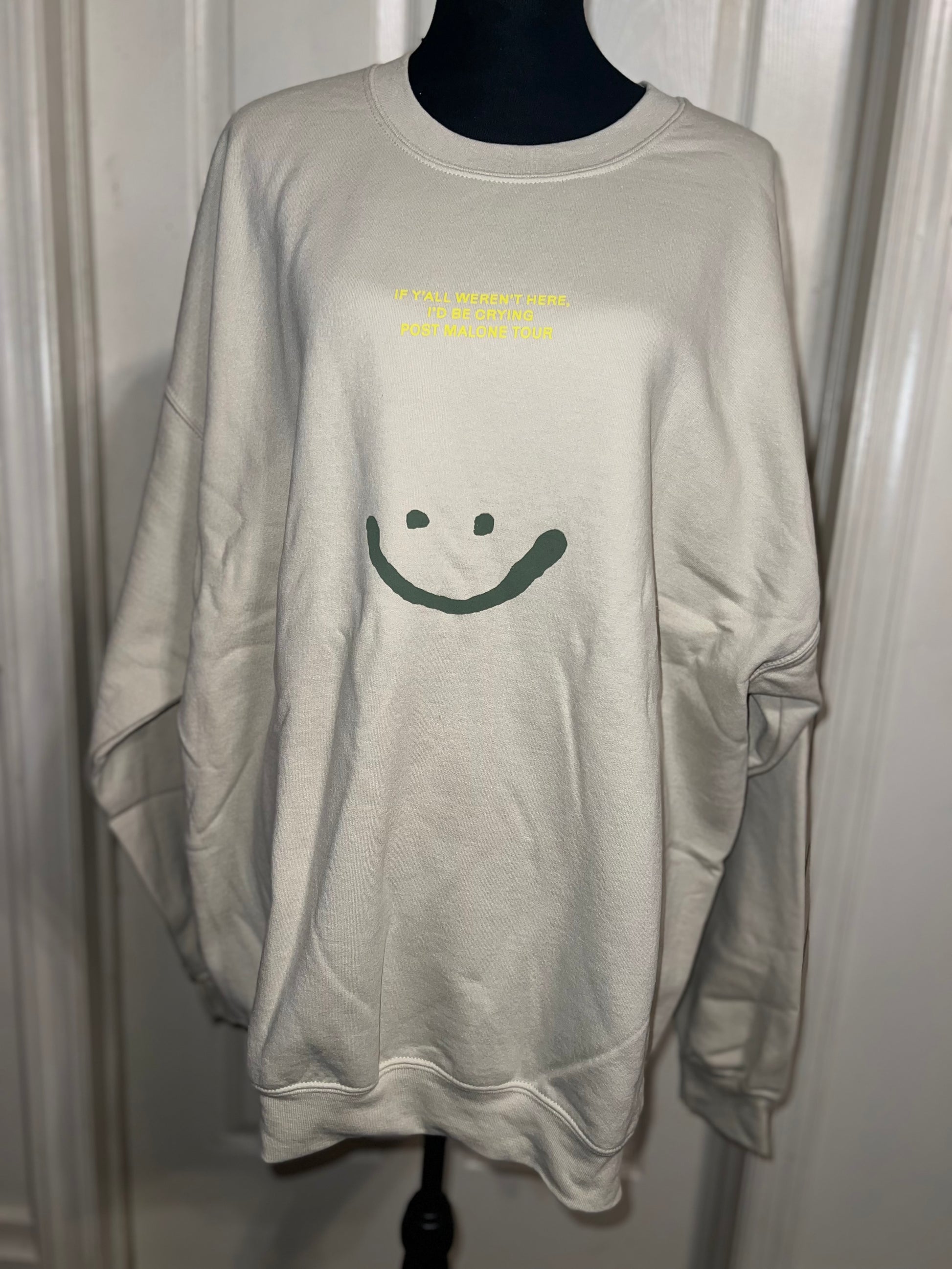 This is now a preorder. Please allow extra processing time. A beige/tan Post Malone tour sweatshirt. “If yall weren’t here, I’d be crying.” On the back has the usual Post Malone graphic at the top. Size XL, oversized. SO soft and comfortable.