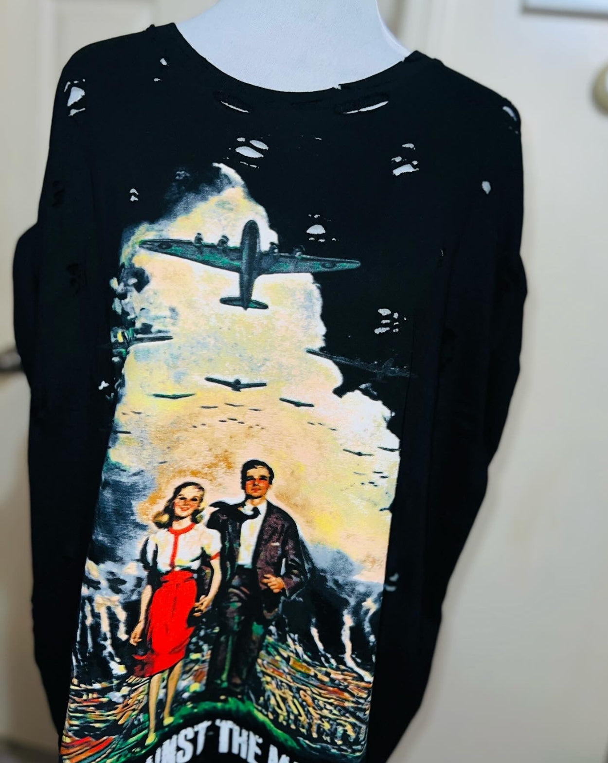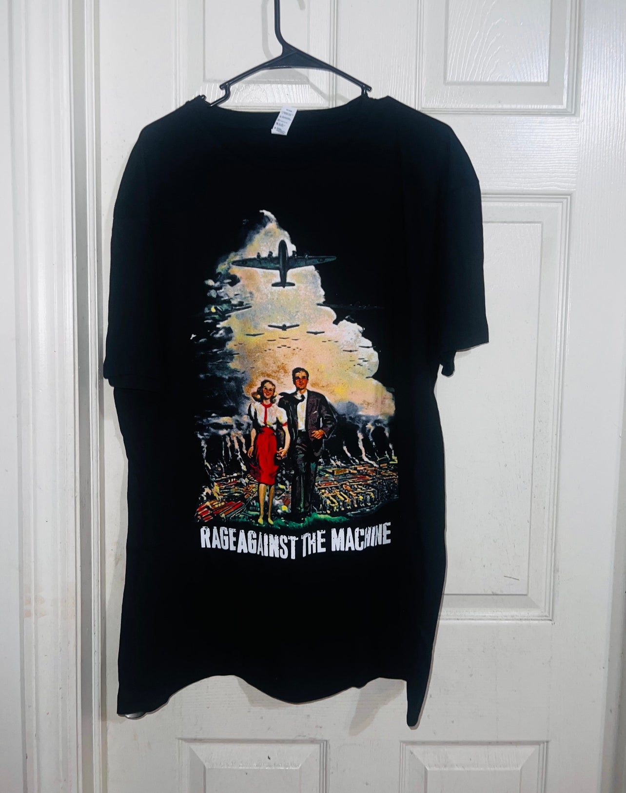 A black oversized Rage Against the Machine tee showing a vintage-style graphic of a couple running from an air raid. Love this graphic and band! It has a small graphic grenade microphone on the back too. Some of them may not have the smaller graphic on the back. It varies on supplier.