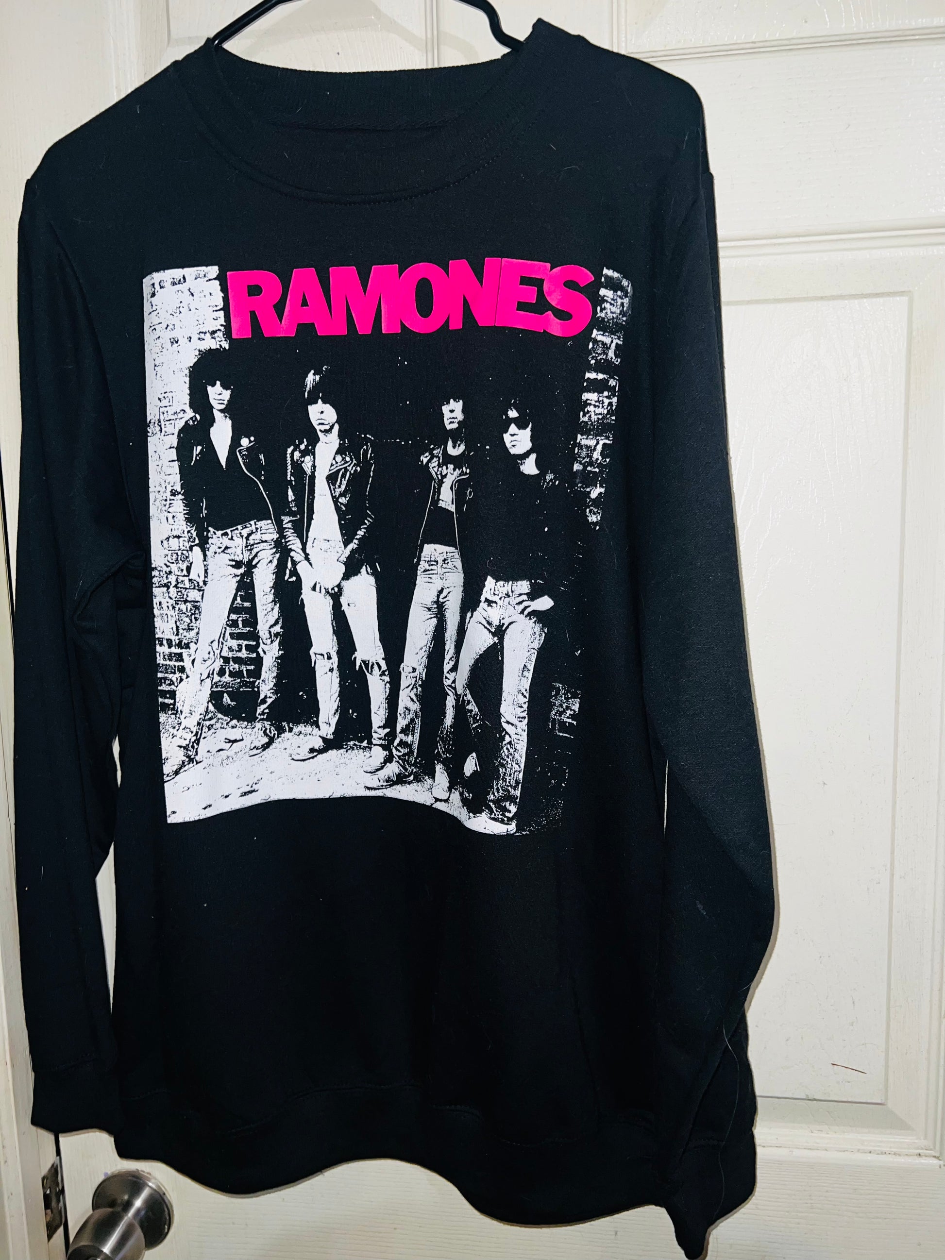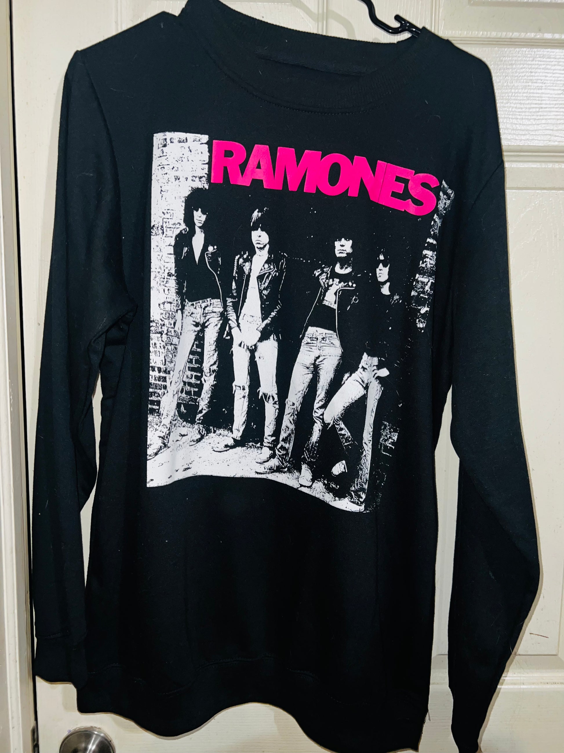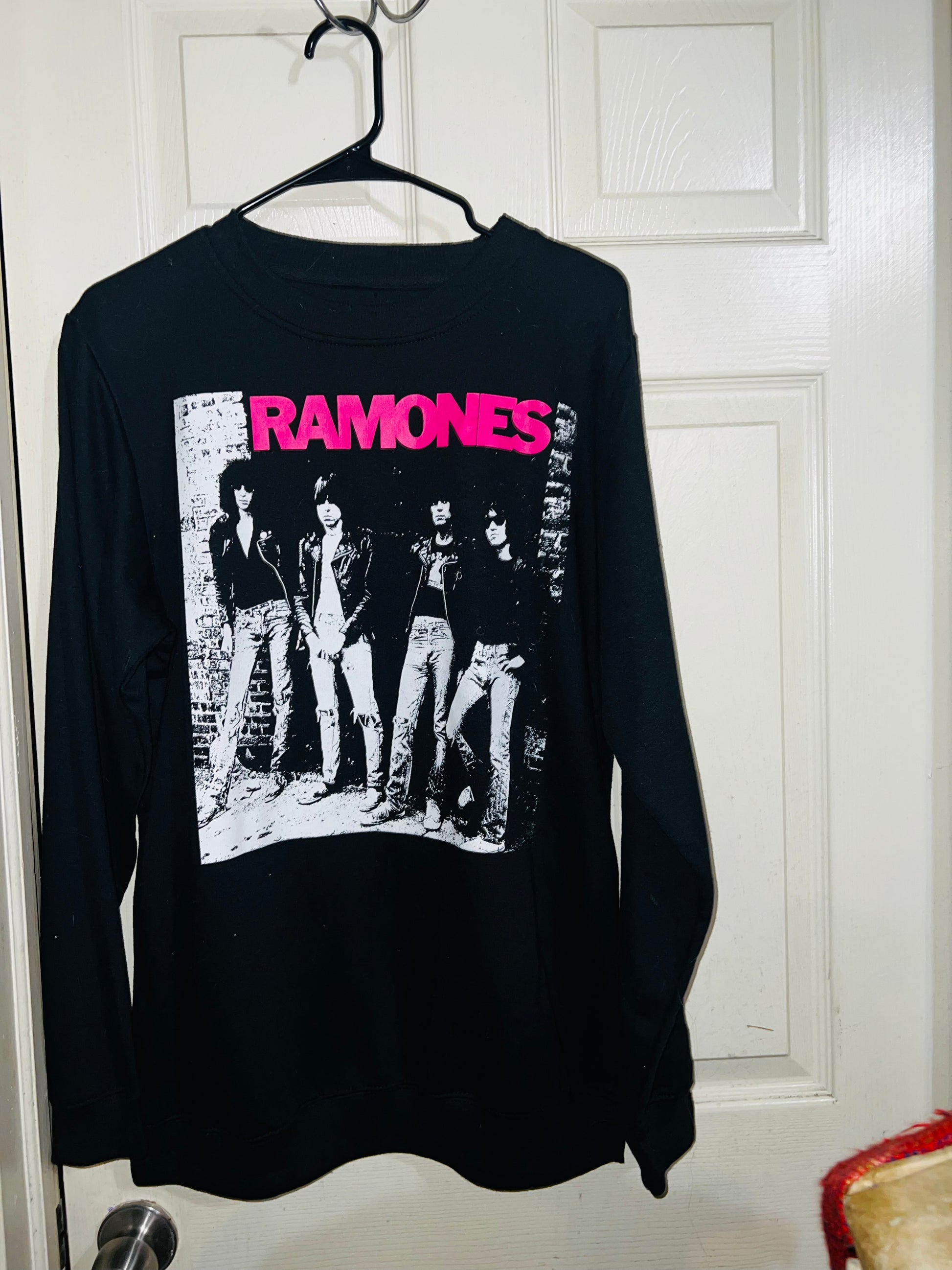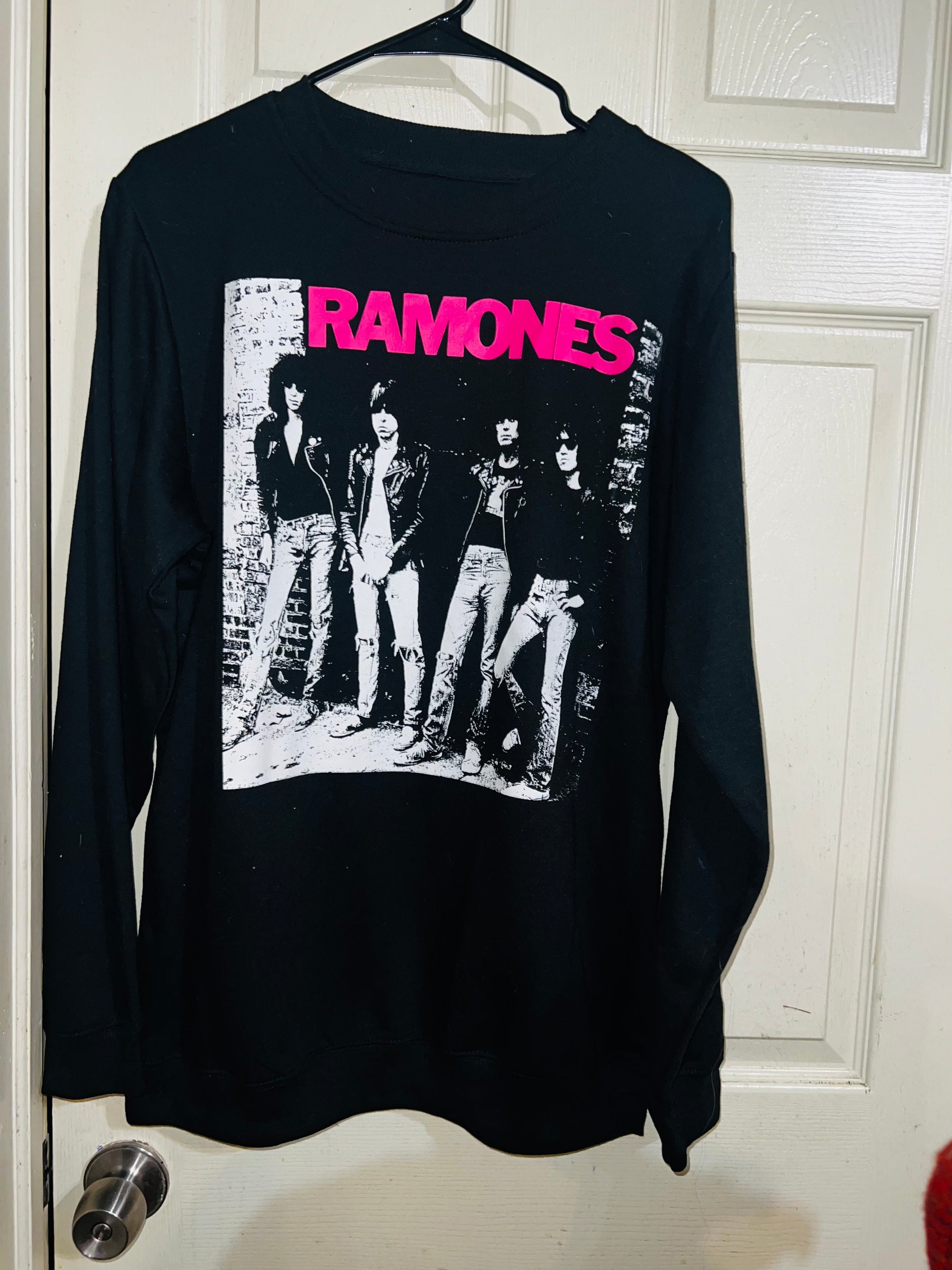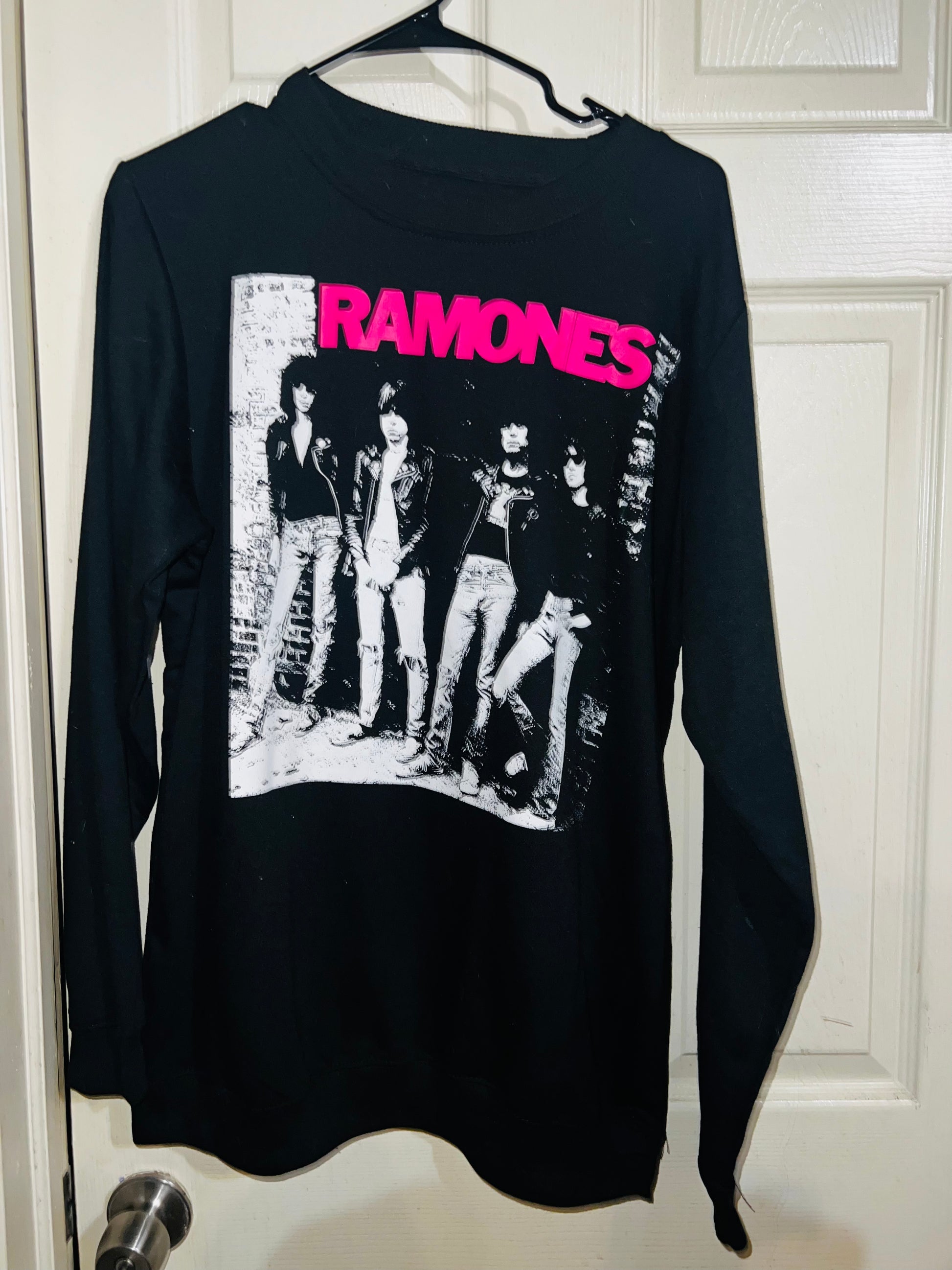 This is a preorder. Please allow extra shipping time. A super cute and comfortable Ramones sweatshirt. The band on the front with Ramones in pink! Oversized and warm. Size M/L.
