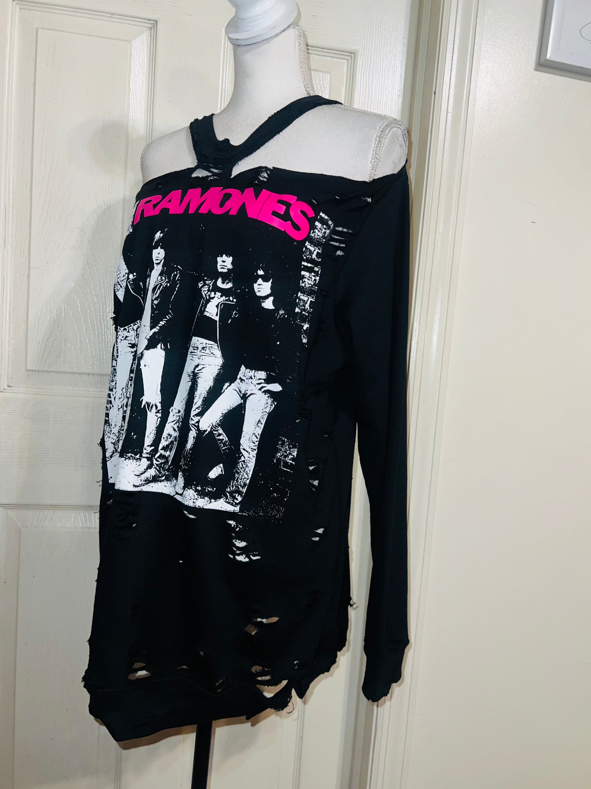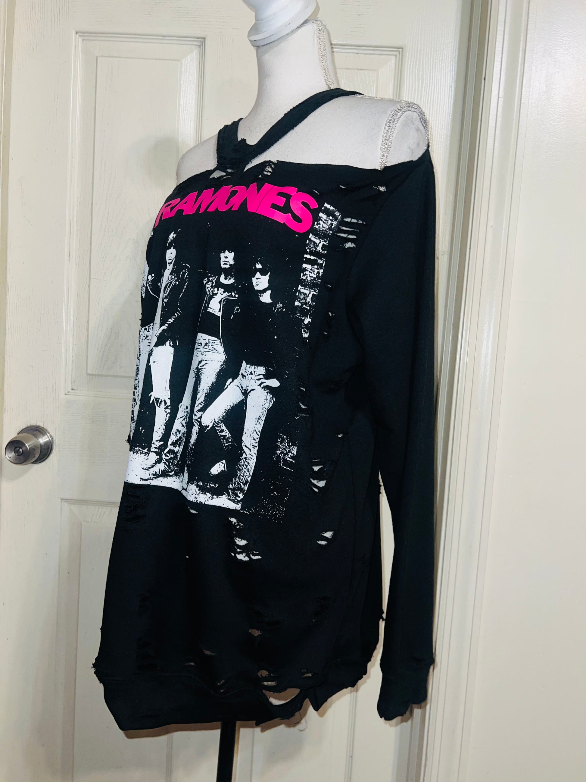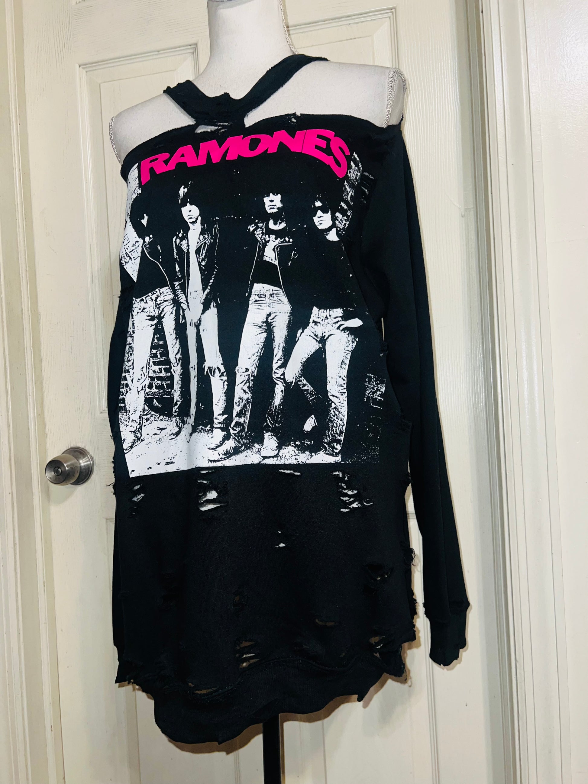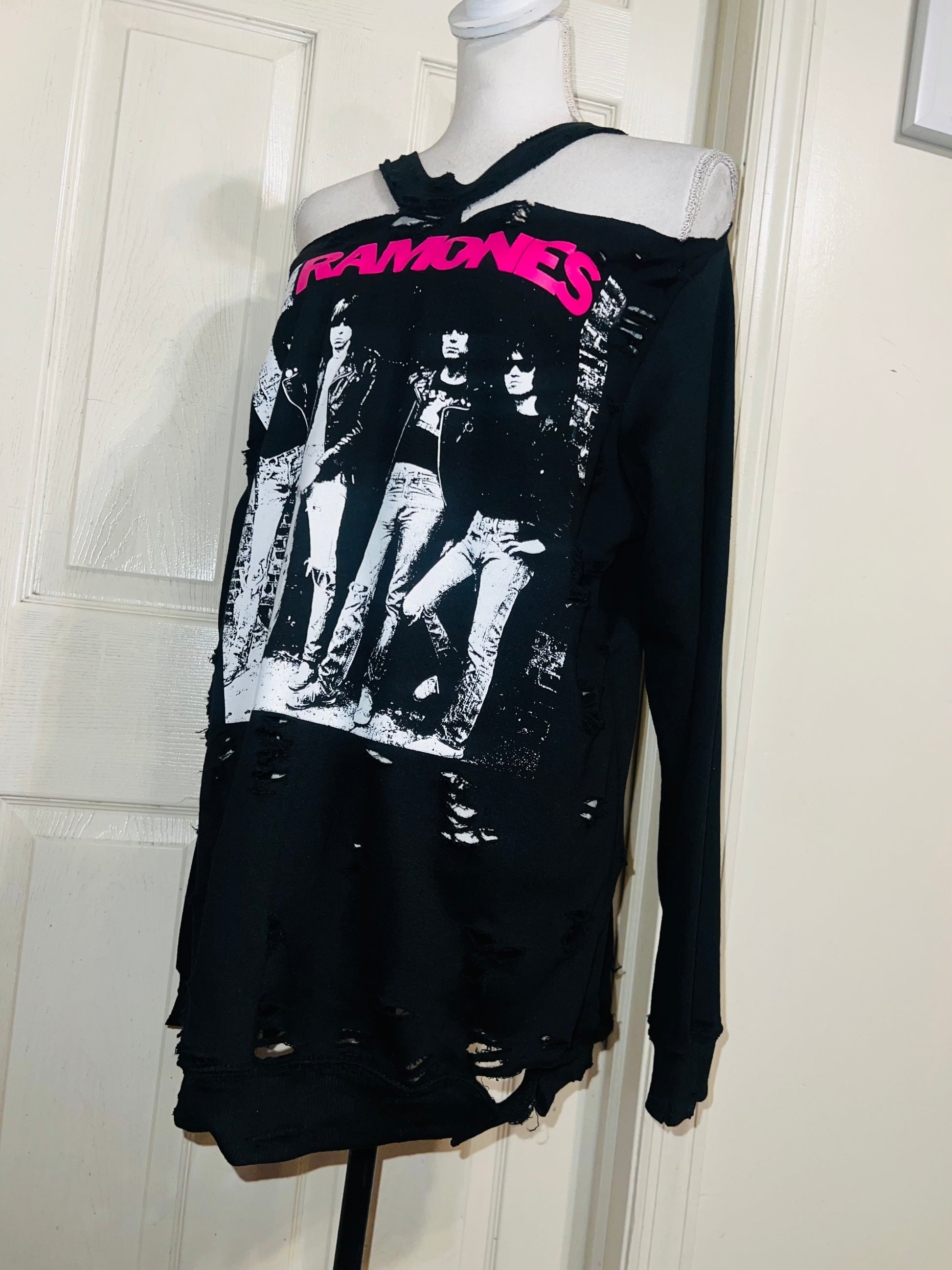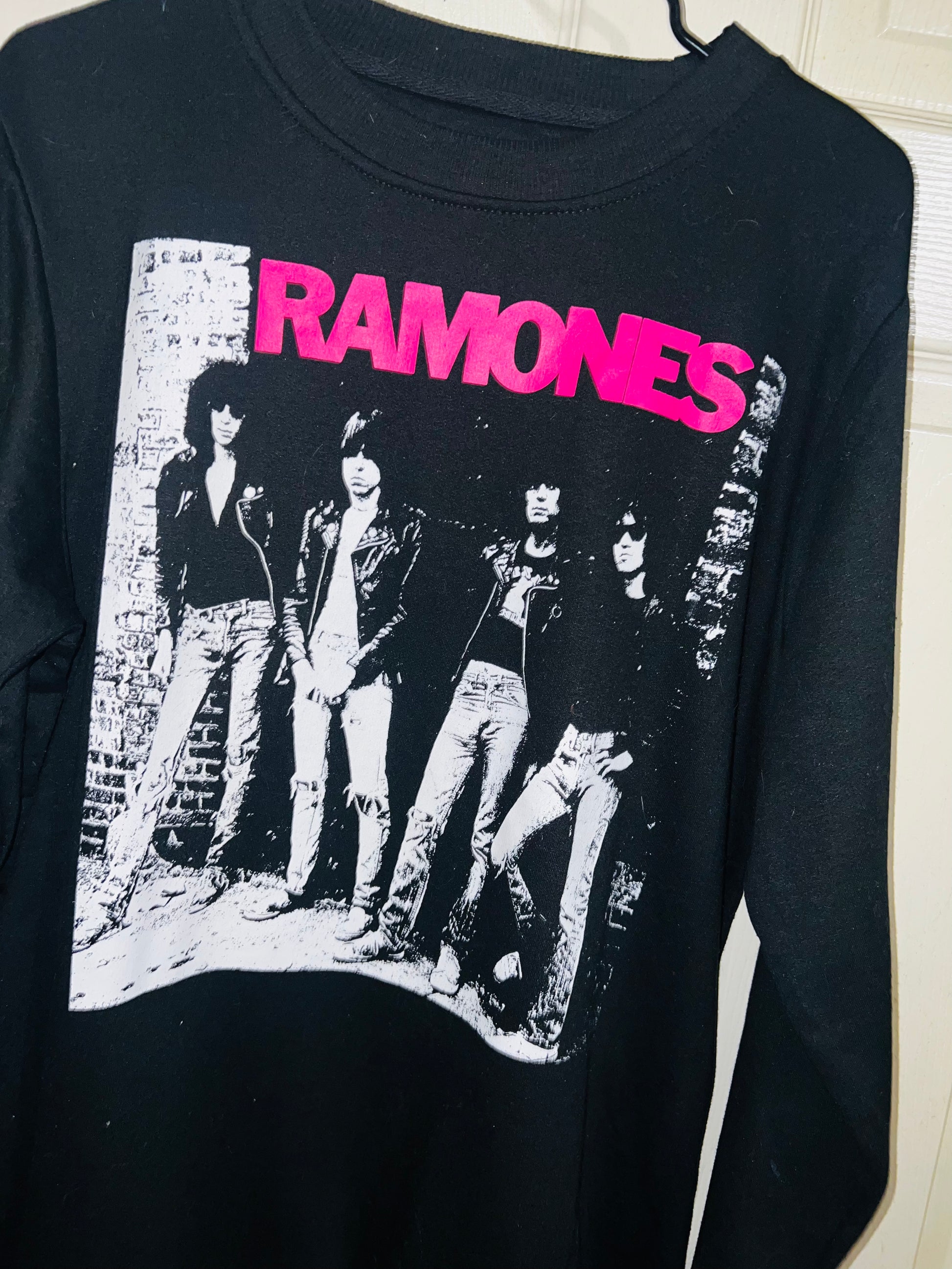 This is a preorder. Please allow extra shipping time. A super cute and comfortable Ramones sweatshirt. The band on the front with Ramones in pink! Oversized and warm. Size M/L.