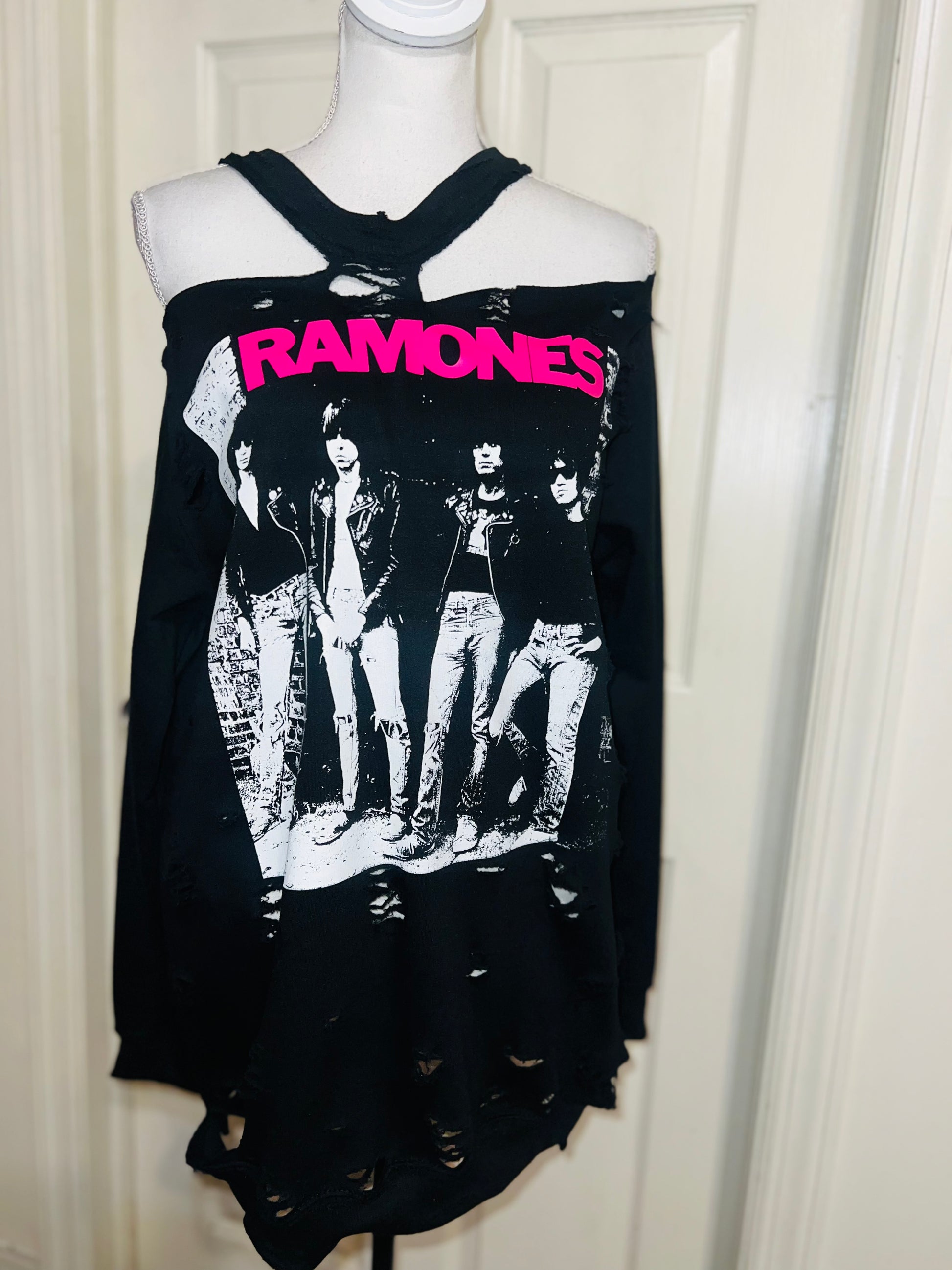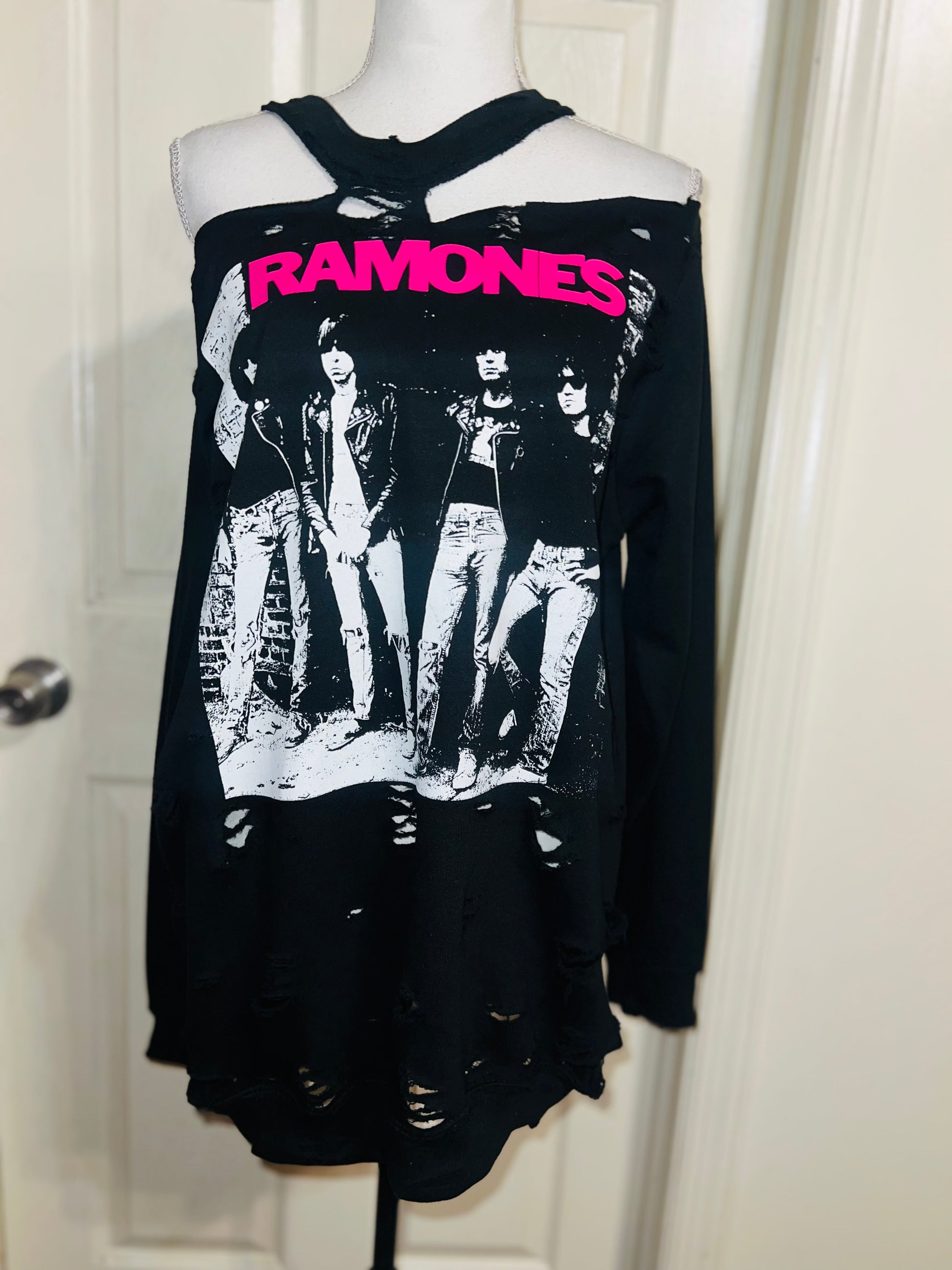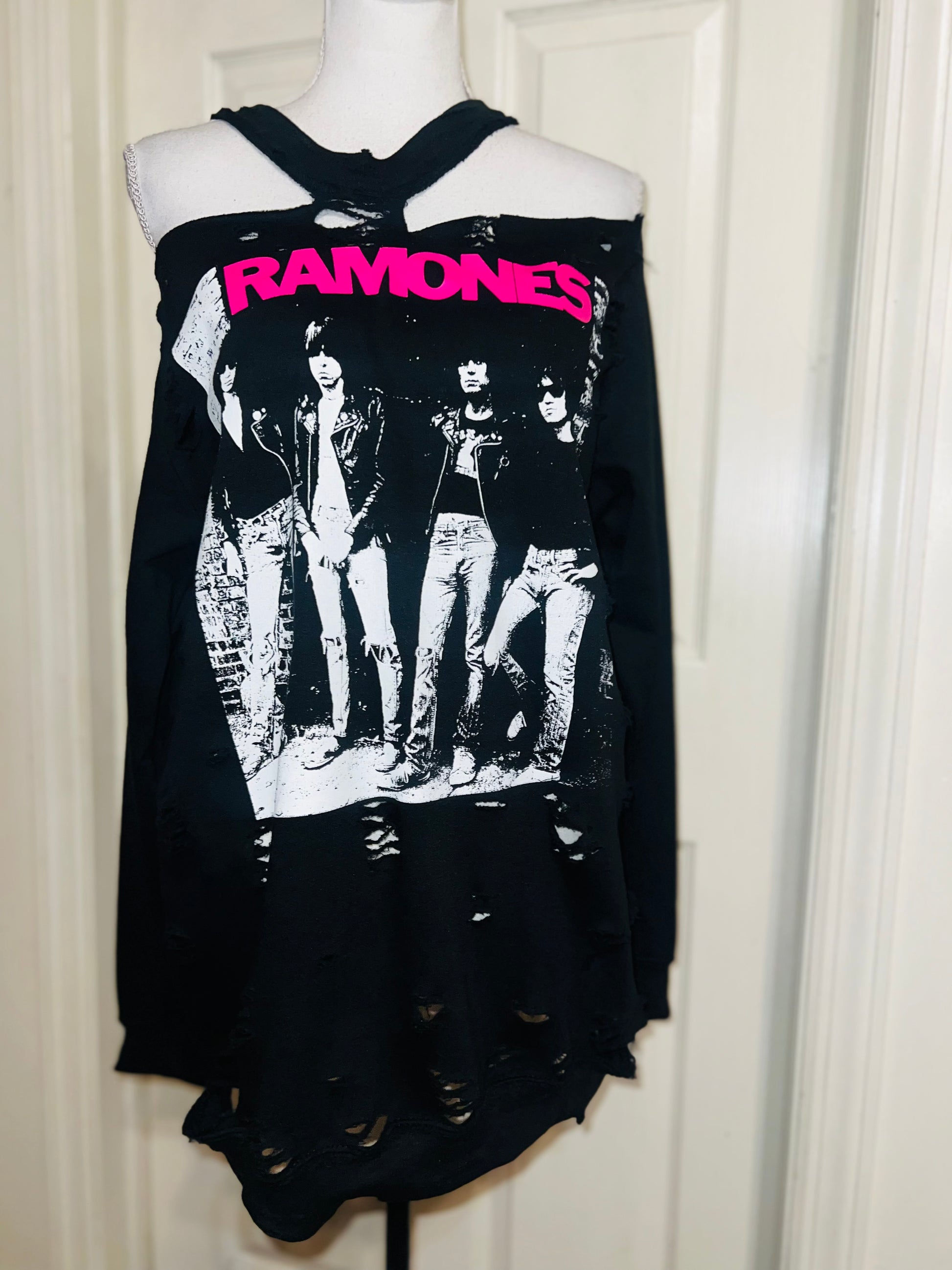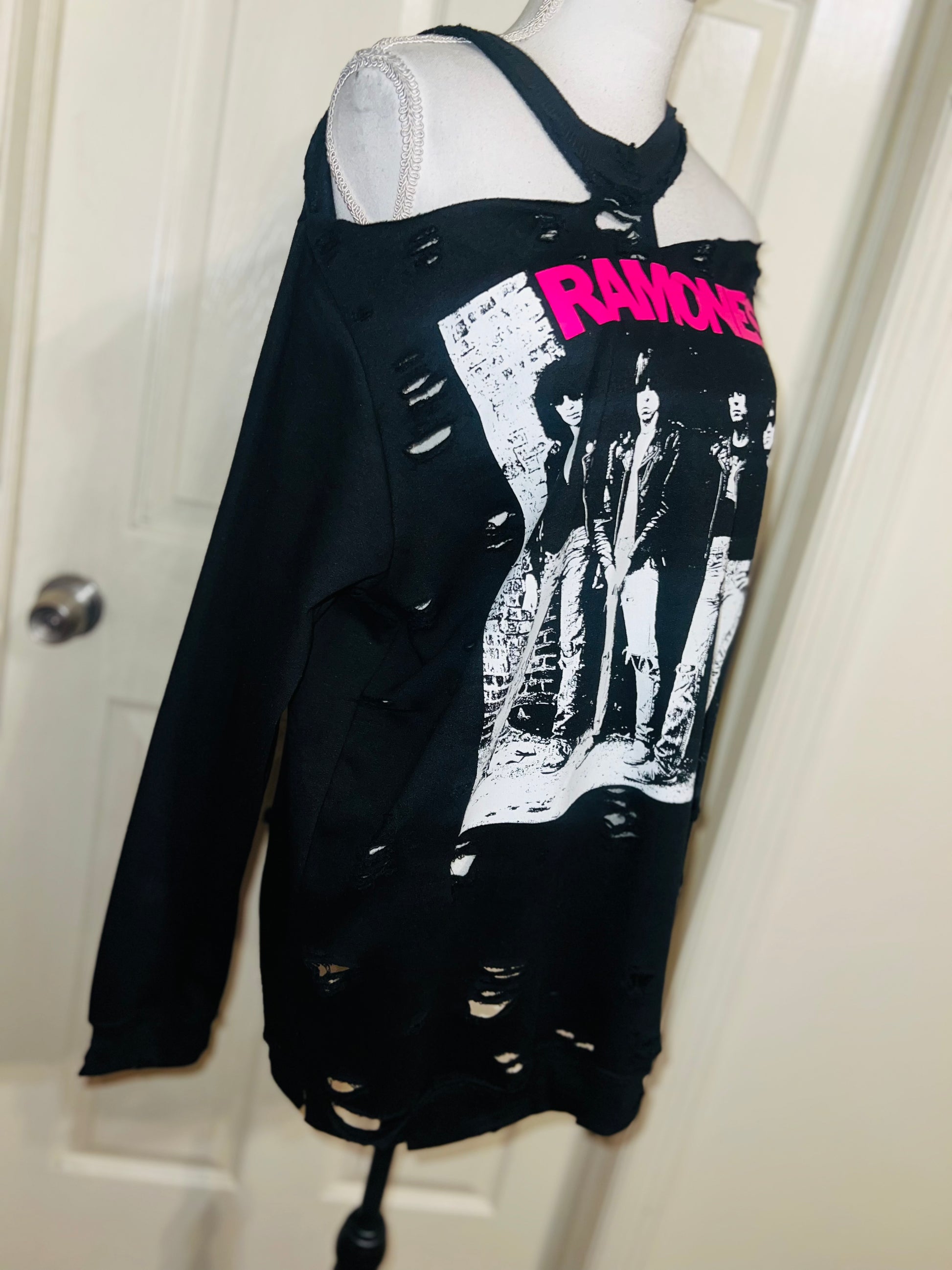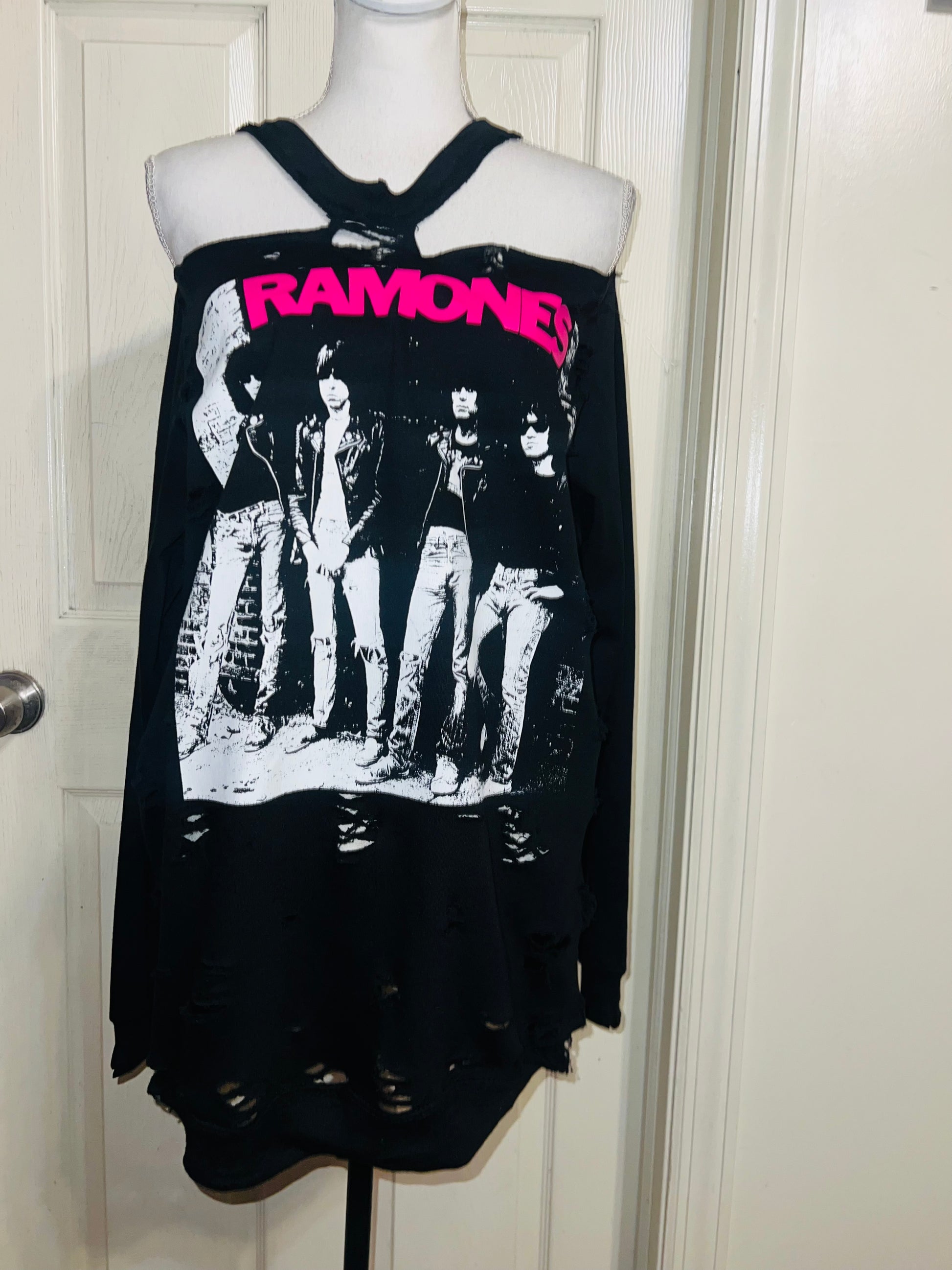 This is a preorder. Please allow extra shipping time. A super cute and comfortable Ramones sweatshirt. The band on the front with Ramones in pink! Oversized and warm. Size M/L.