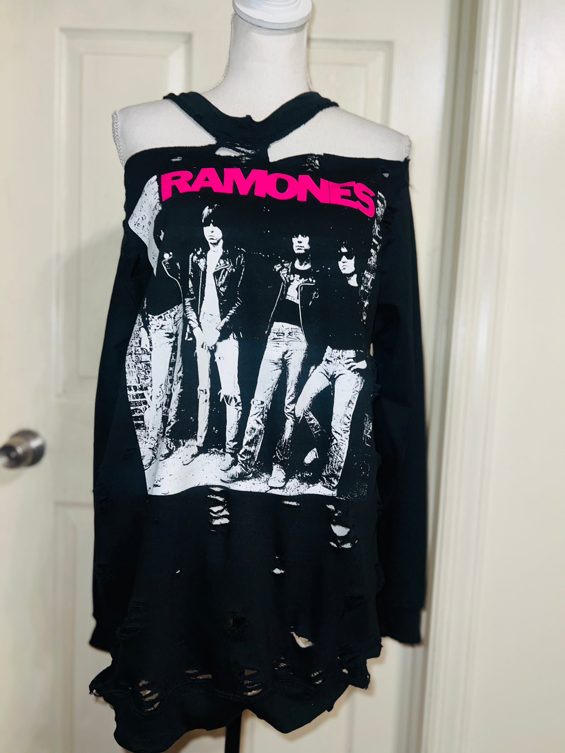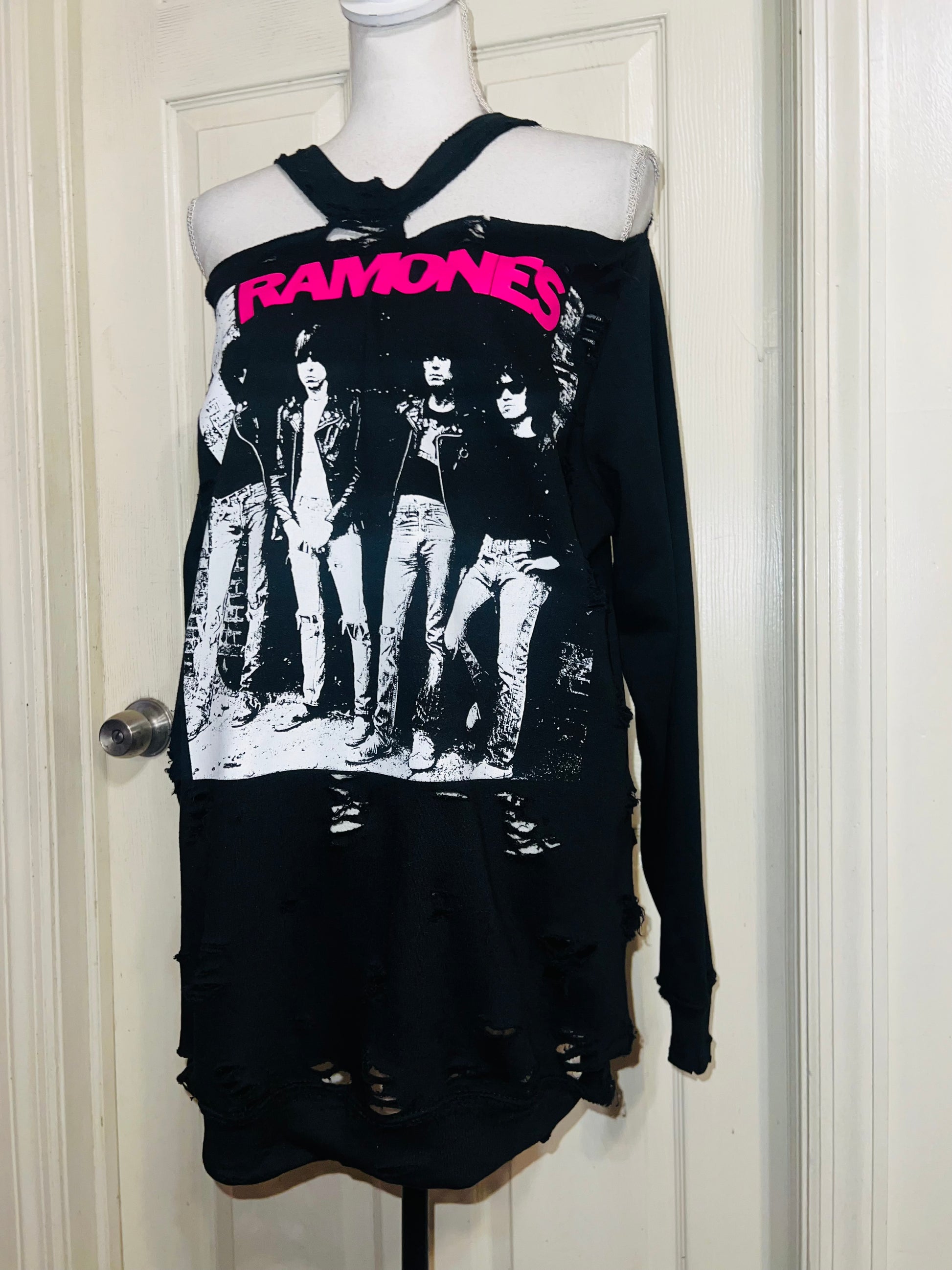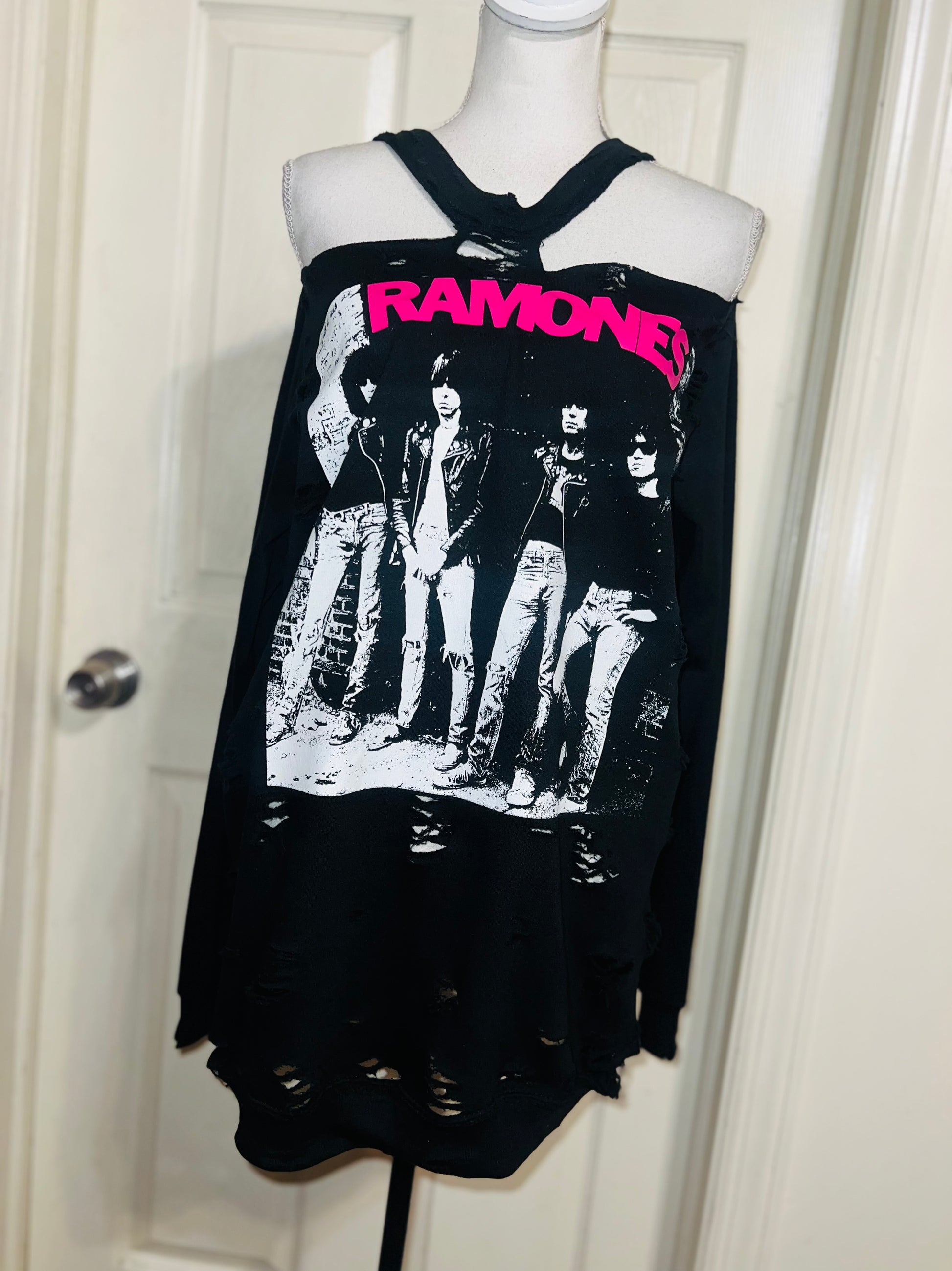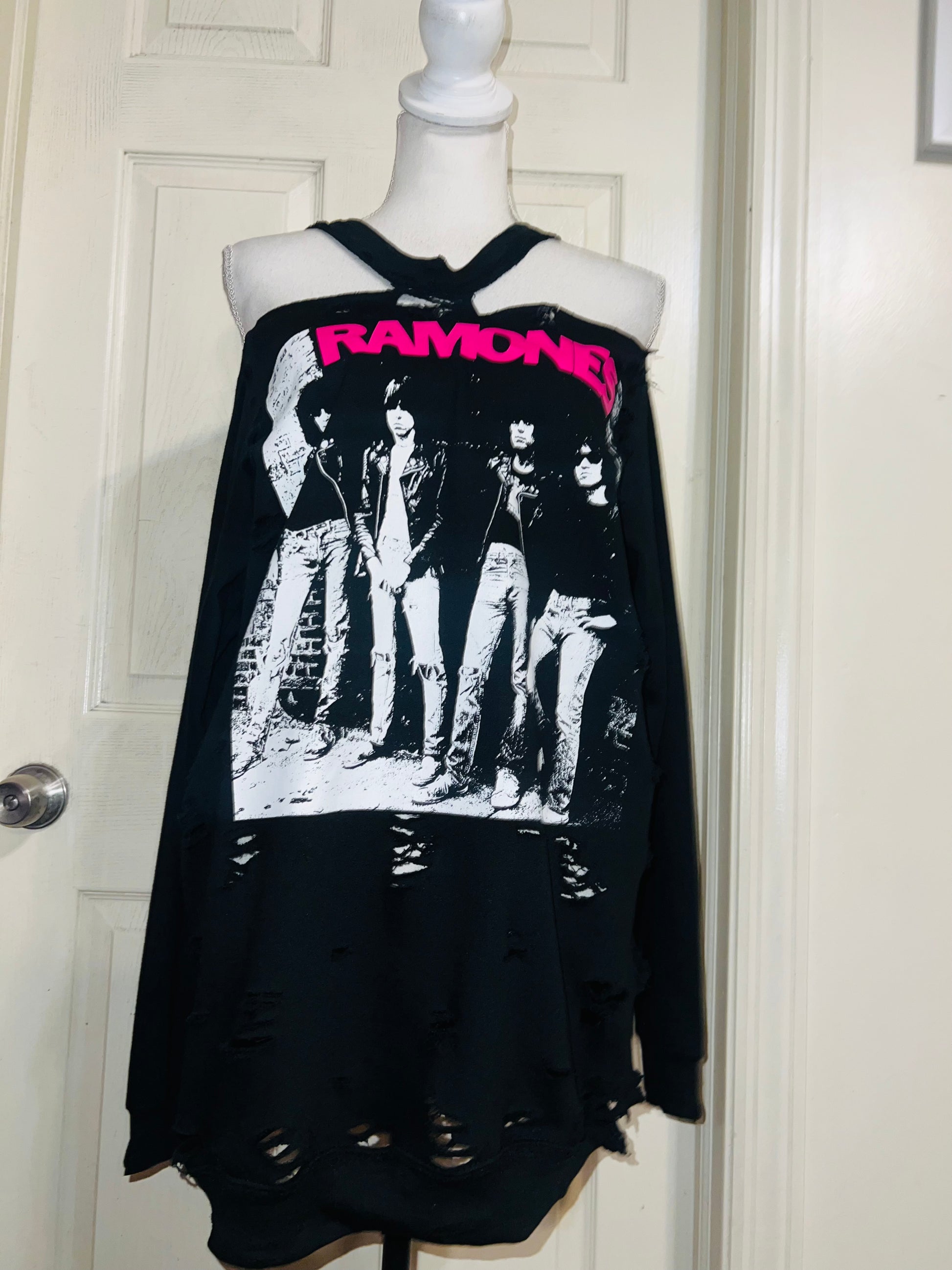 This is a preorder. Please allow extra shipping time. A super cute and comfortable Ramones sweatshirt. The band on the front with Ramones in pink! Oversized and warm. Size M/L.