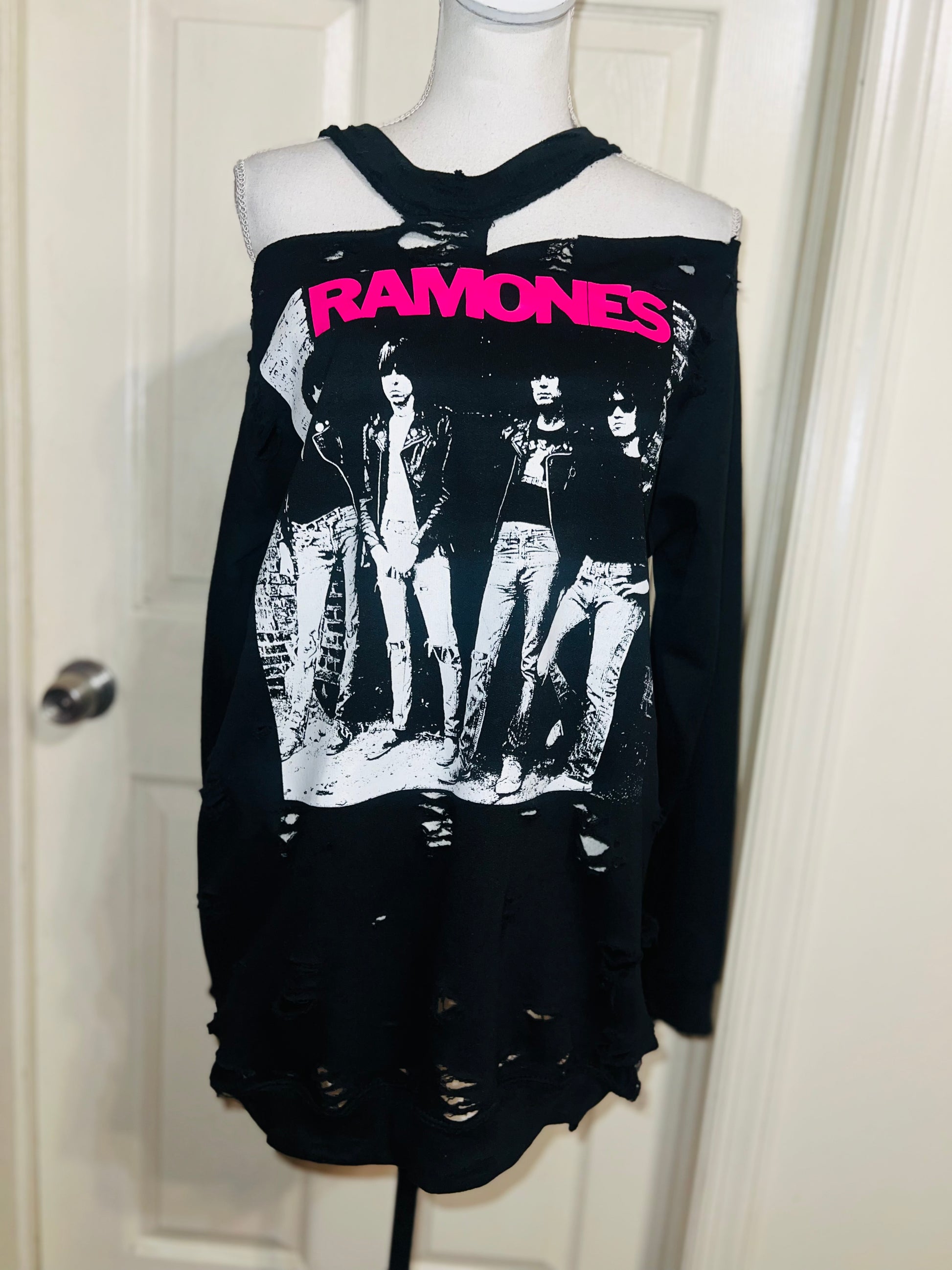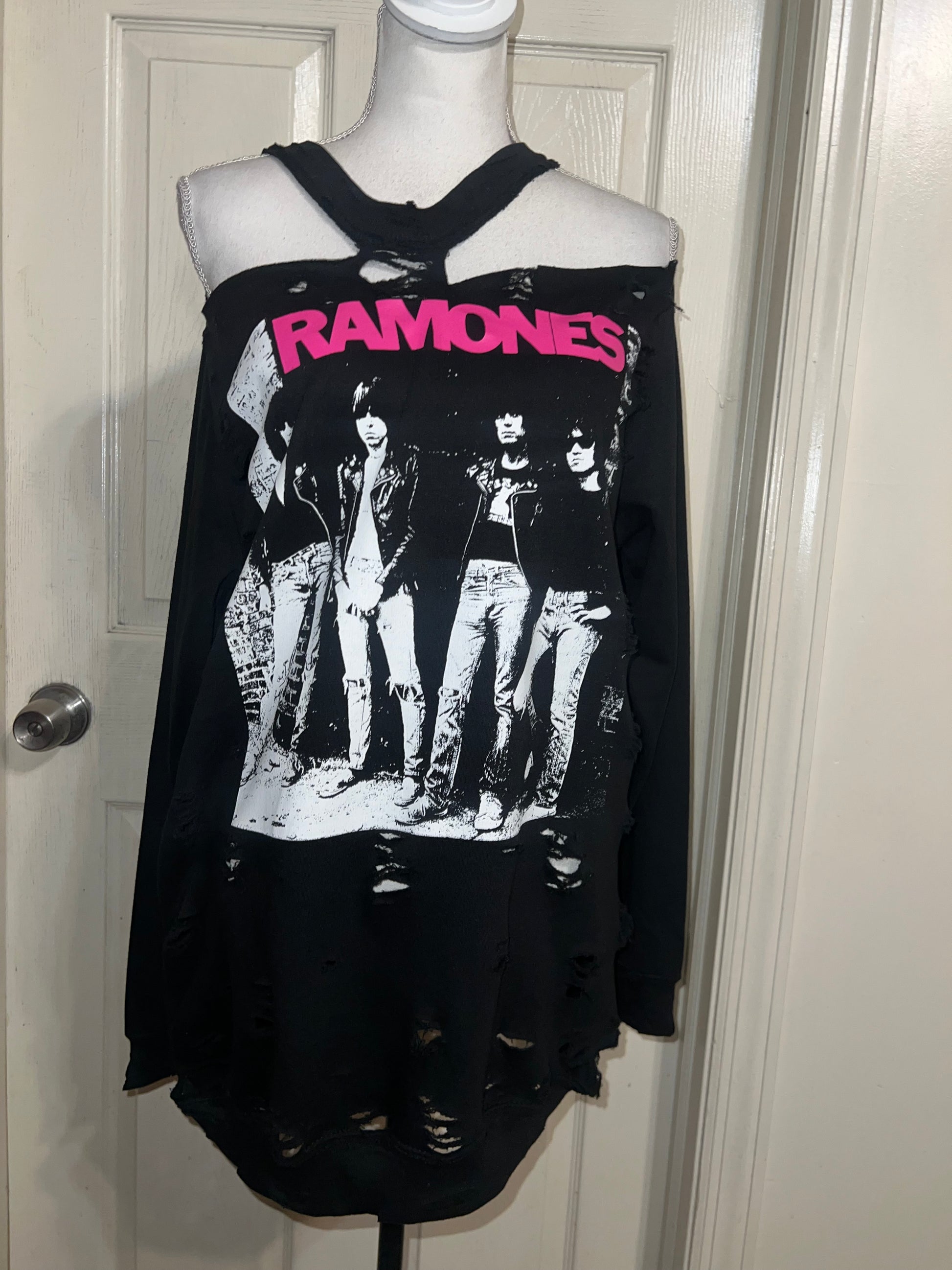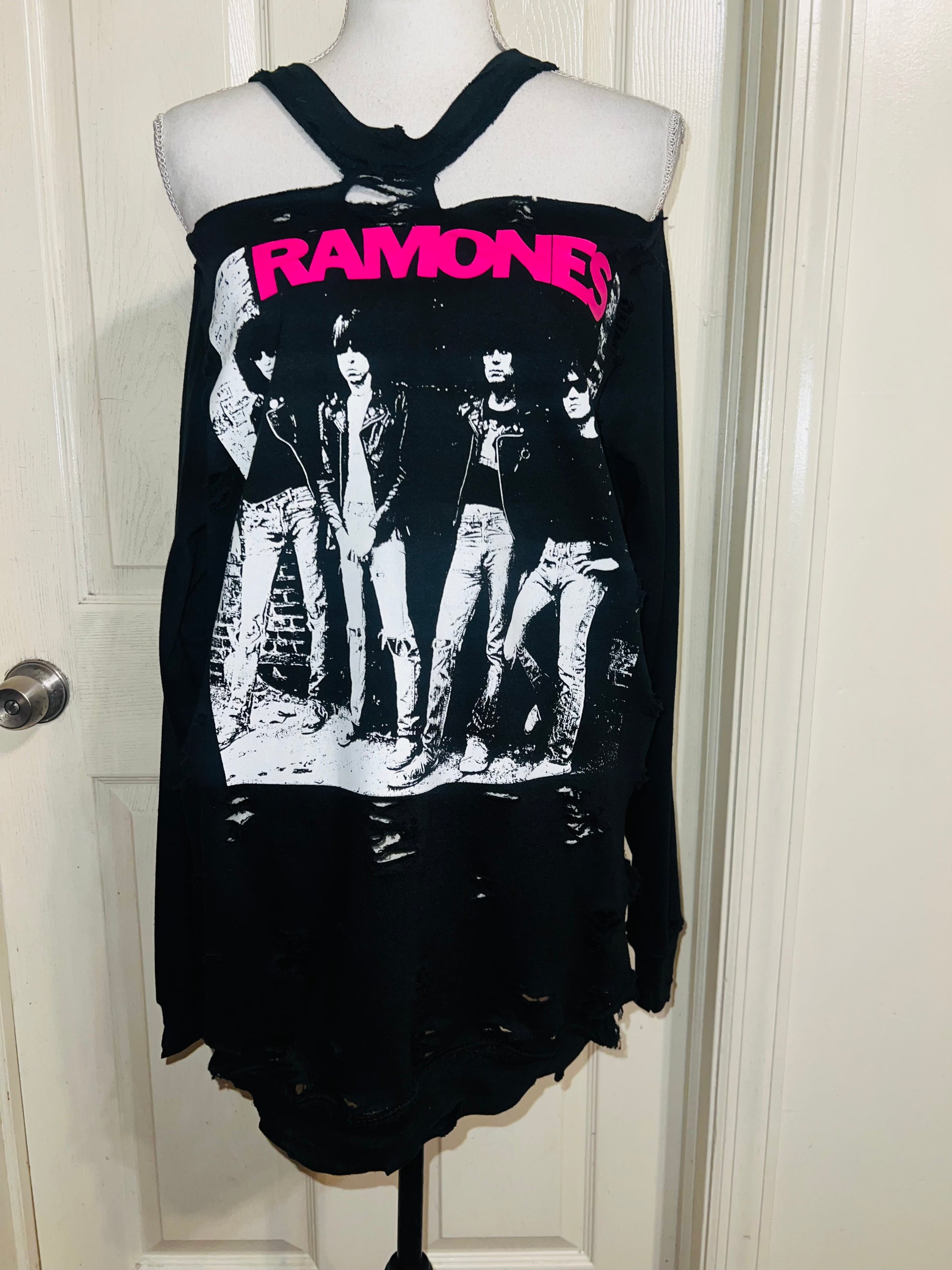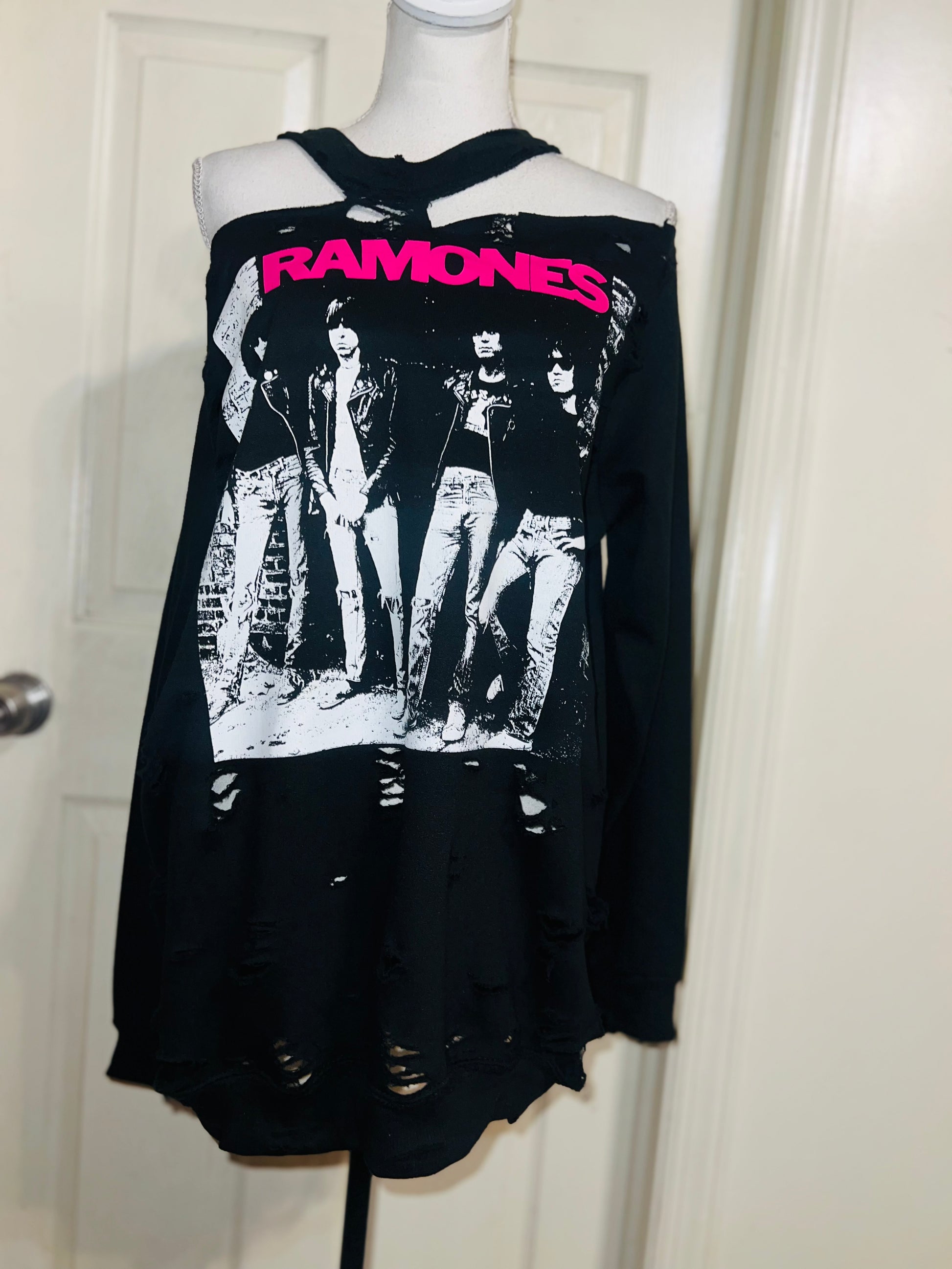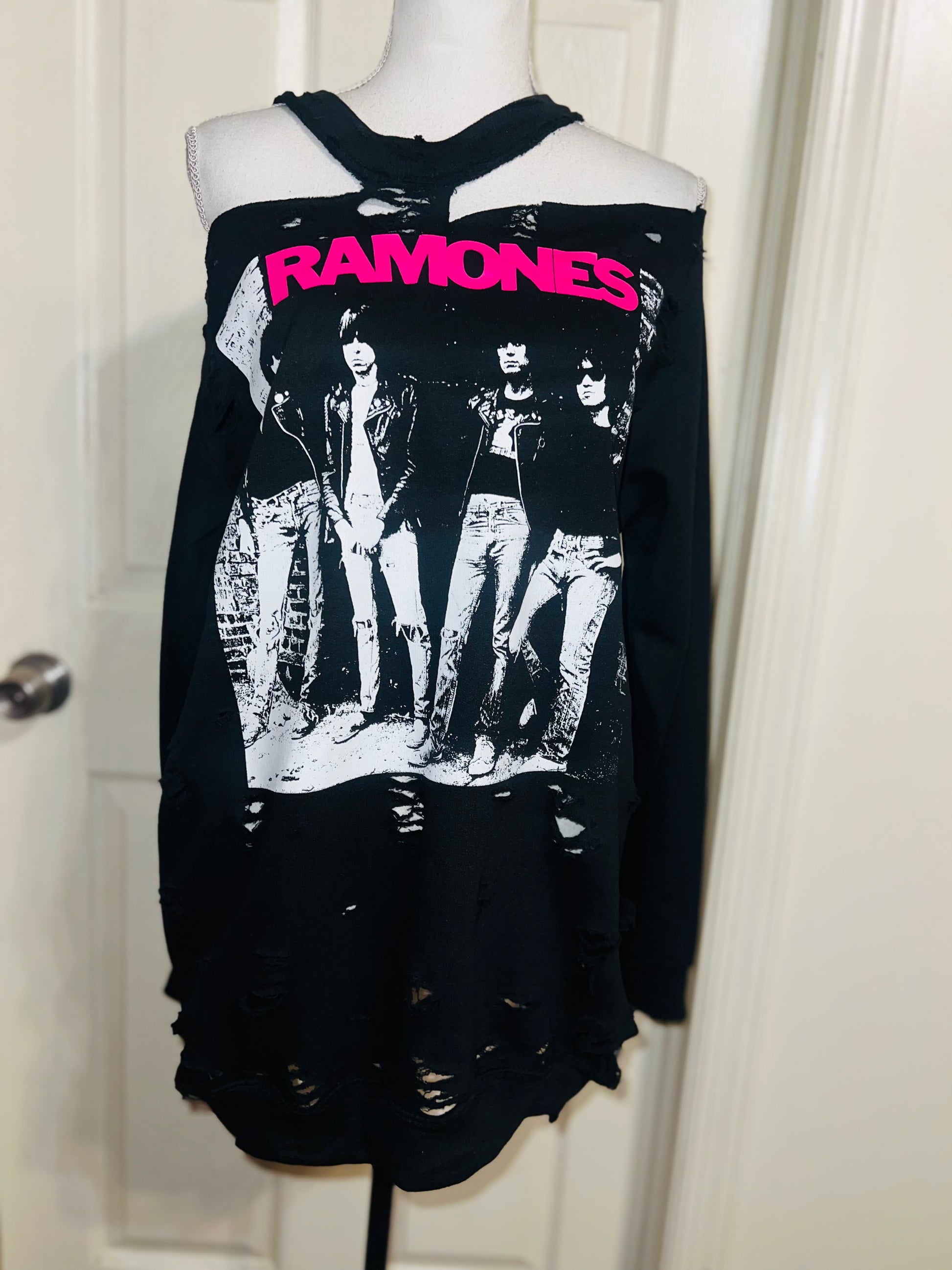 This is a preorder. Please allow extra shipping time. A super cute and comfortable Ramones sweatshirt. The band on the front with Ramones in pink! Oversized and warm. Size M/L.