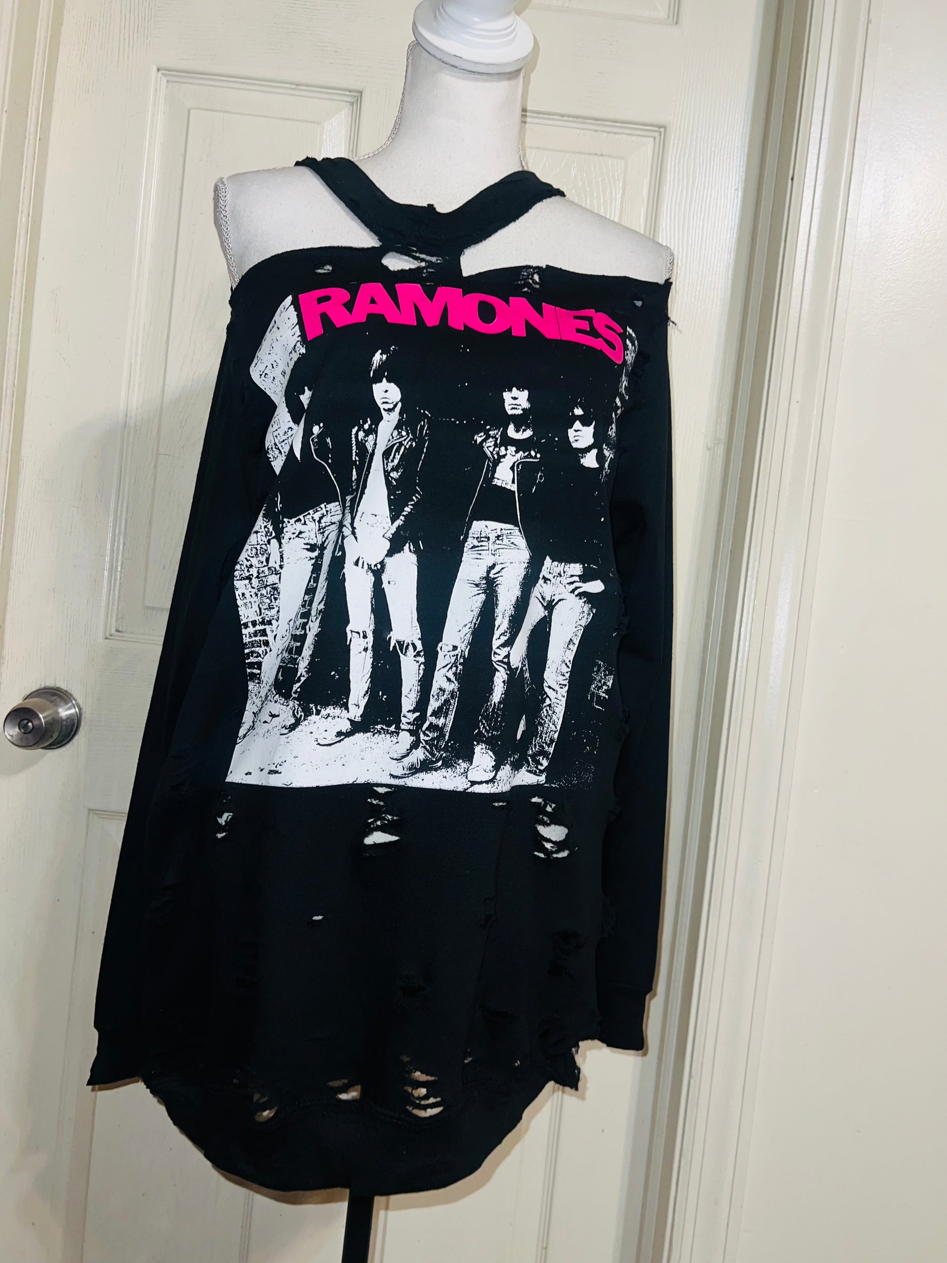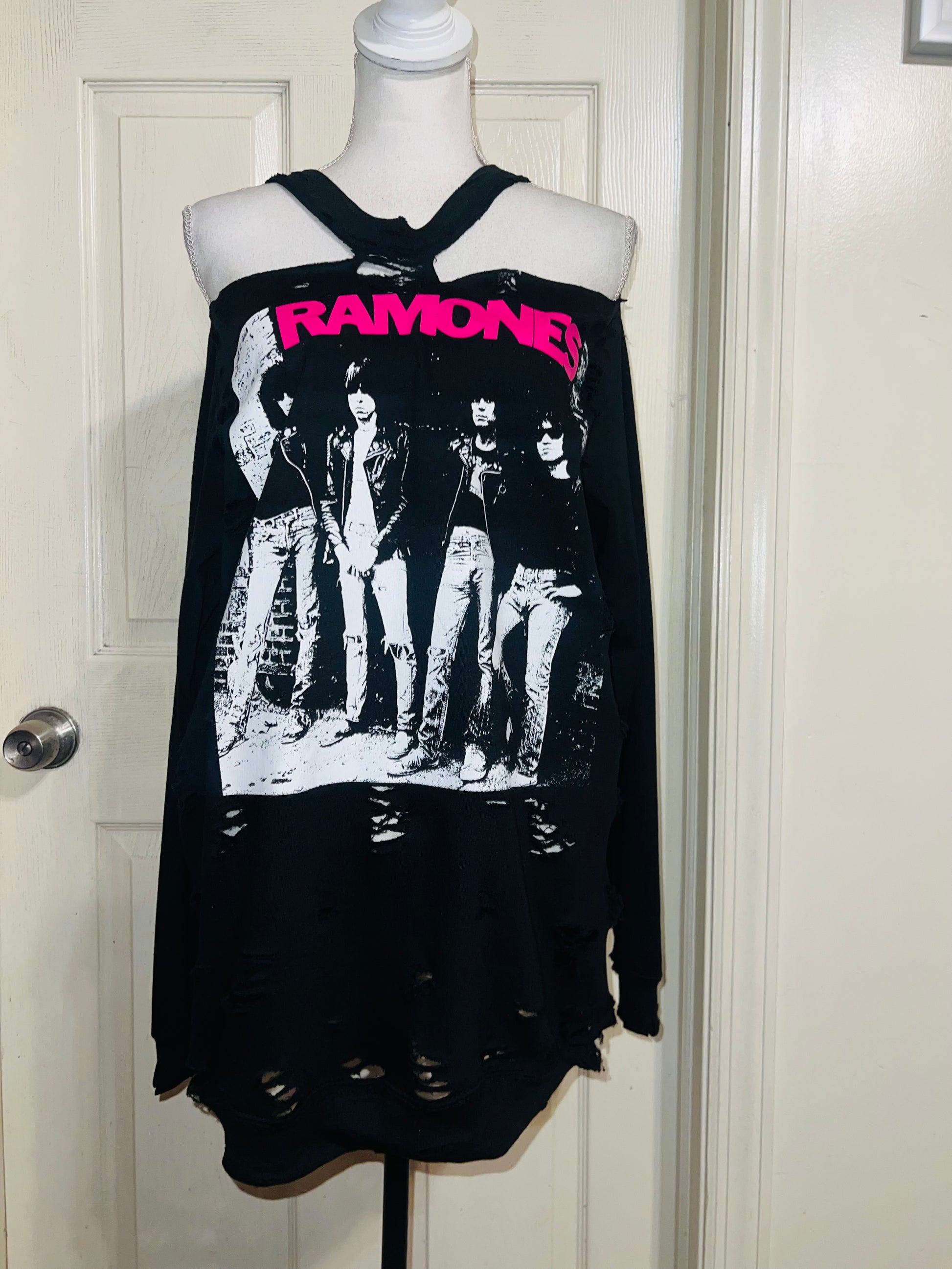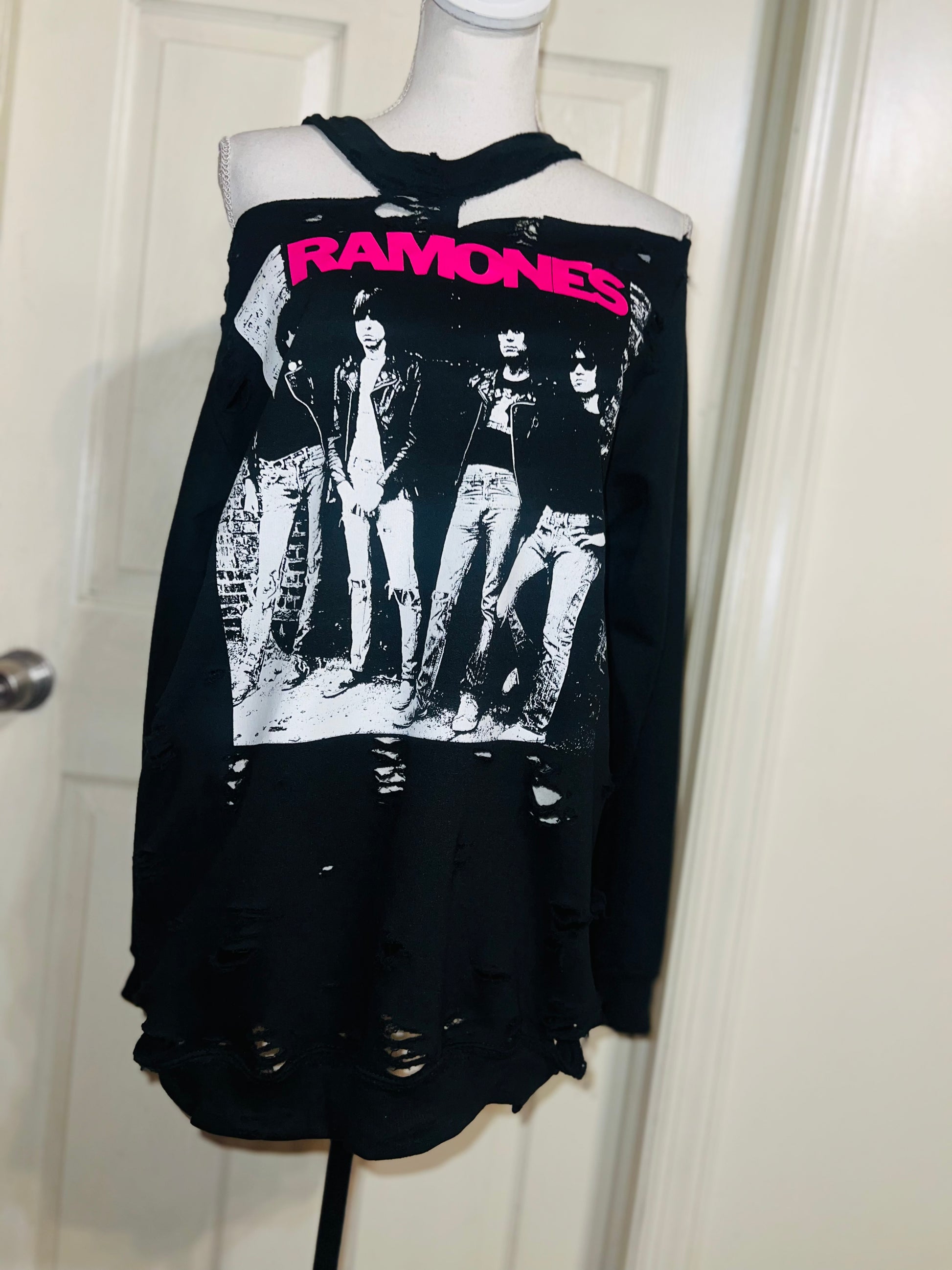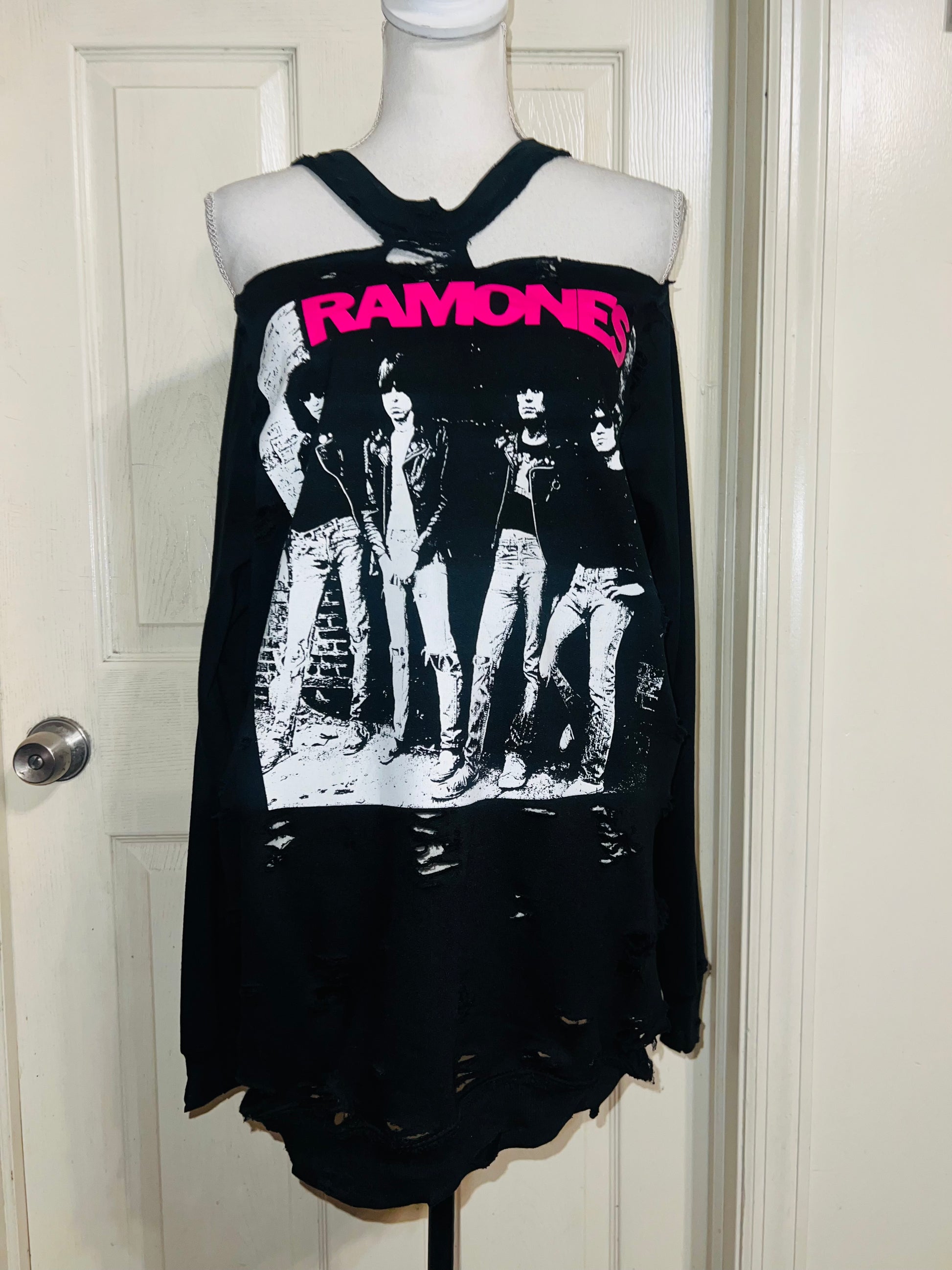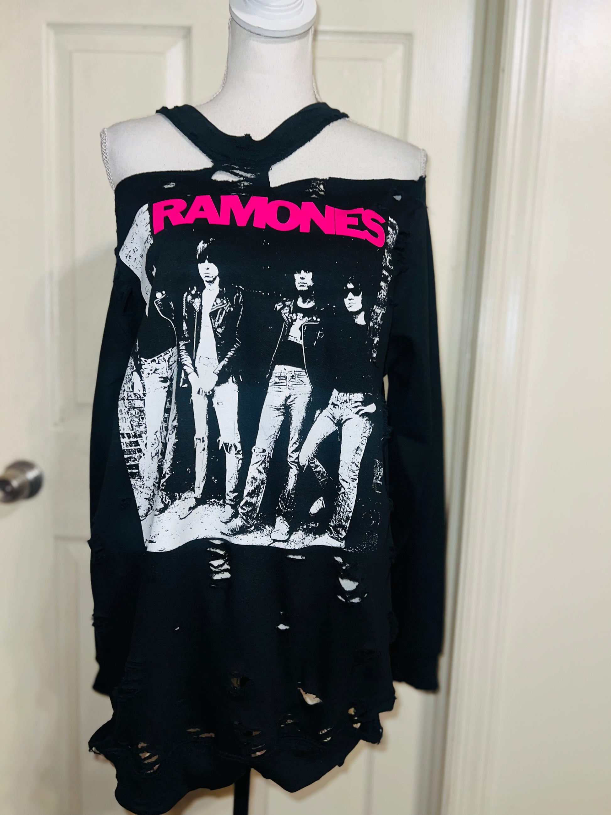 This is a preorder. Please allow extra shipping time. A super cute and comfortable Ramones sweatshirt. The band on the front with Ramones in pink! Oversized and warm. Size M/L.