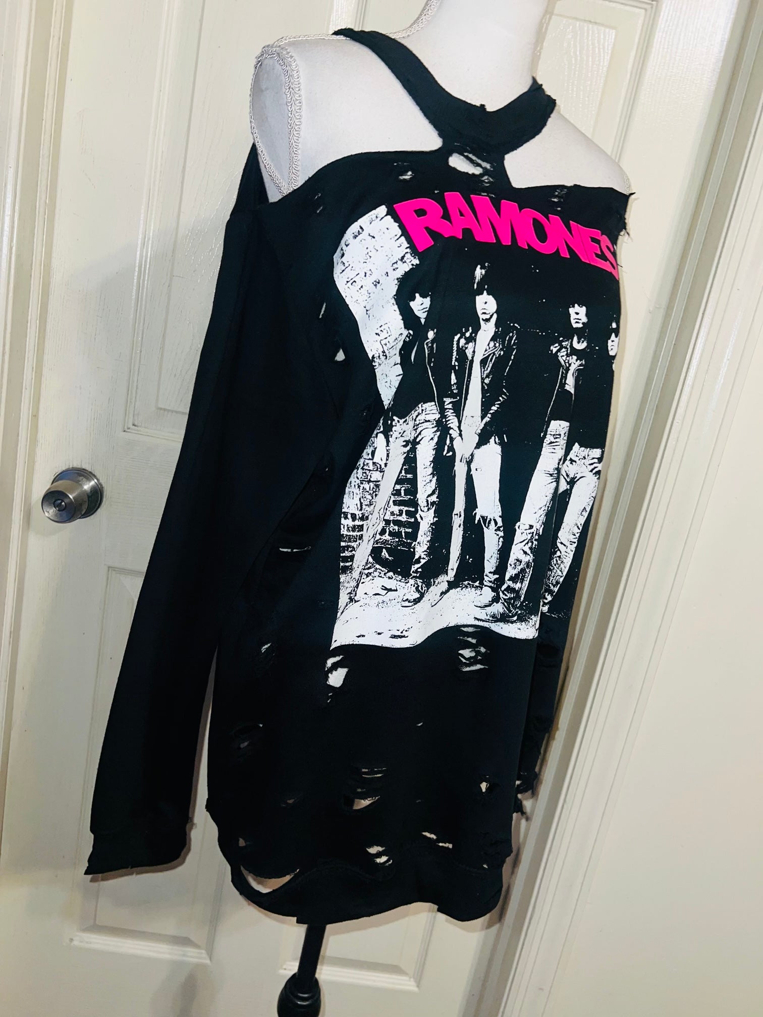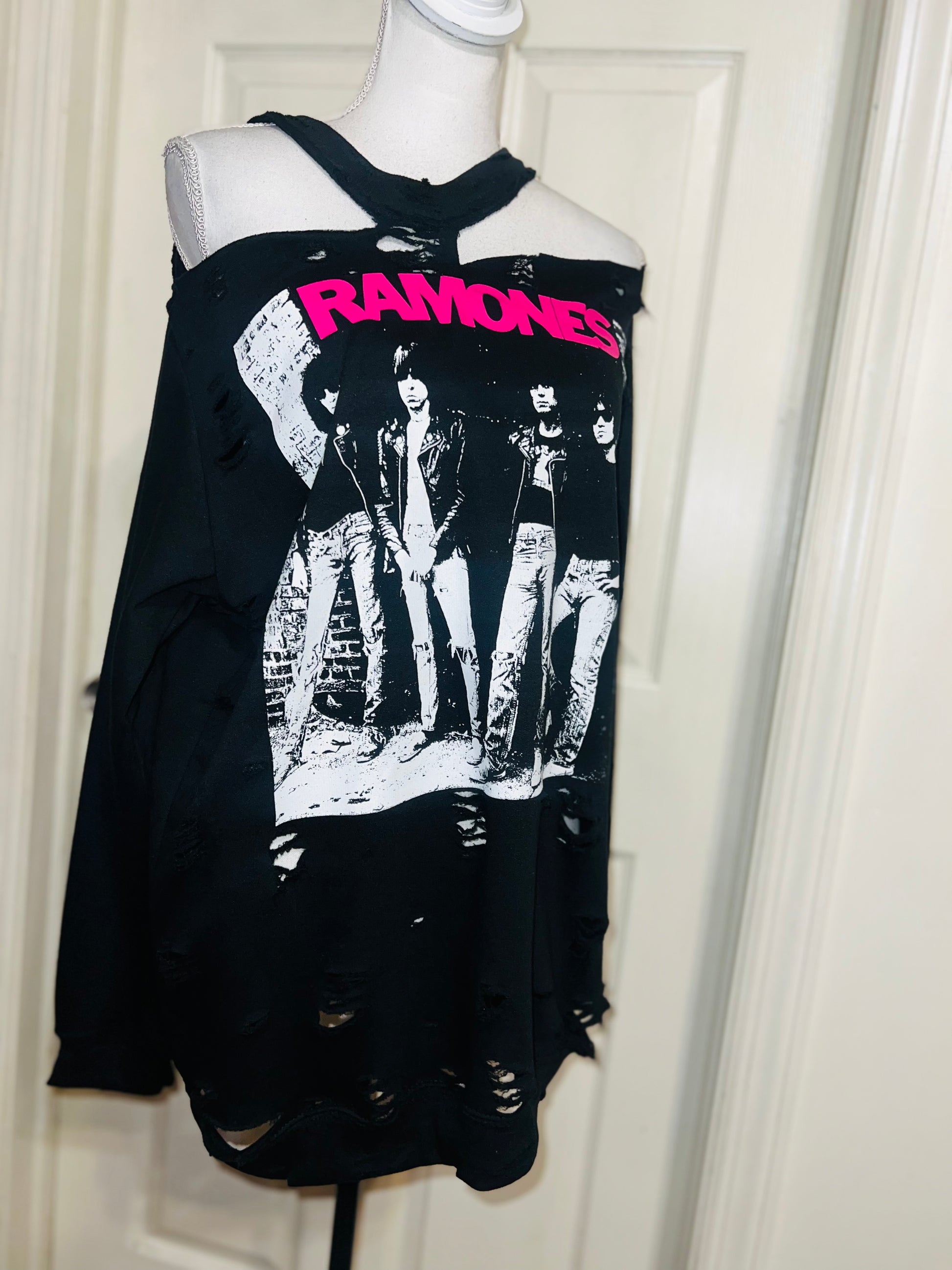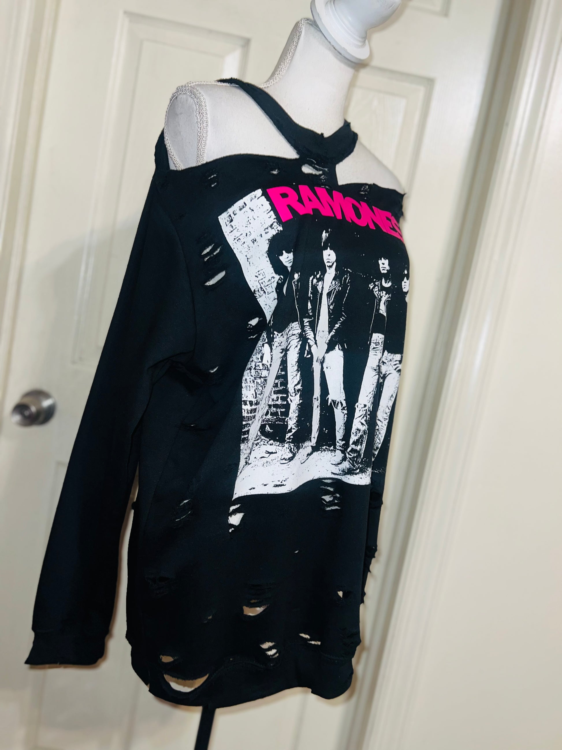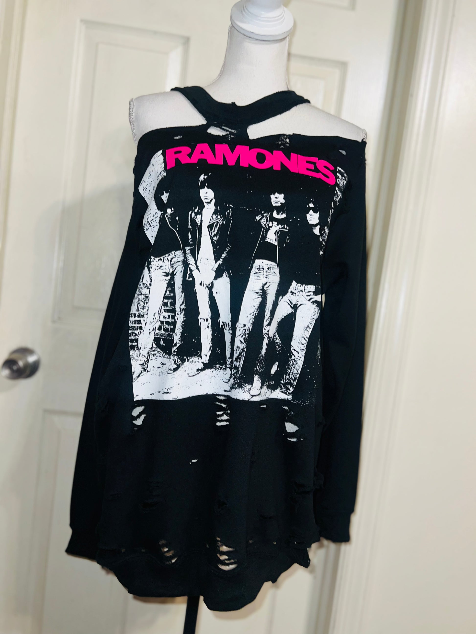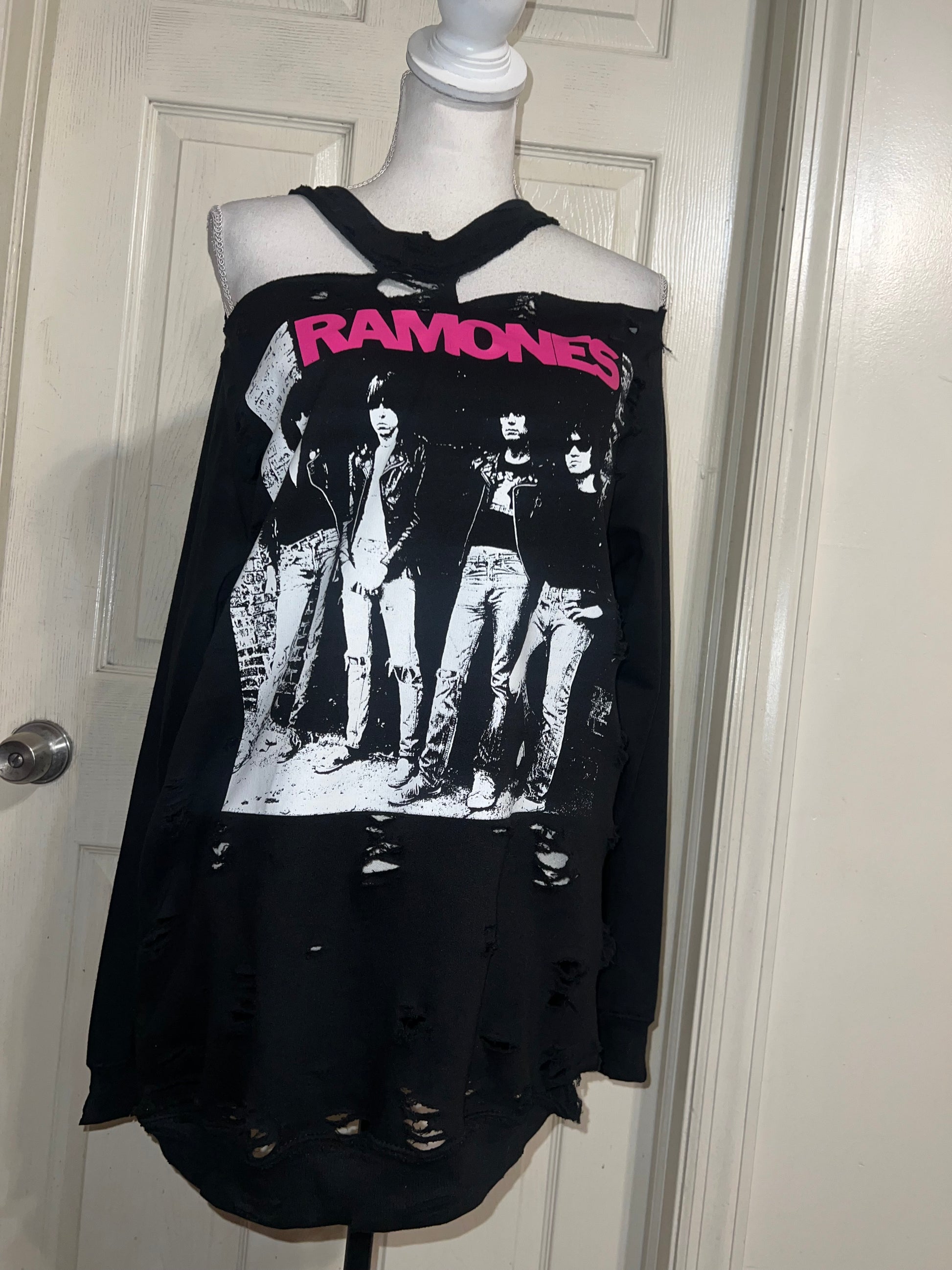 This is a preorder. Please allow extra shipping time. A super cute and comfortable Ramones sweatshirt. The band on the front with Ramones in pink! Oversized and warm. Size M/L.