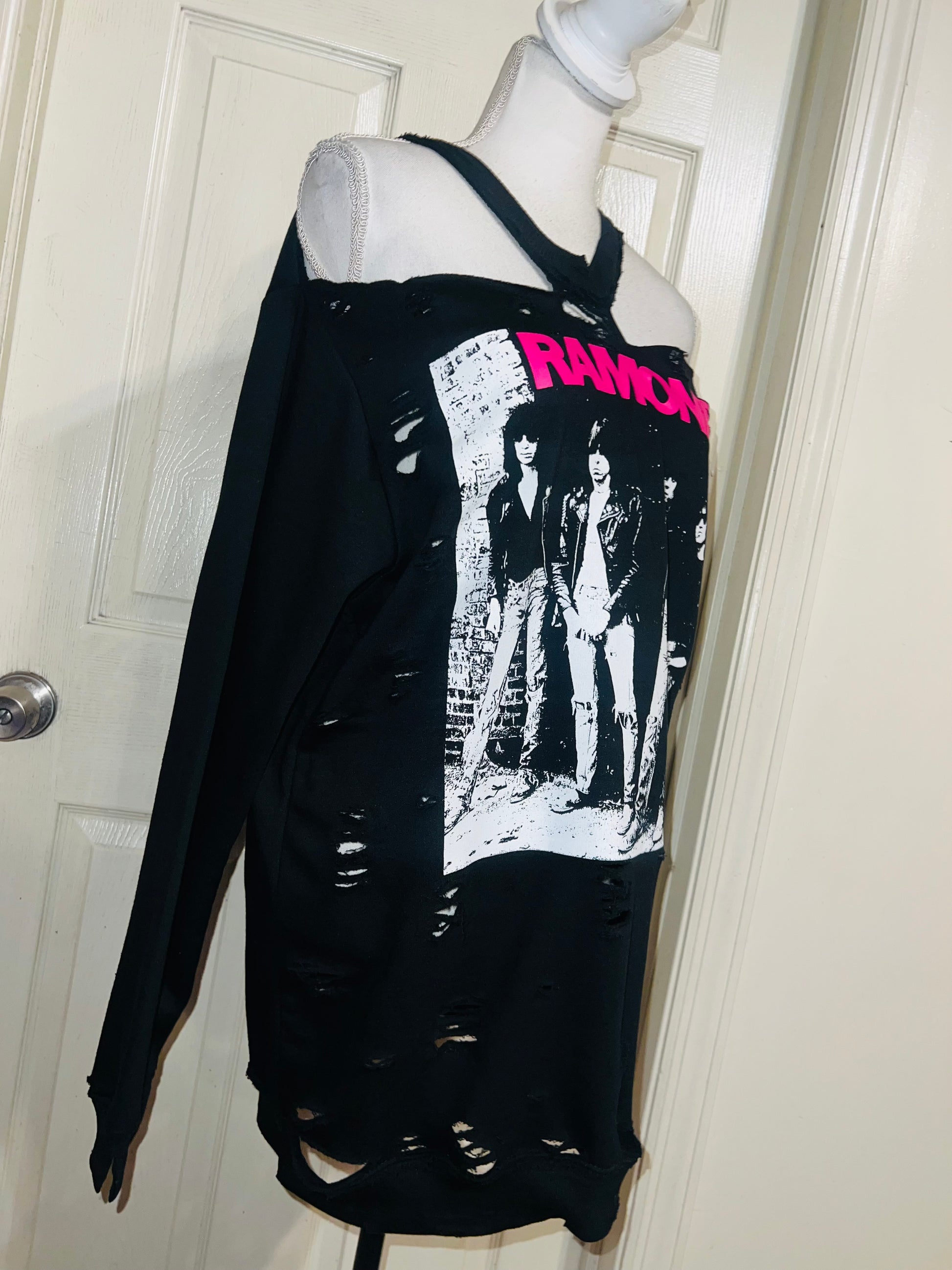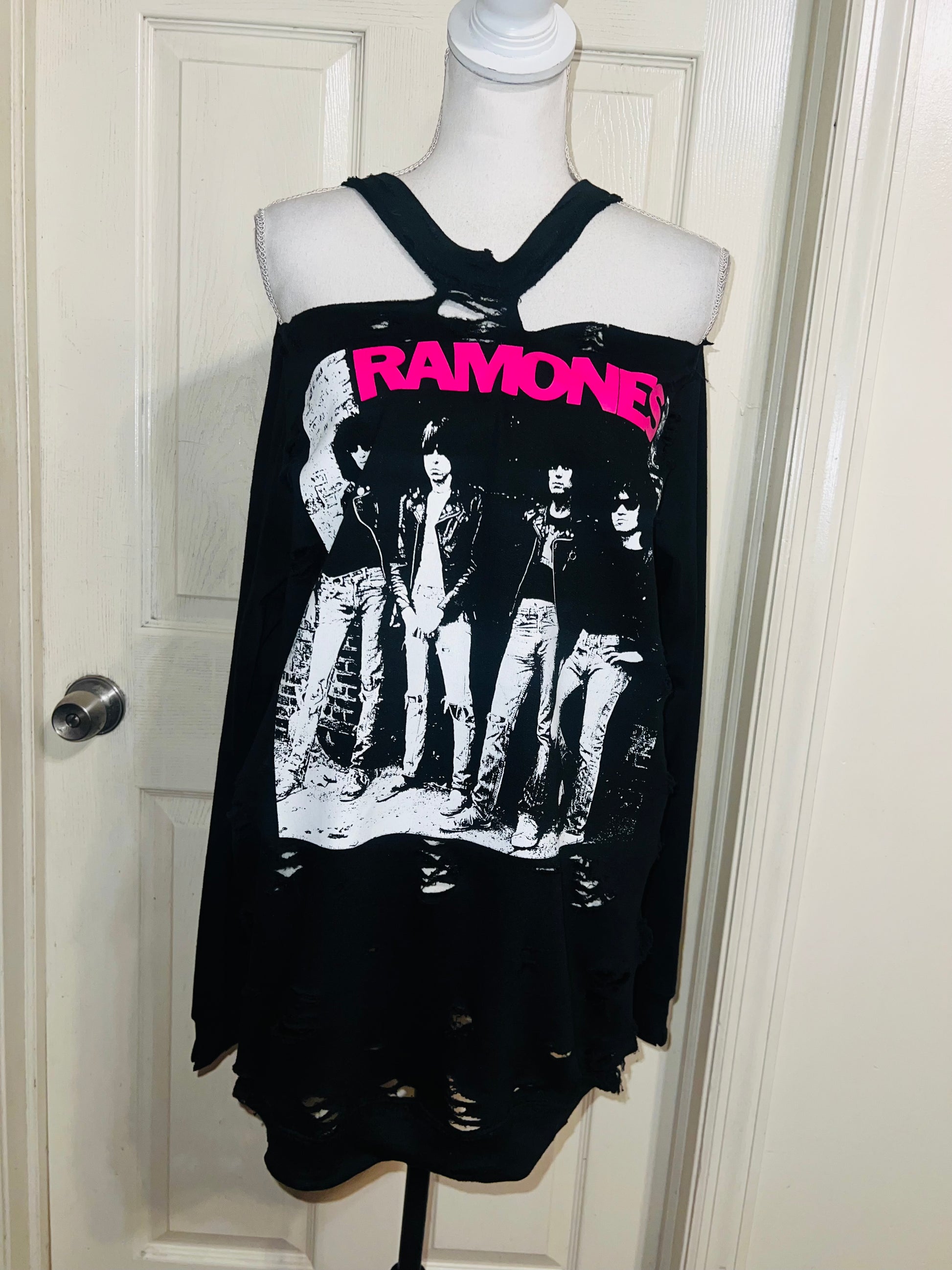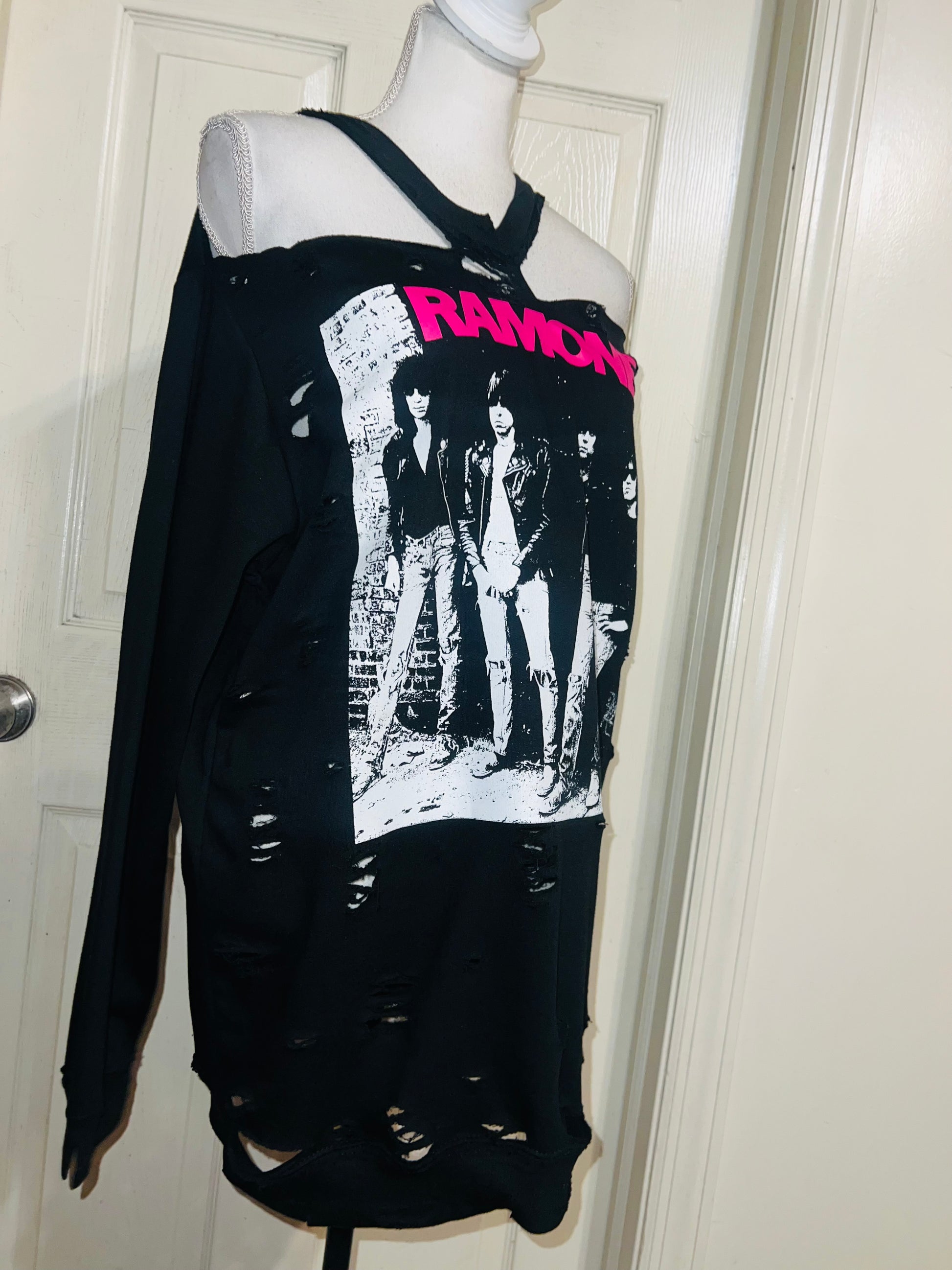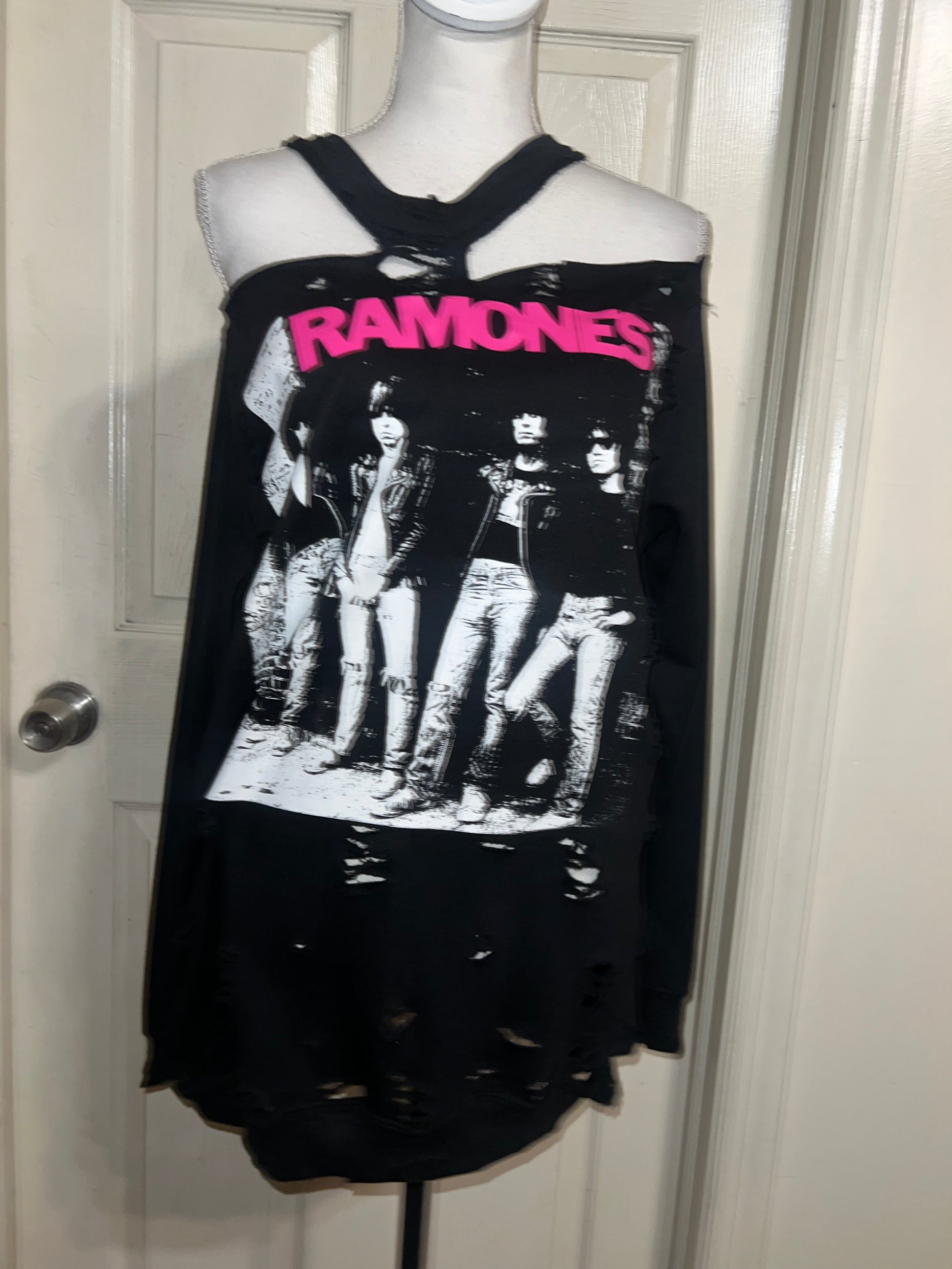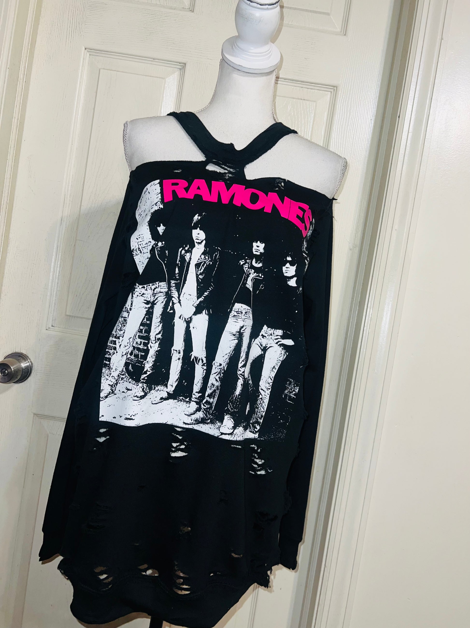 This is a preorder. Please allow extra shipping time. A super cute and comfortable Ramones sweatshirt. The band on the front with Ramones in pink! Oversized and warm. Size M/L.