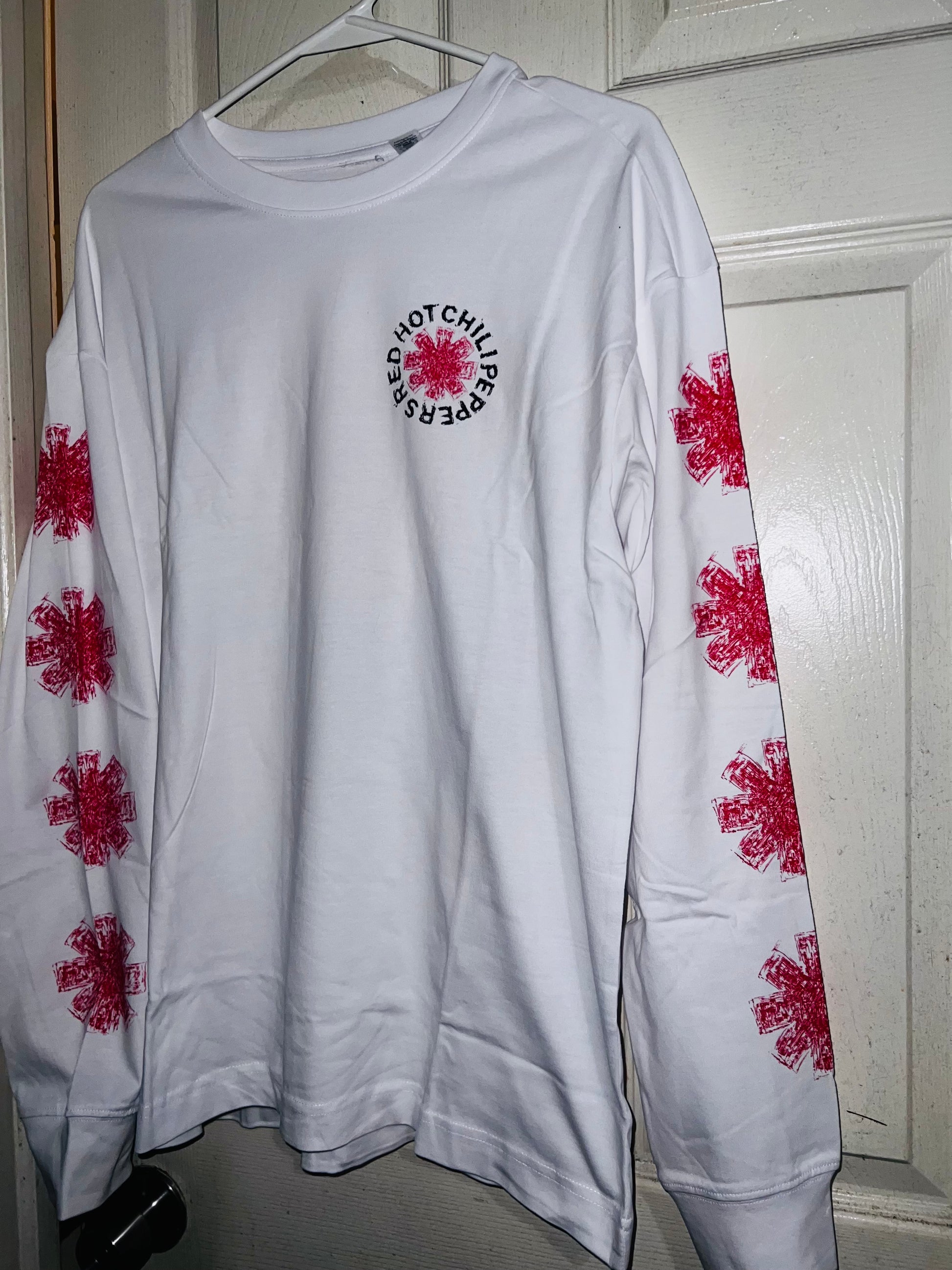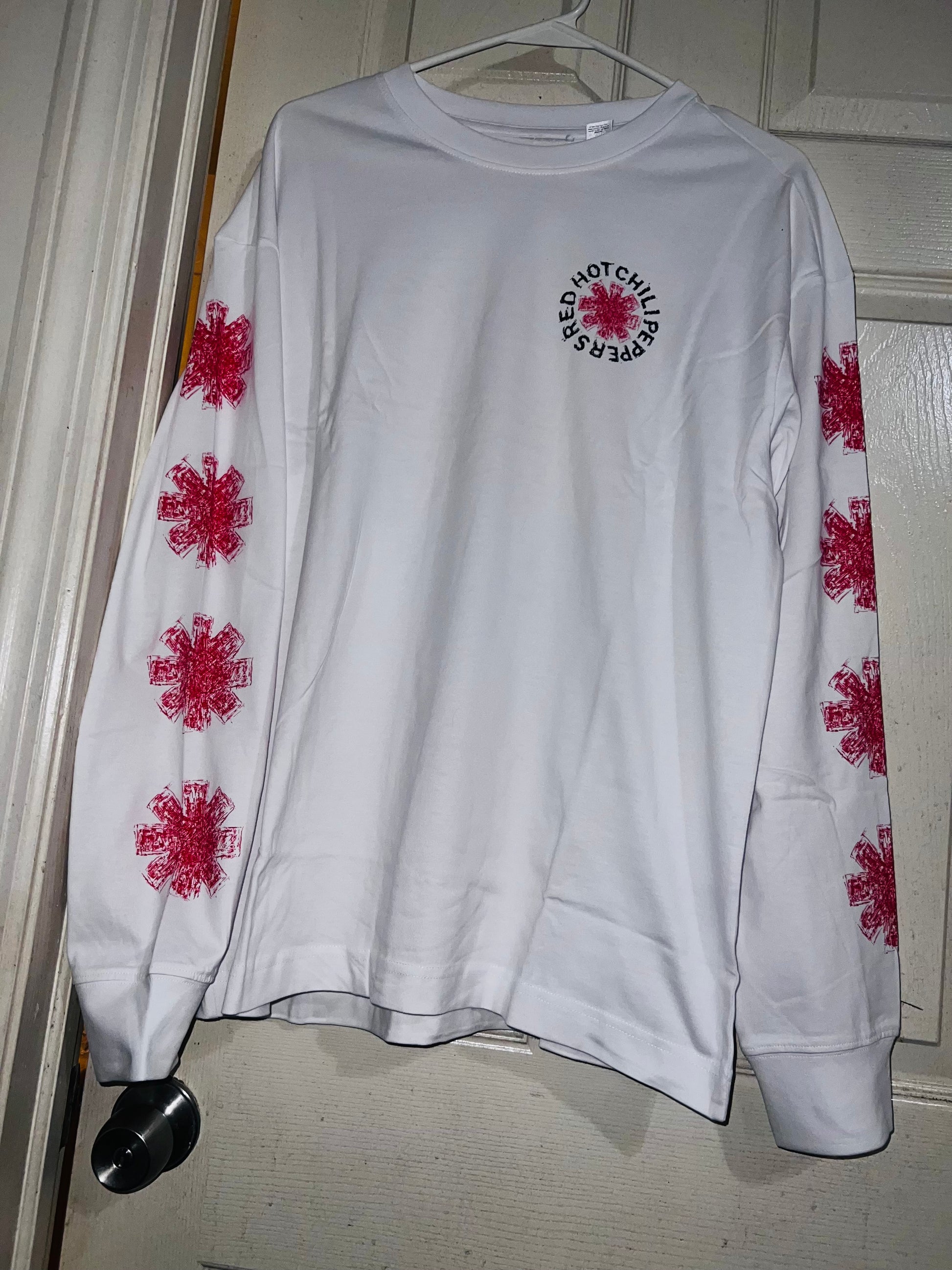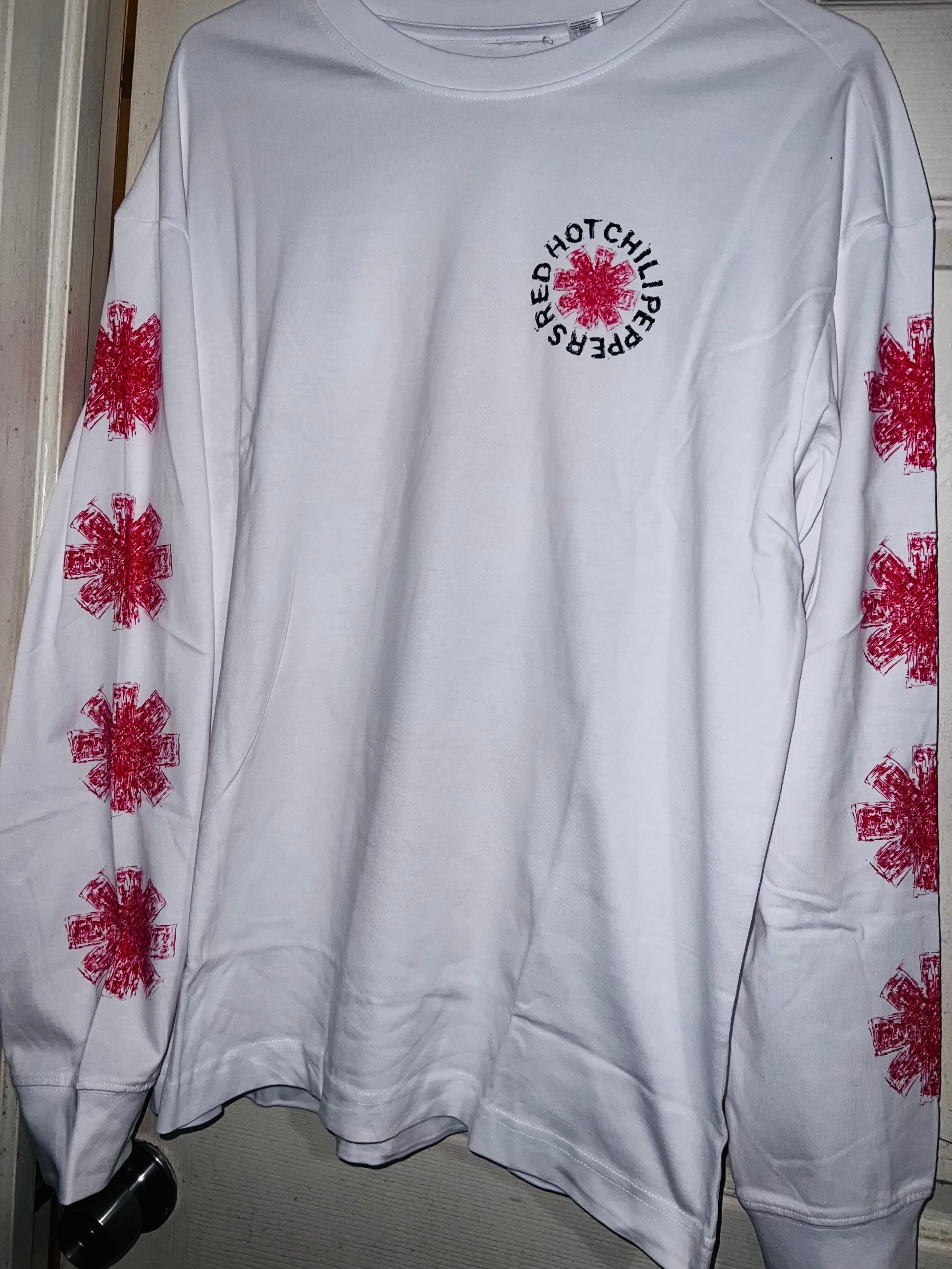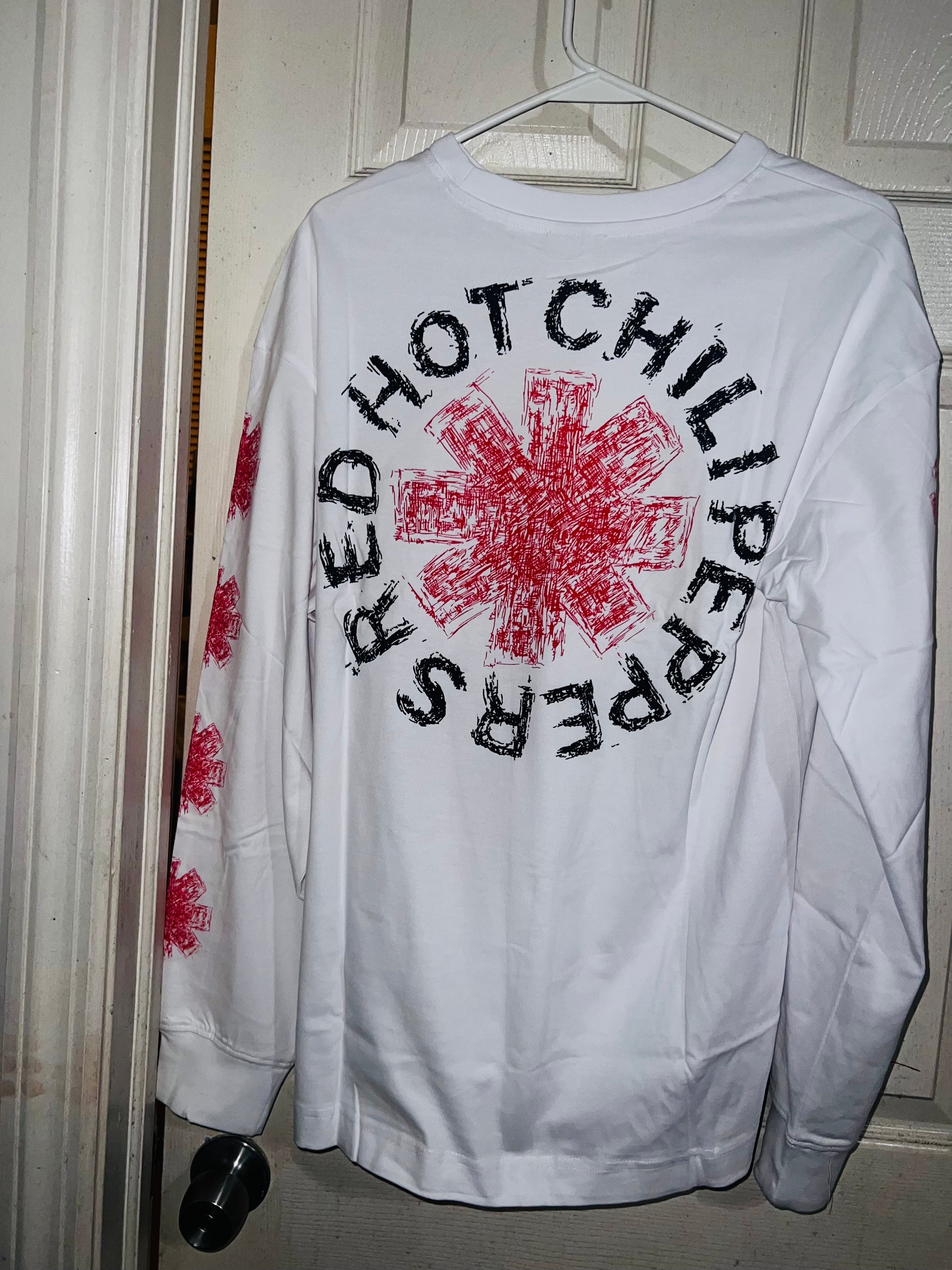 A sick white long sleeve double sided Red Hot Chili Peppers oversized tee. The front has the symbol small on the pocket area, the back has it big with the scribbled RHCP logo, and down the sleeves it has that version of the logo too! So unique and cute. Perfect for fall and winter. SIze L/XL.