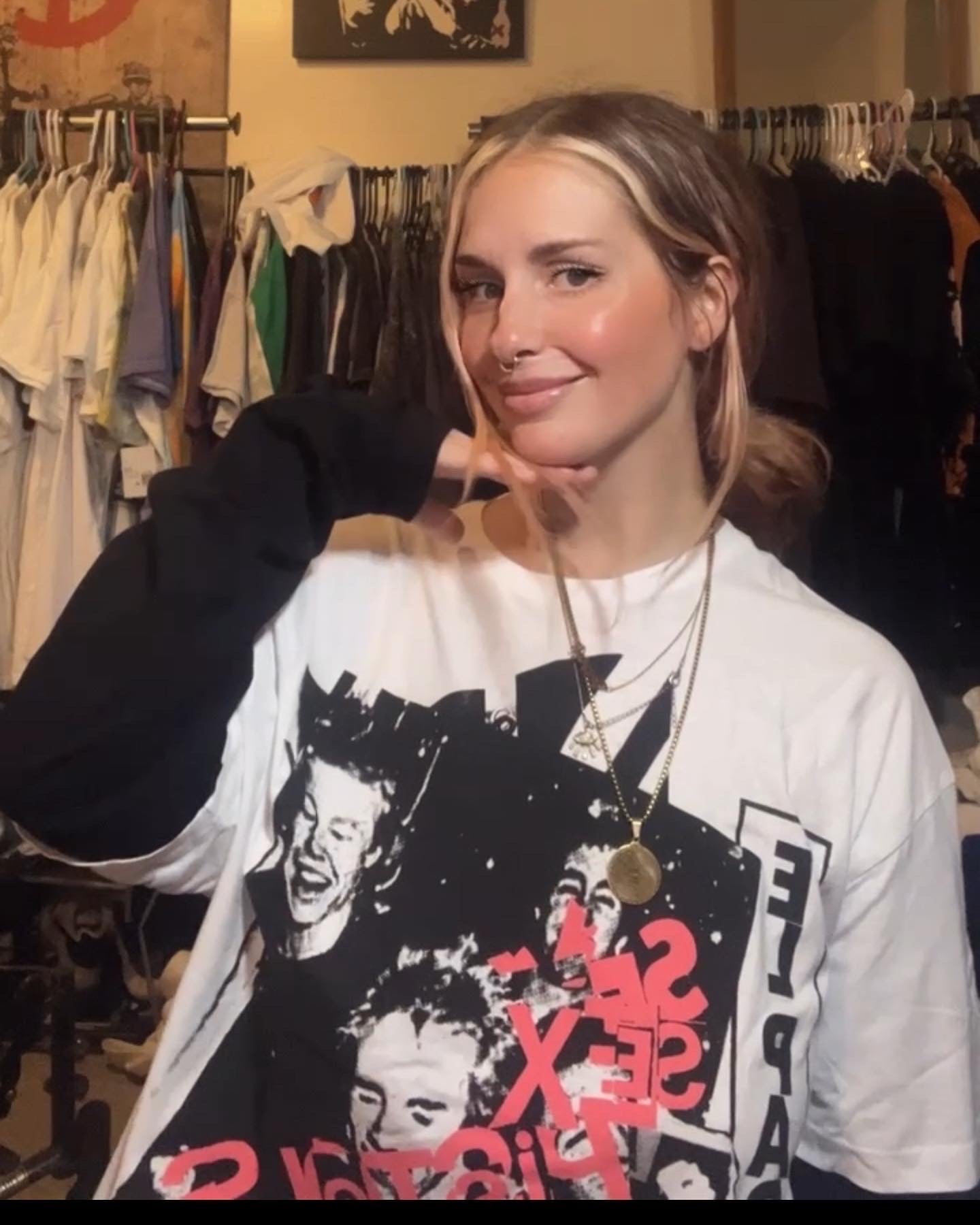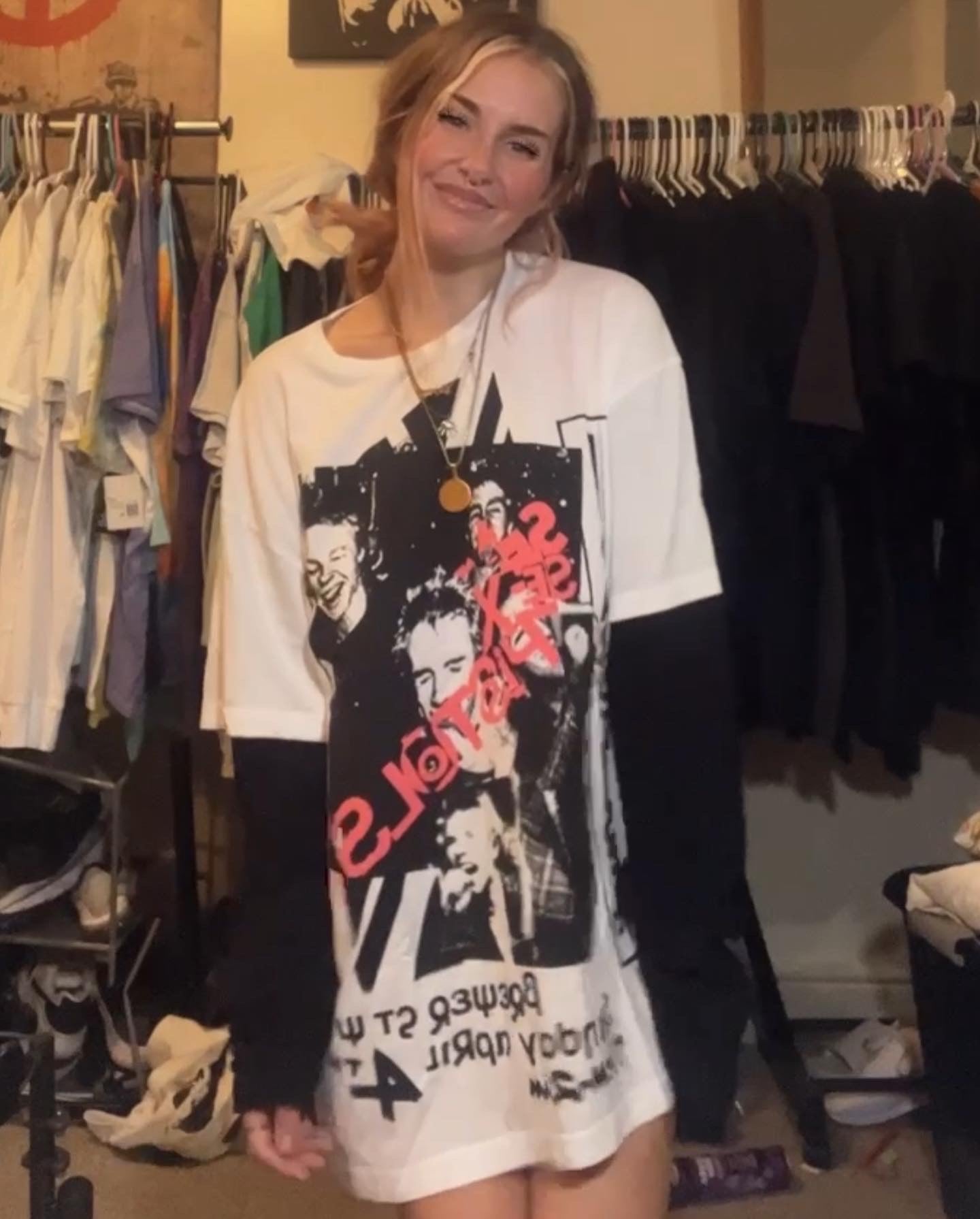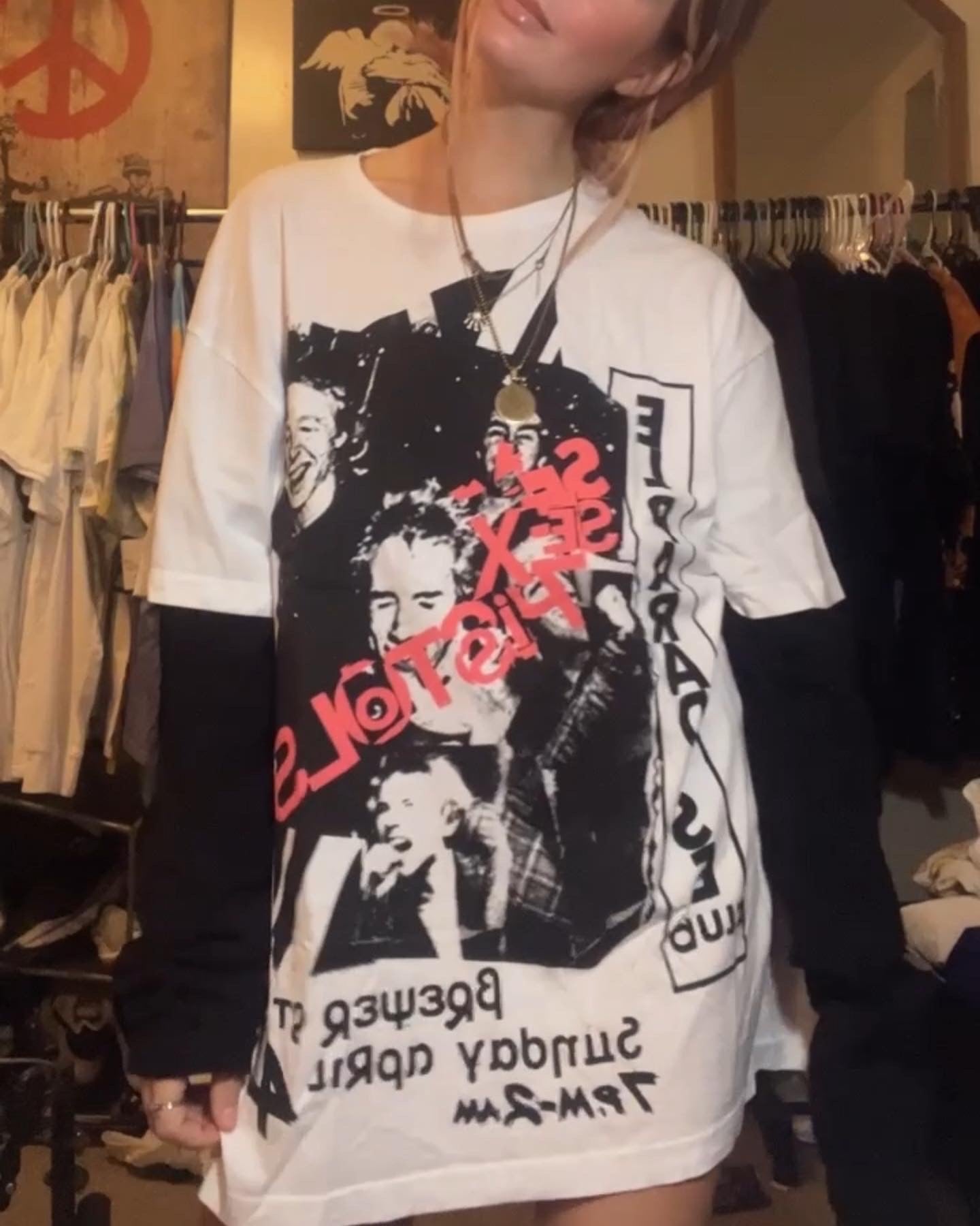 The new trend: tees over long sleeve shirts. Luckily for you, they now make them with just the sleeves so you aren’t bulky or uncomfortable! I’m obsessed with this new trend and The Sex Pistols tee which punk/chic x Vivienne Westwood. Still oversized and the sleeves aren’t right either, size XL.