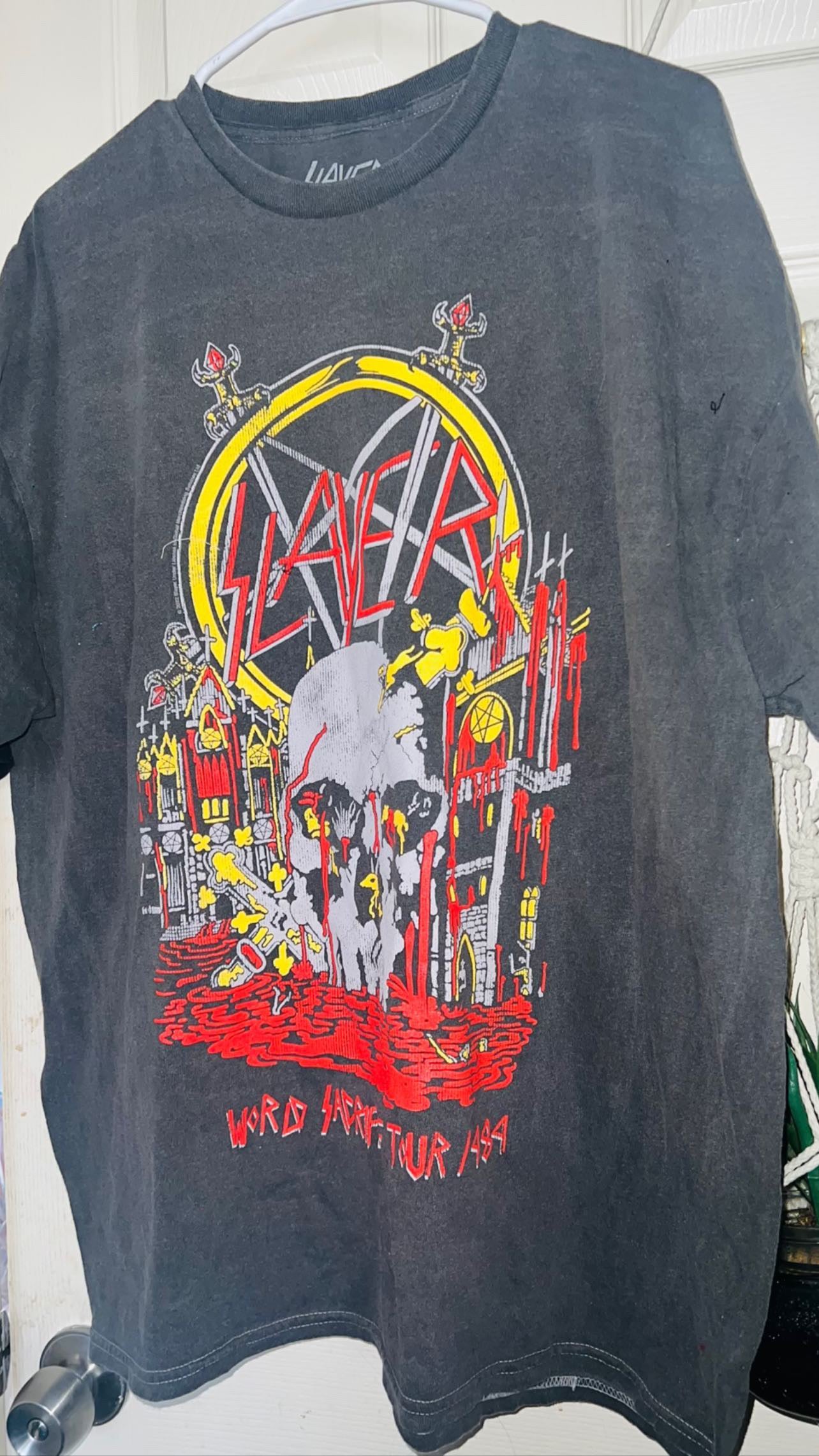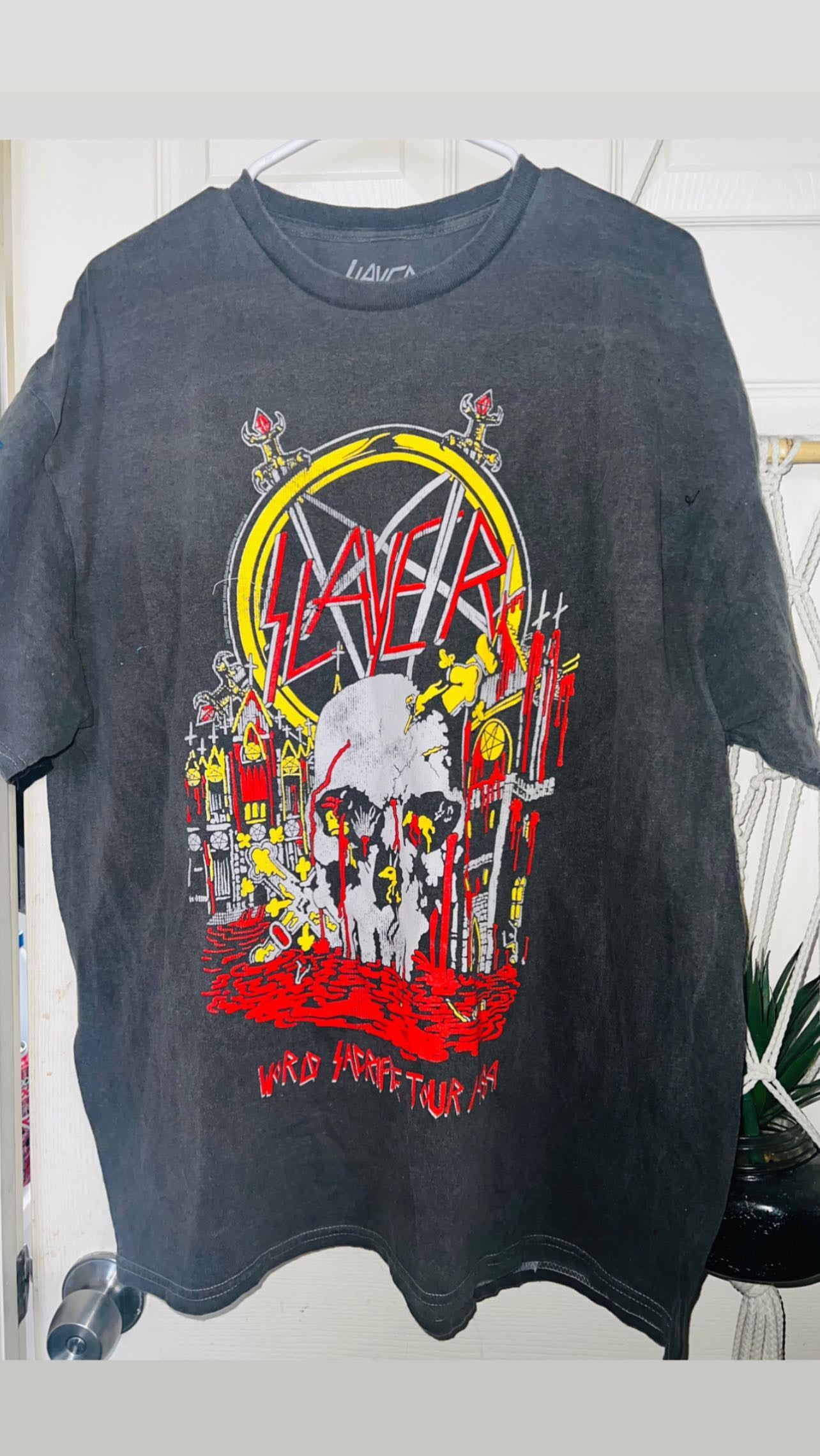 A mineral washed grey Slayer tee with a sick graphic on the front and their band logo. I love this one so much. Oversized XL.