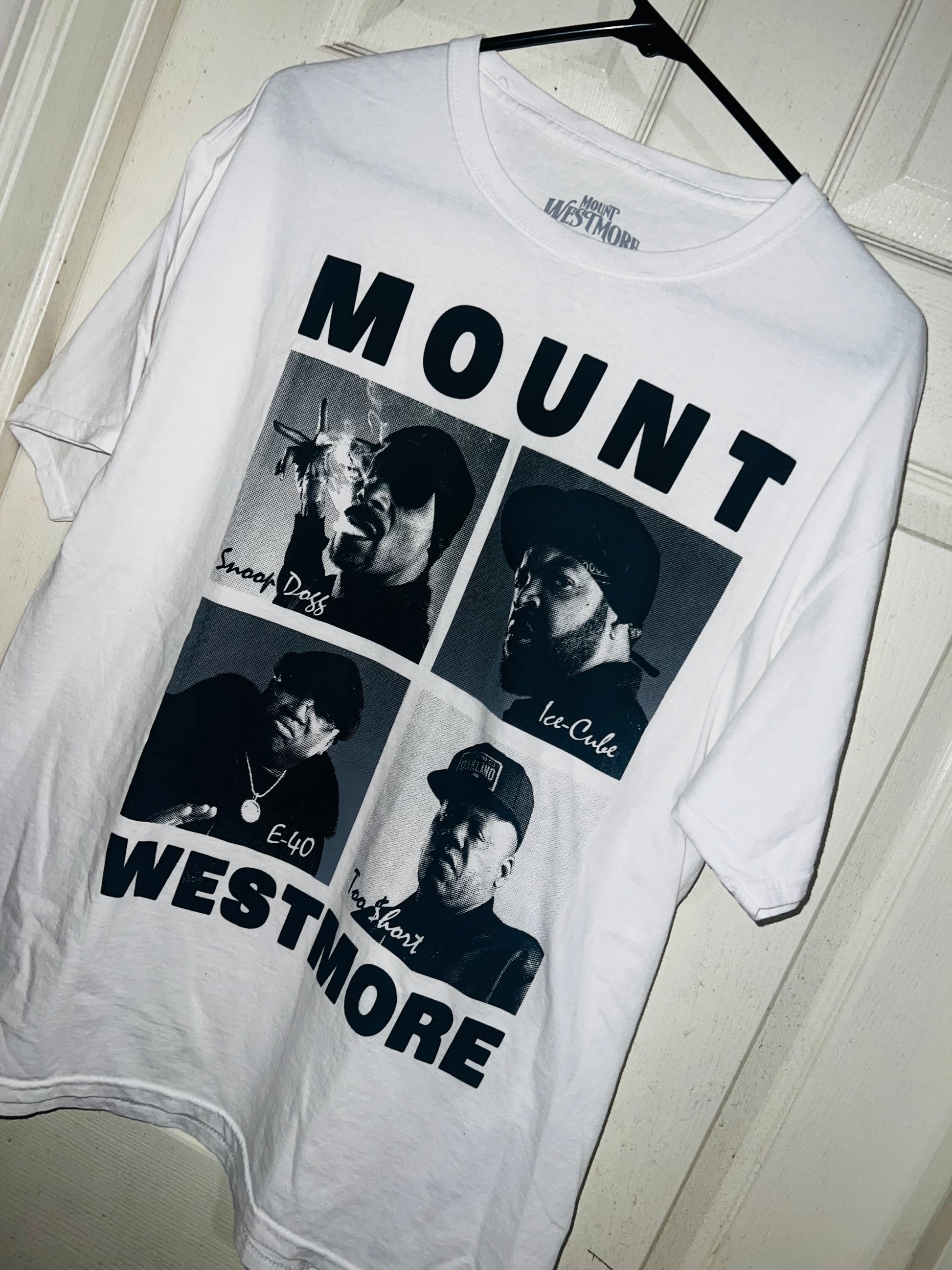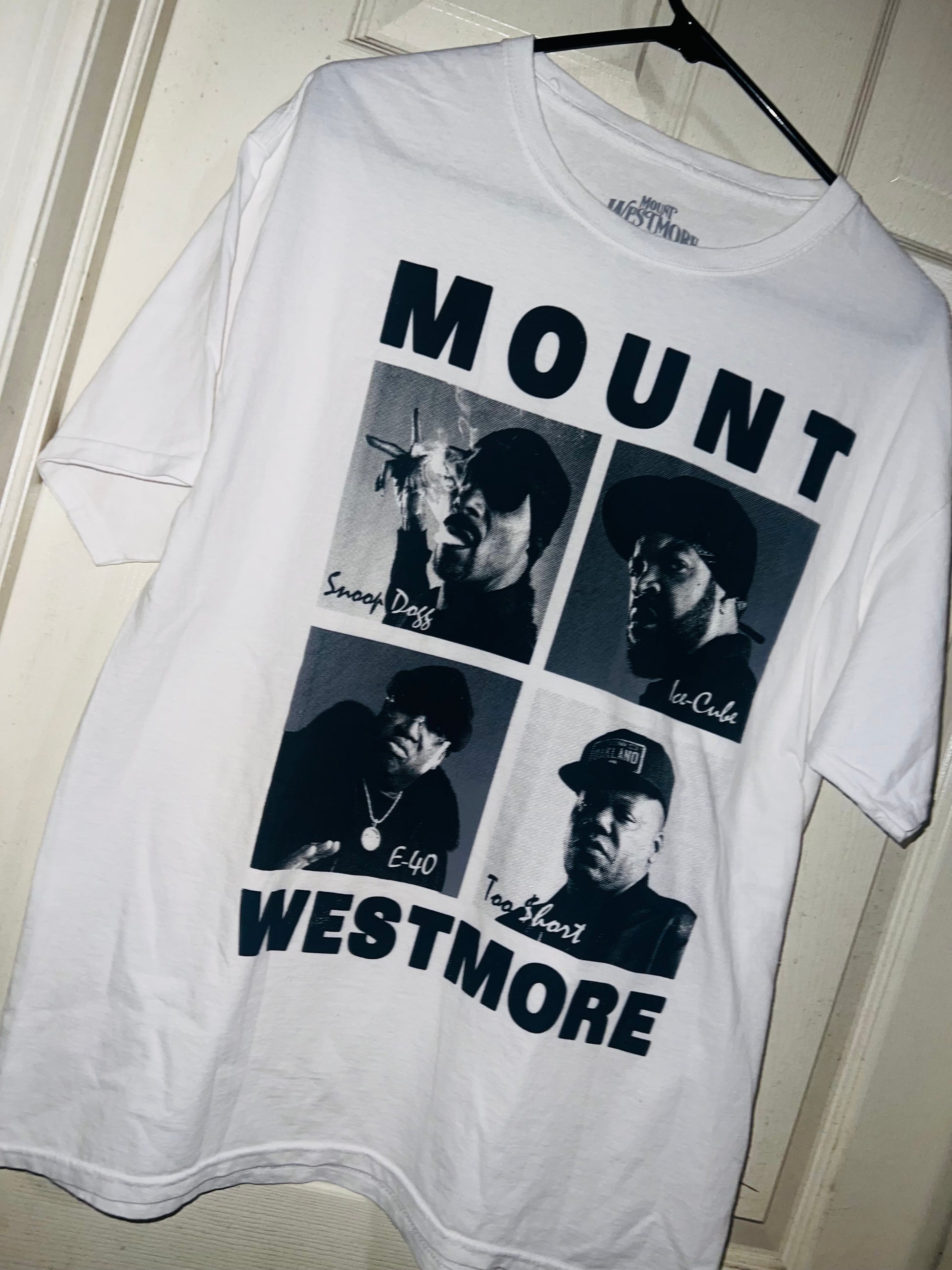 A super cool and cute tee that says Mount Westmore with Snoop Dogg, Ice Cube, E40, and Too Short with each sick portrait of them. Size large, oversized.