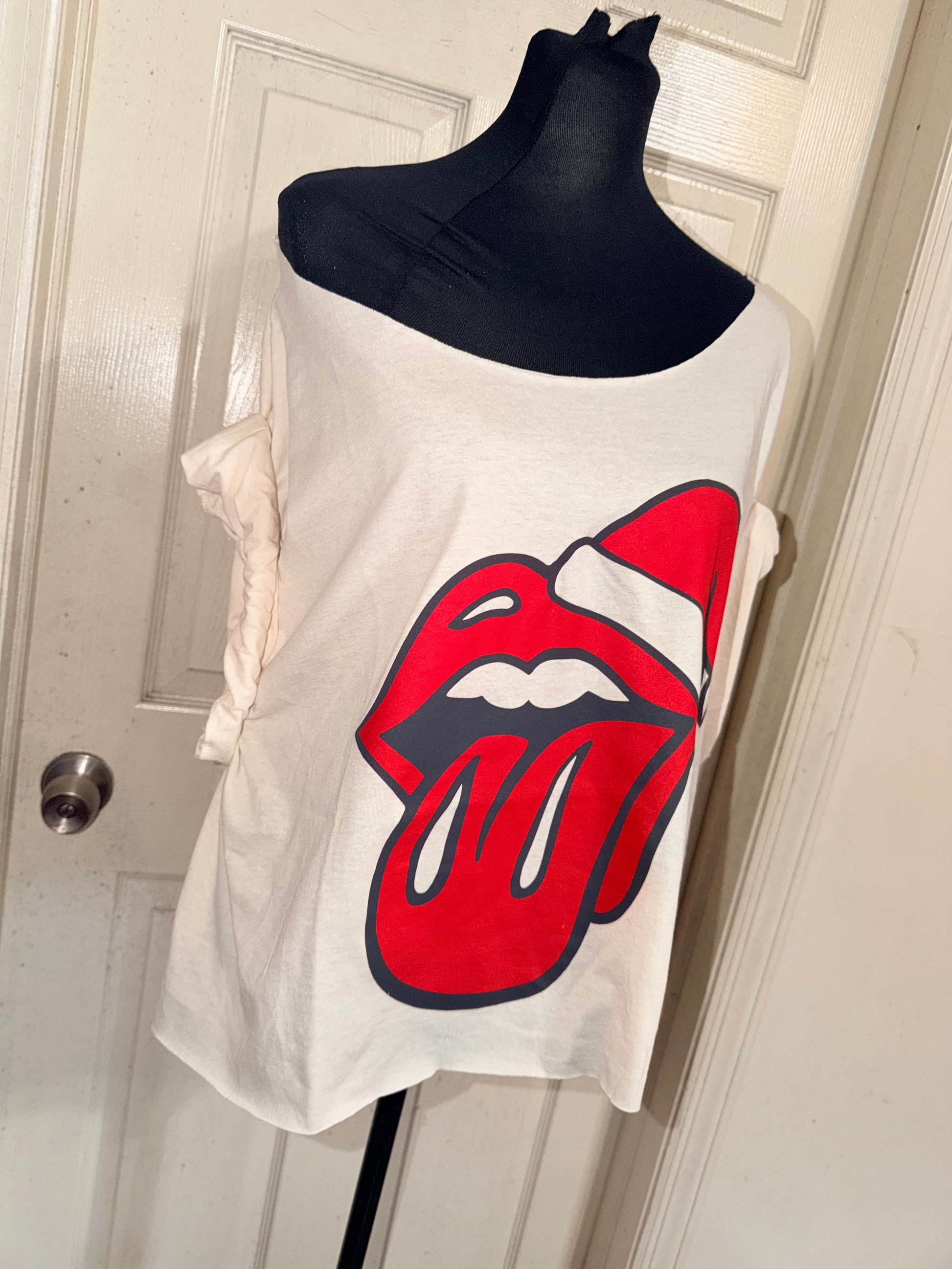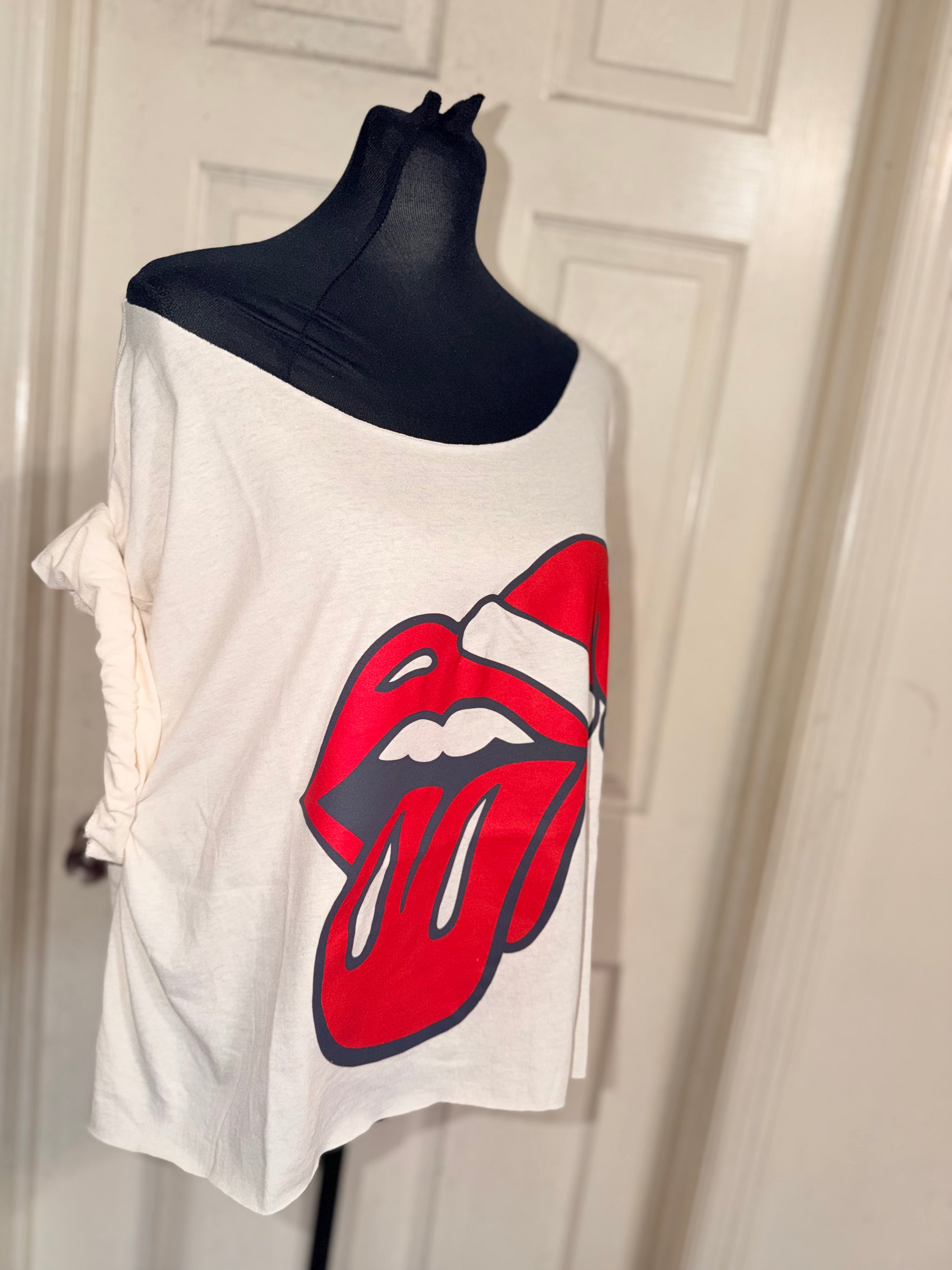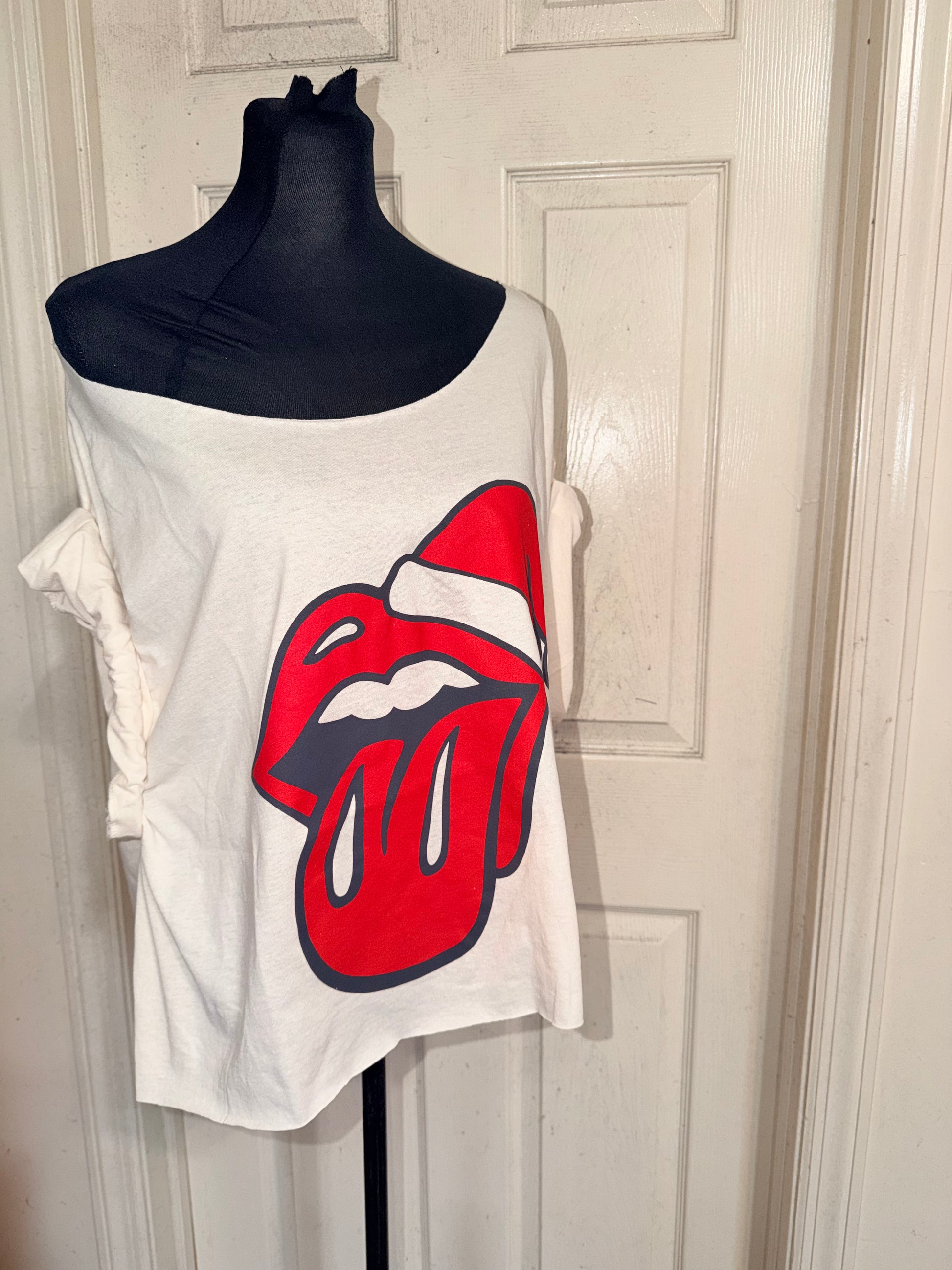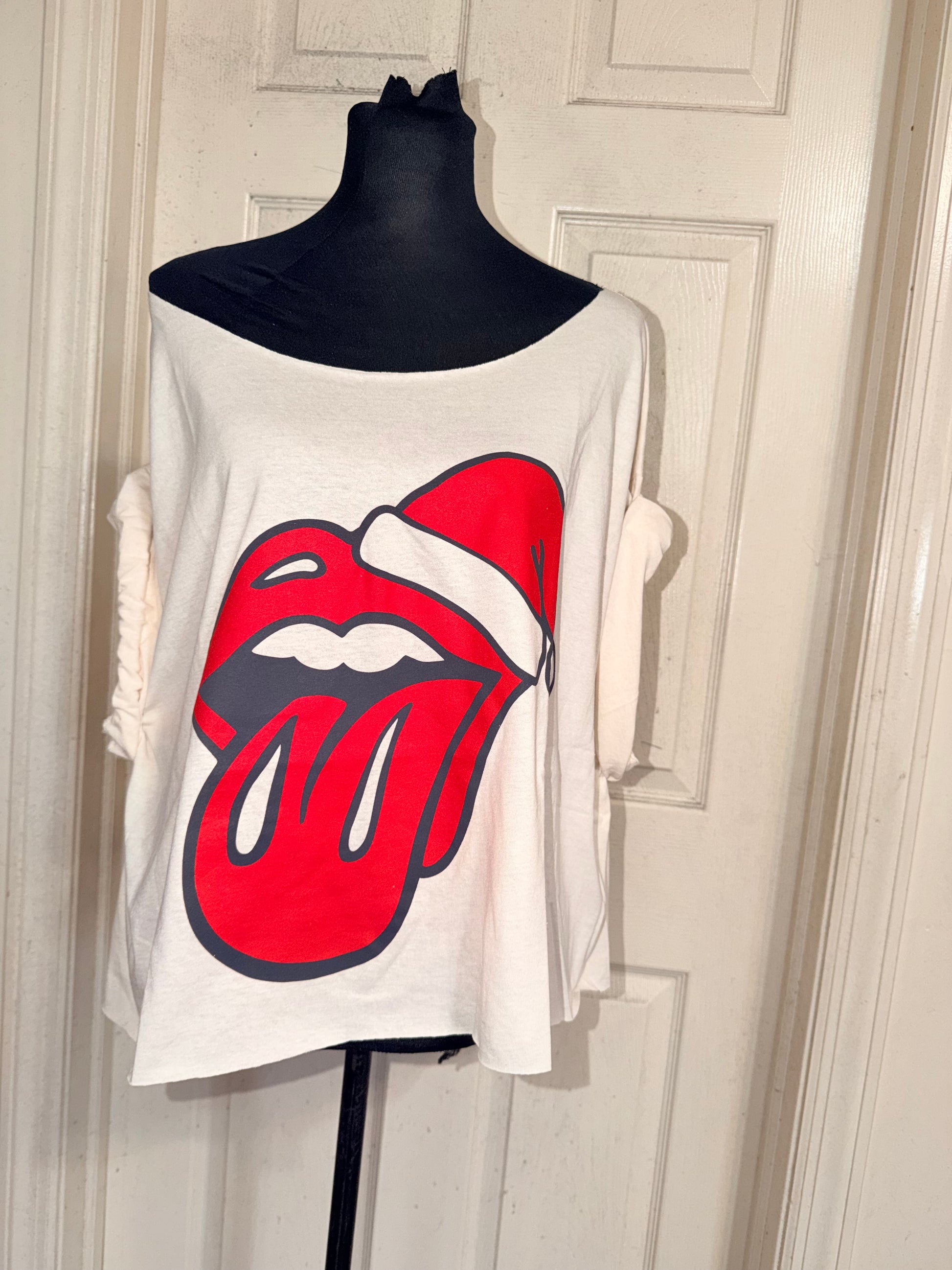 A white Rolling Stones tee with a cute Santa hat on the logo! Off the shoulder, oversized. Shortened!