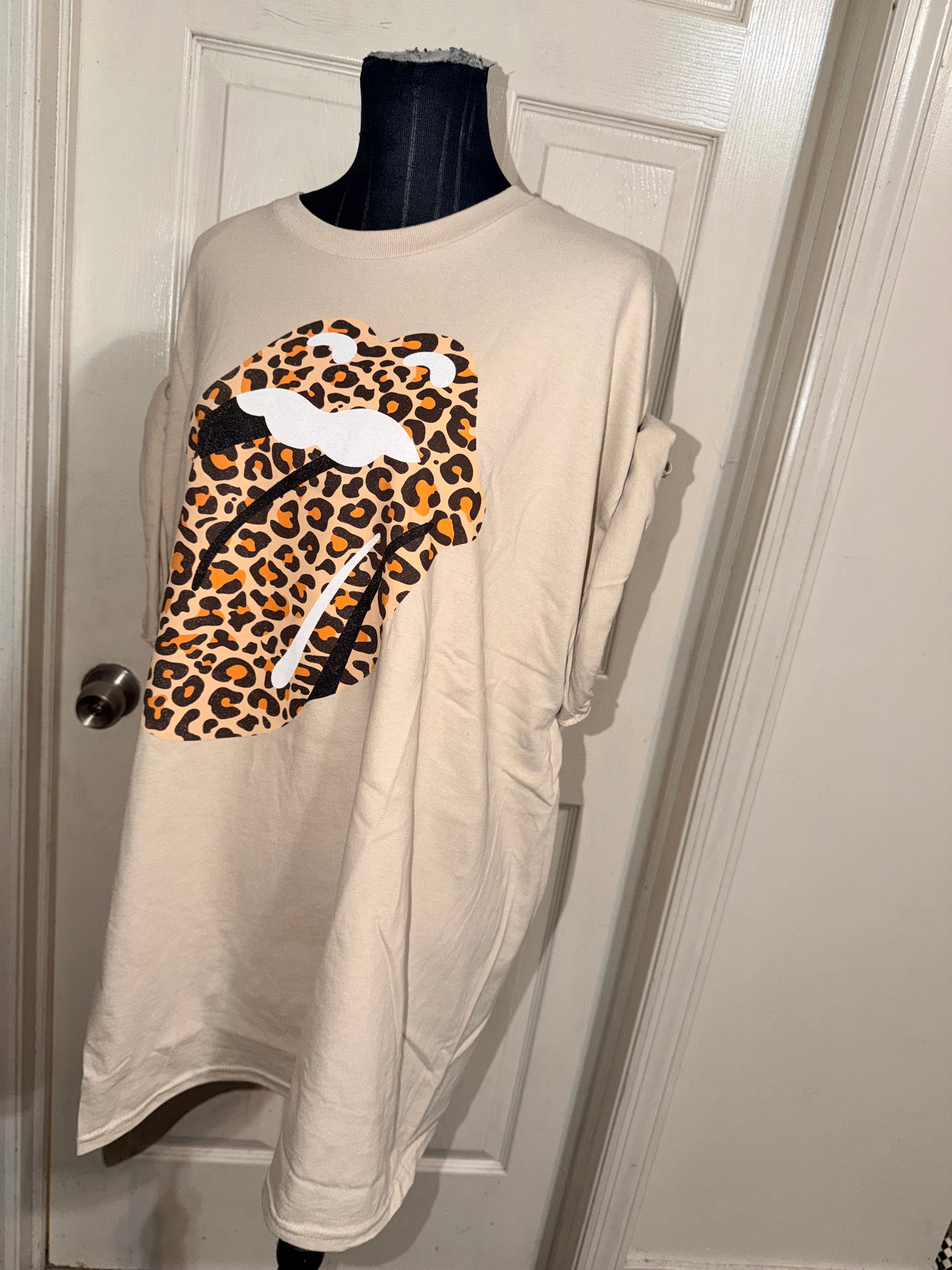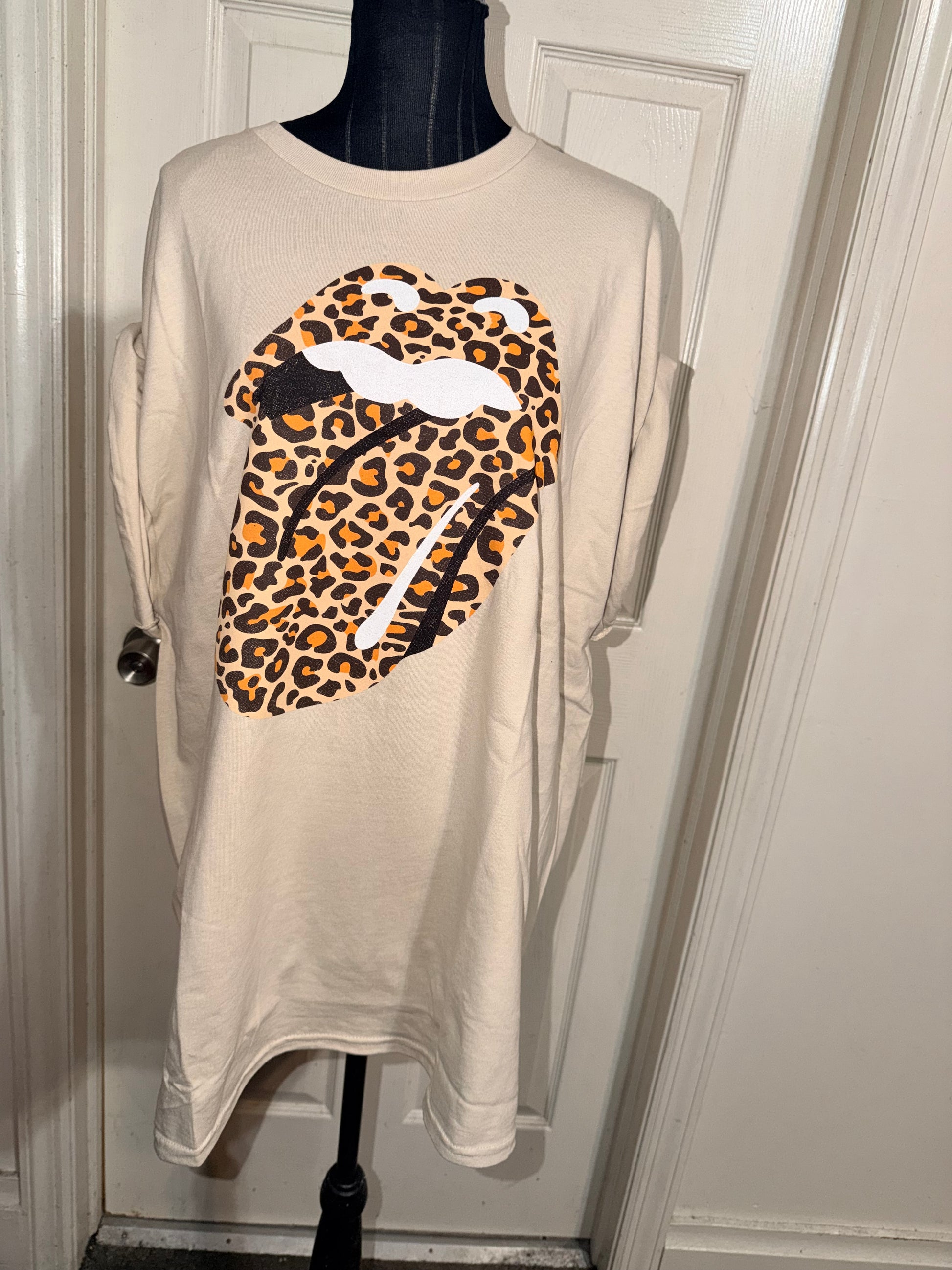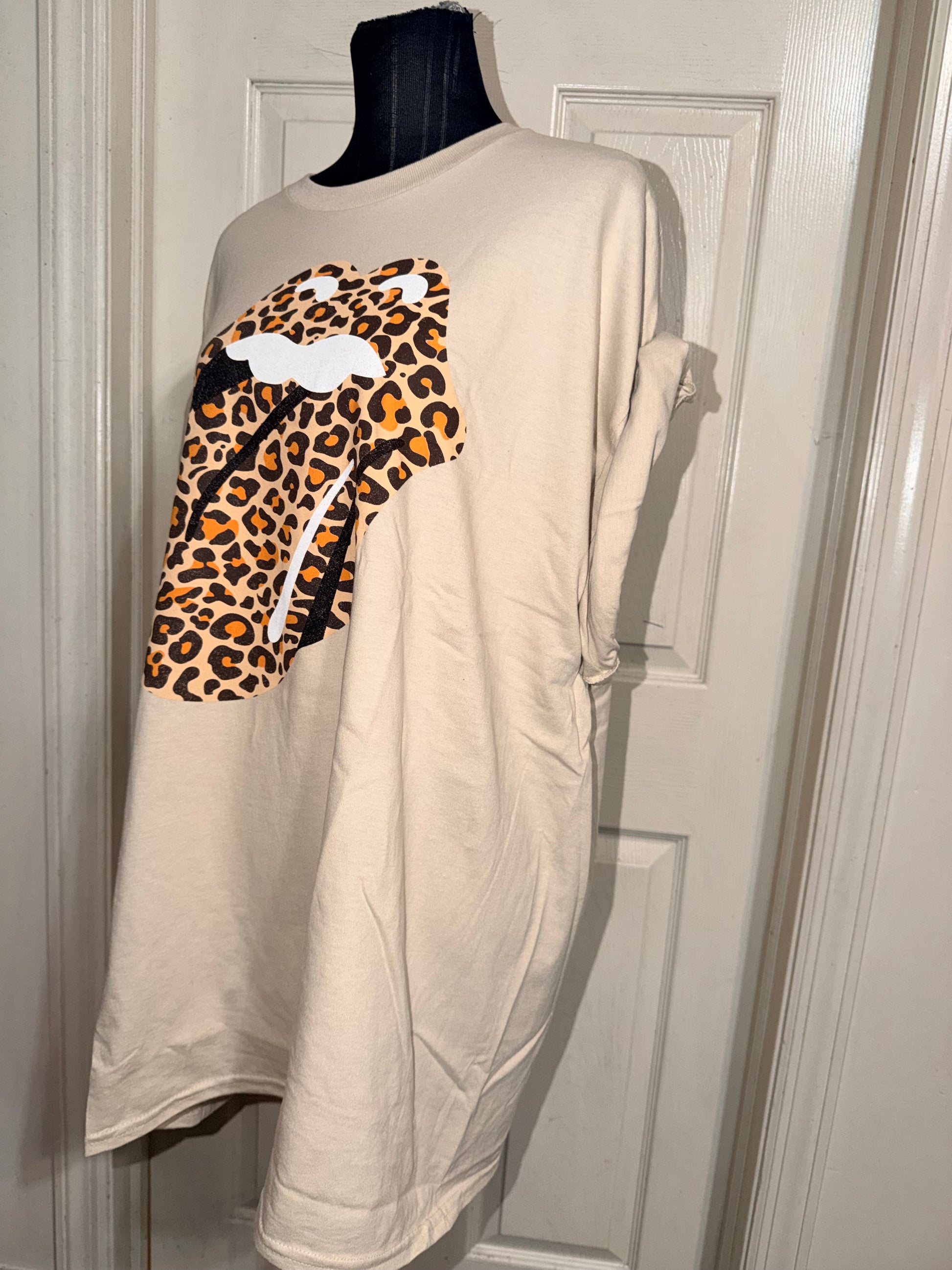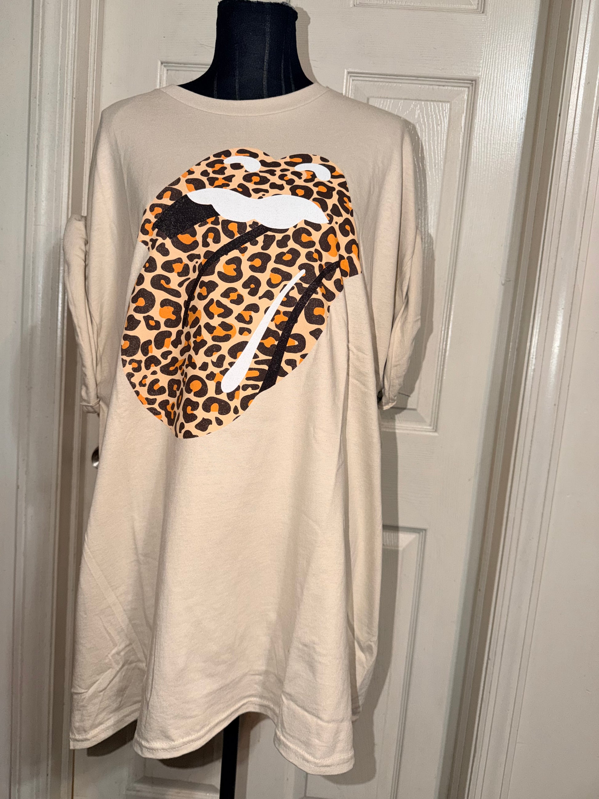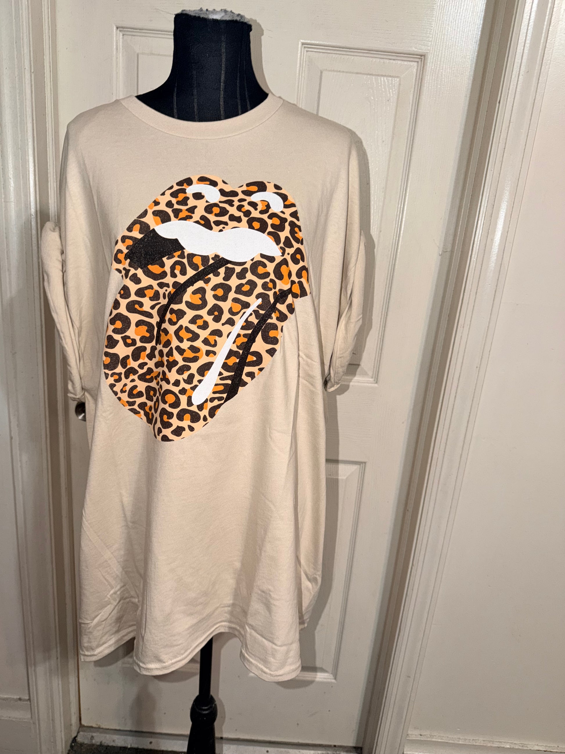 This is now a preorder. A tan Rolling Stones cheetah logo tee. Oversized.