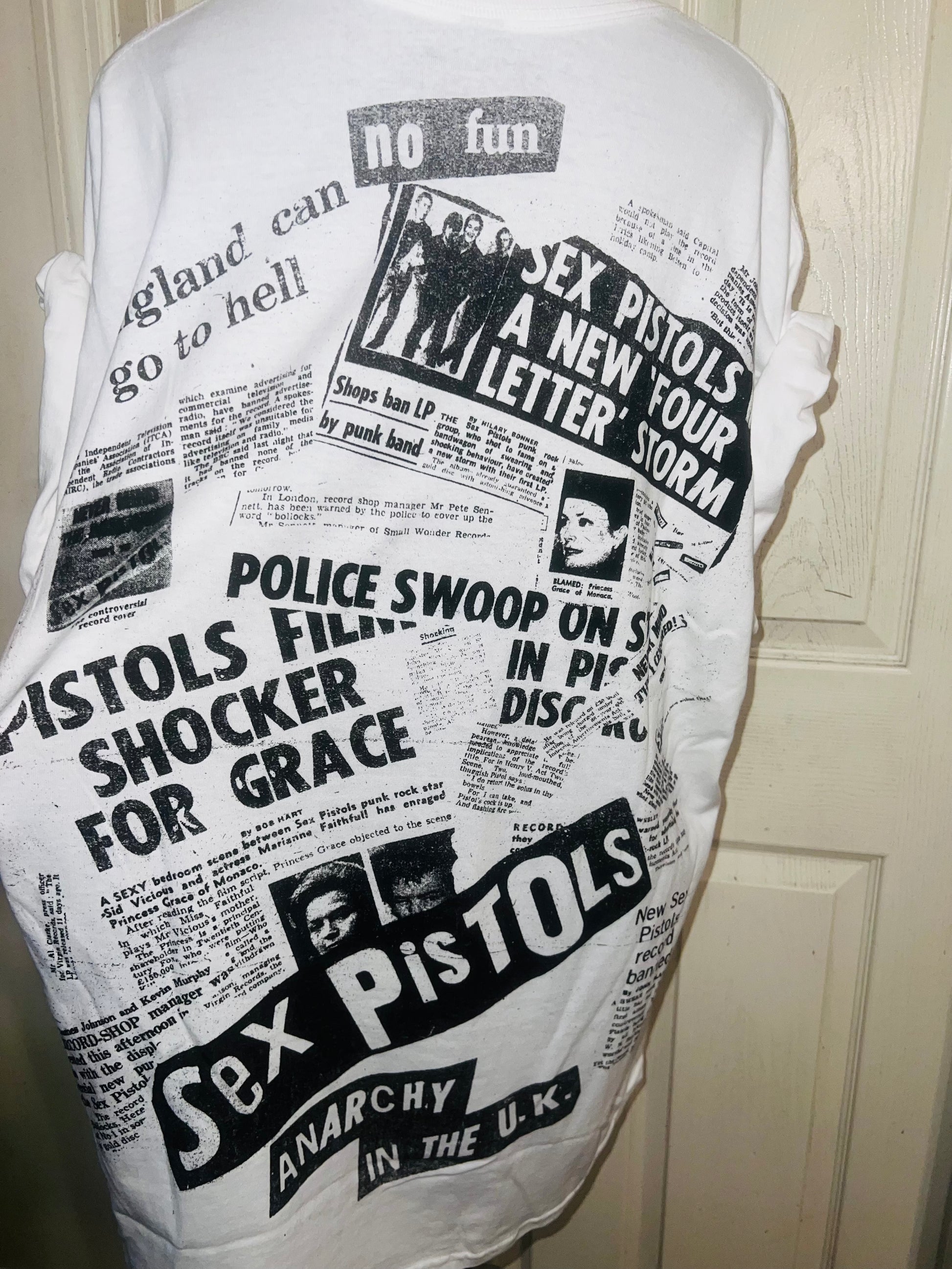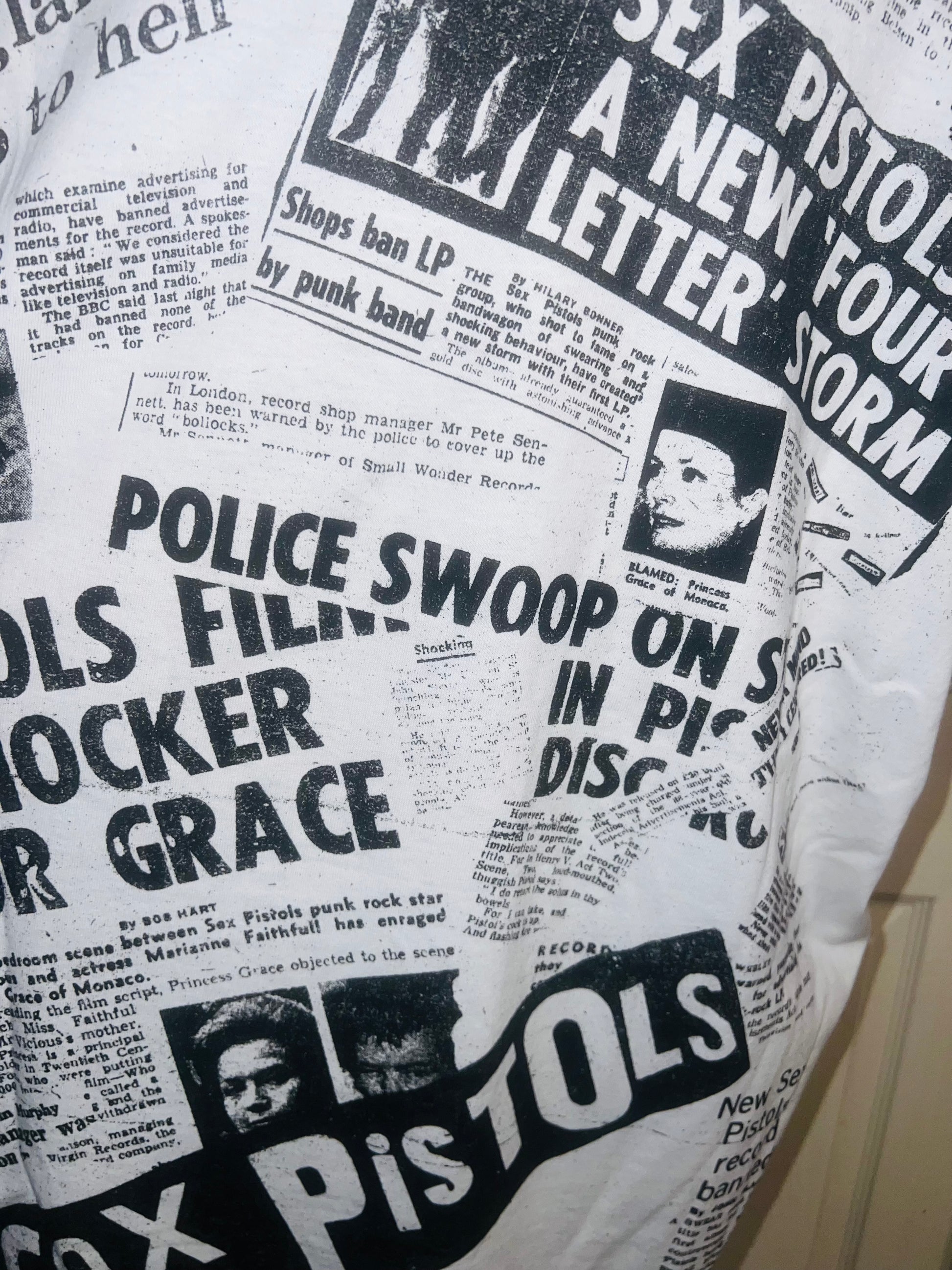 This is a preorder. A white double sided Sex Pistols shirt with the back covered in old newspaper headlines about anarchy in the UK! Super cool. Fits like an XL, oversized.