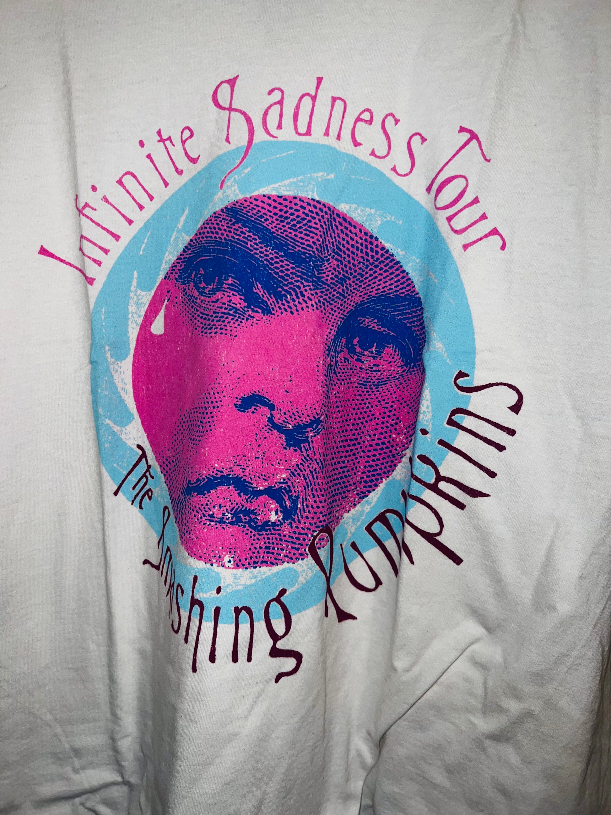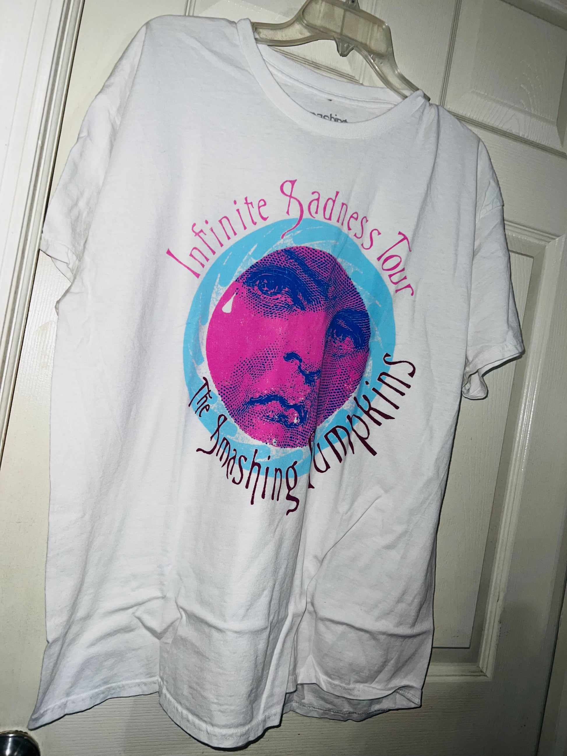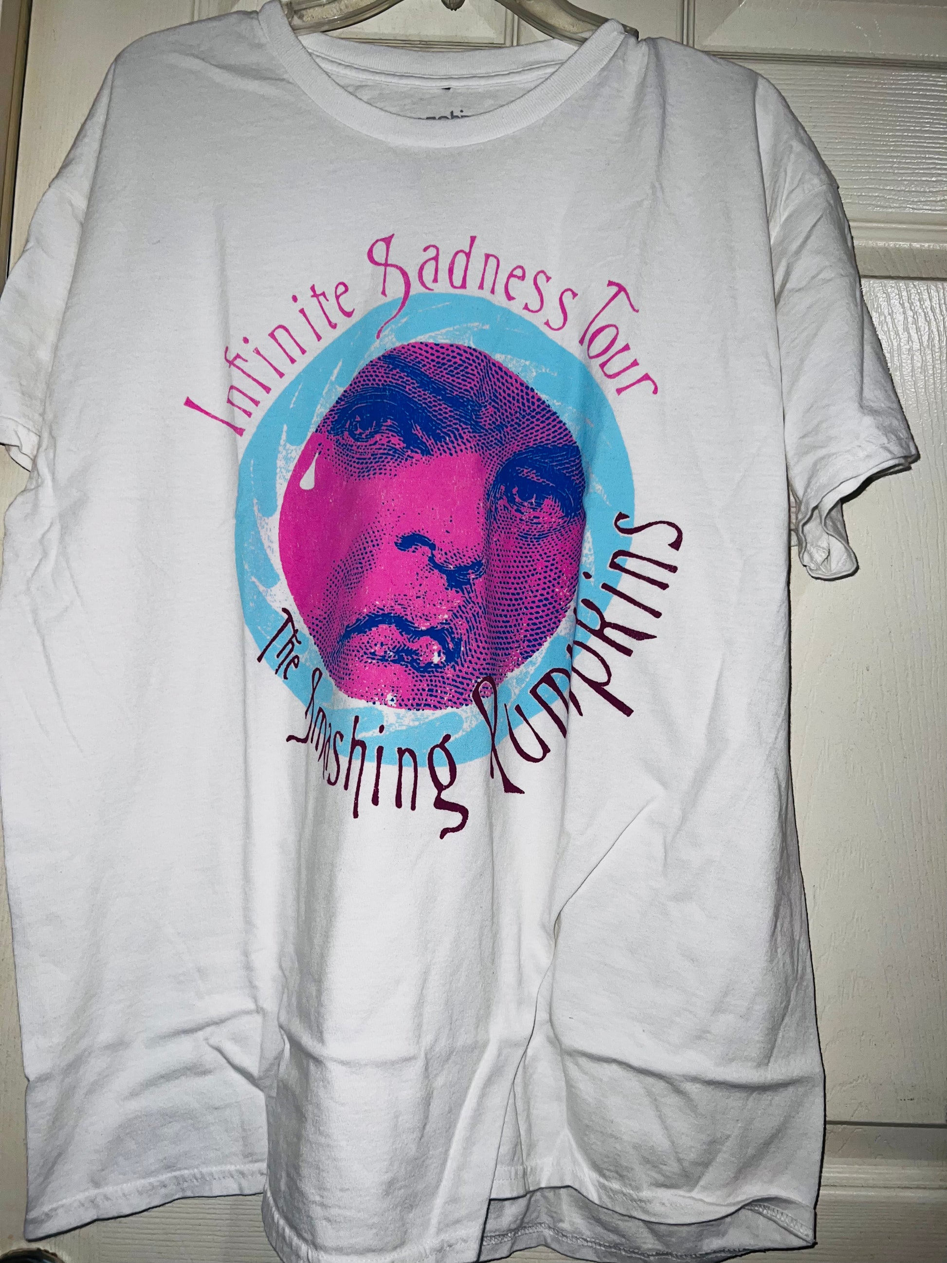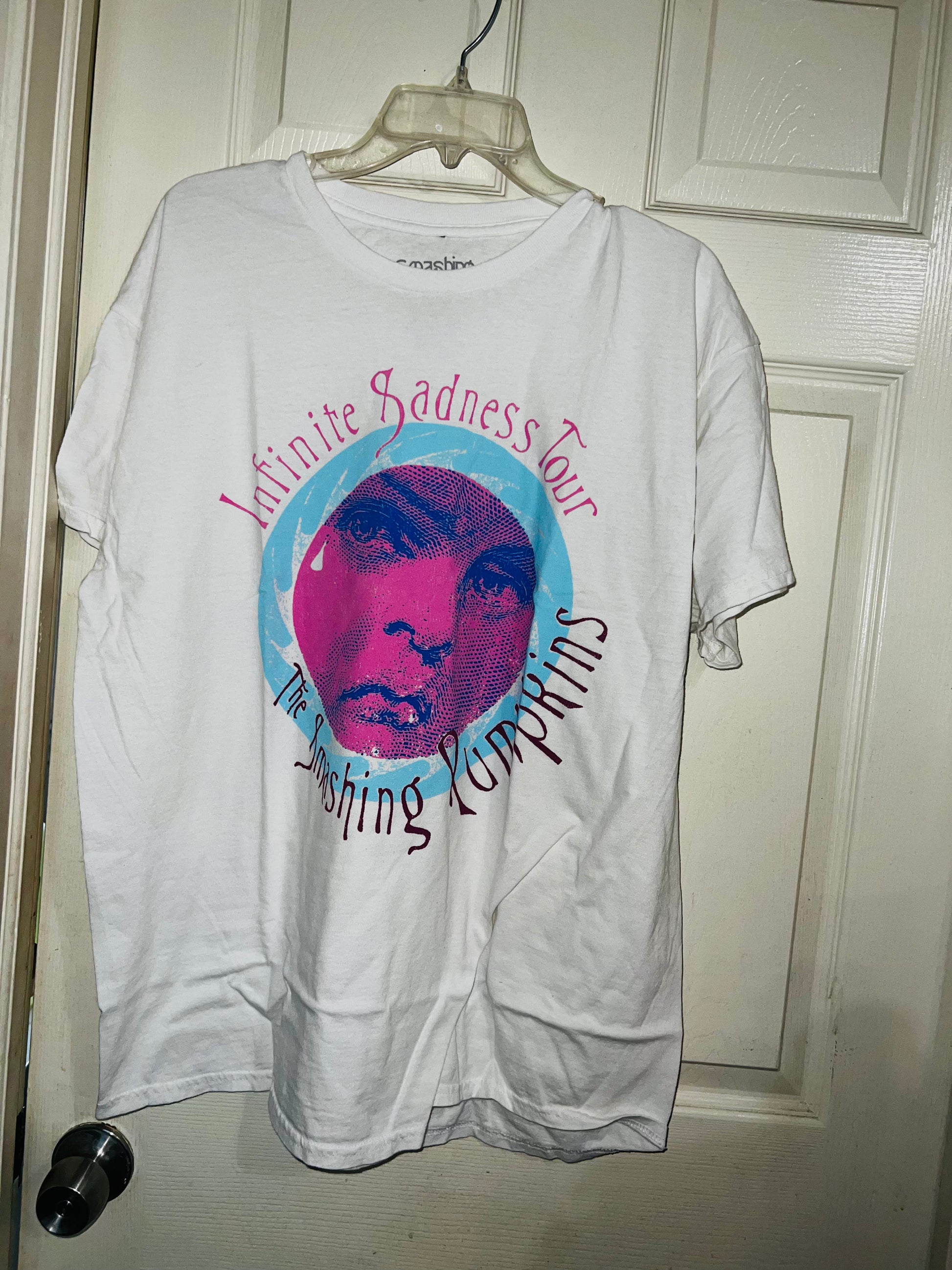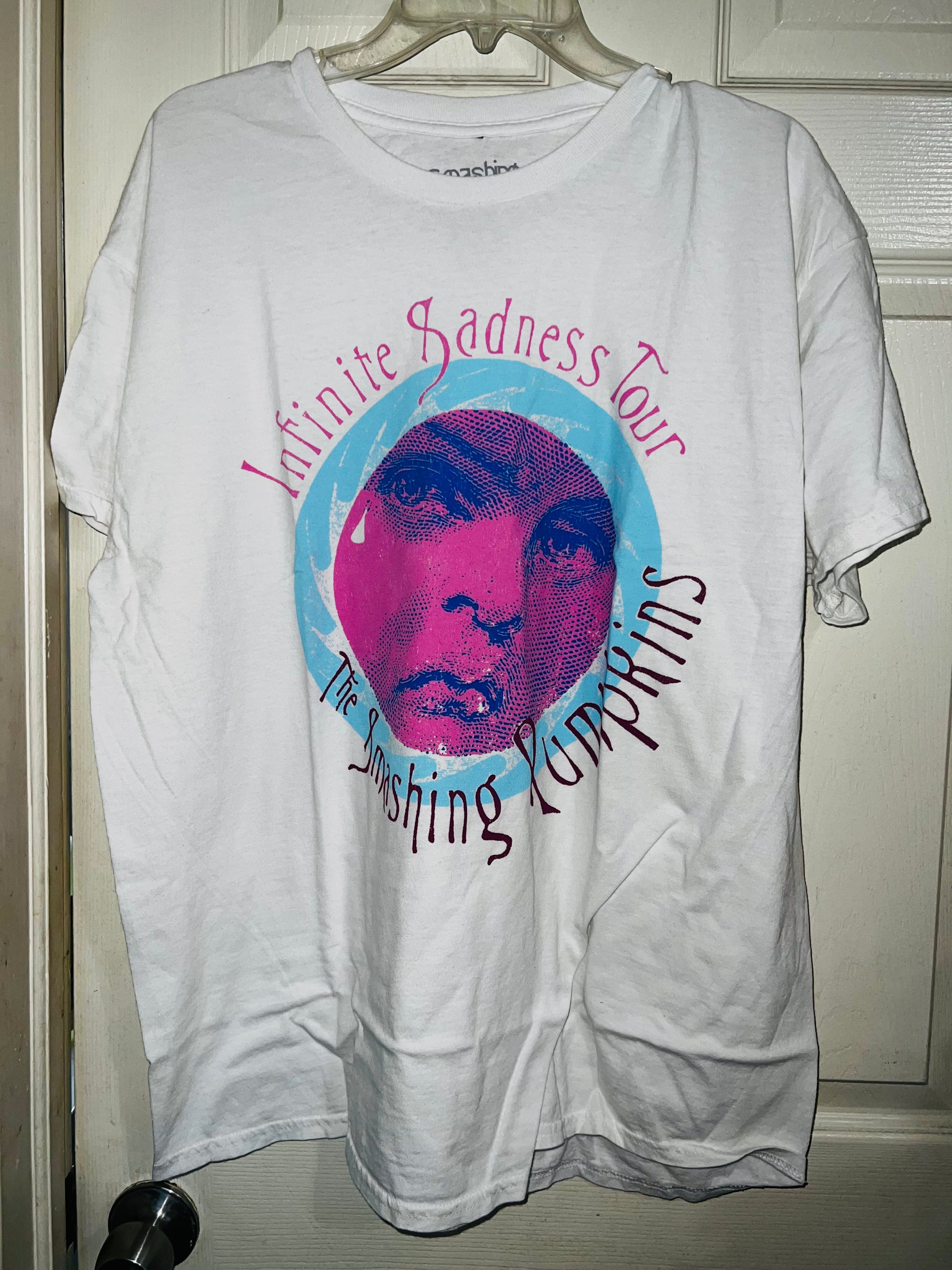A white Smashing Pumpkins “Infinite Sadness Tour” tee with pastel contrast, this is an oversized shirt perfect for styling in the summer! Size L/XL!