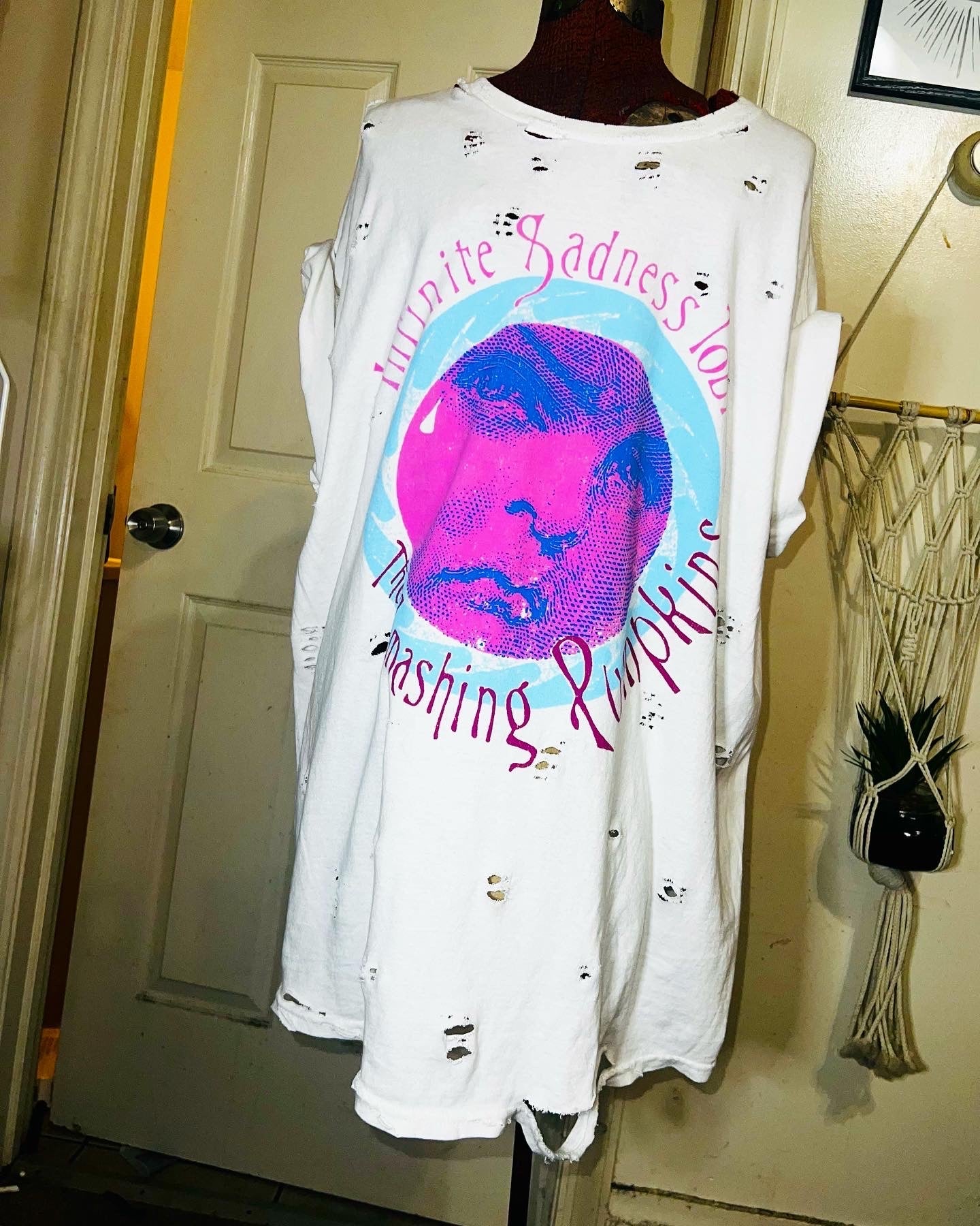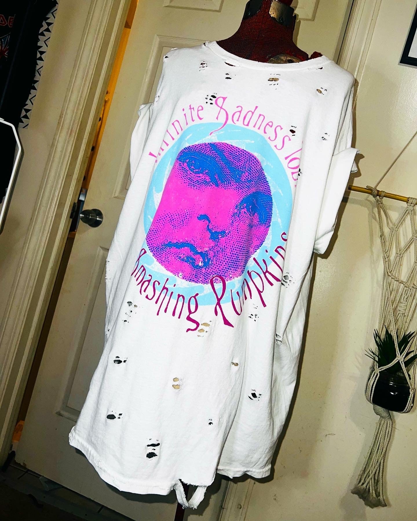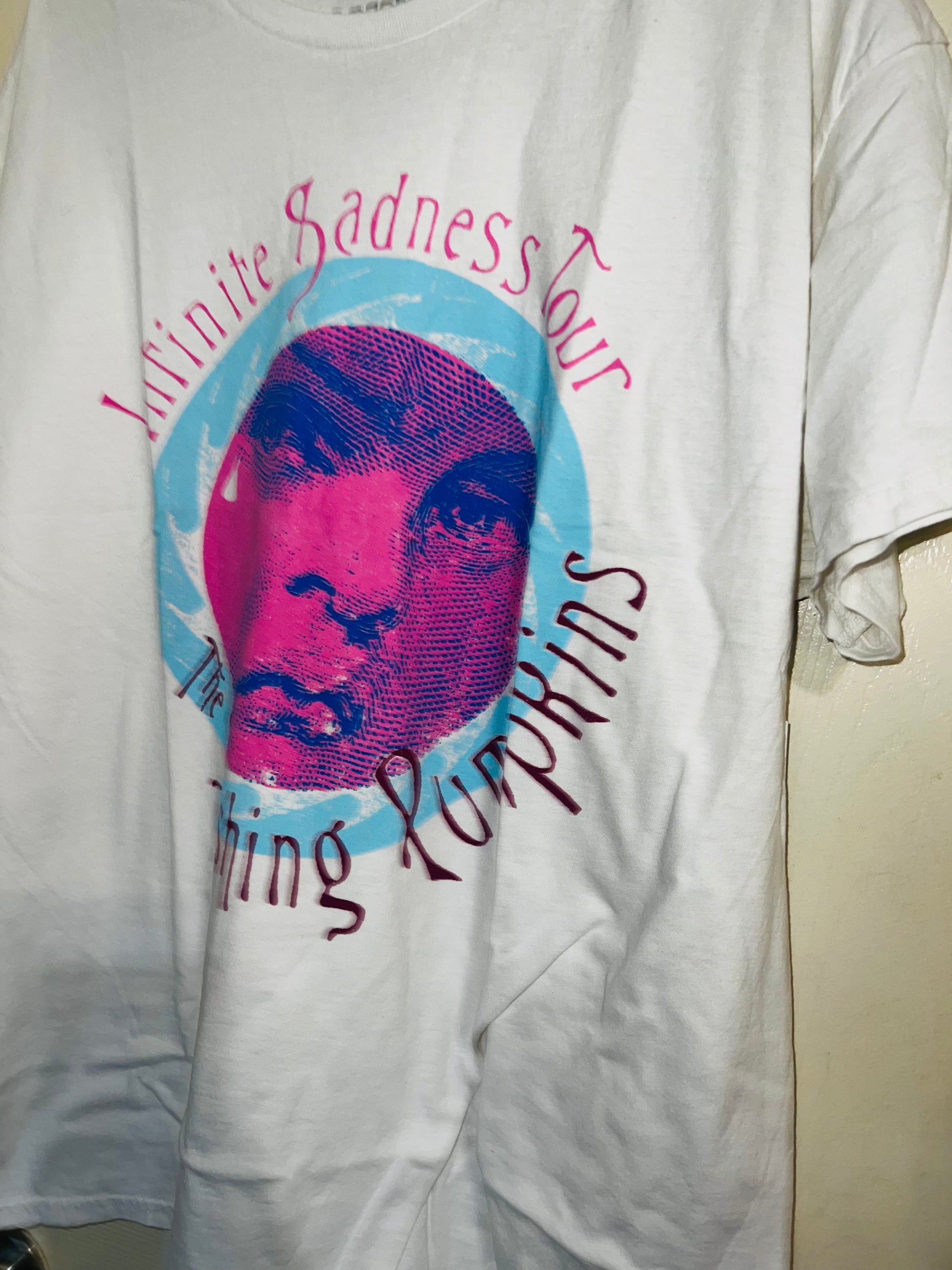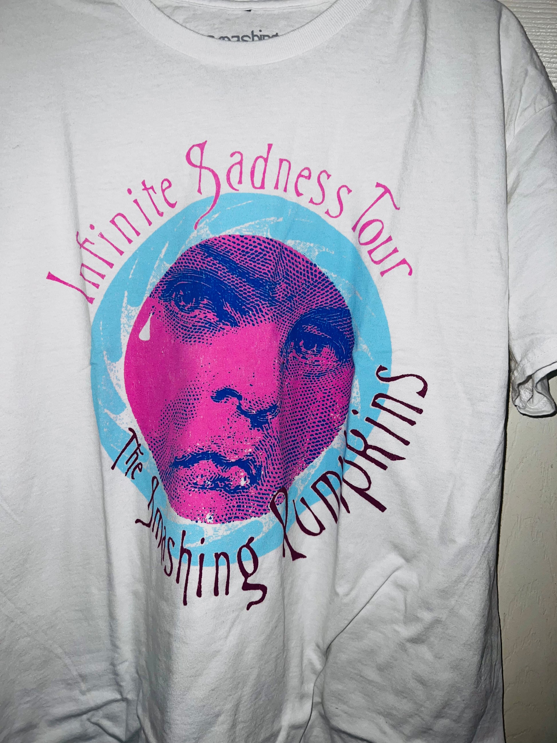 A white Smashing Pumpkins “Infinite Sadness Tour” tee with pastel contrast, this is an oversized shirt perfect for styling in the summer! Size L/XL!
