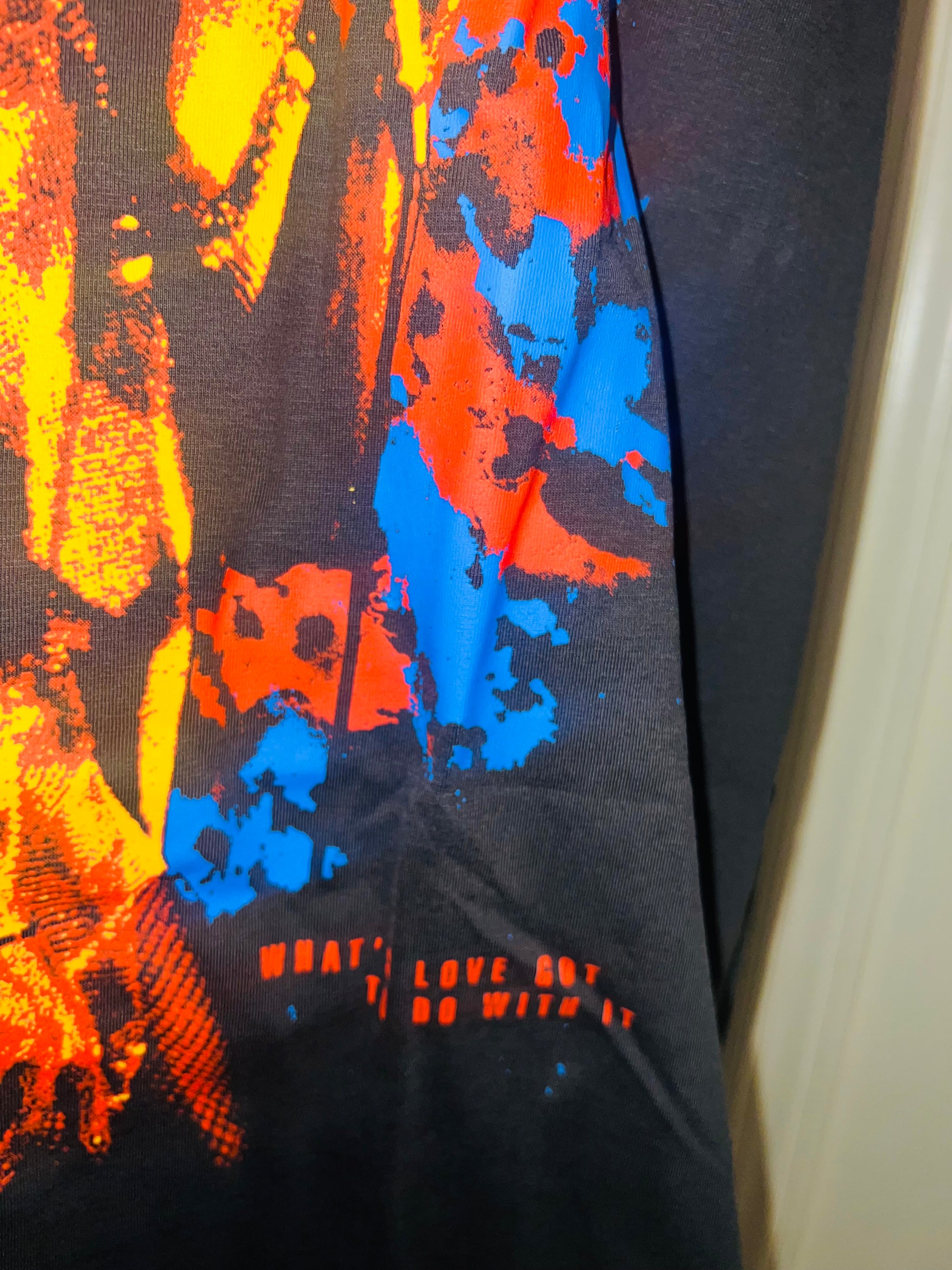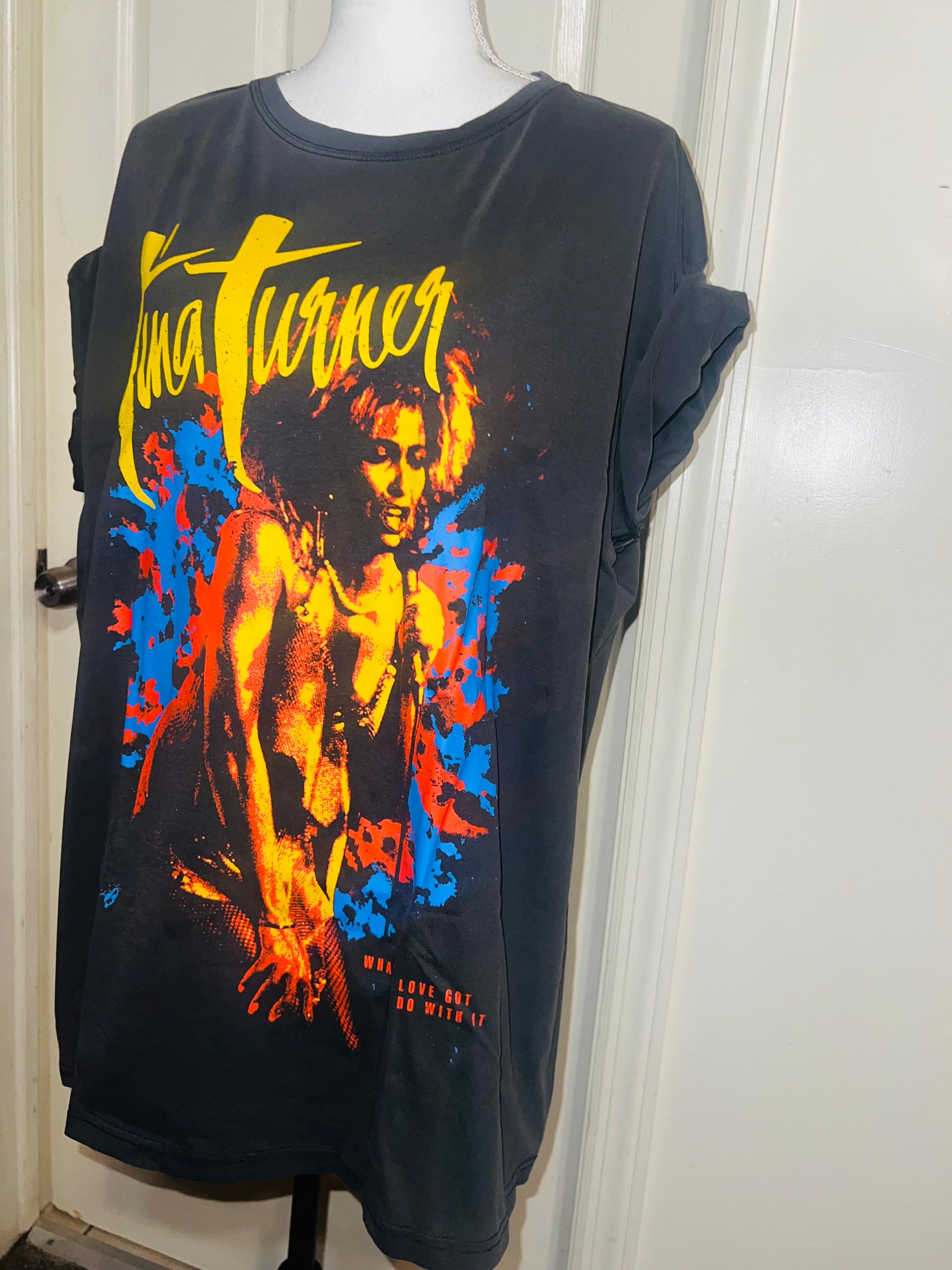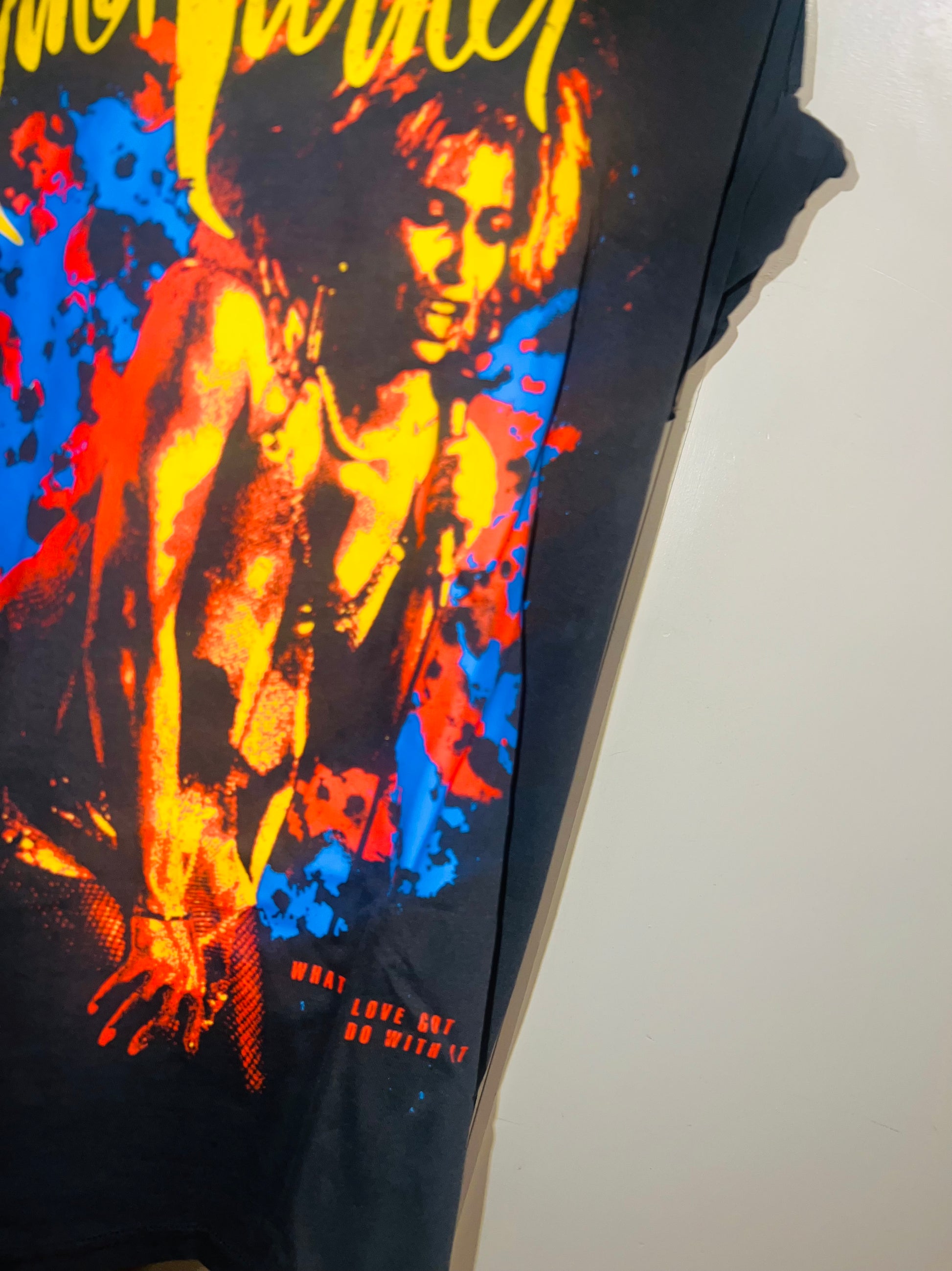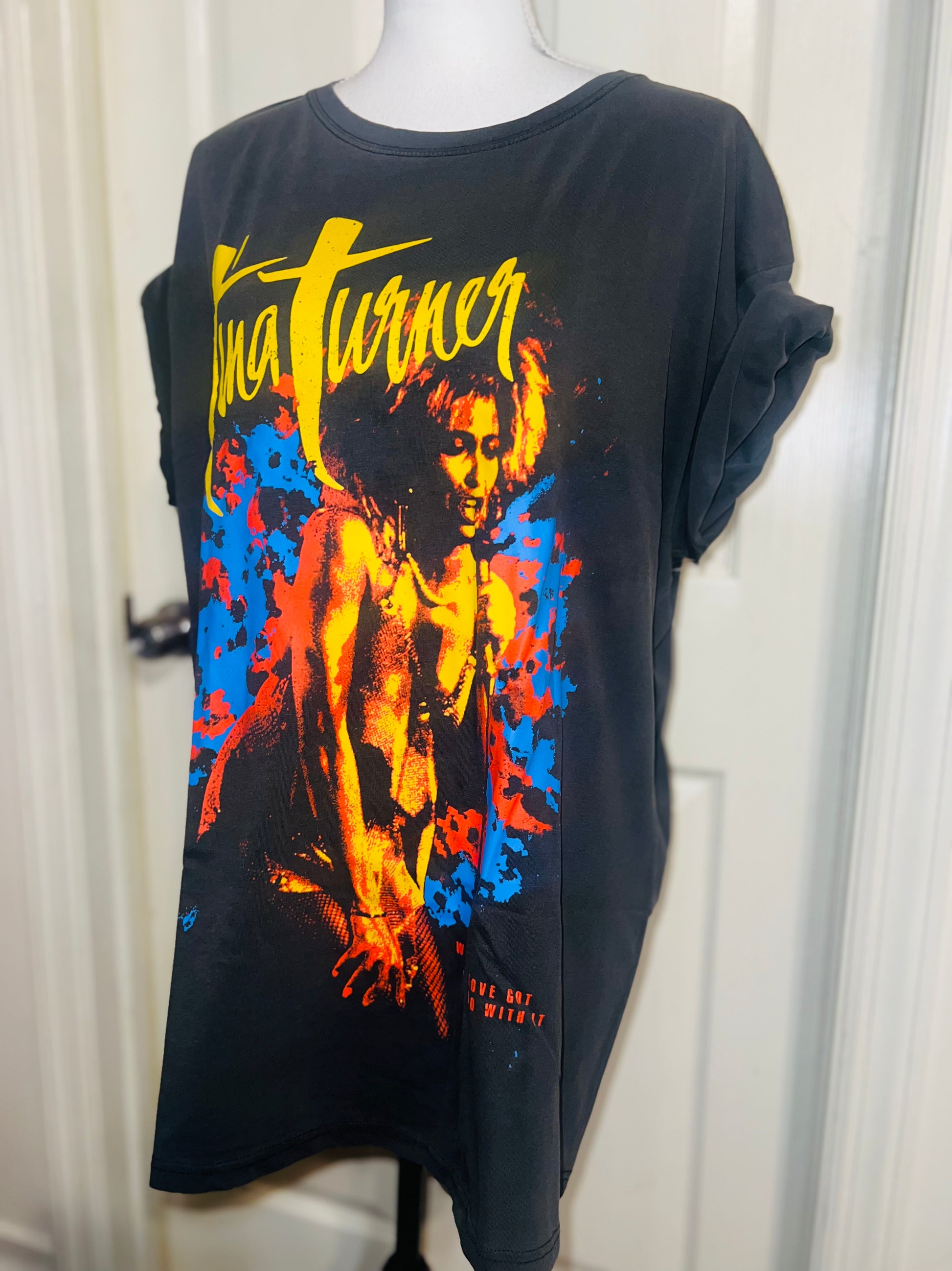 A dark charcoal grey Tina Turner tee with “what’s love got to do with it” at the bottom. Side L/XL, oversized.