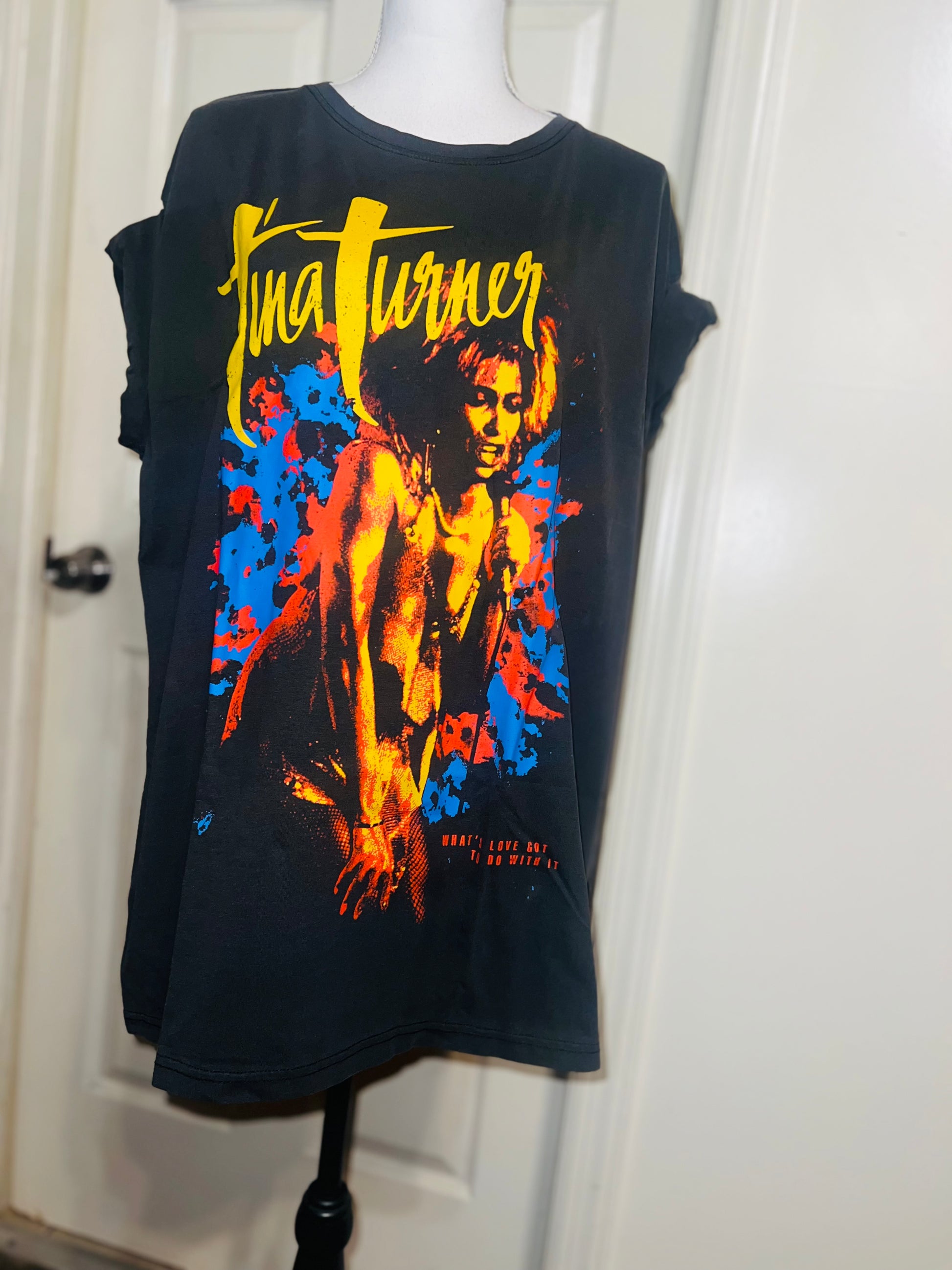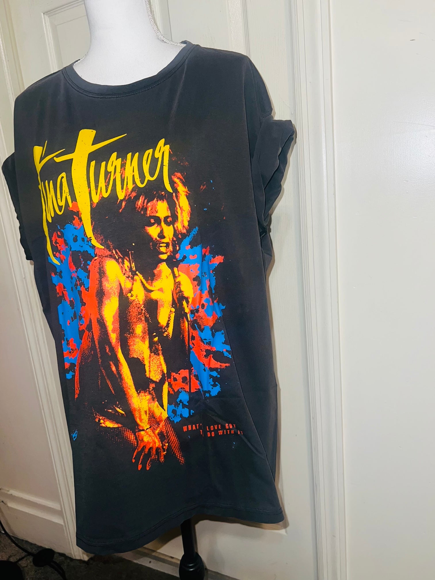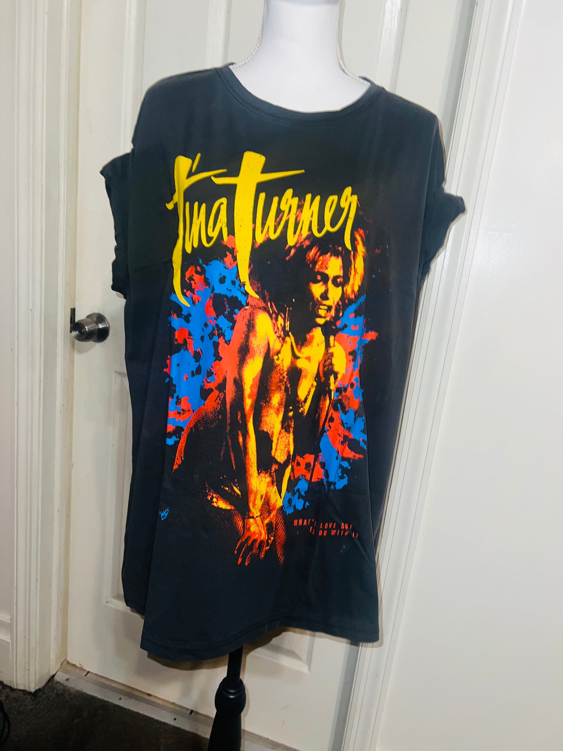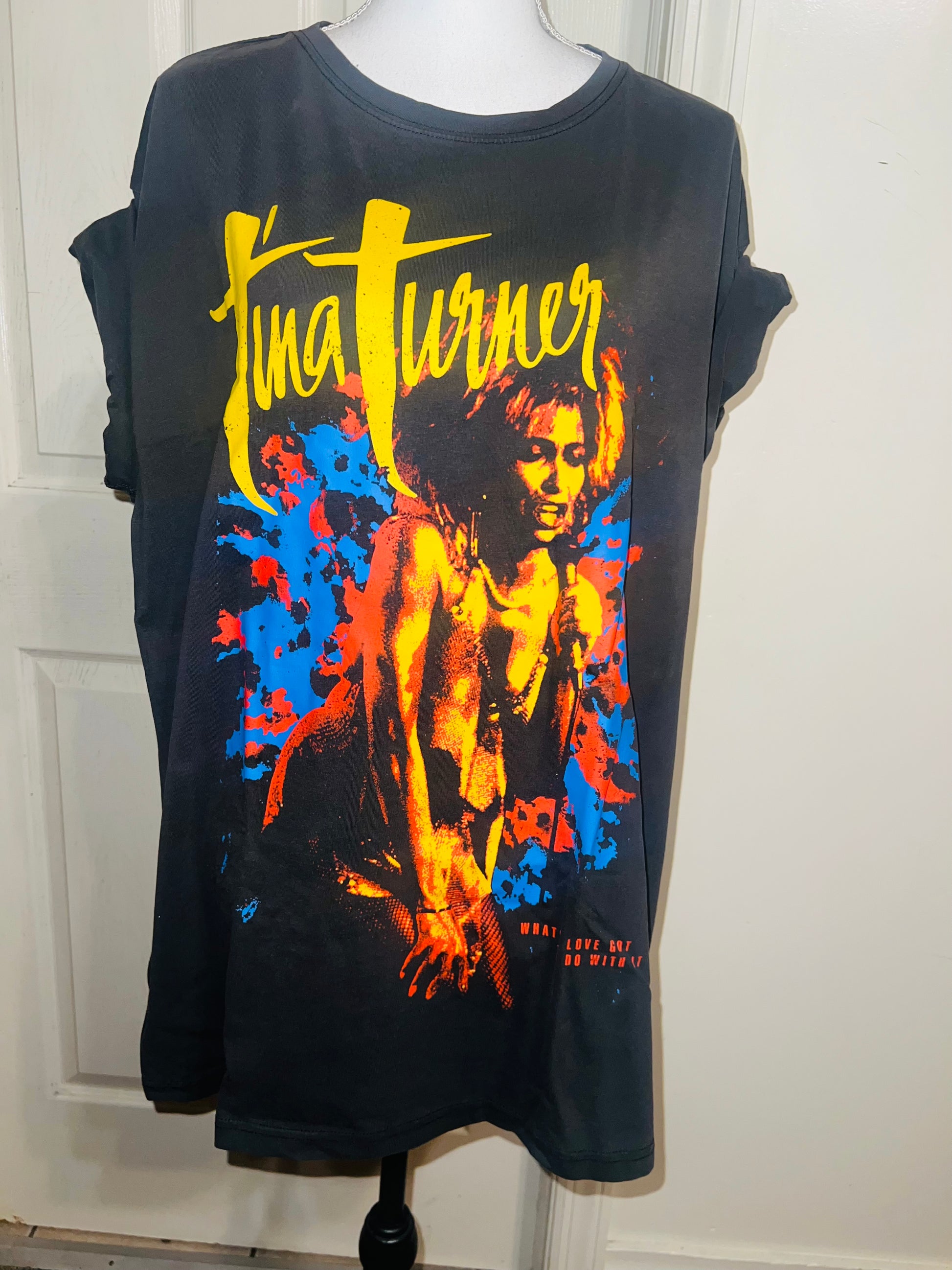 A dark charcoal grey Tina Turner tee with “what’s love got to do with it” at the bottom. Side L/XL, oversized.