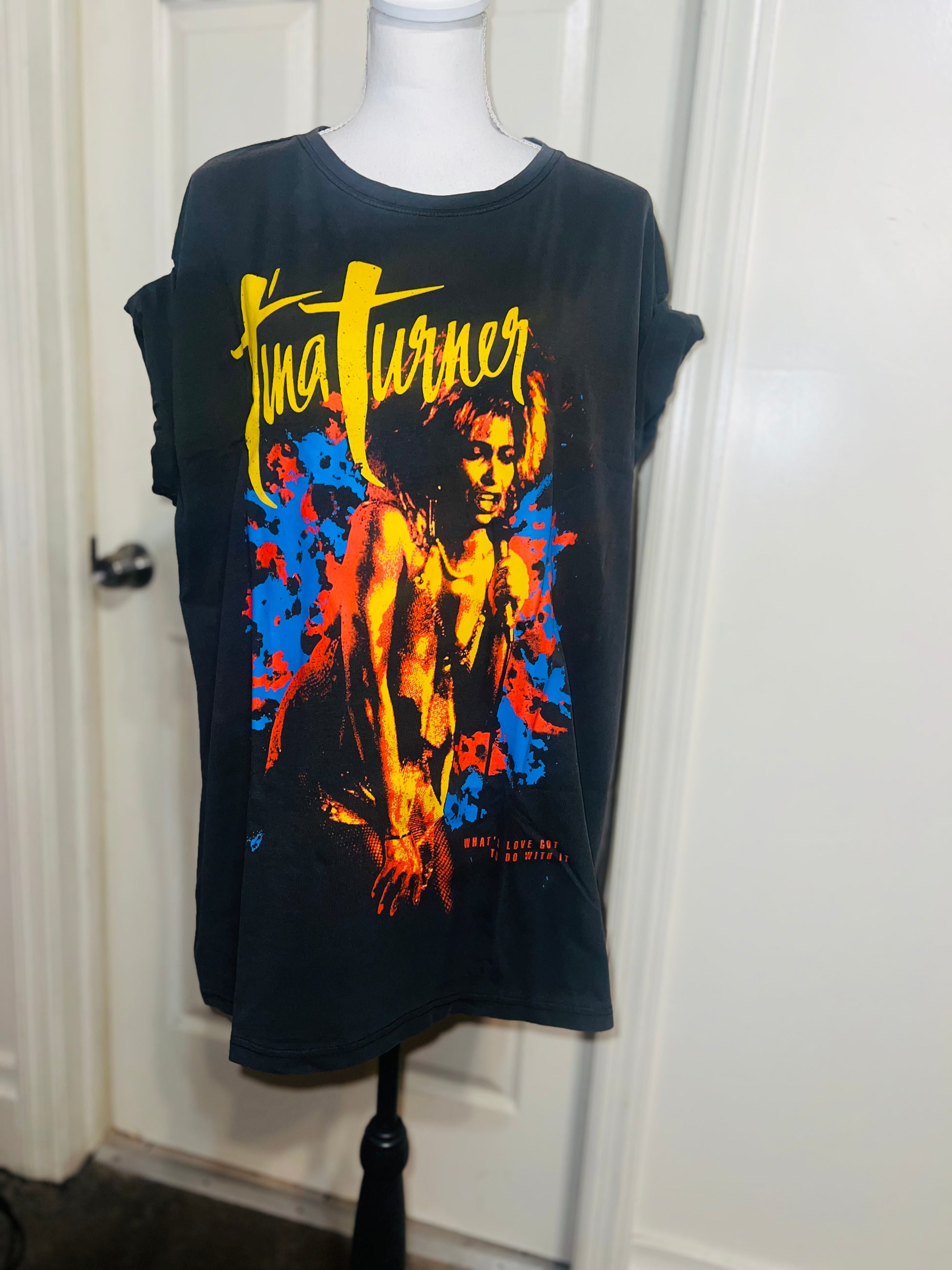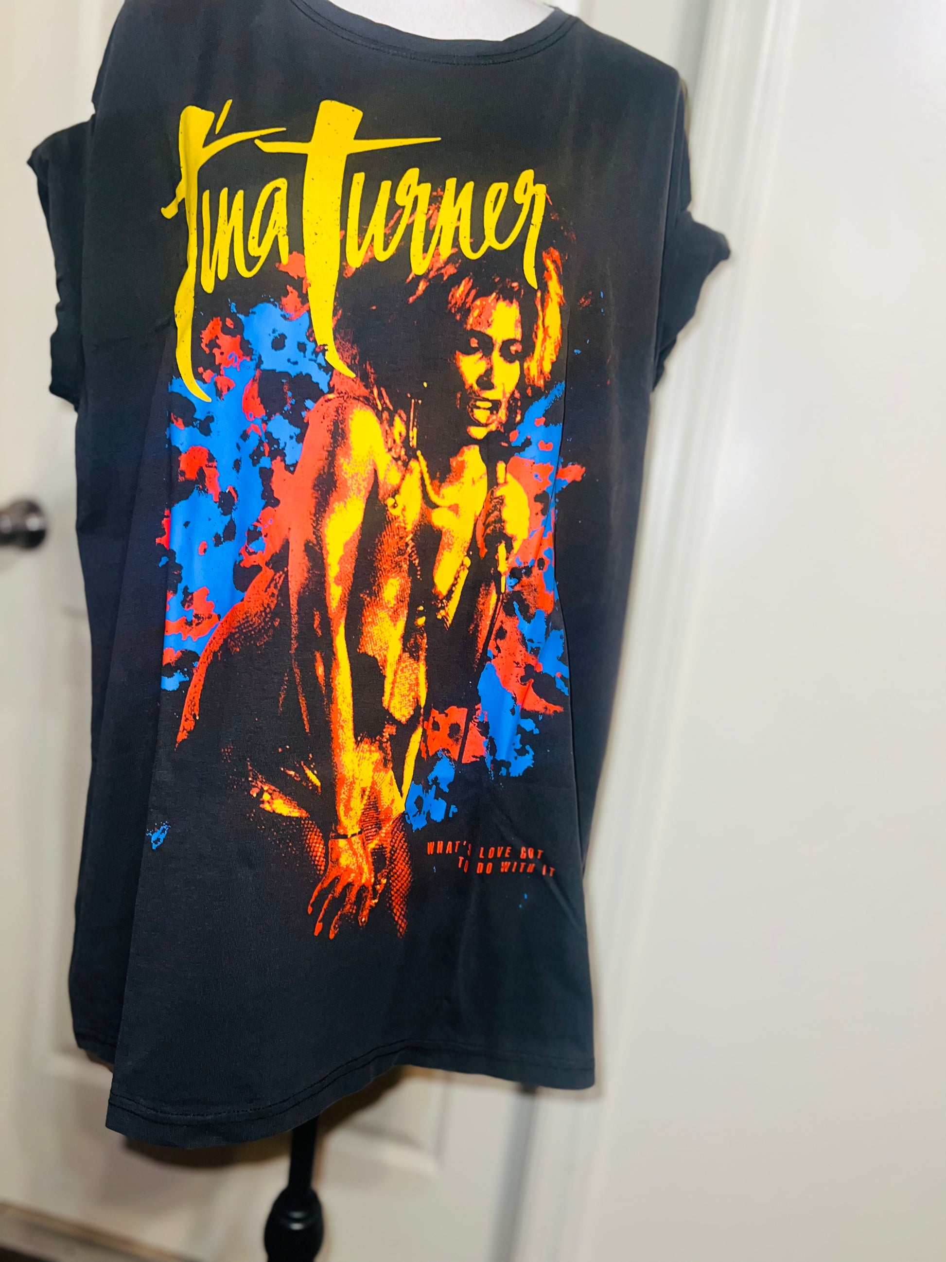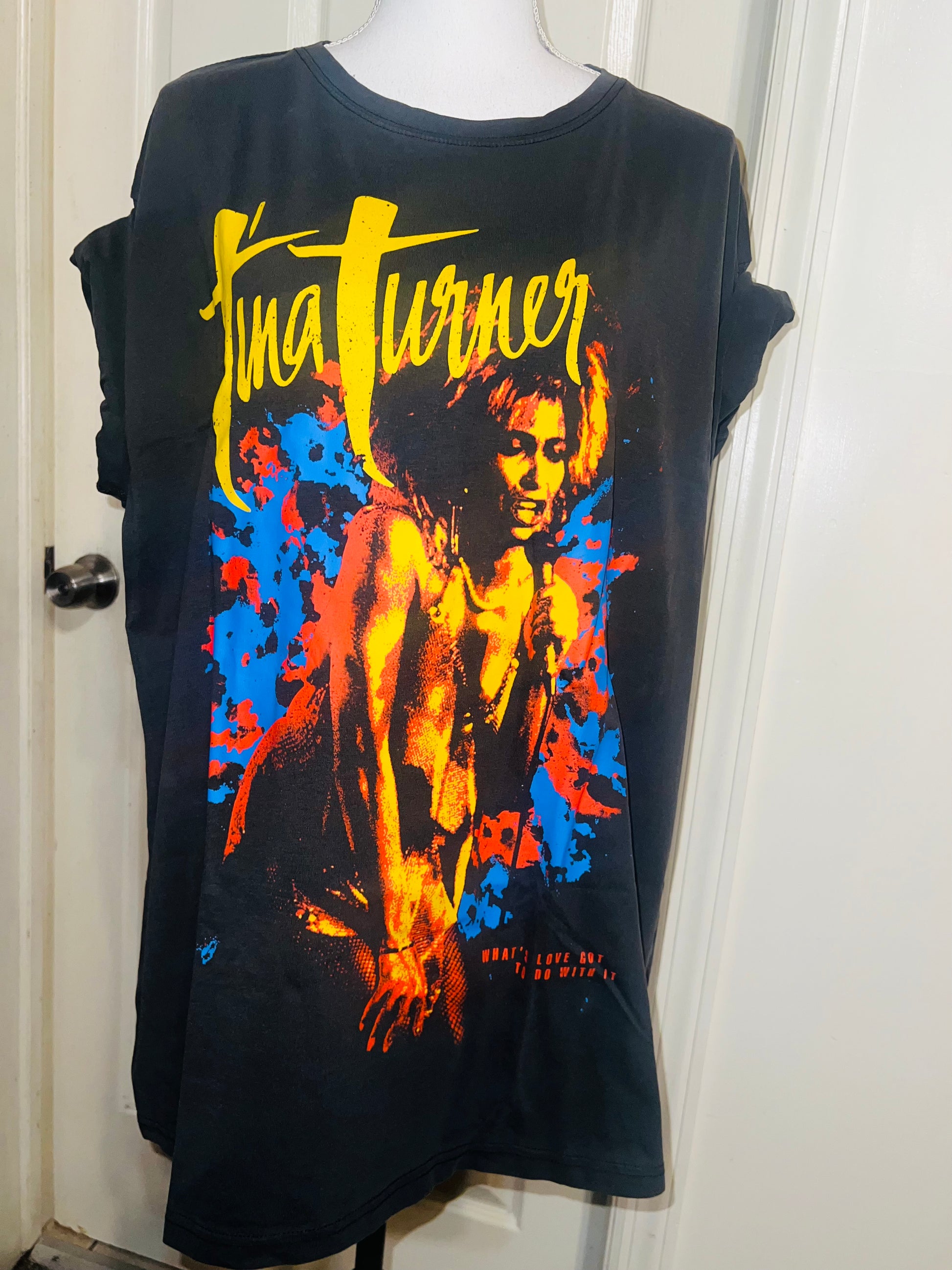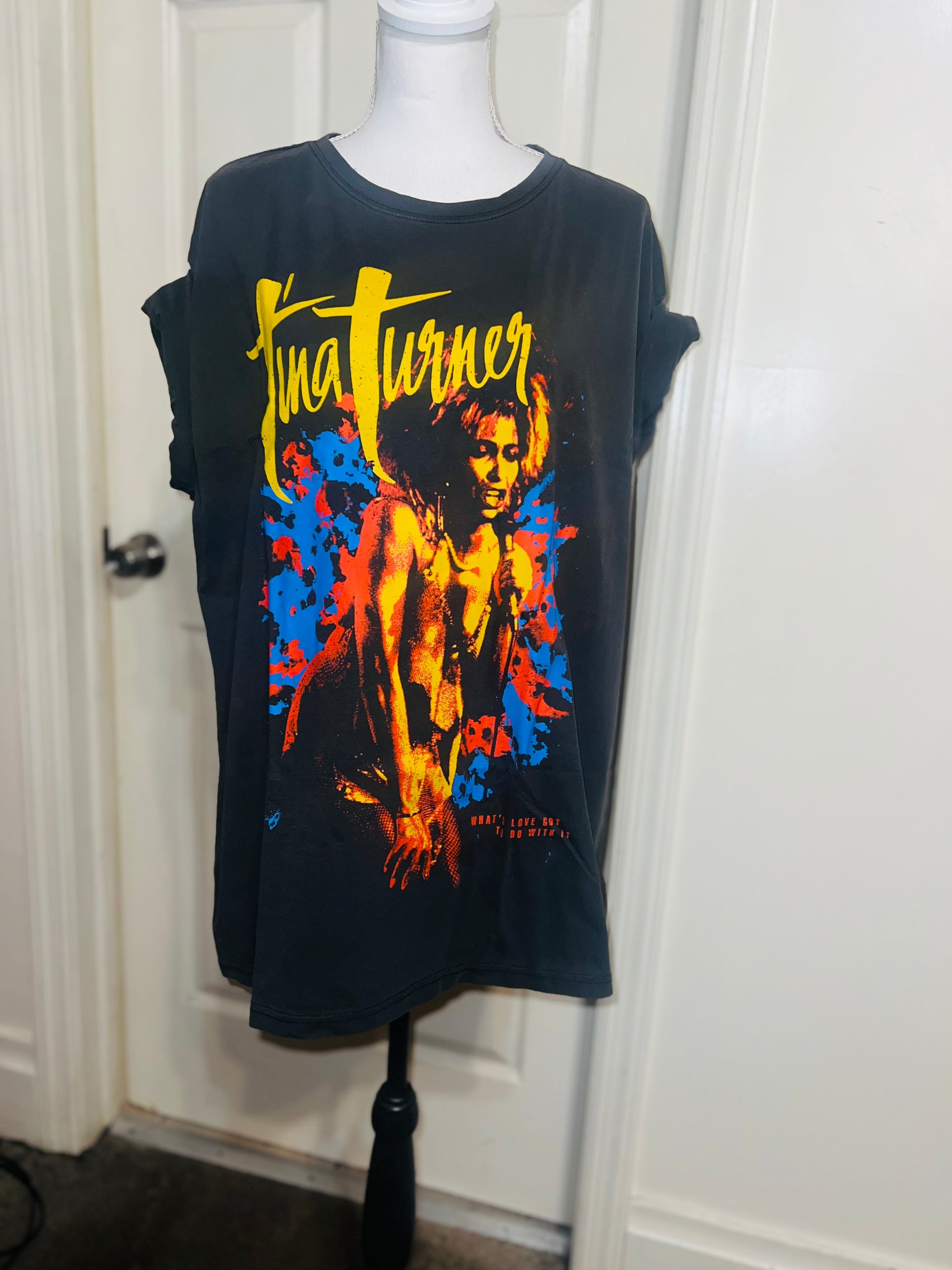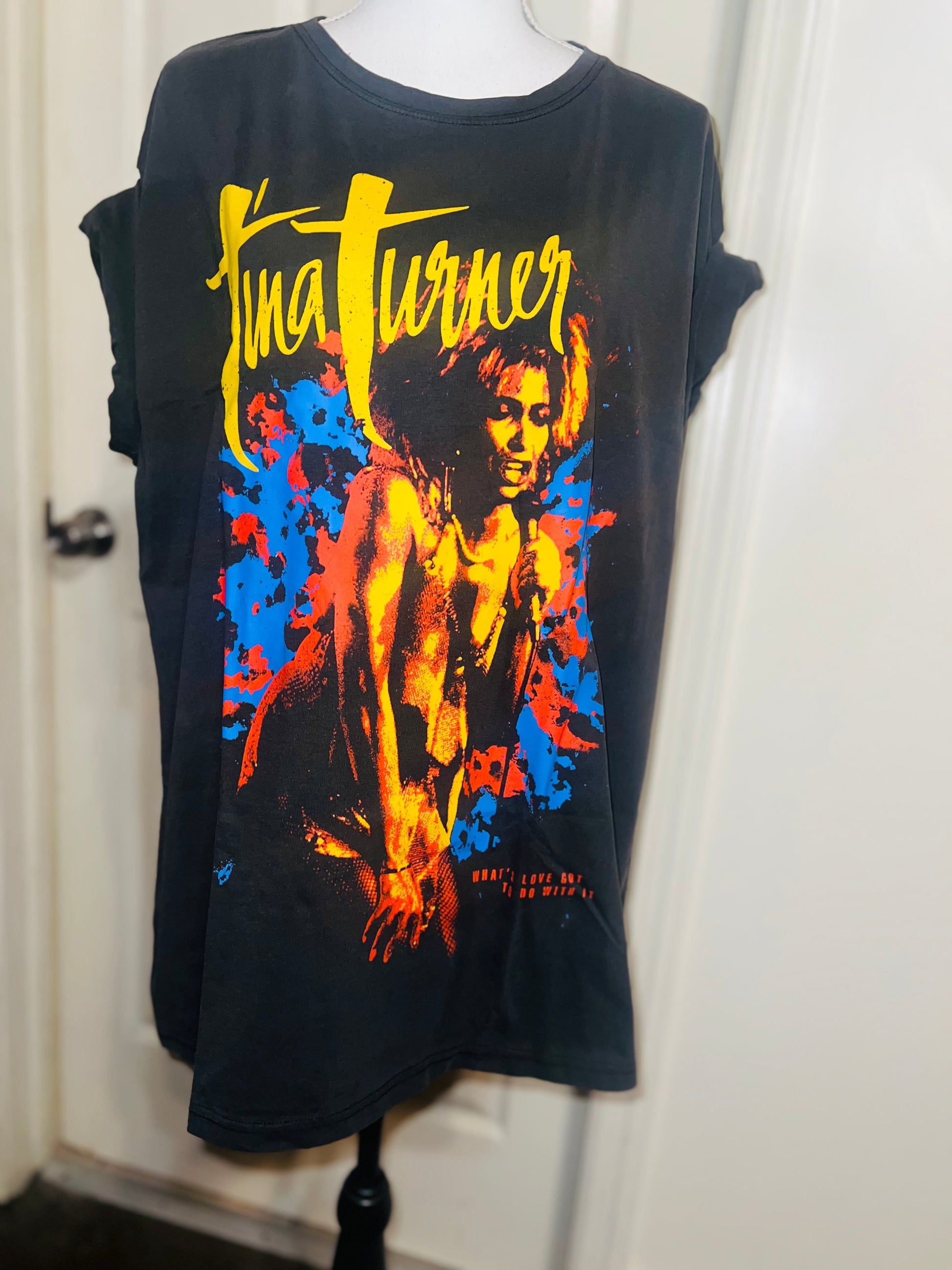 A dark charcoal grey Tina Turner tee with “what’s love got to do with it” at the bottom. Side L/XL, oversized.