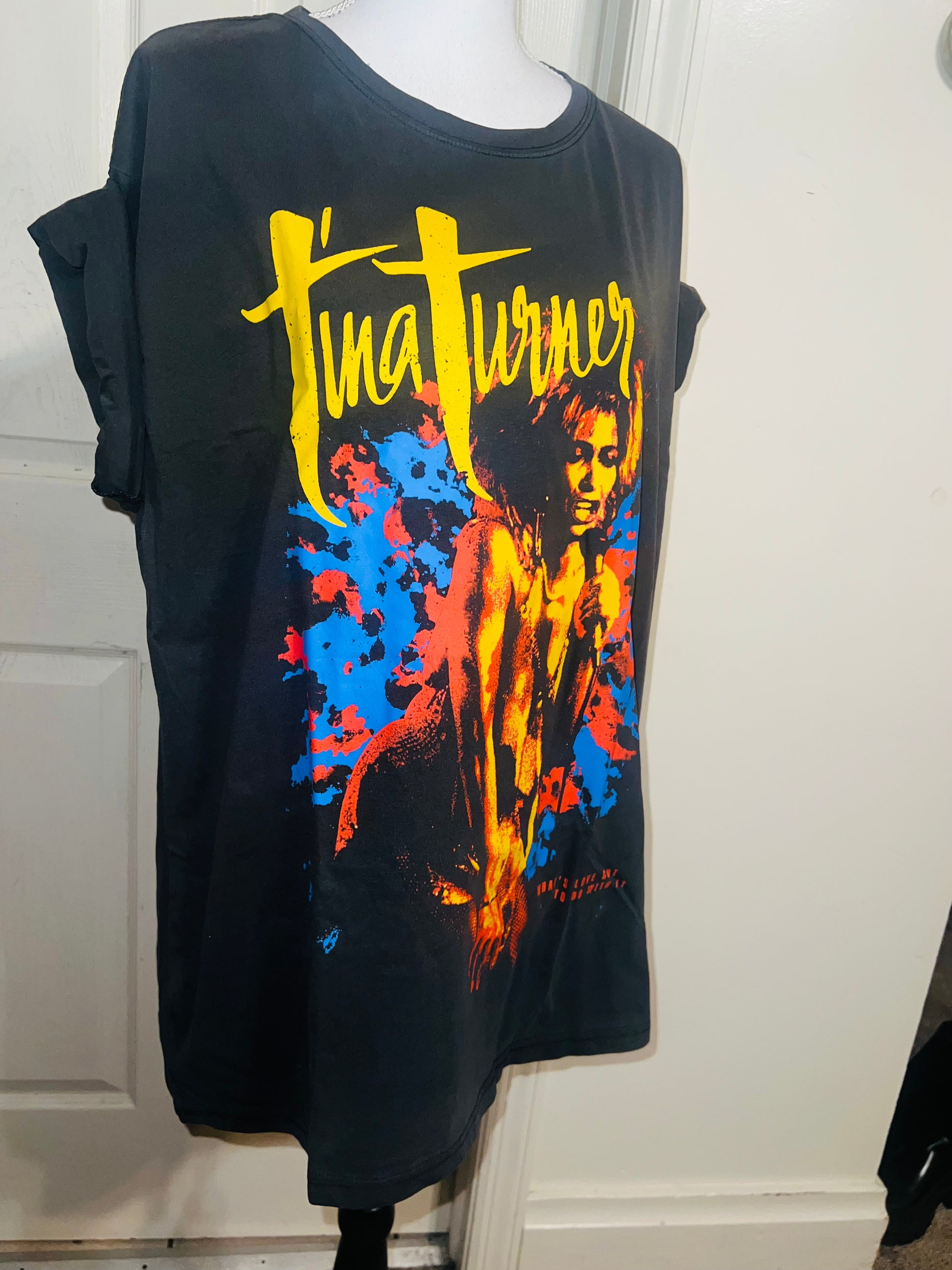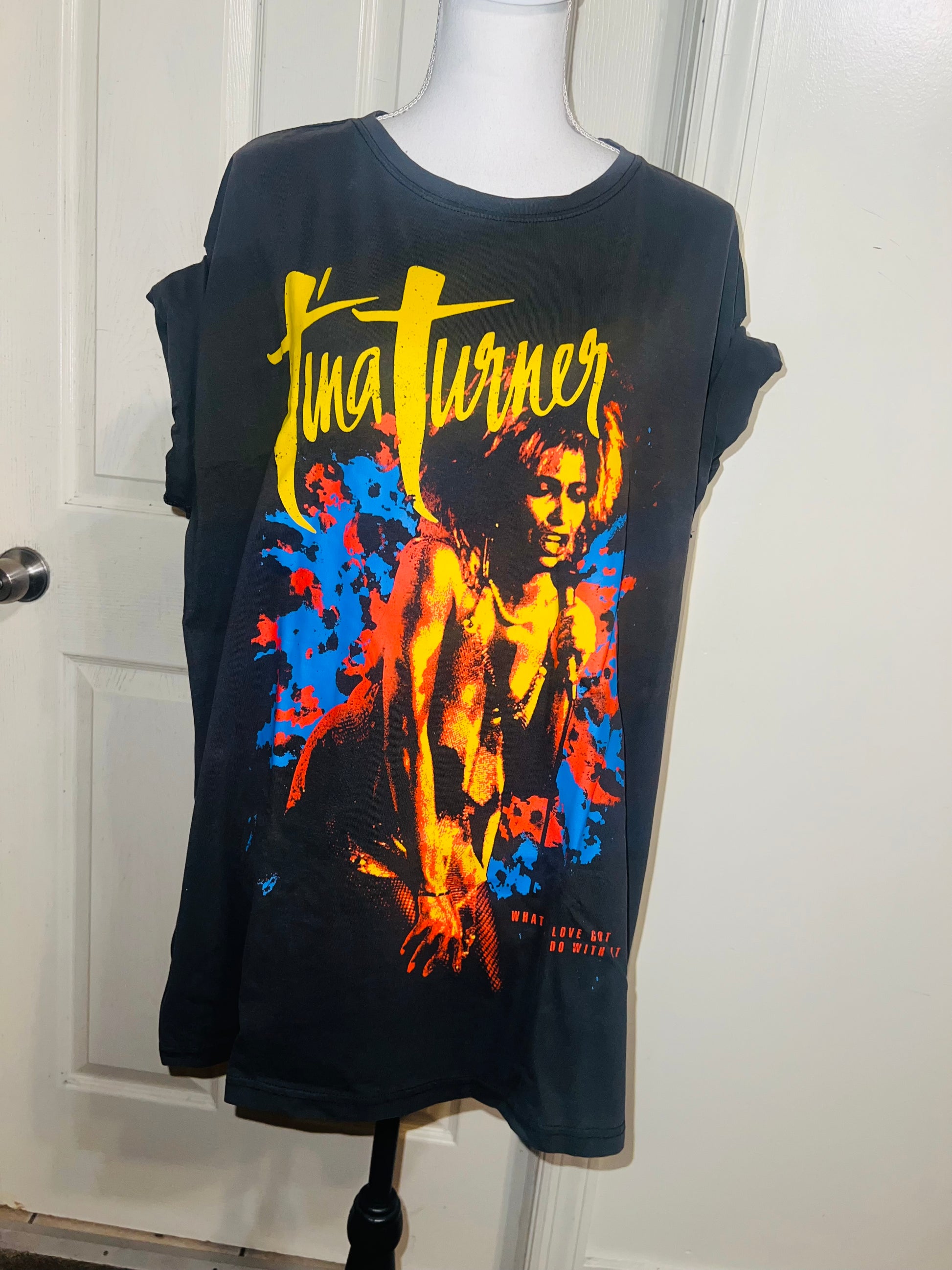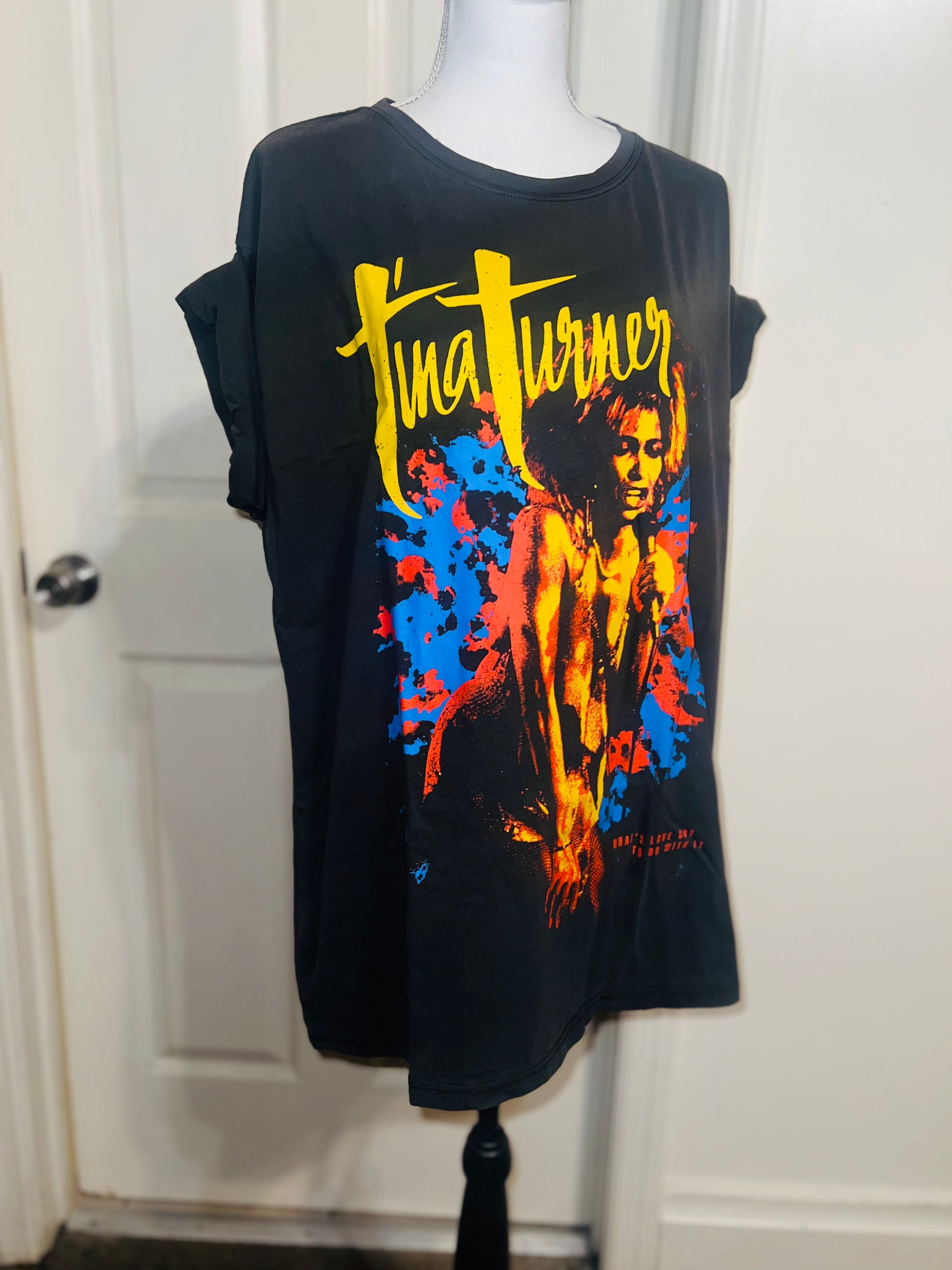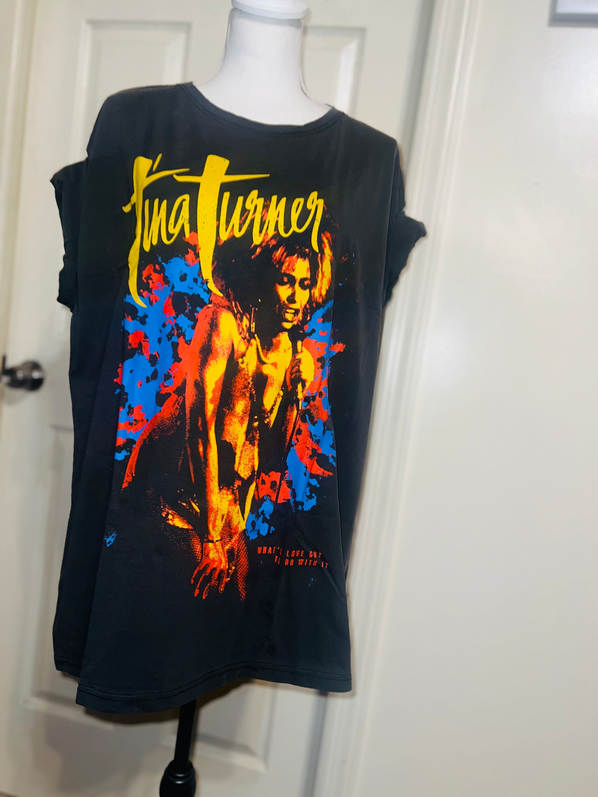 A dark charcoal grey Tina Turner tee with “what’s love got to do with it” at the bottom. Side L/XL, oversized.