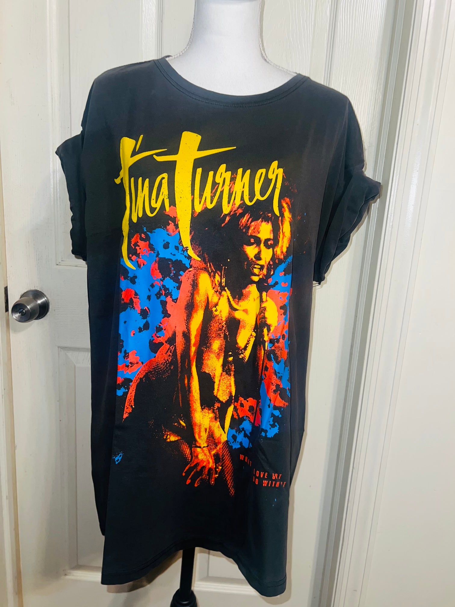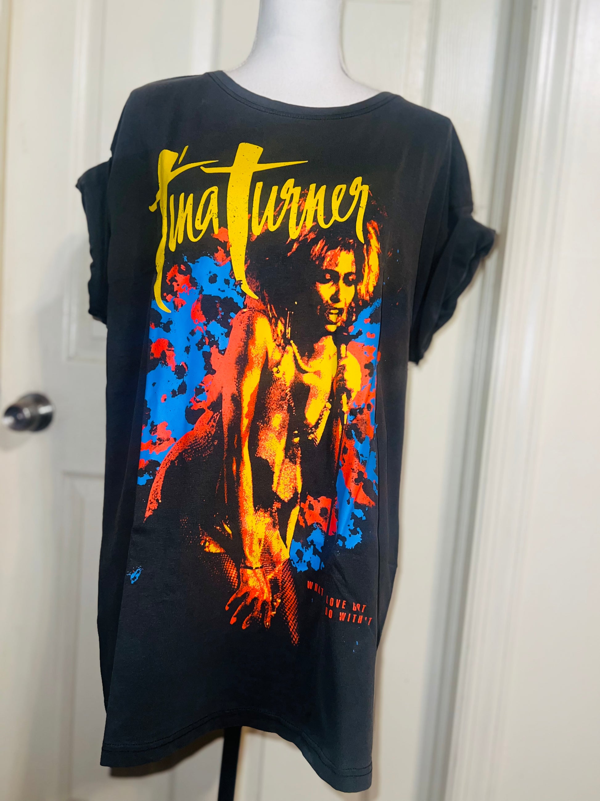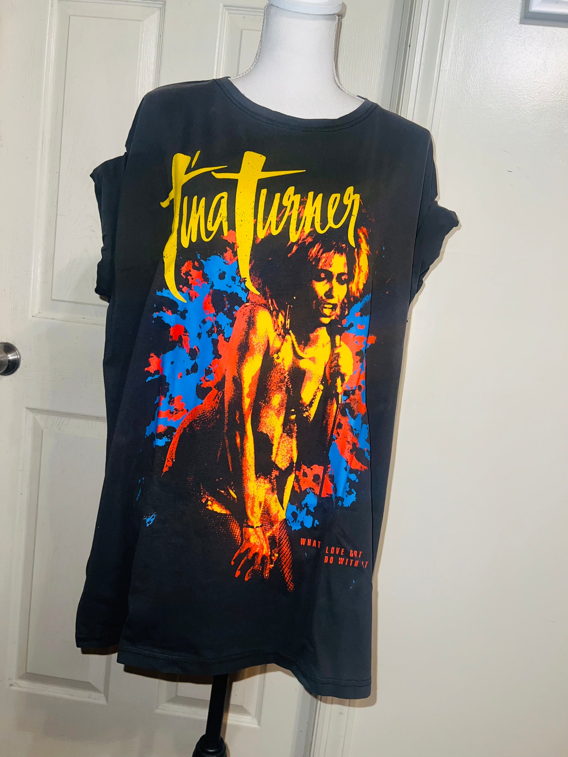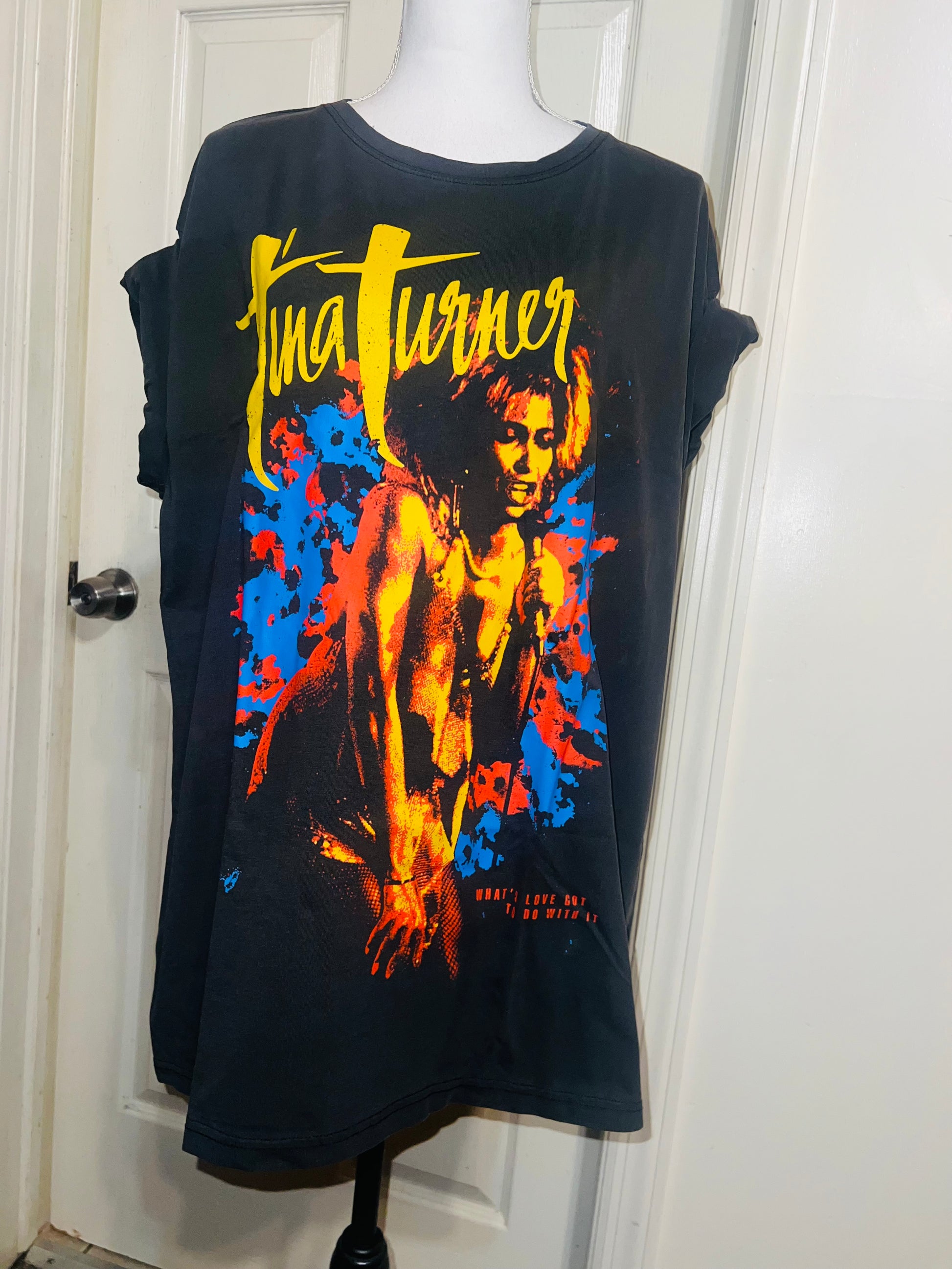 A dark charcoal grey Tina Turner tee with “what’s love got to do with it” at the bottom. Side L/XL, oversized.