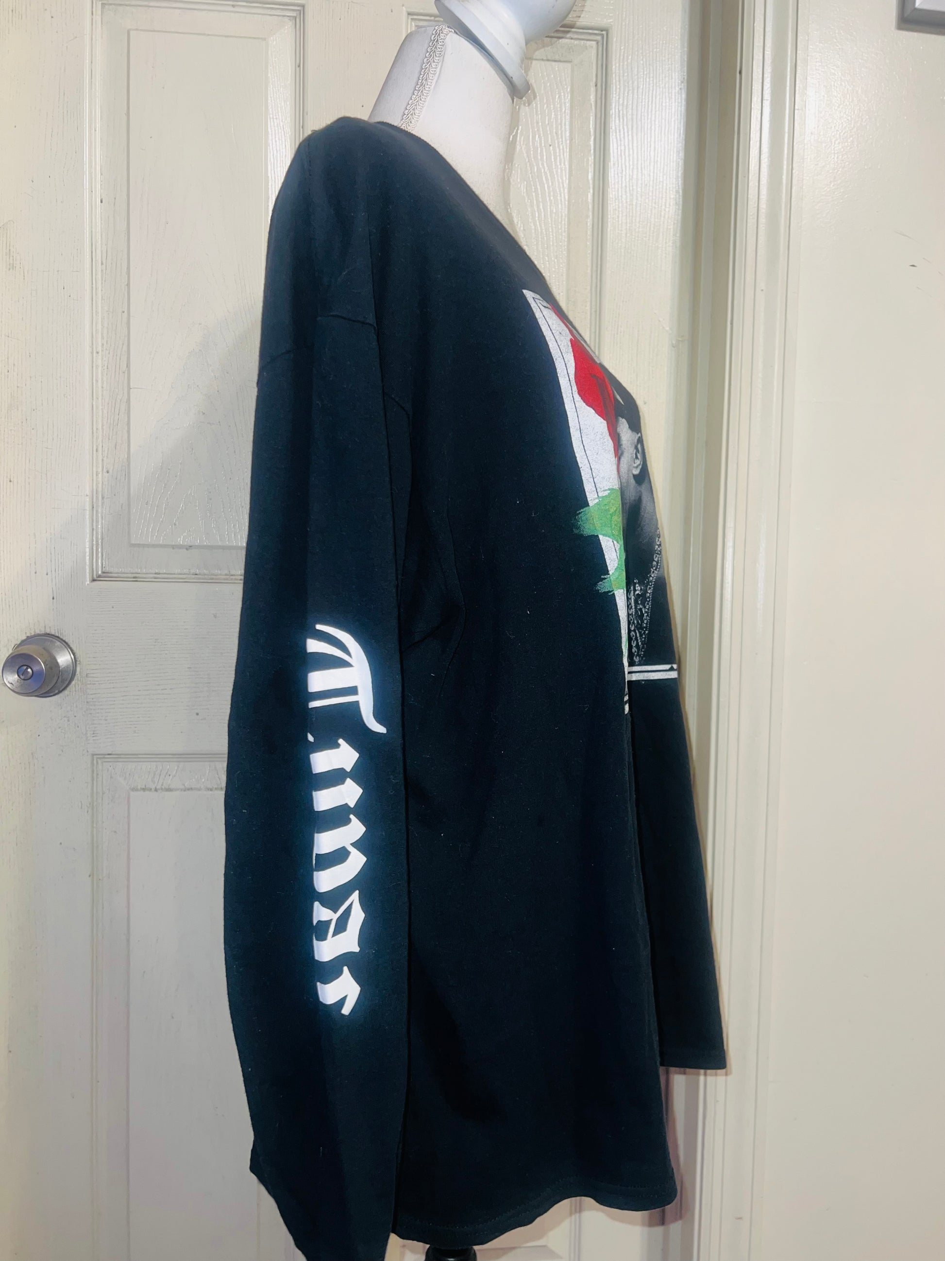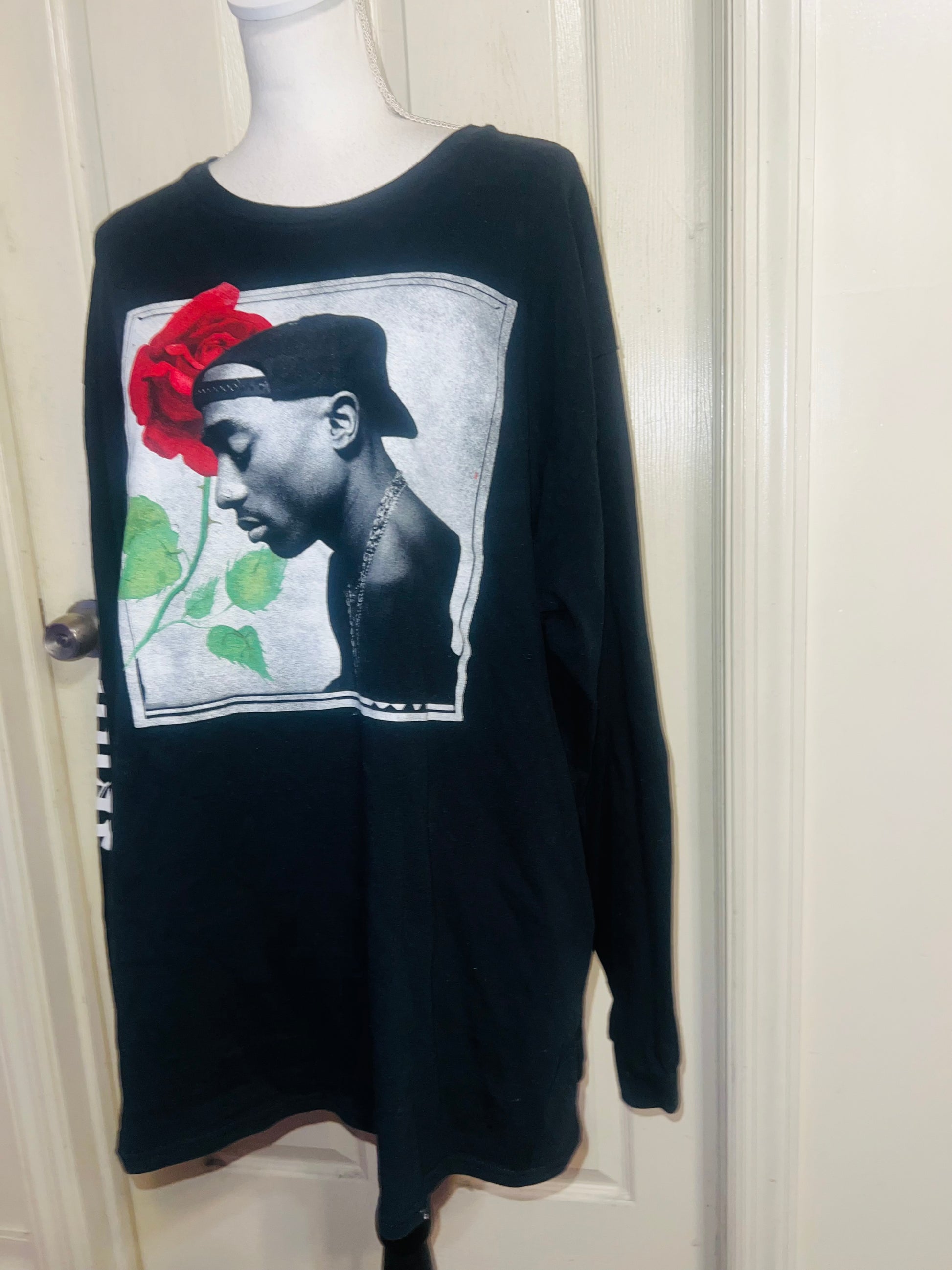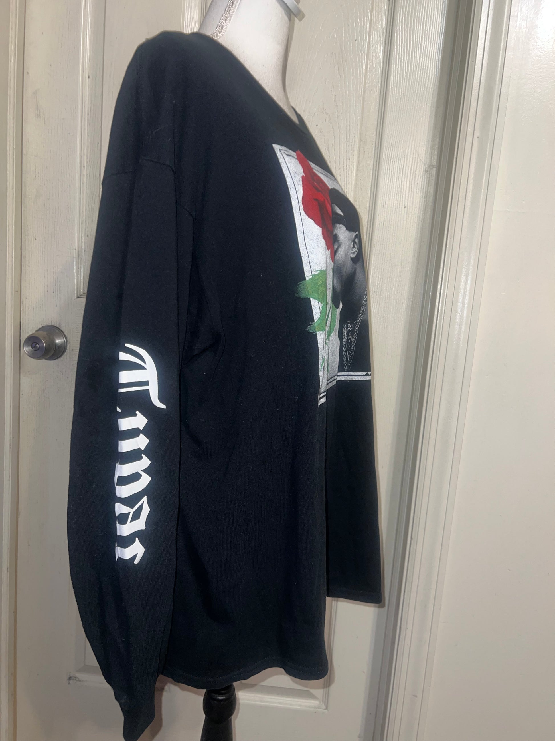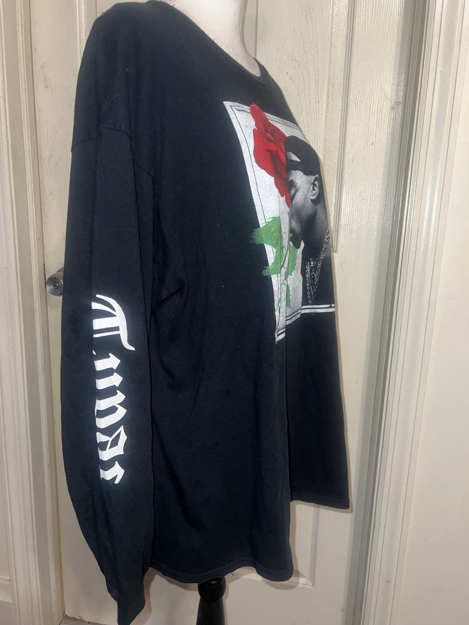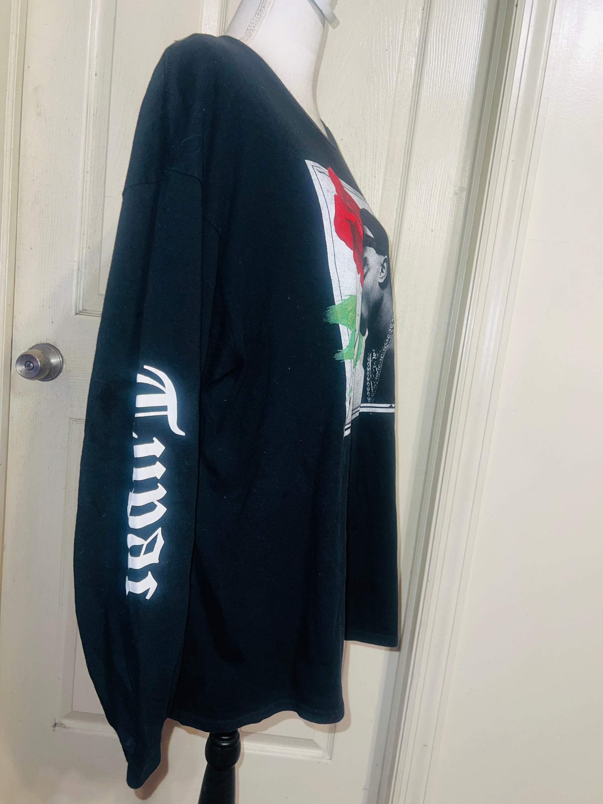 A black Tupac long tee shirt with a cool photo & Tupac written down the side of the sleeve. Size XL, oversized.