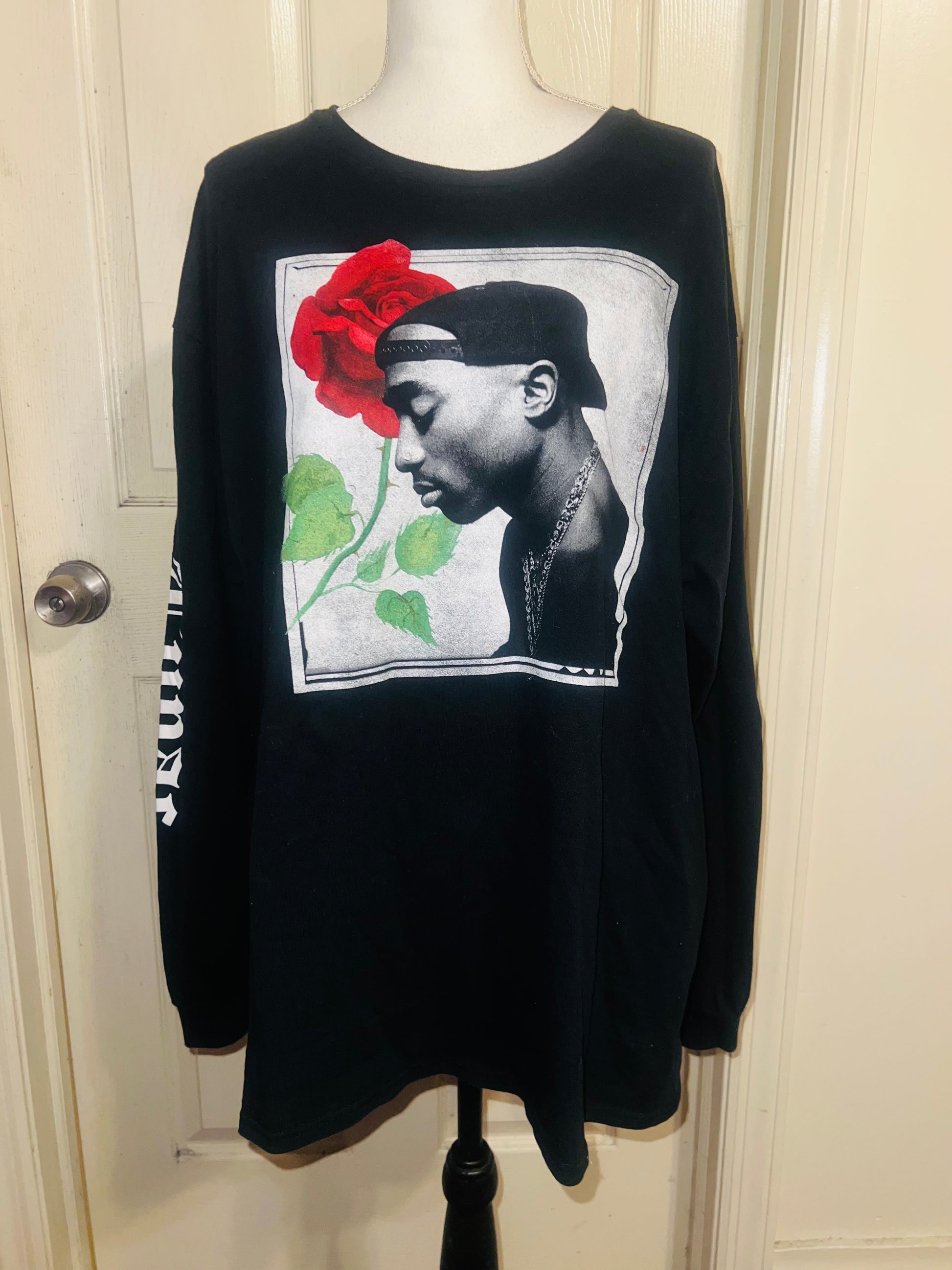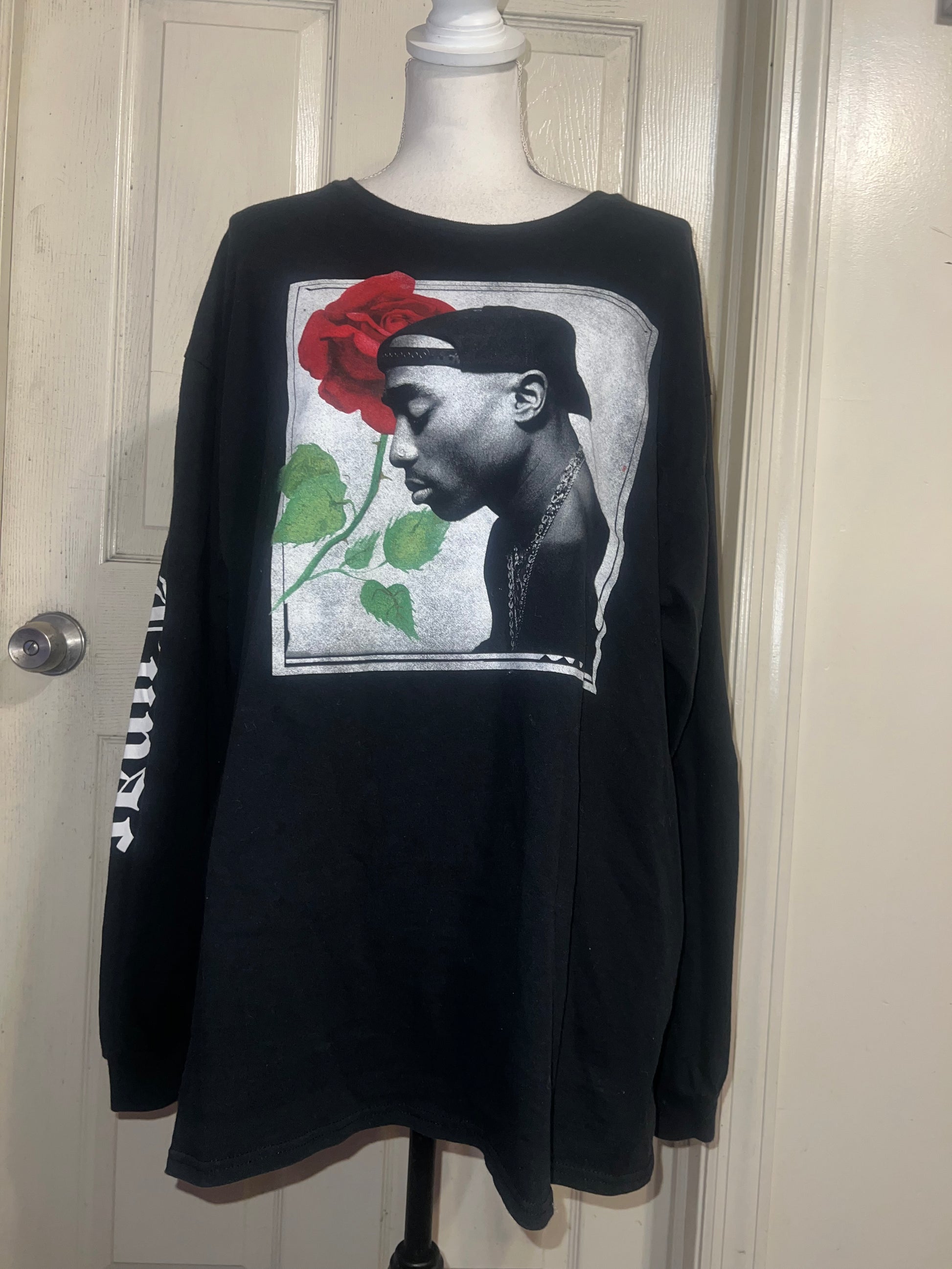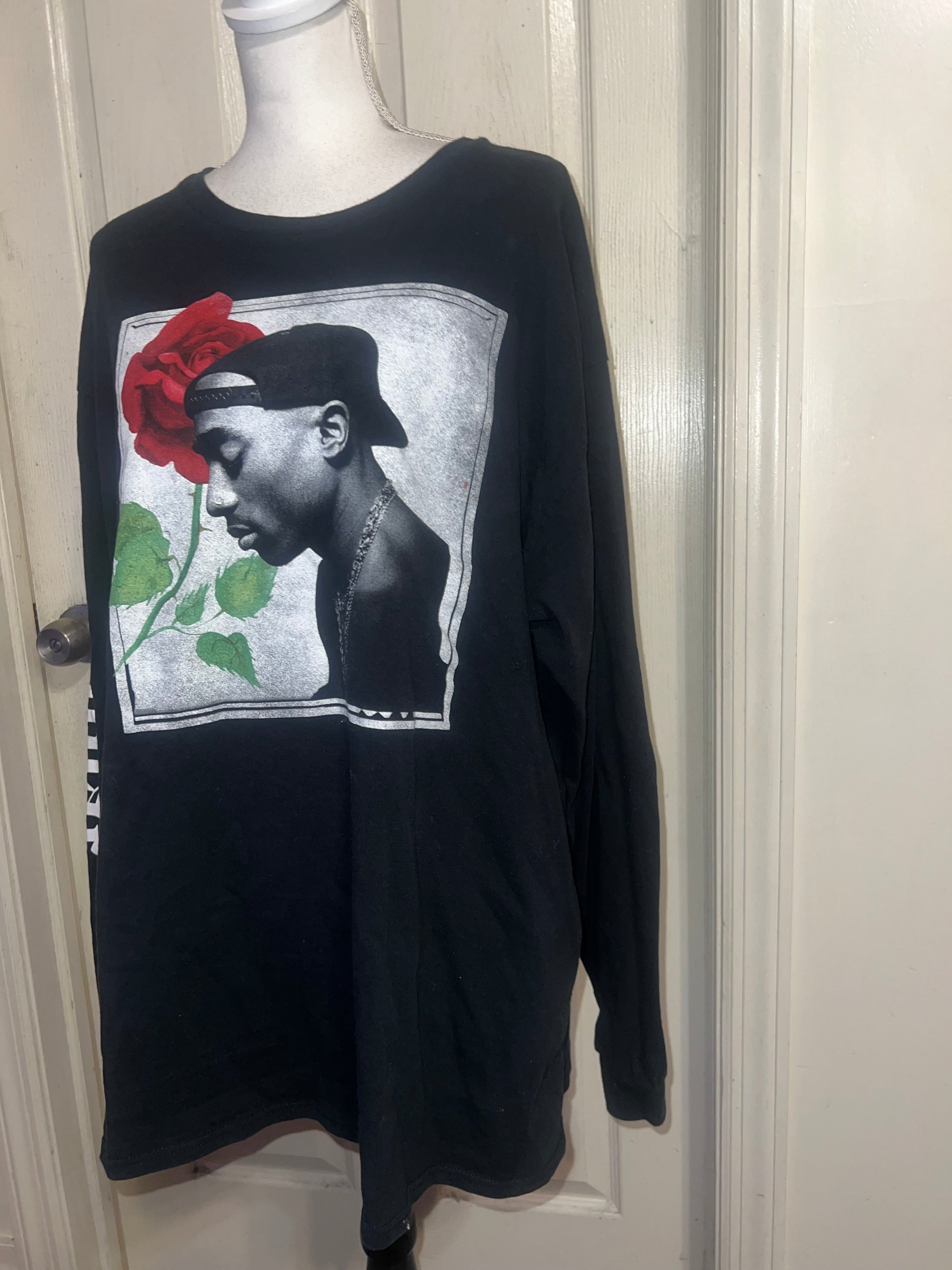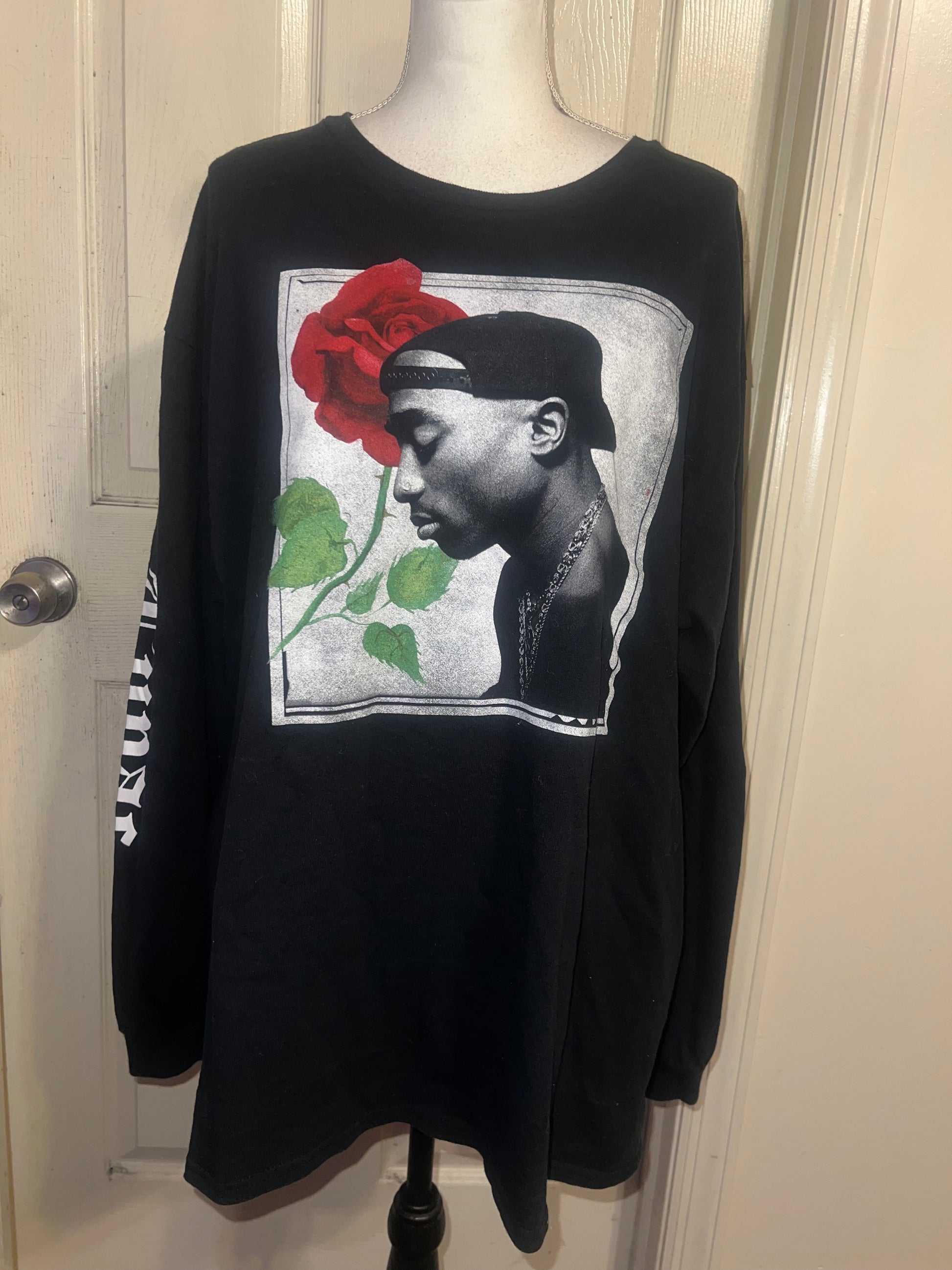 A black Tupac long tee shirt with a cool photo & Tupac written down the side of the sleeve. Size XL, oversized.