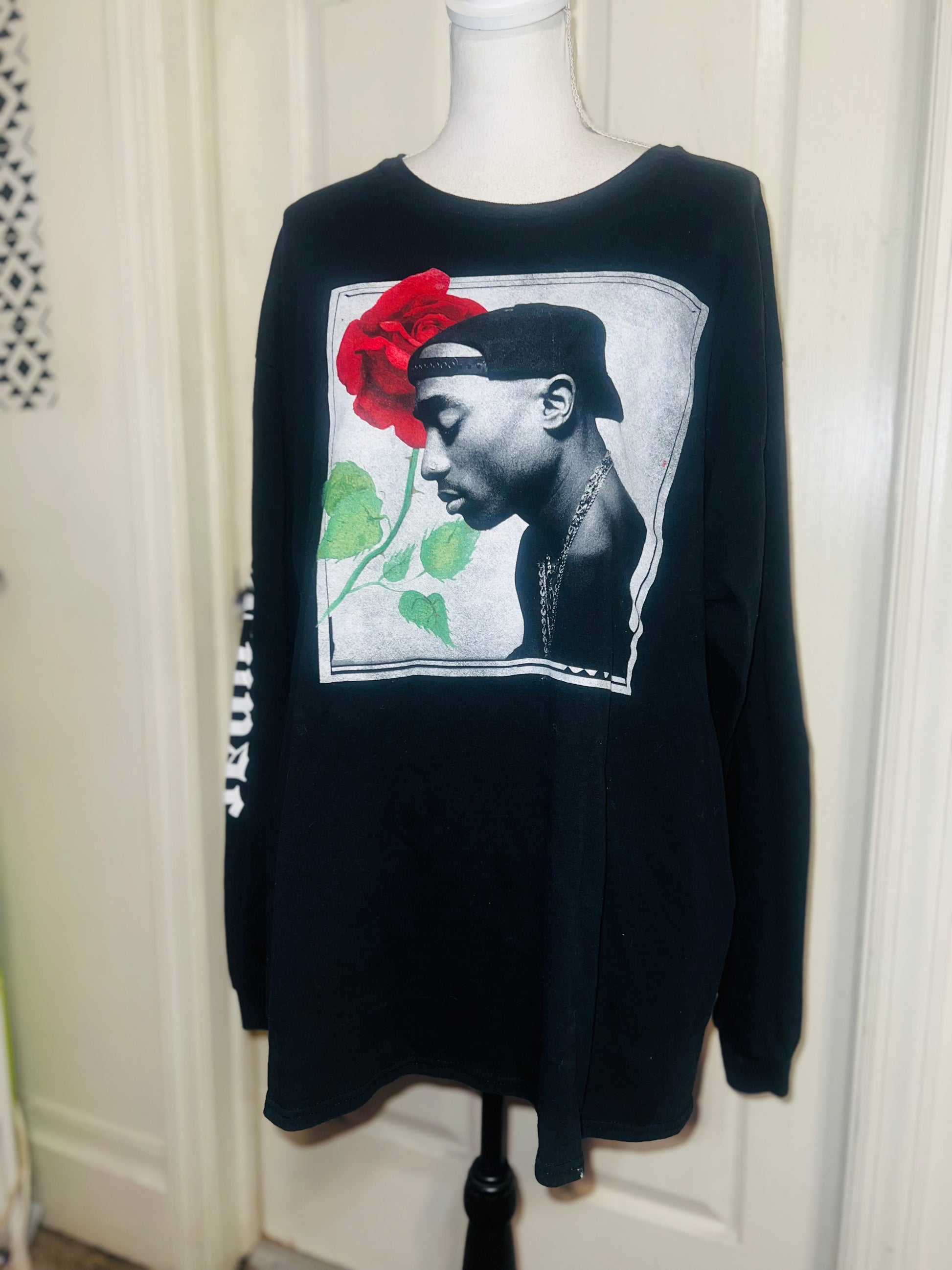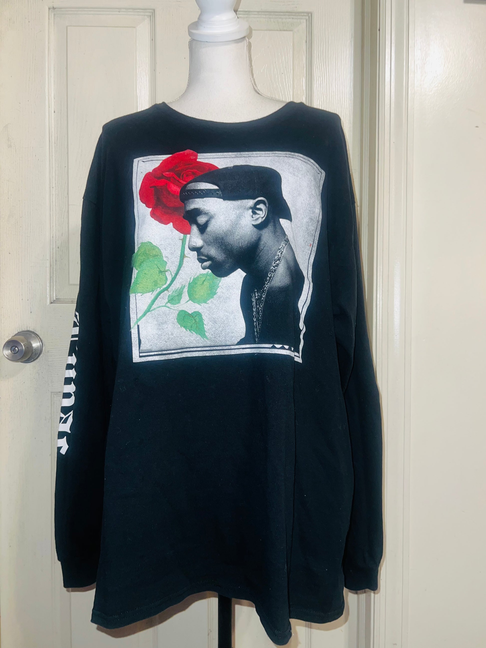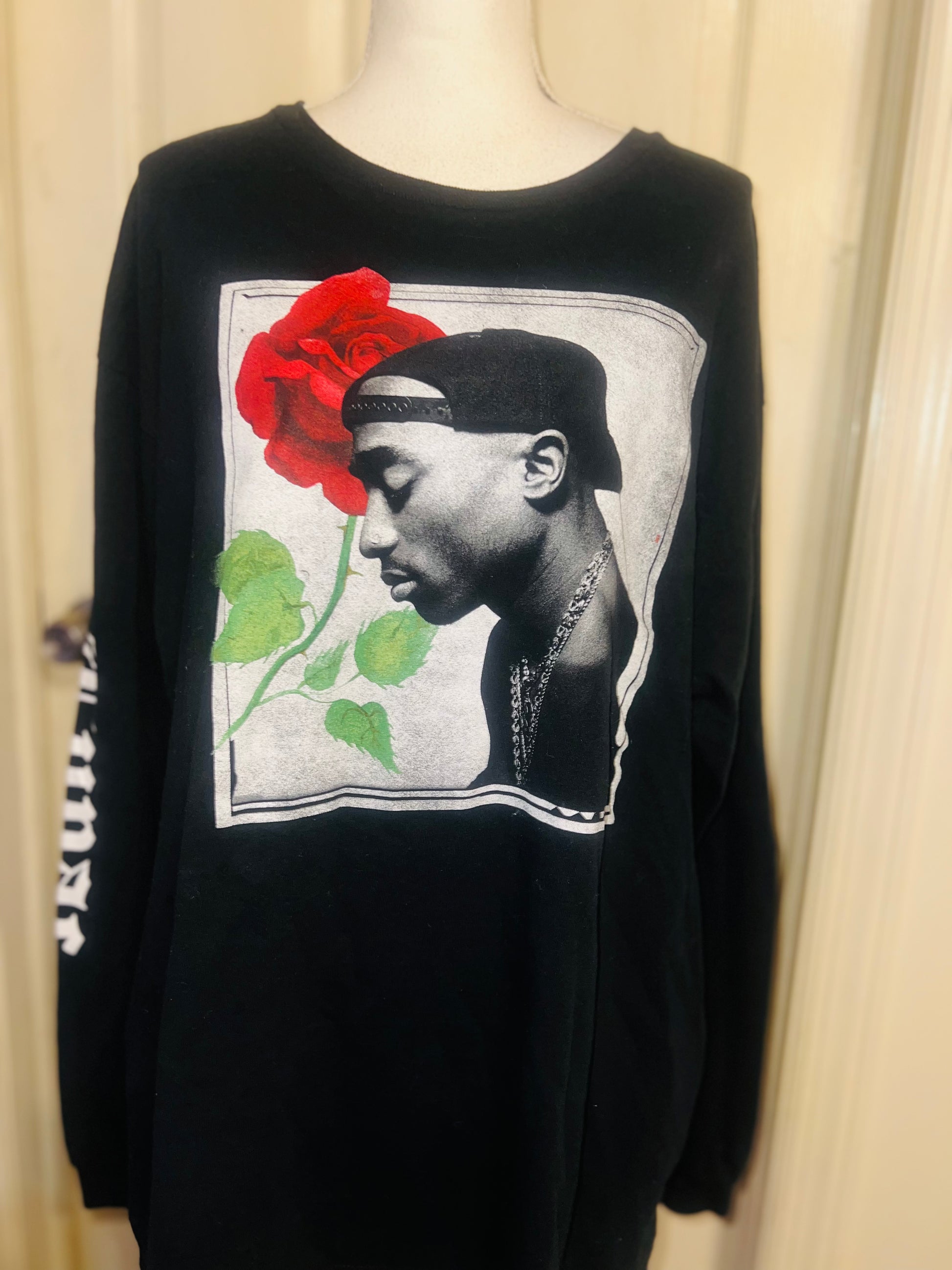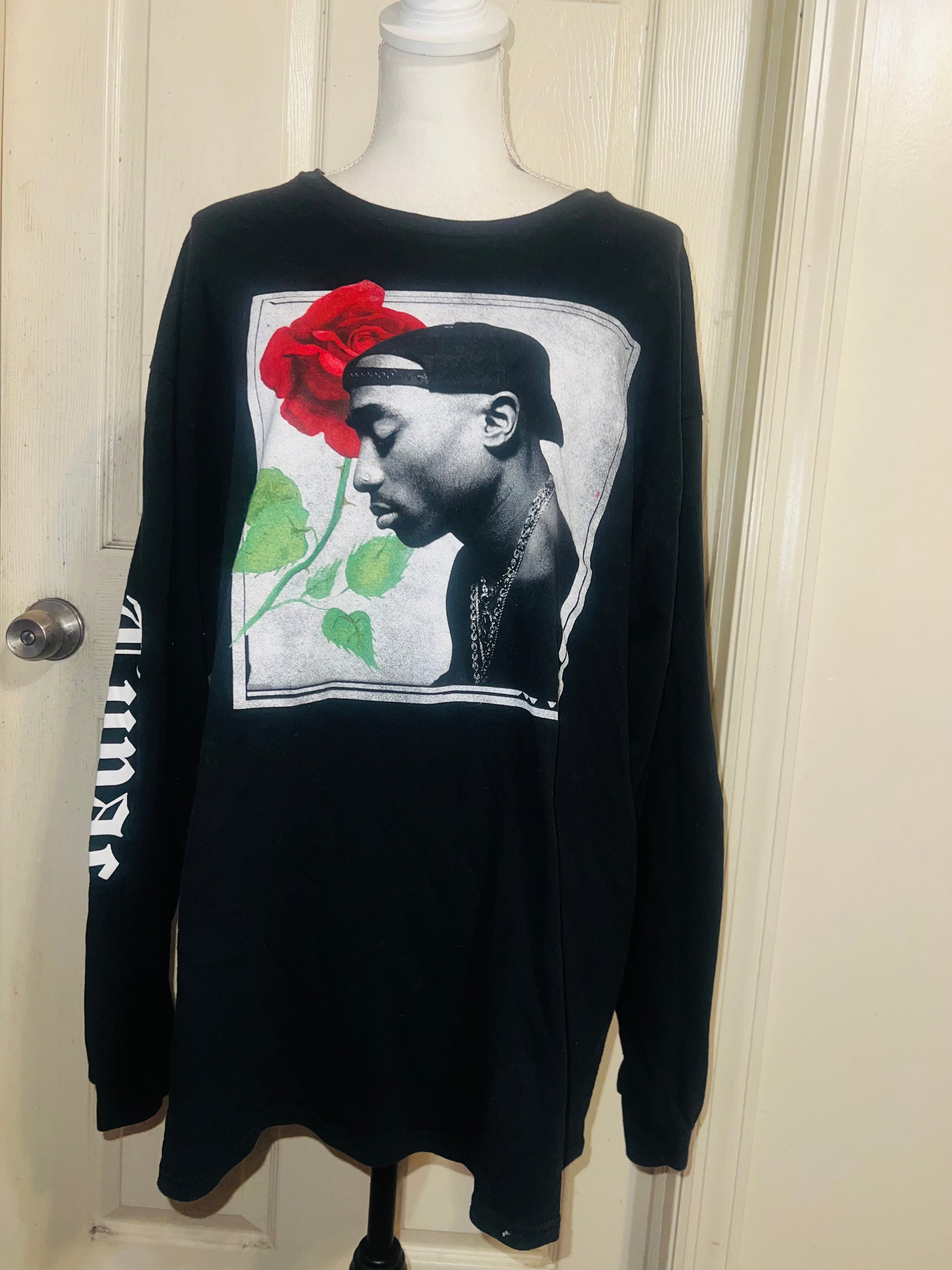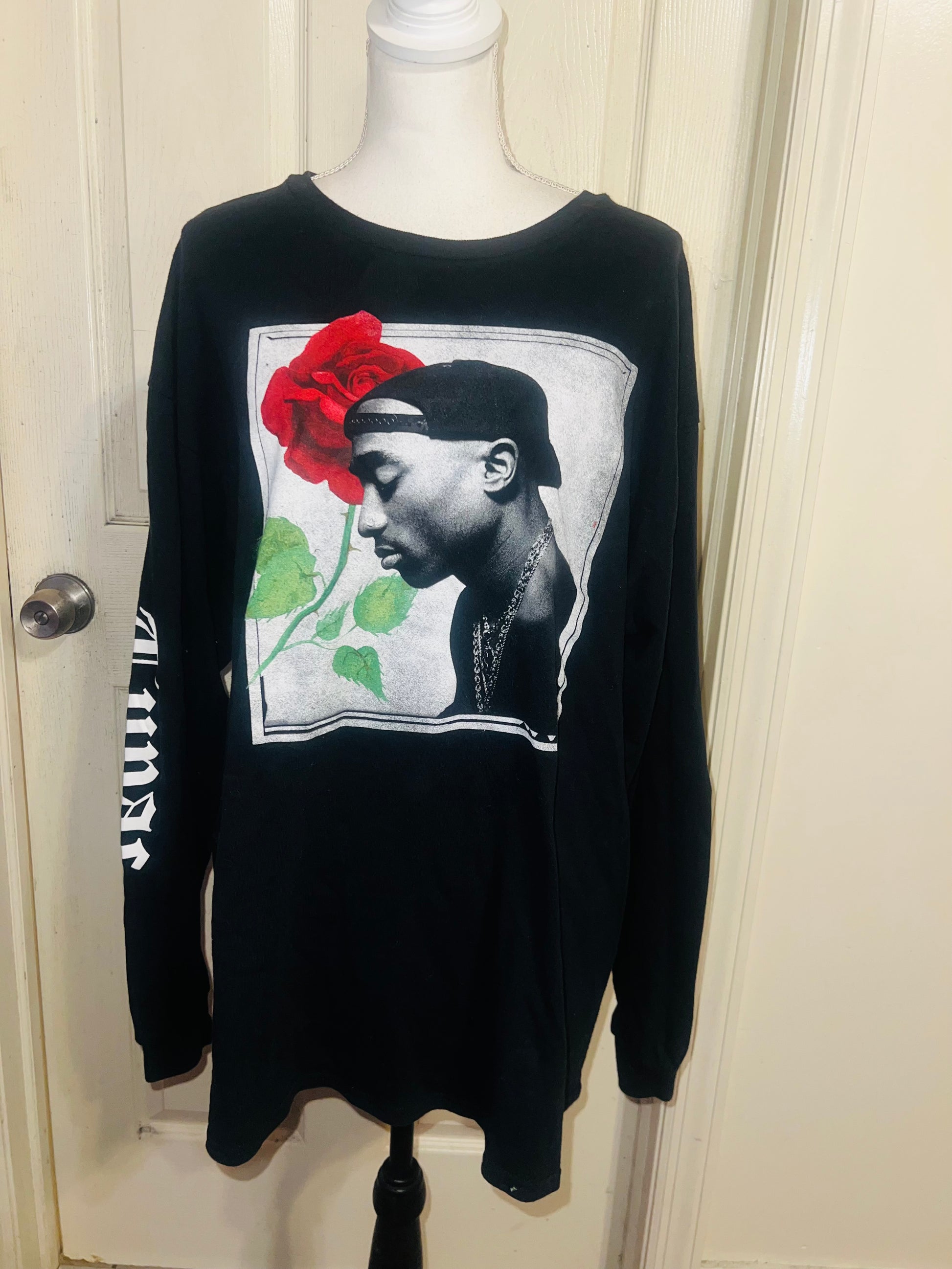 A black Tupac long tee shirt with a cool photo & Tupac written down the side of the sleeve. Size XL, oversized.