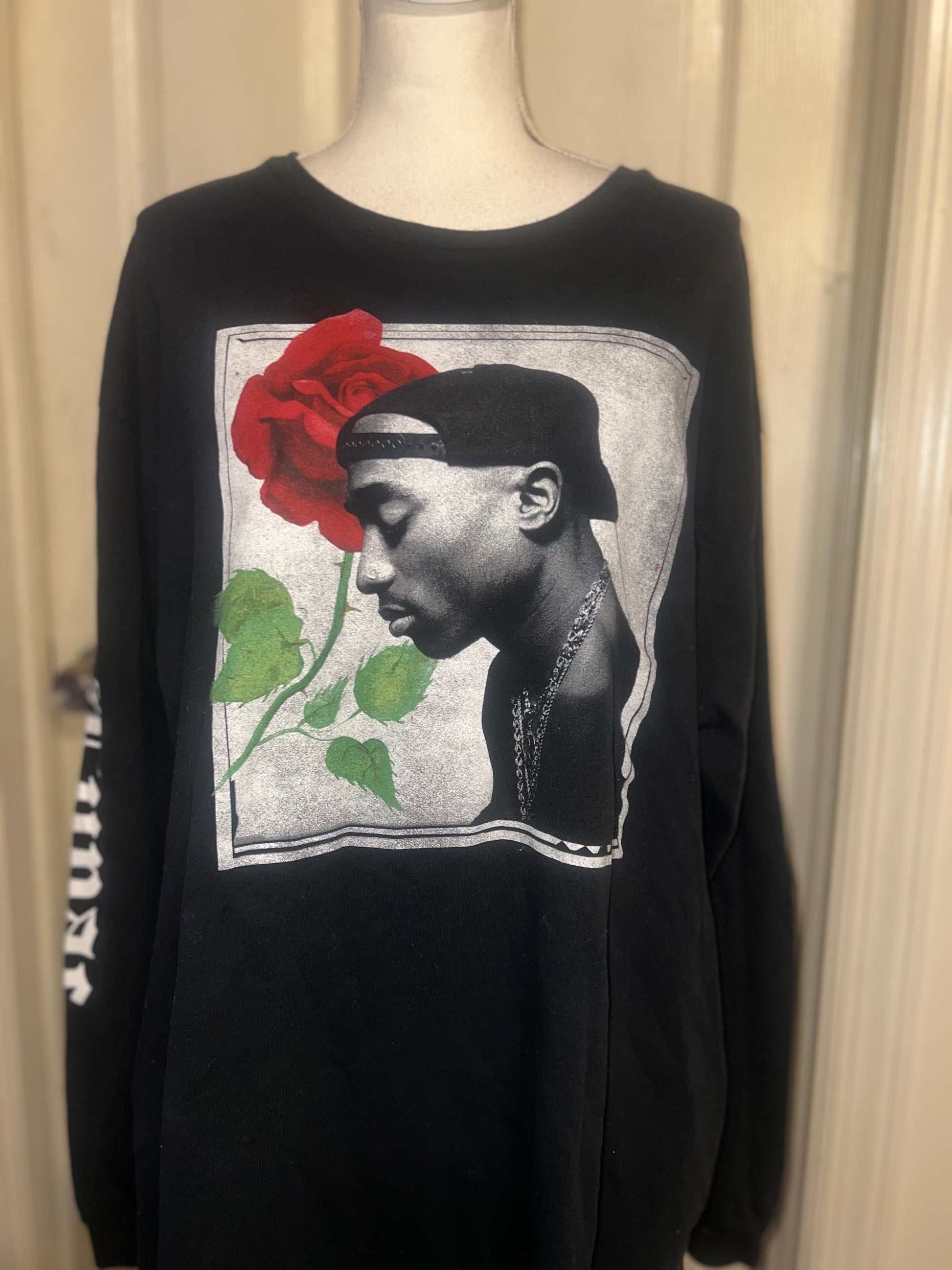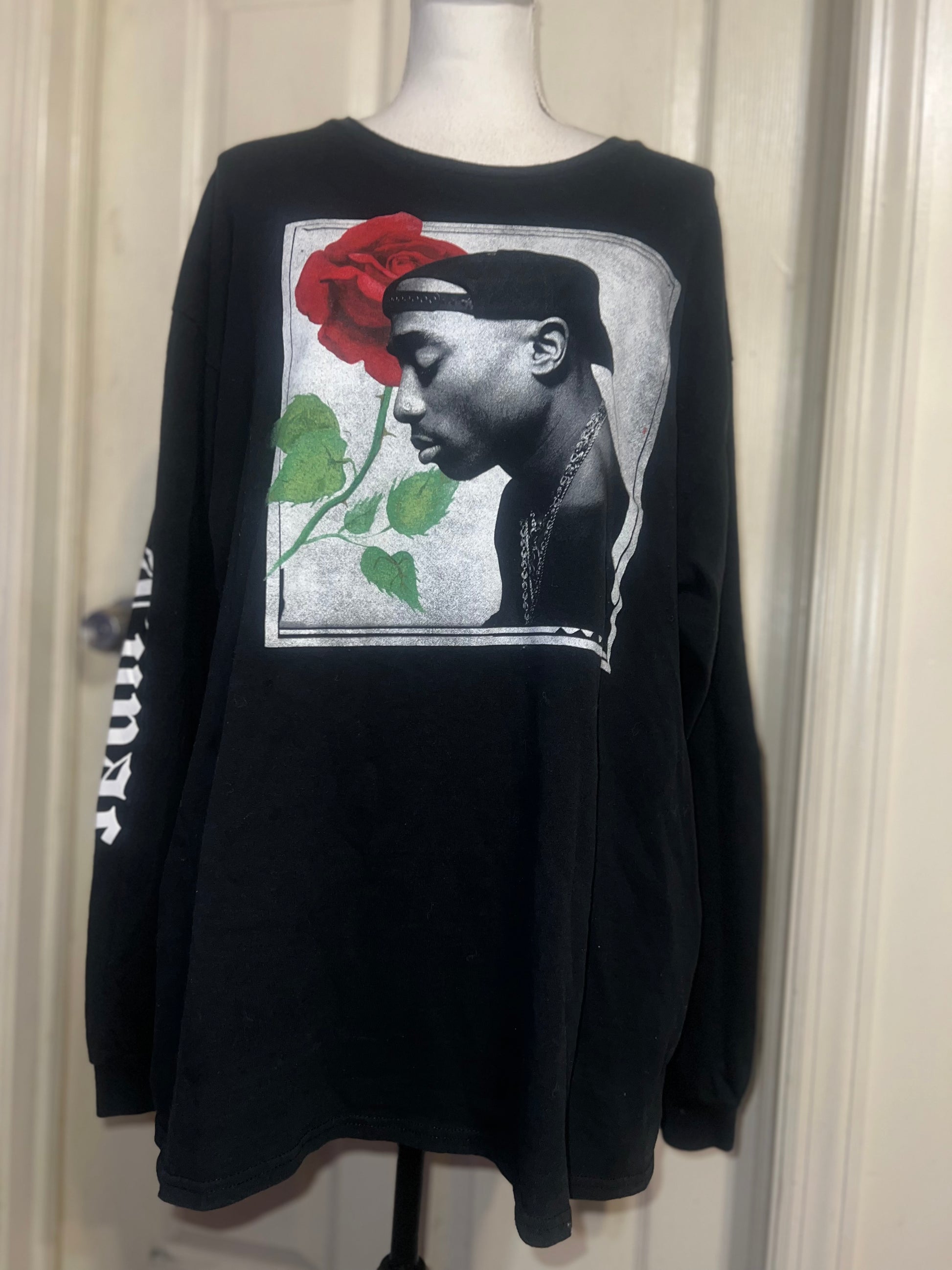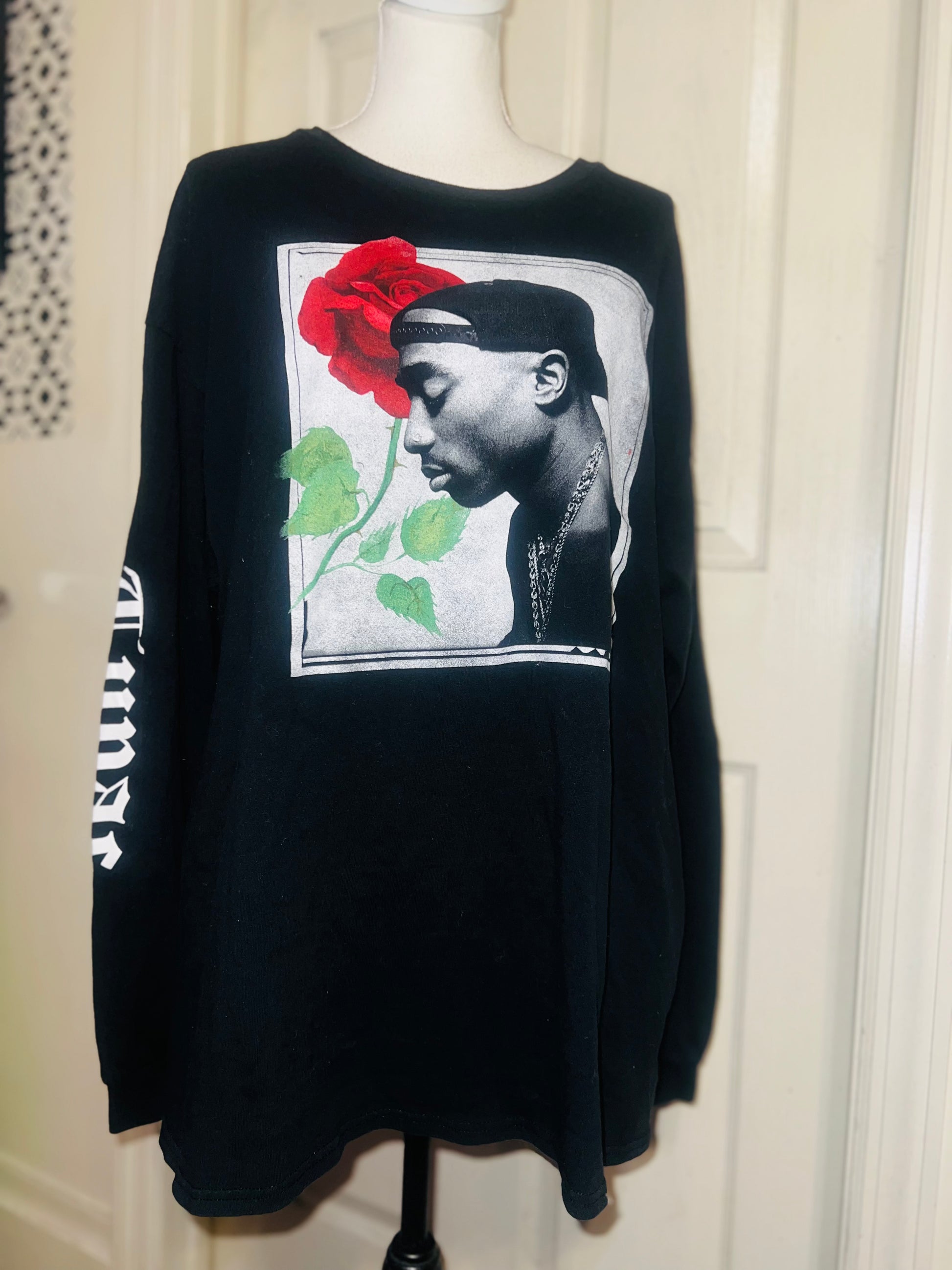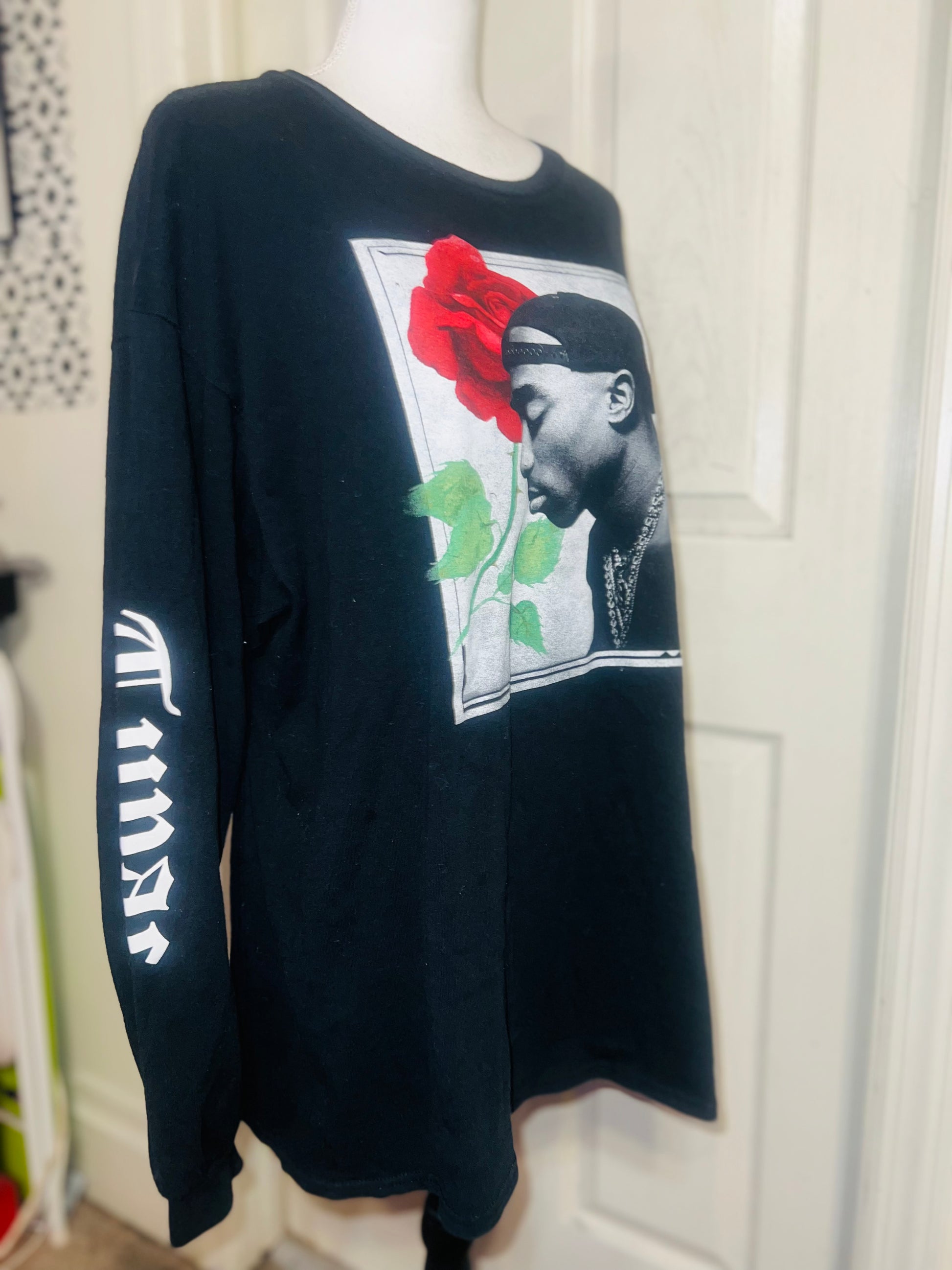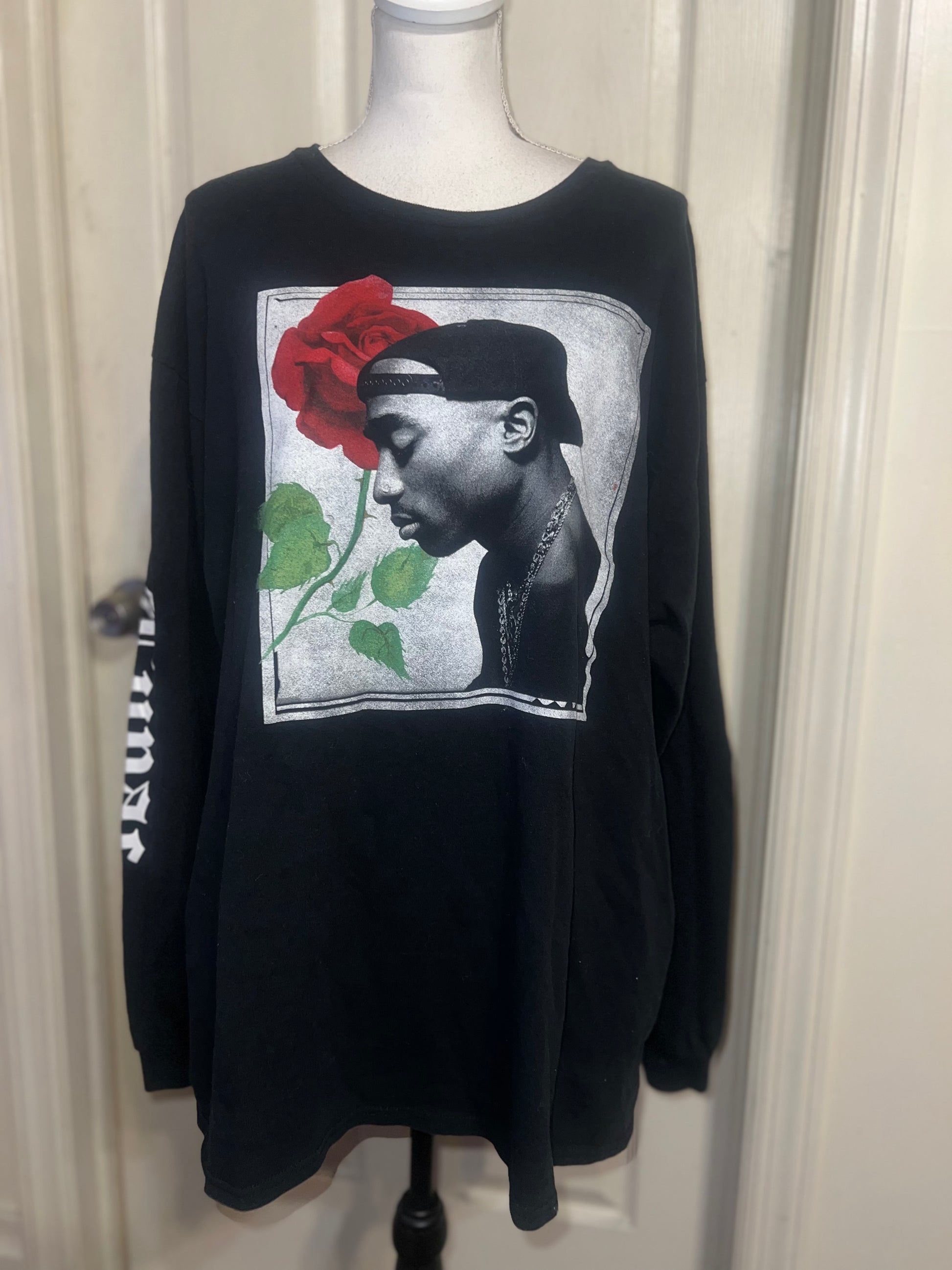 A black Tupac long tee shirt with a cool photo & Tupac written down the side of the sleeve. Size XL, oversized.