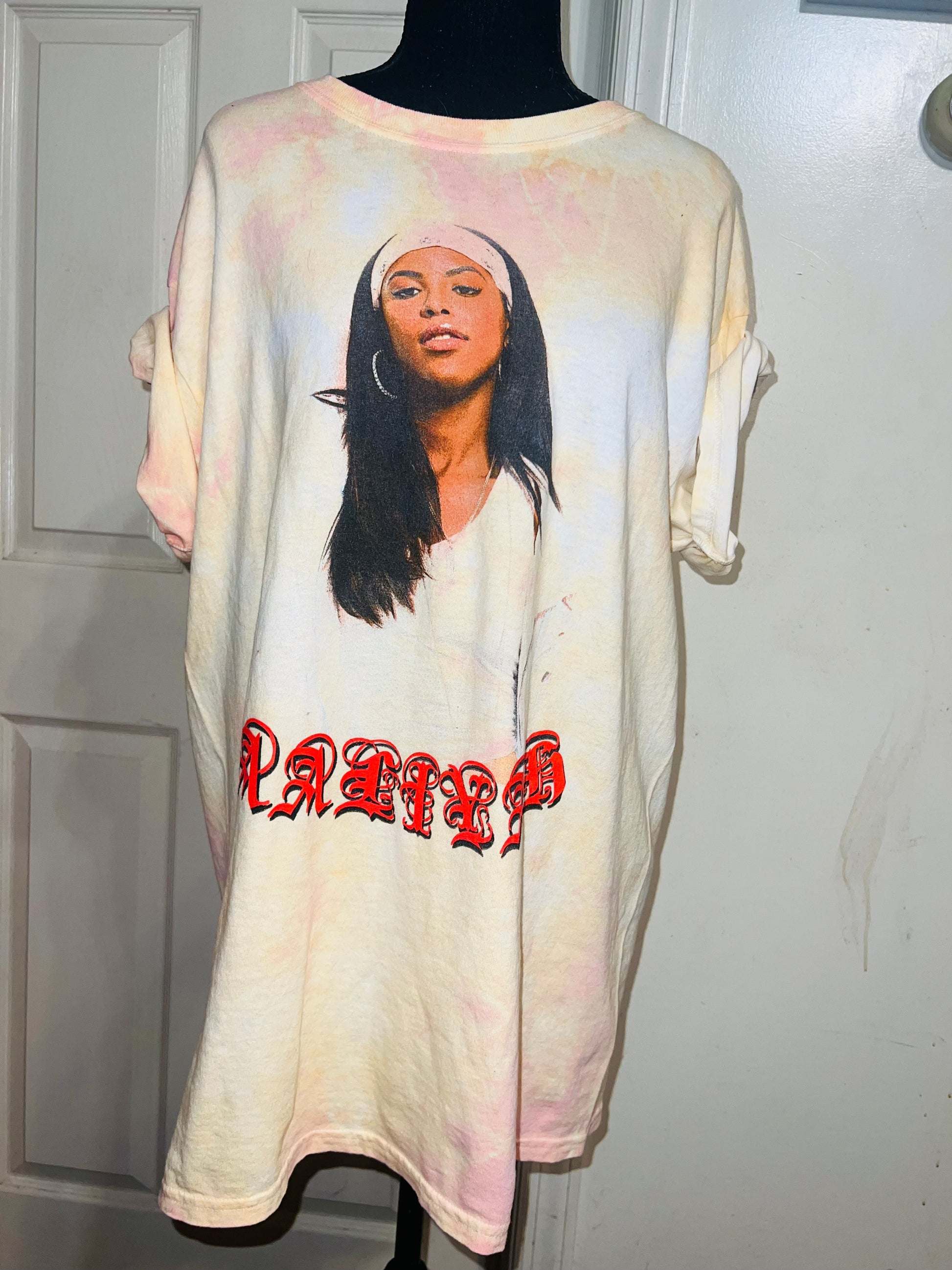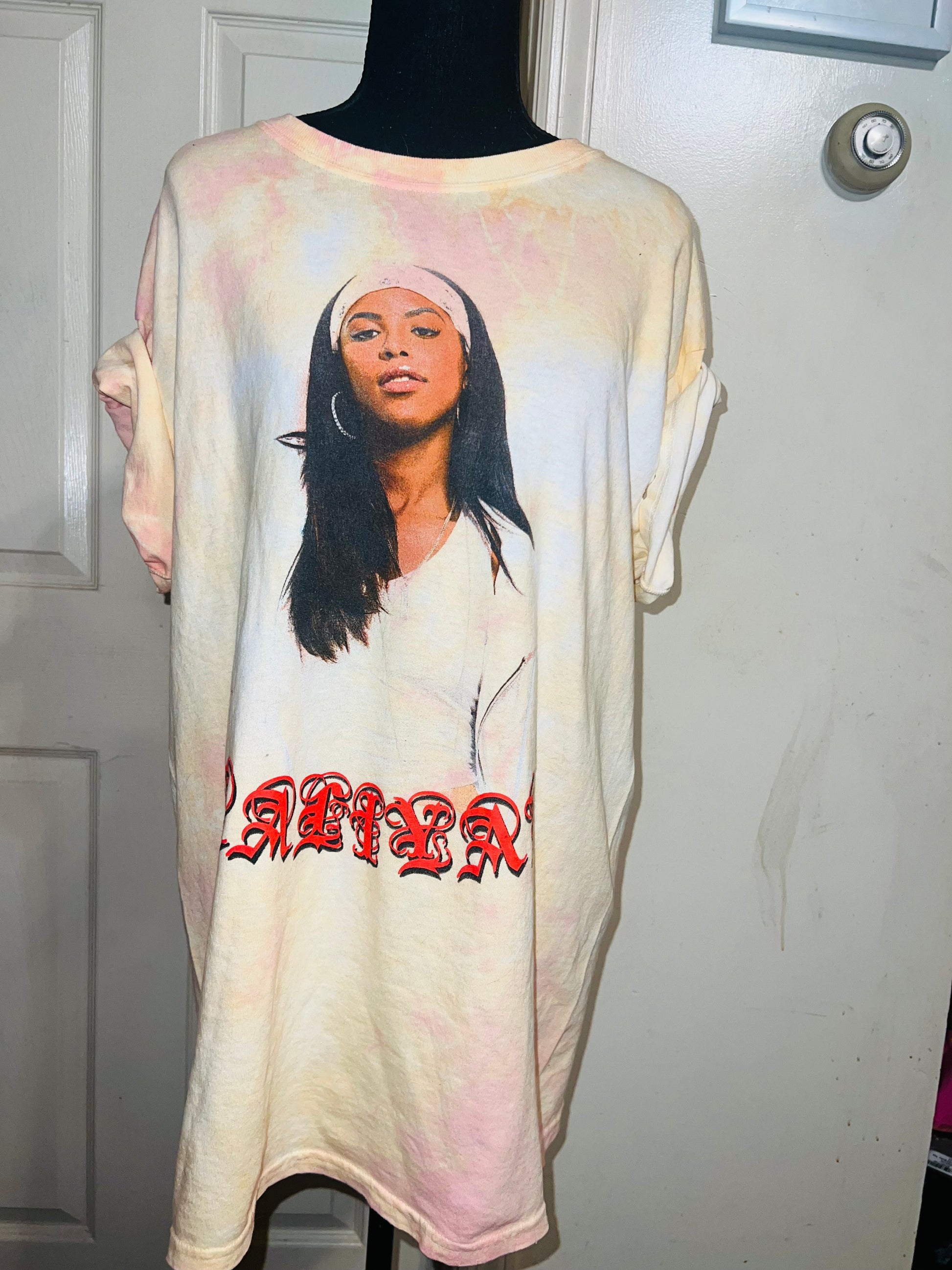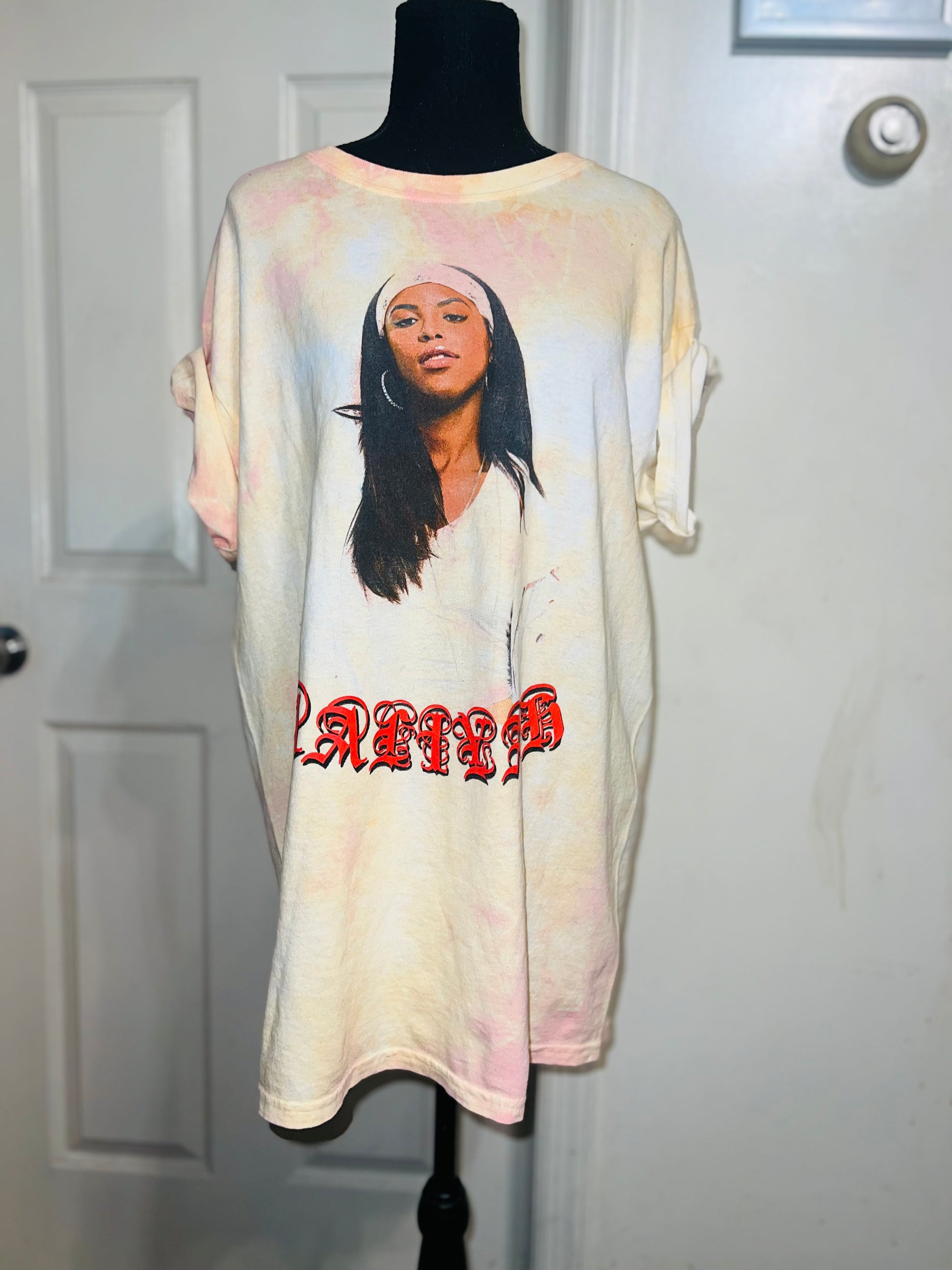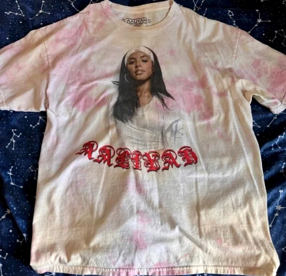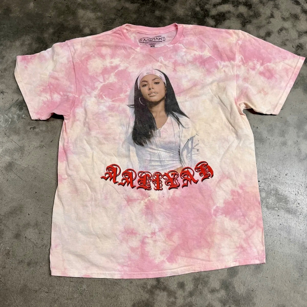 A pink and white tie dye Aaliyah oversized t-shirt with her name in a cool font and a portrait of Aaliyah herself! So comfortable, oversized, and soft. It’s so cute! Size XL, oversized.