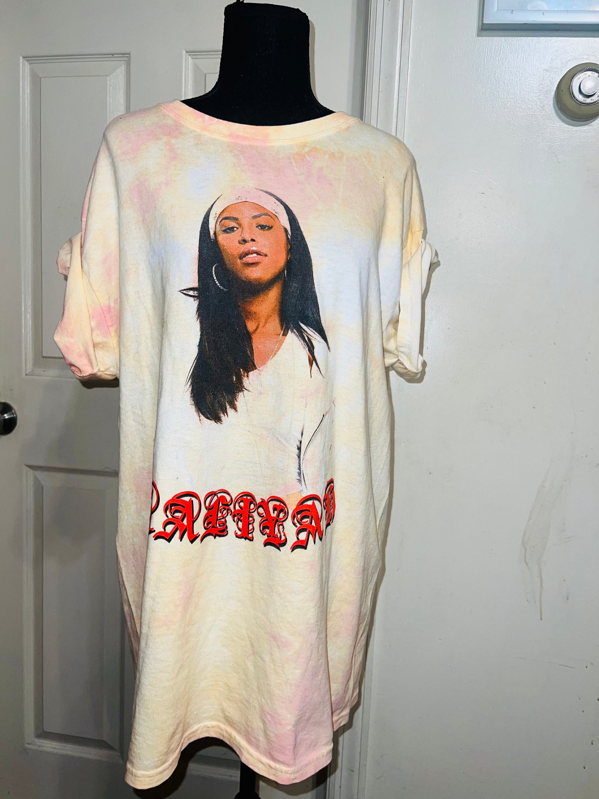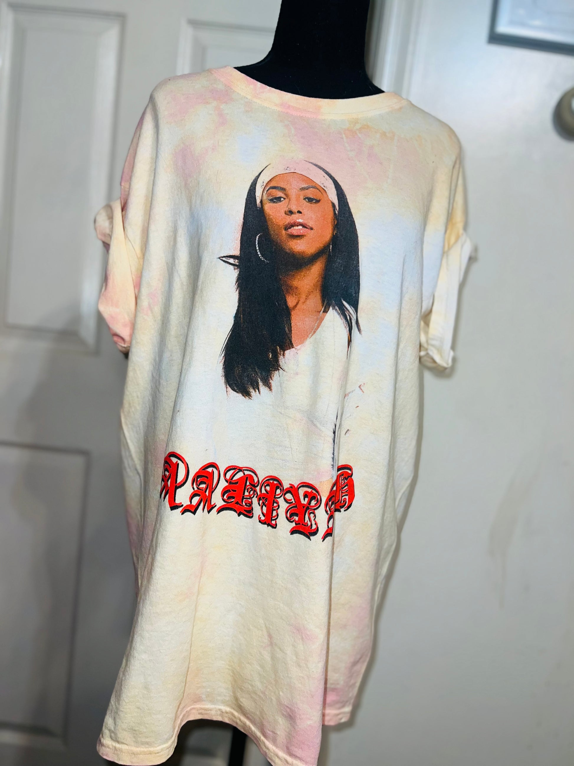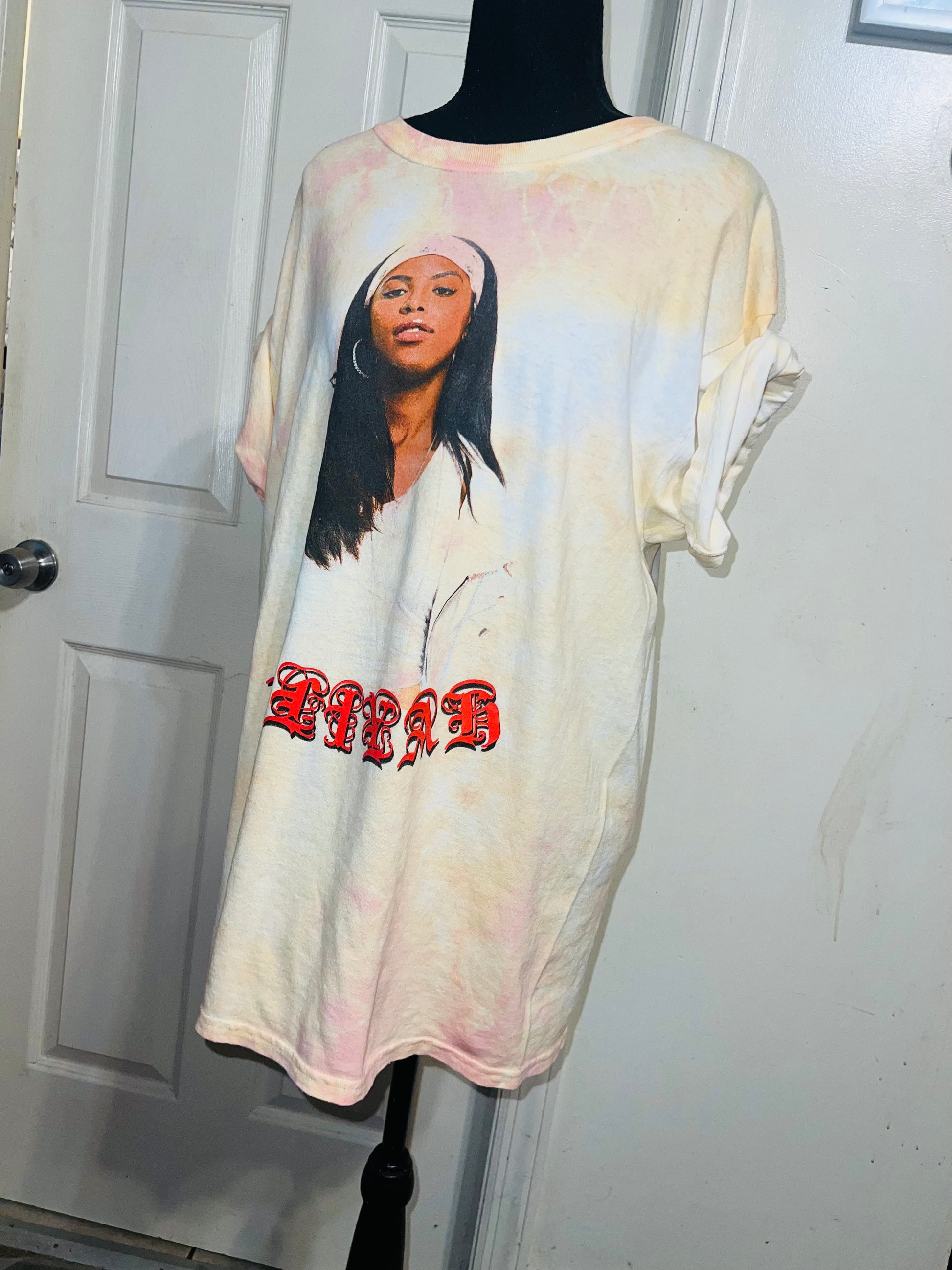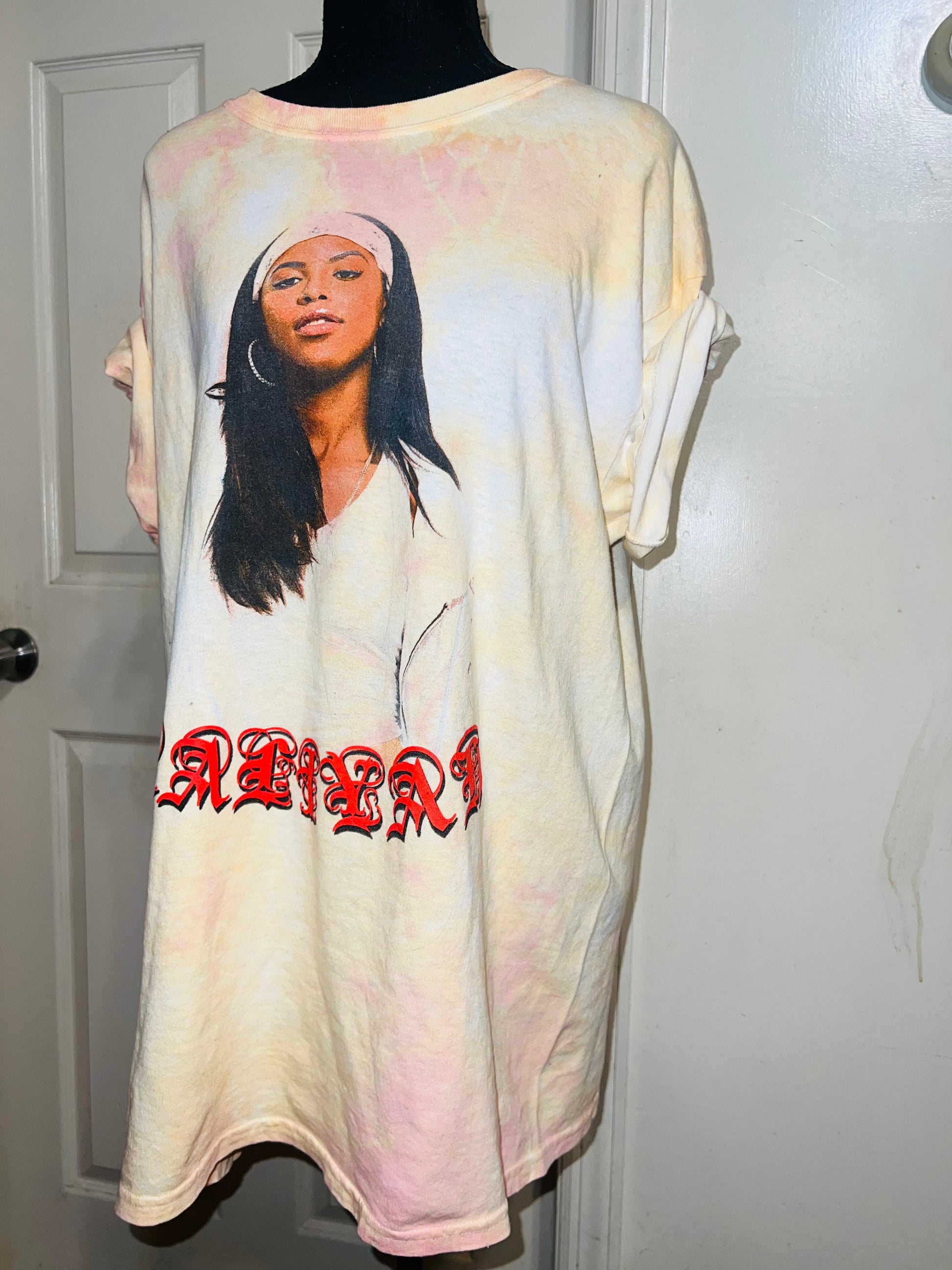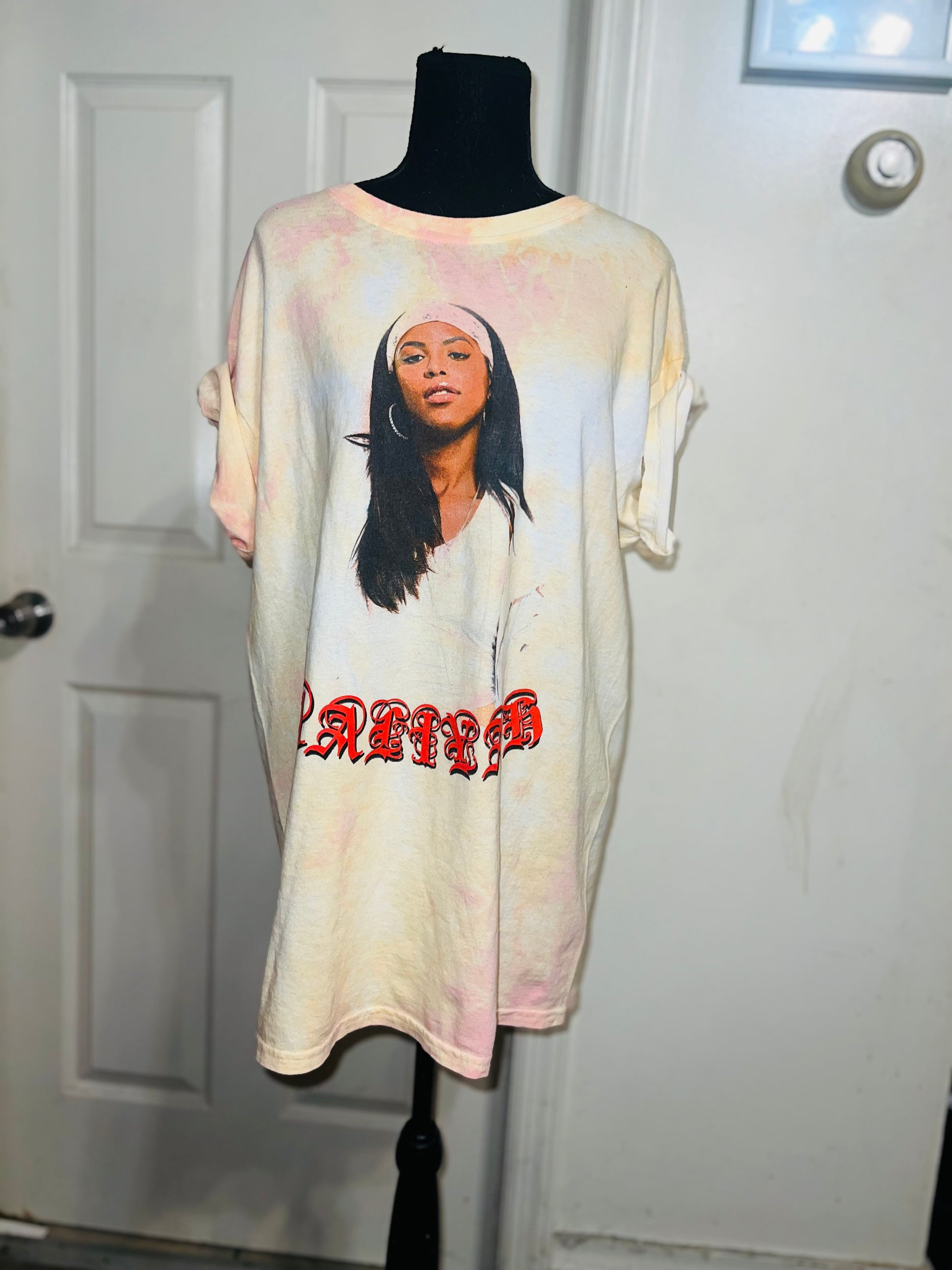 A pink and white tie dye Aaliyah oversized t-shirt with her name in a cool font and a portrait of Aaliyah herself! So comfortable, oversized, and soft. It’s so cute! Size XL, oversized.