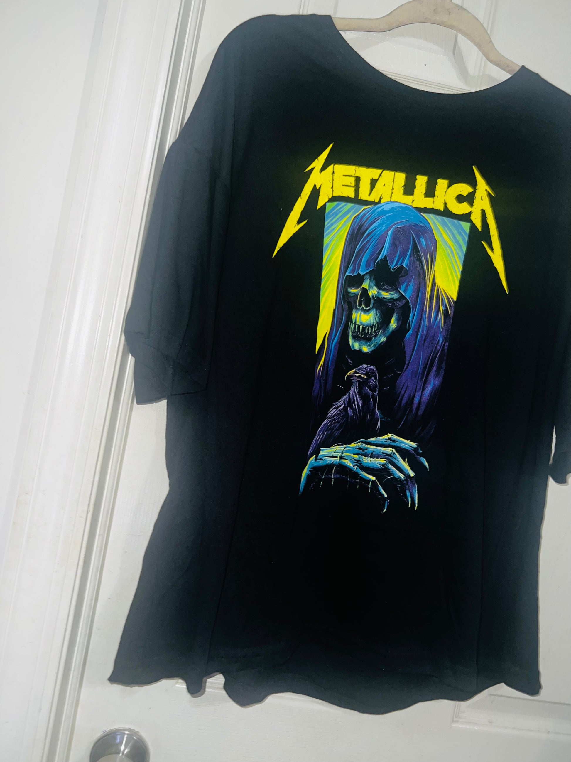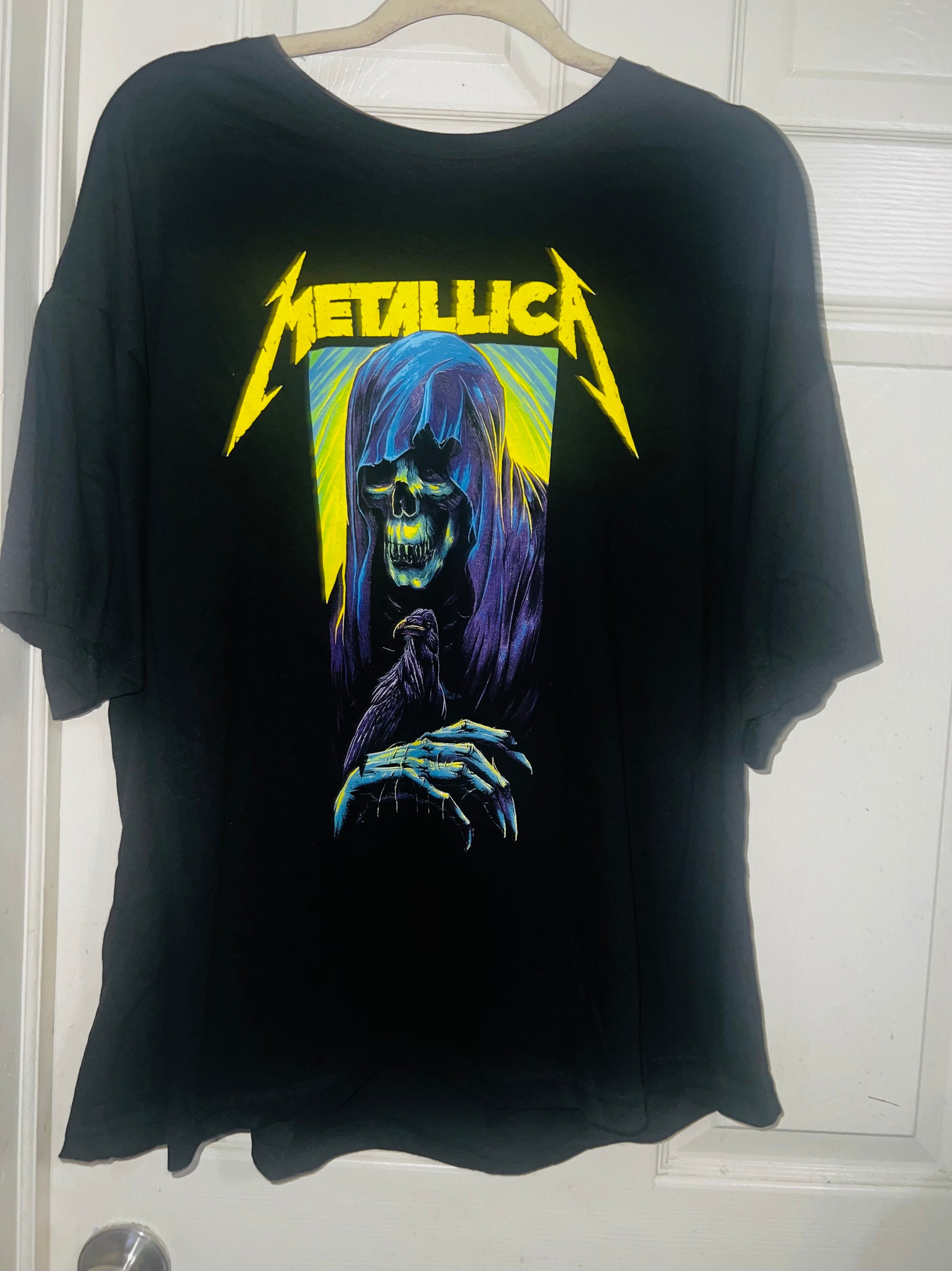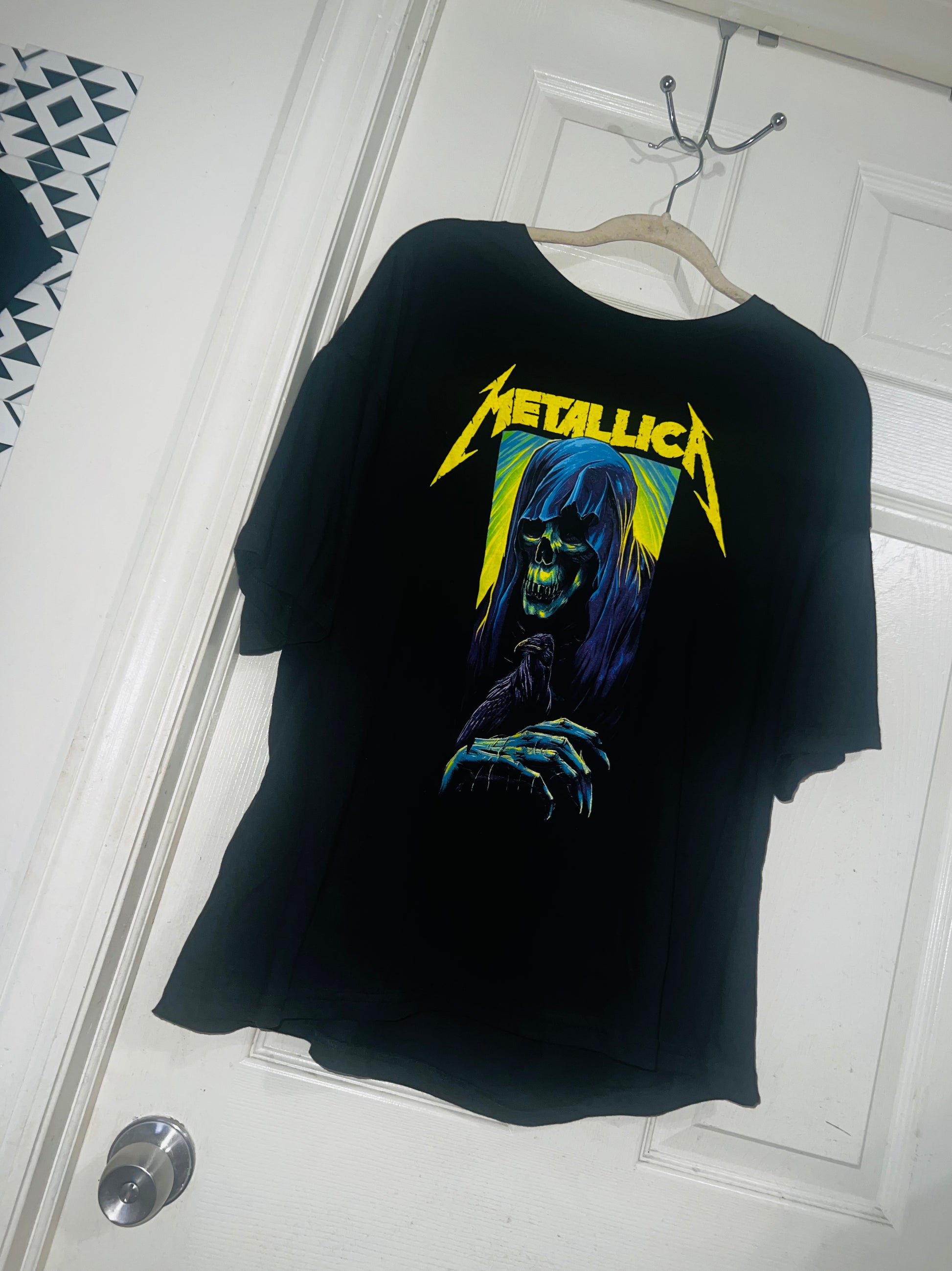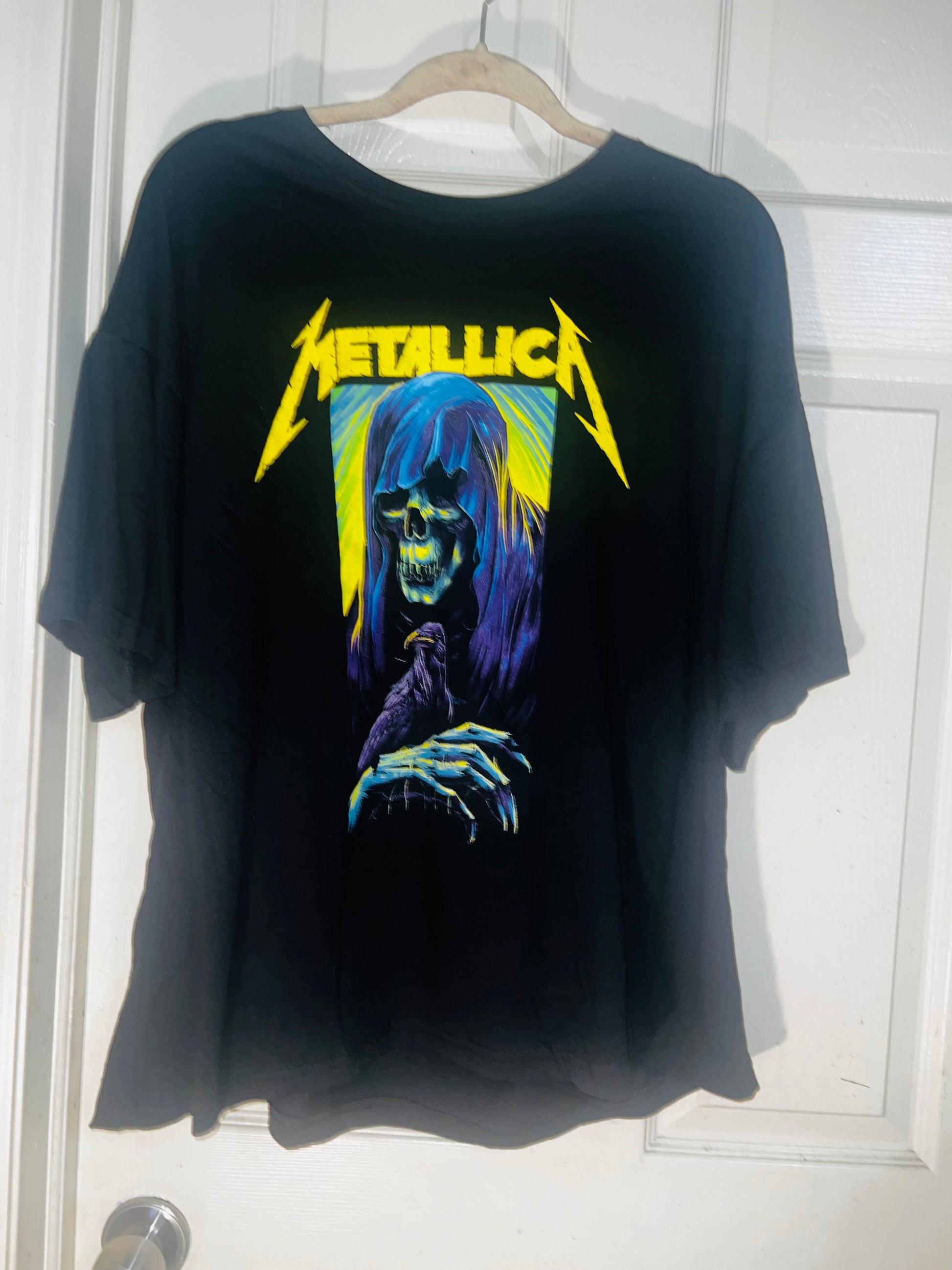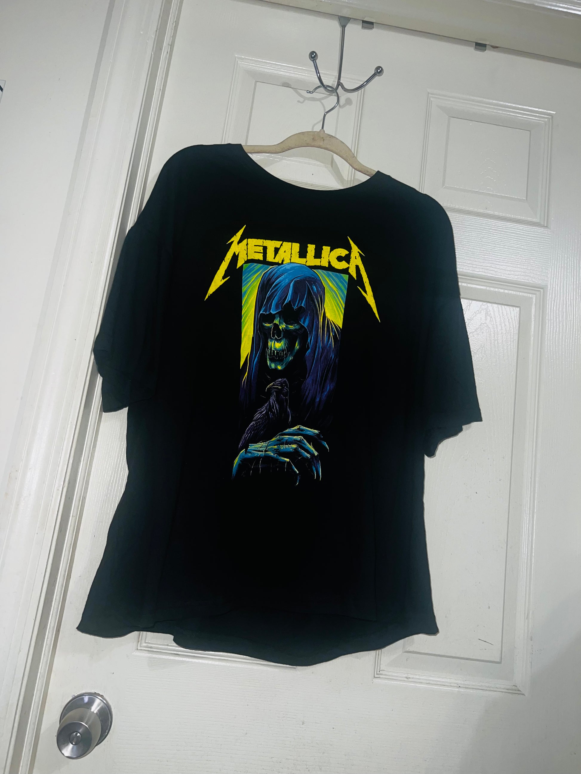 I love this shirt and it’s perfect for Halloween! Black, soft, oversized tee but not super long so it fits amazing. The bright colors pop off the shirt with the coolest graphic. Would look so good distressed. Size L/XL and XXL.