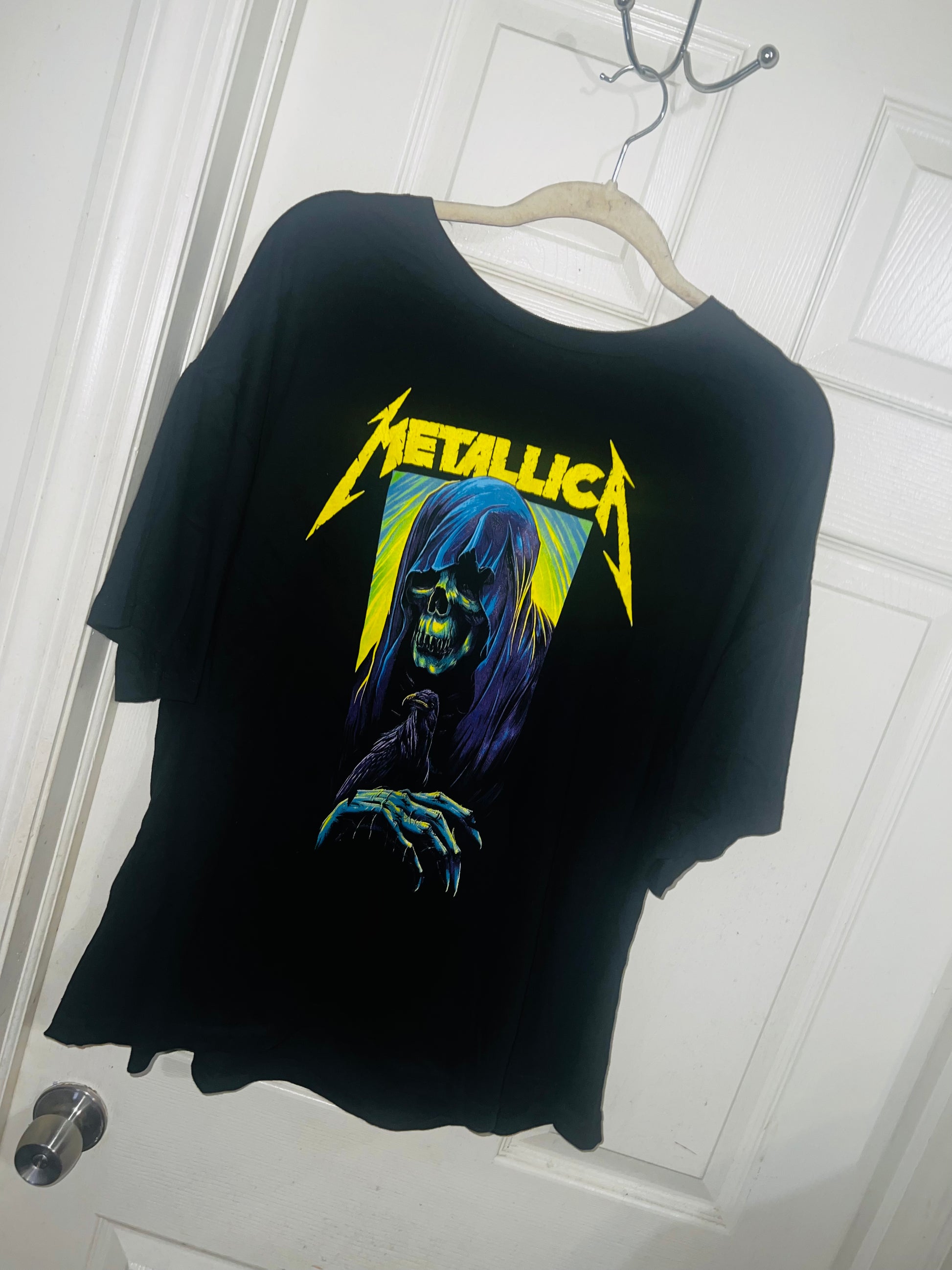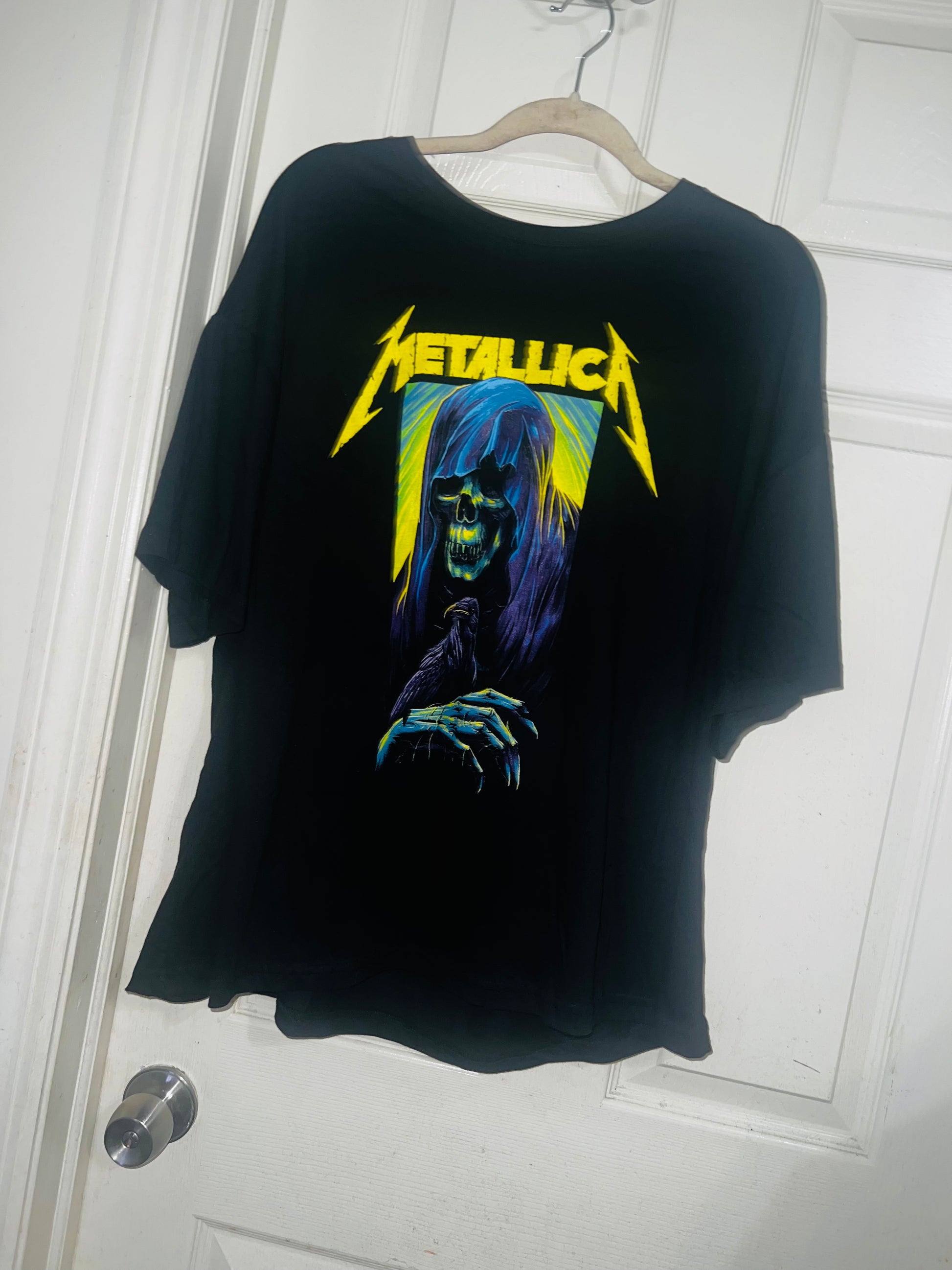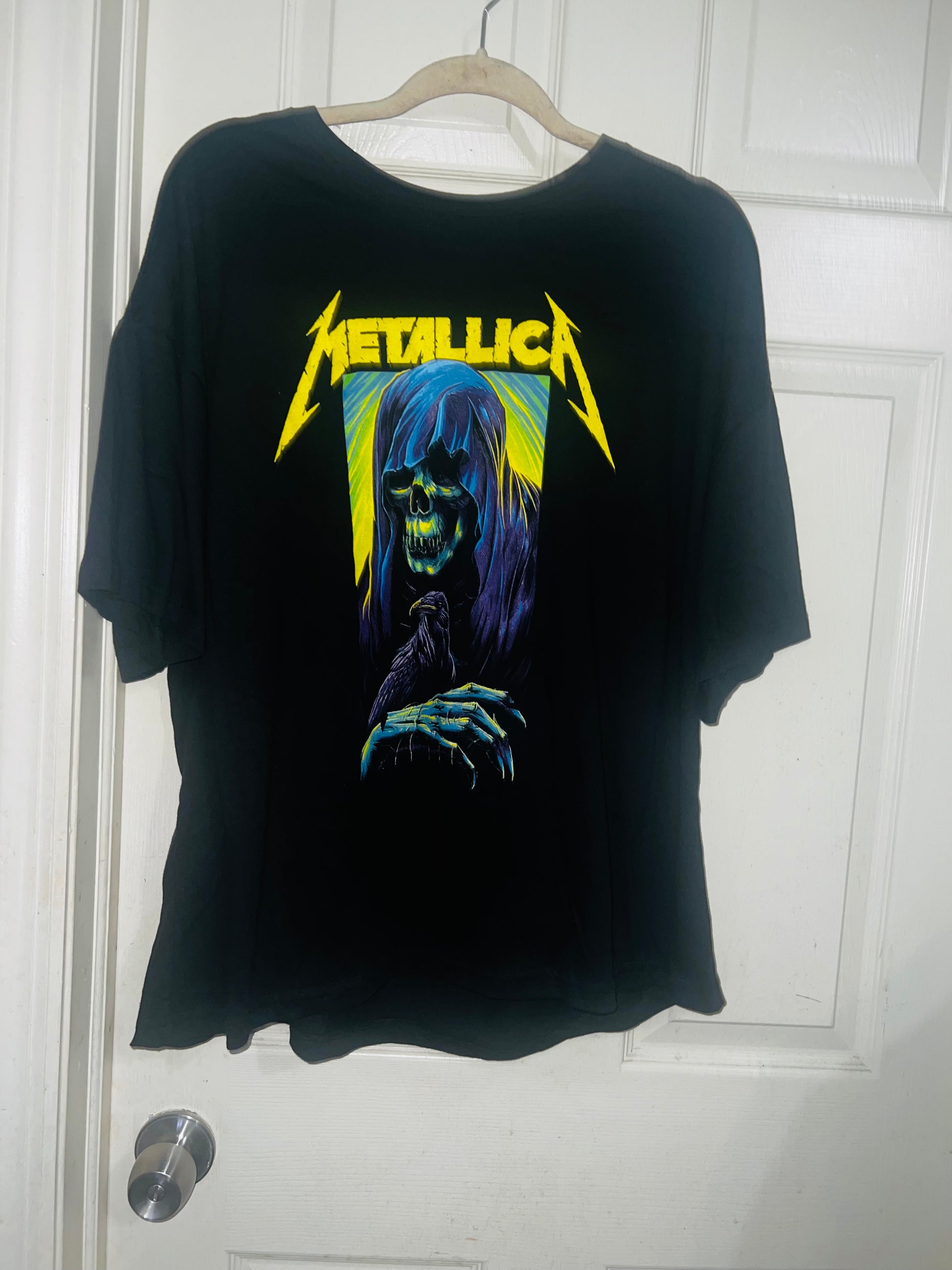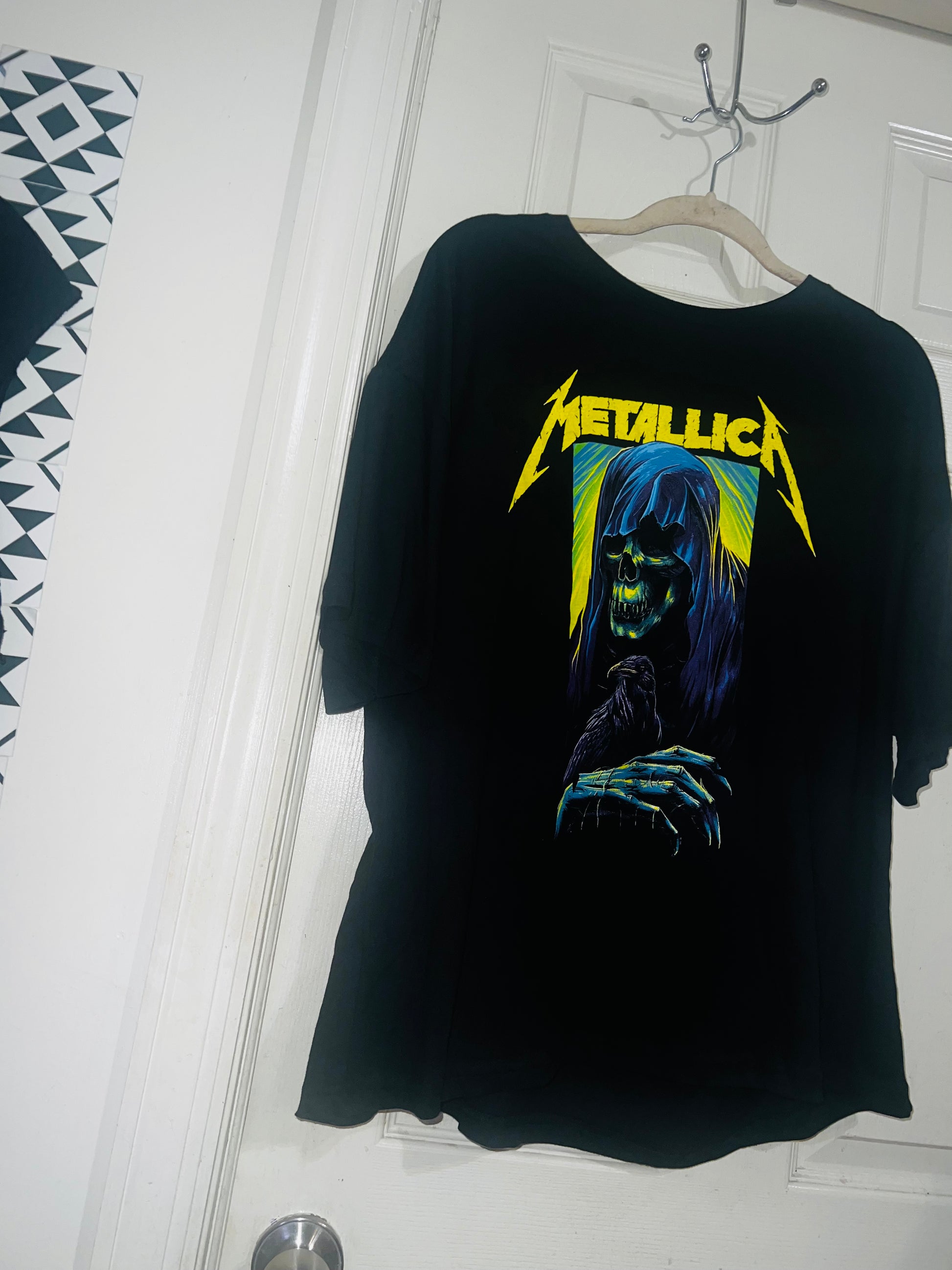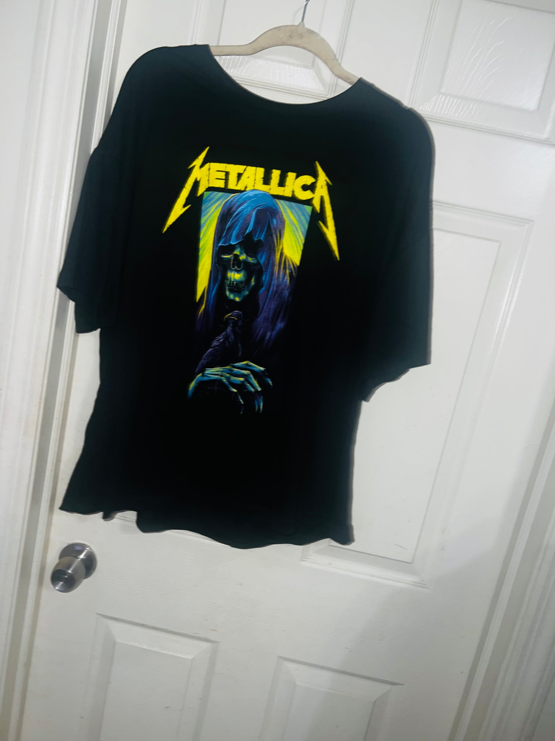 I love this shirt and it’s perfect for Halloween! Black, soft, oversized tee but not super long so it fits amazing. The bright colors pop off the shirt with the coolest graphic. Would look so good distressed. Size L/XL and XXL.