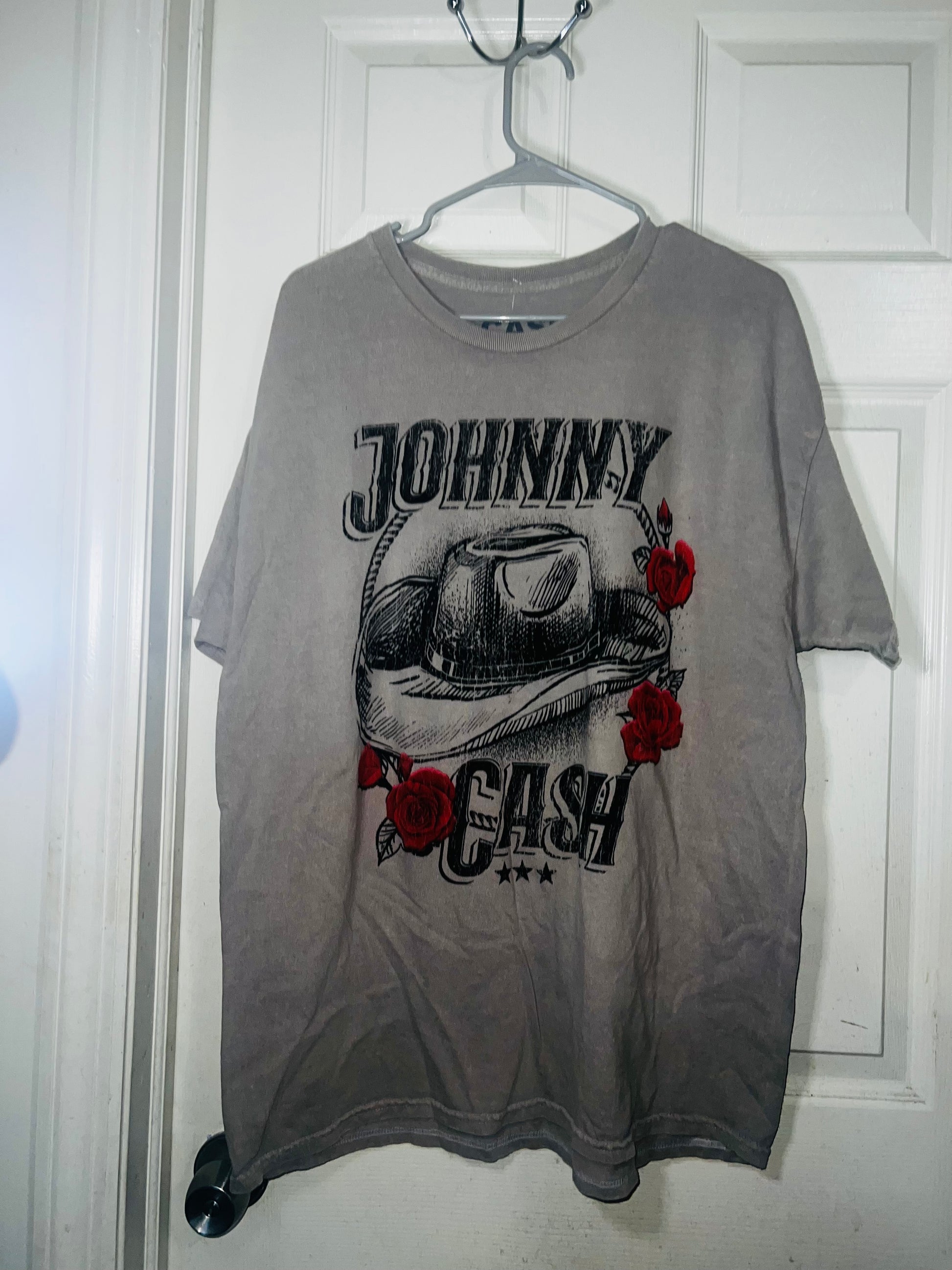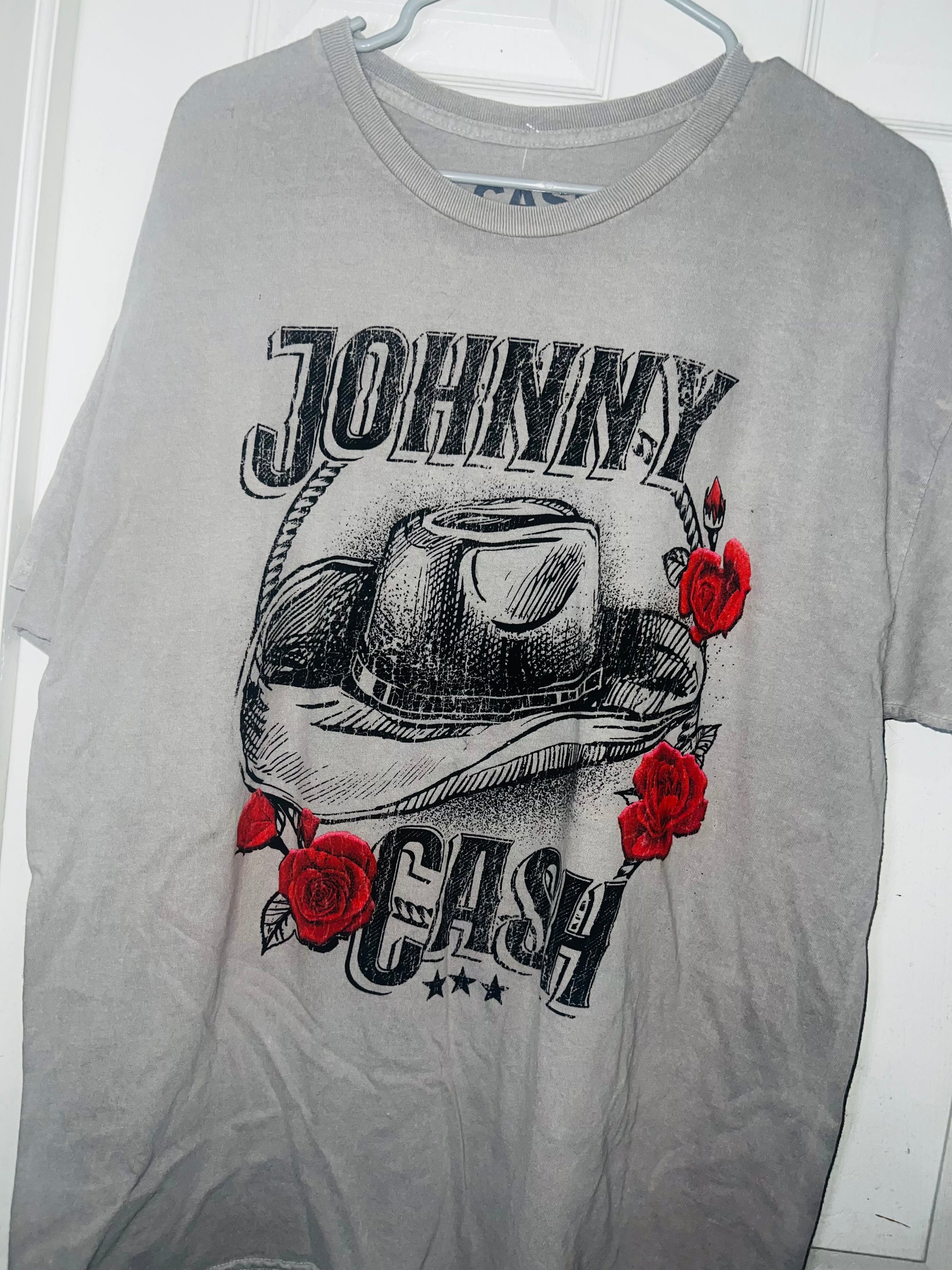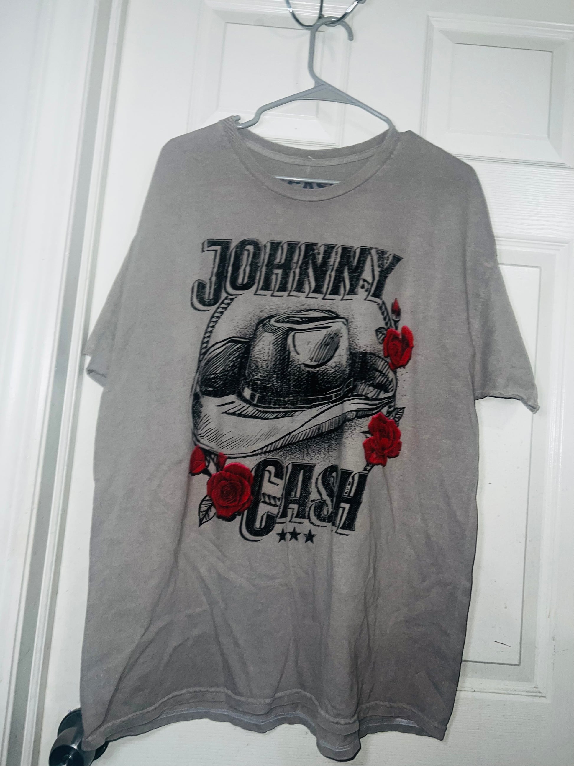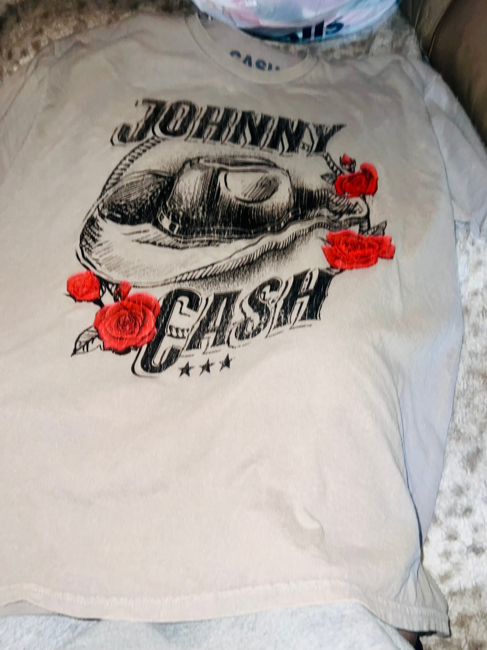 This is a preorder, it’s on its way. Please allow extra time. A beige, oversized super cute Johnny Cash tee! The roses and the cowboy hat give it the western vibe. Size L/XL, comfy and roomy!