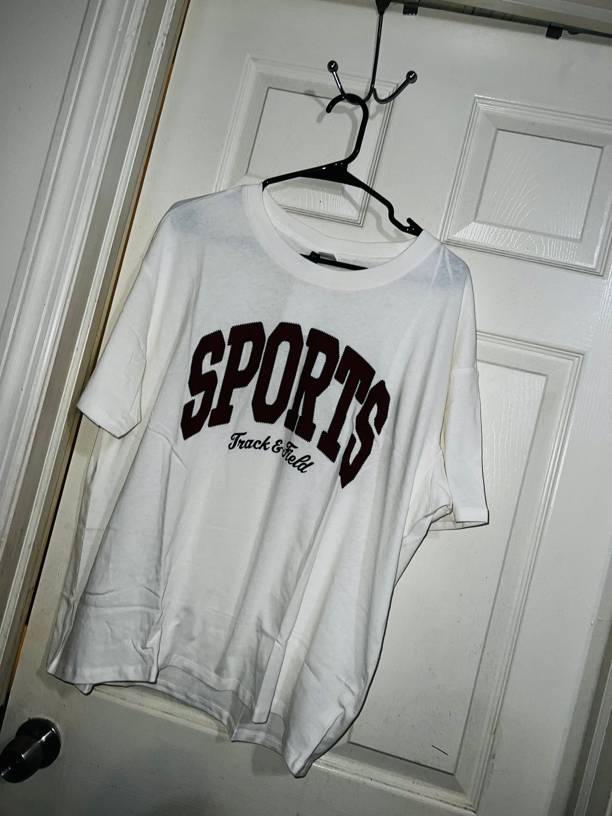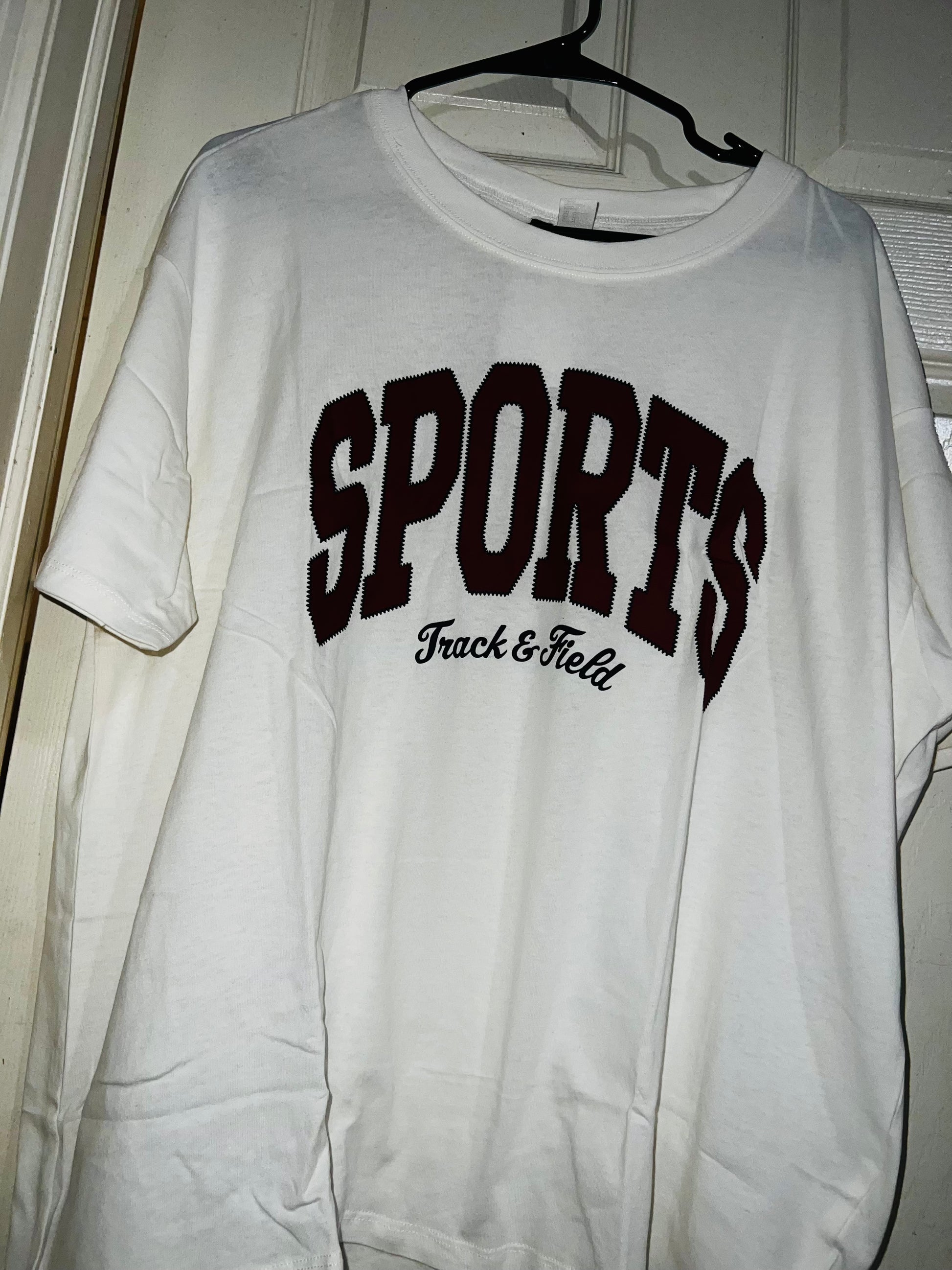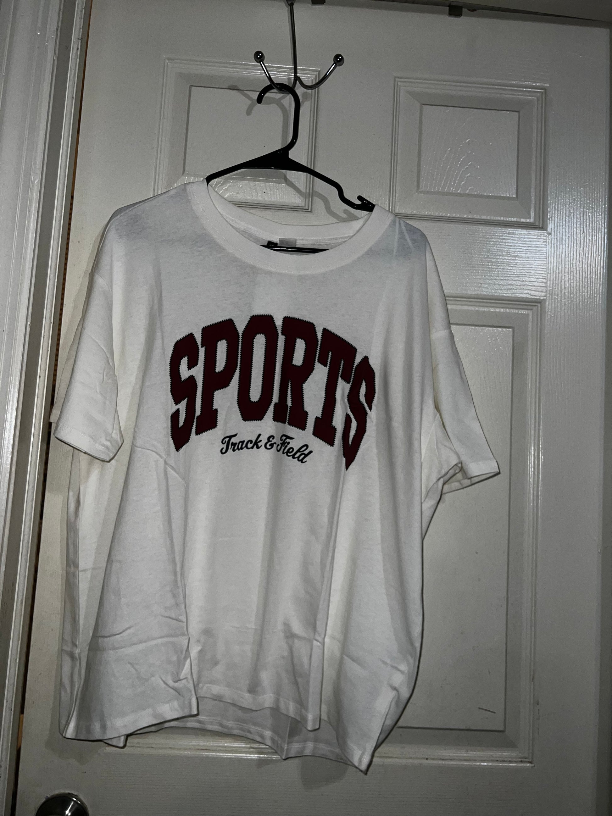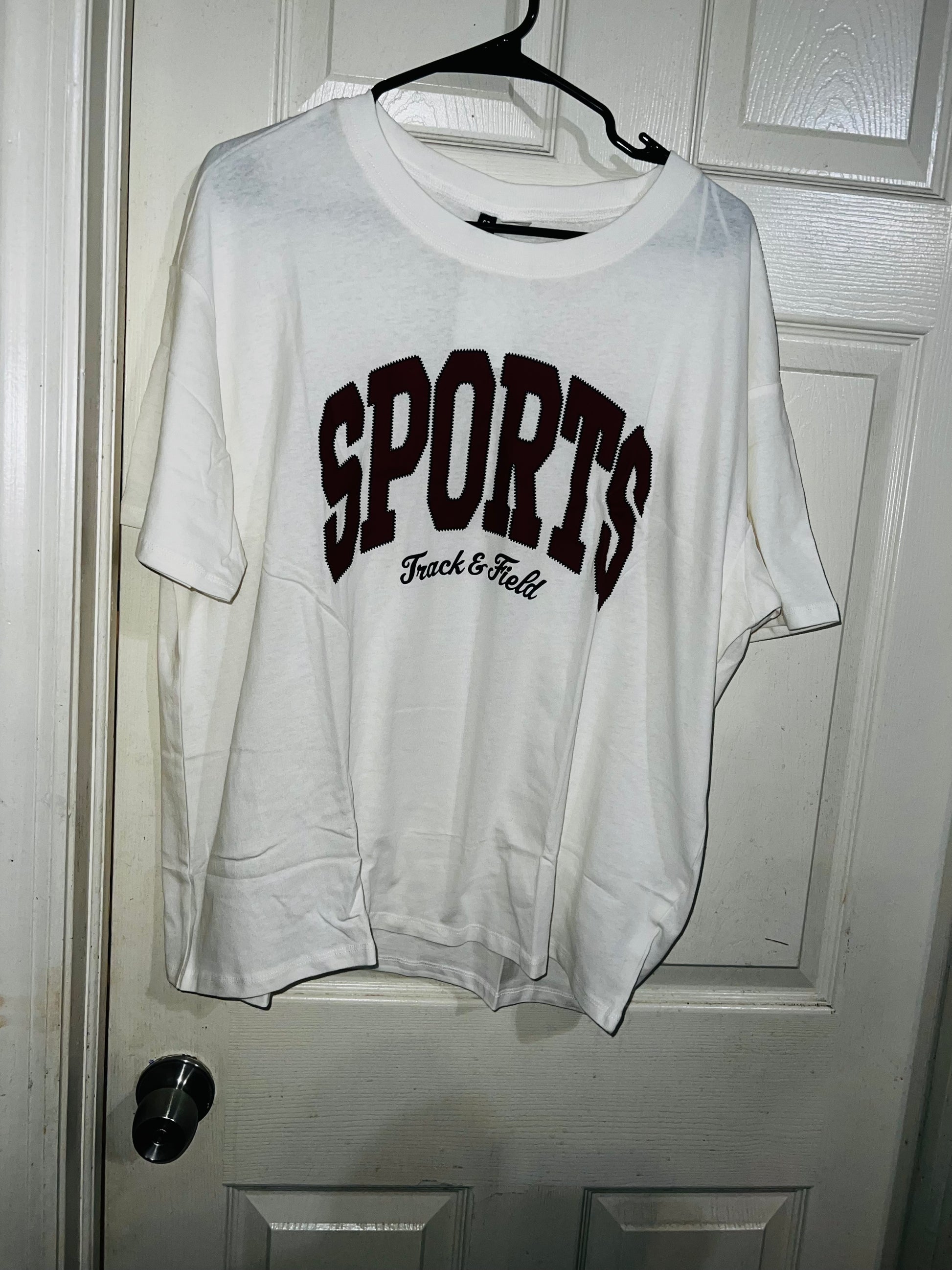 Similar to the super popular “sports” tee in green I’ve had in the past, that one sold a ton, the off white “Sports” in burgundy track and field is perfect for any game day. Goes with any sport and is sorta like the joke “Go Sports!” if you aren’t a huge fan. Soo cute, size XL oversized.