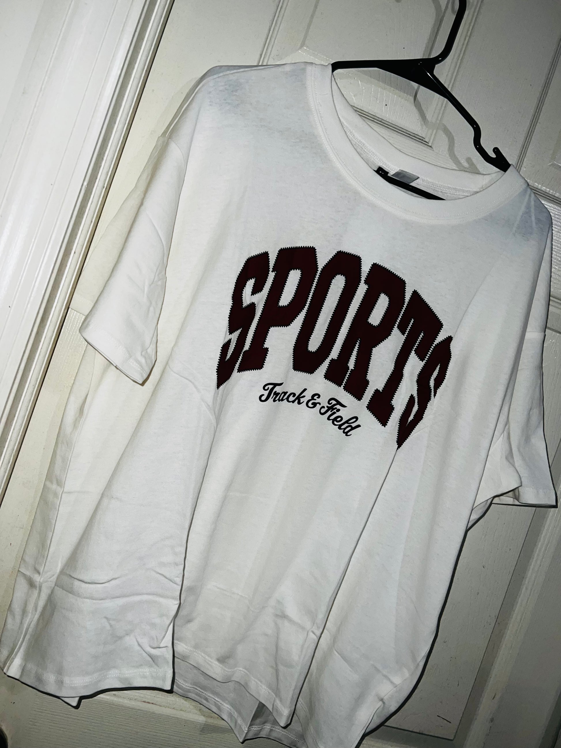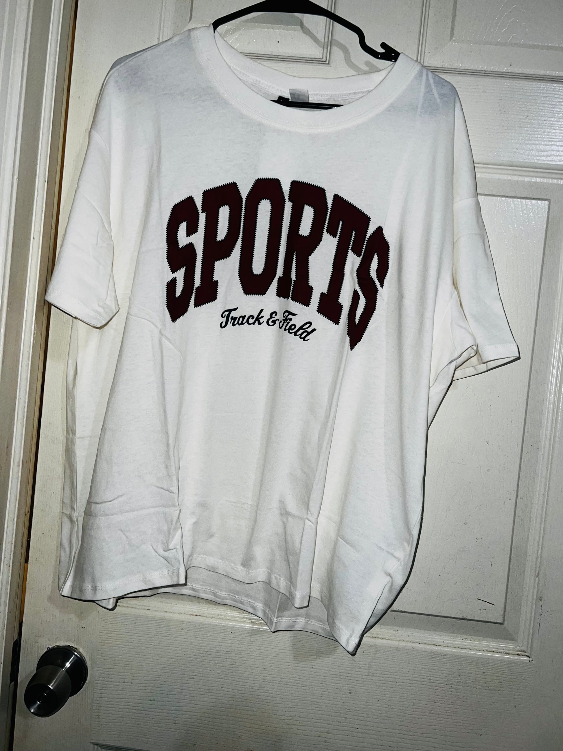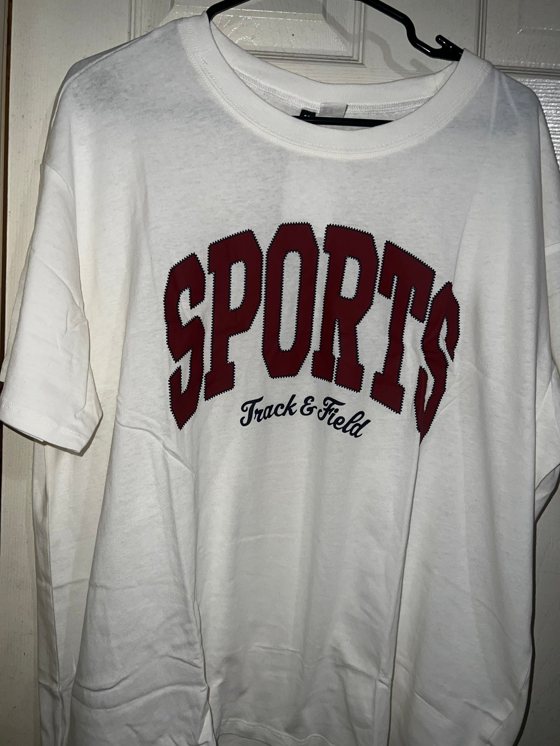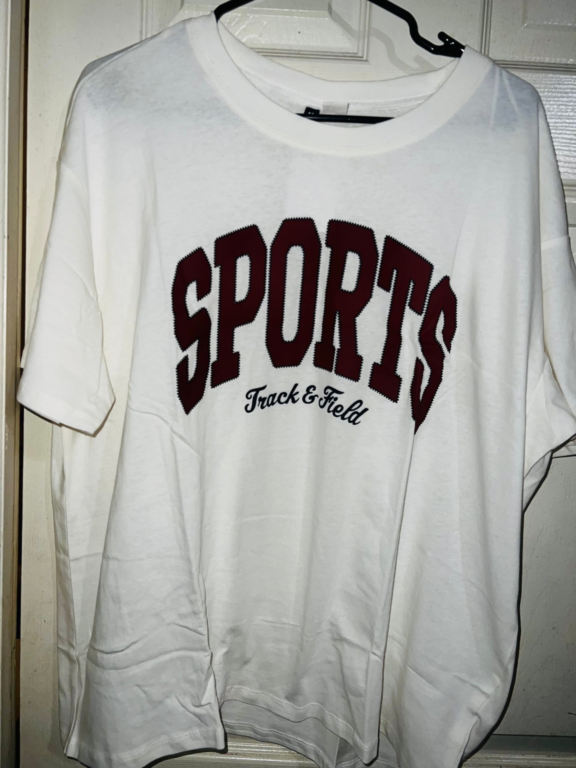 Similar to the super popular “sports” tee in green I’ve had in the past, that one sold a ton, the off white “Sports” in burgundy track and field is perfect for any game day. Goes with any sport and is sorta like the joke “Go Sports!” if you aren’t a huge fan. Soo cute, size XL oversized.