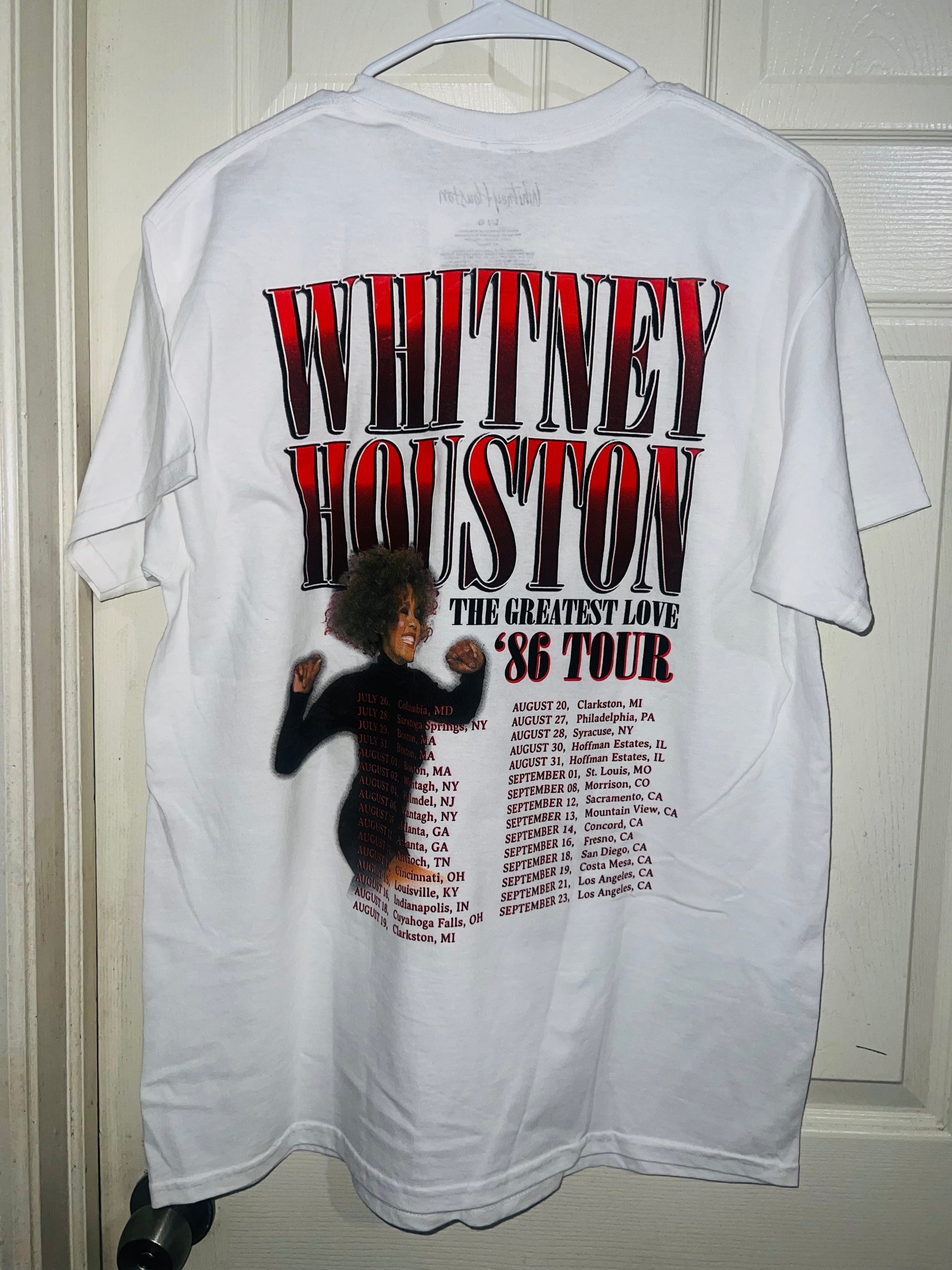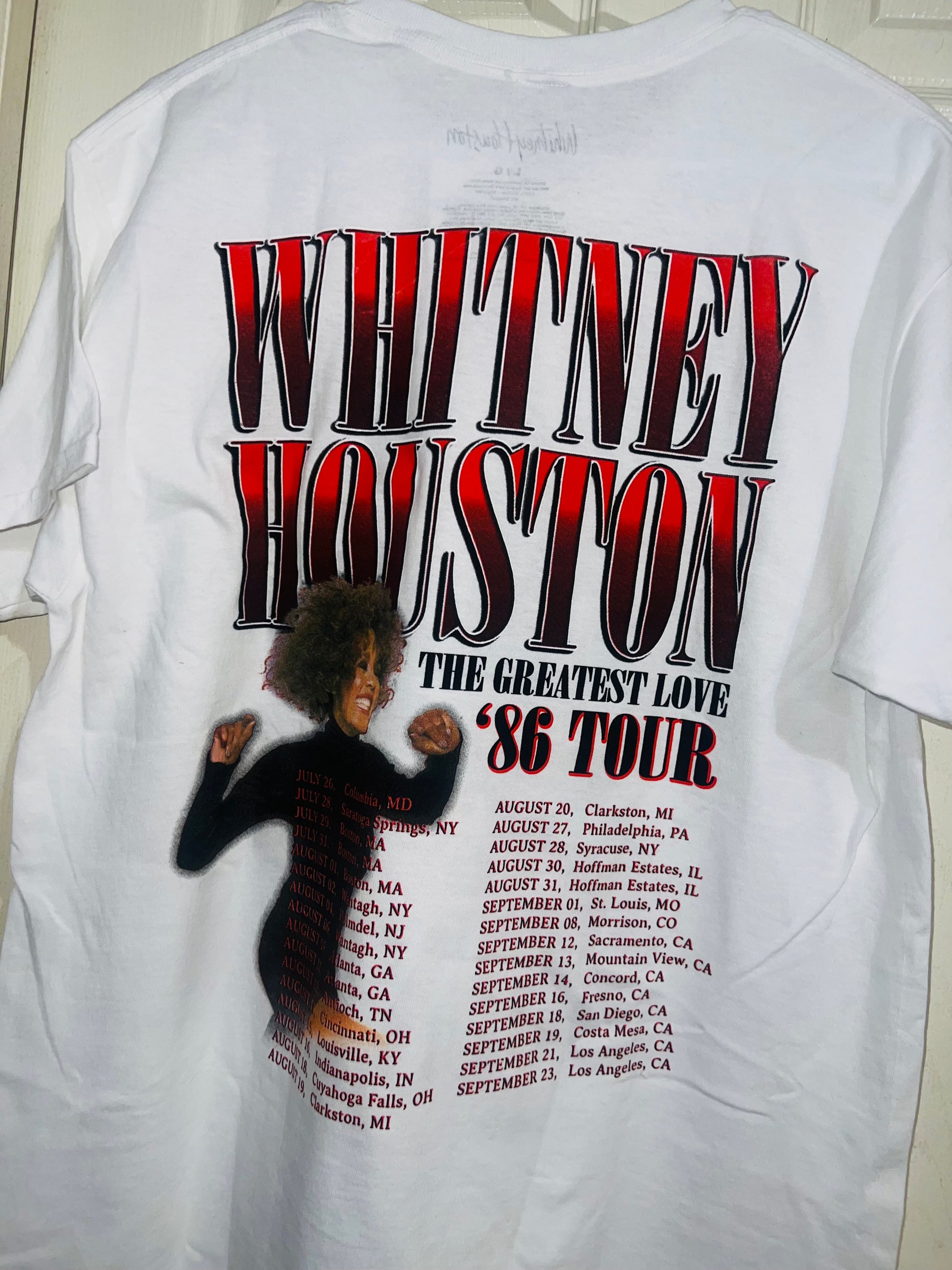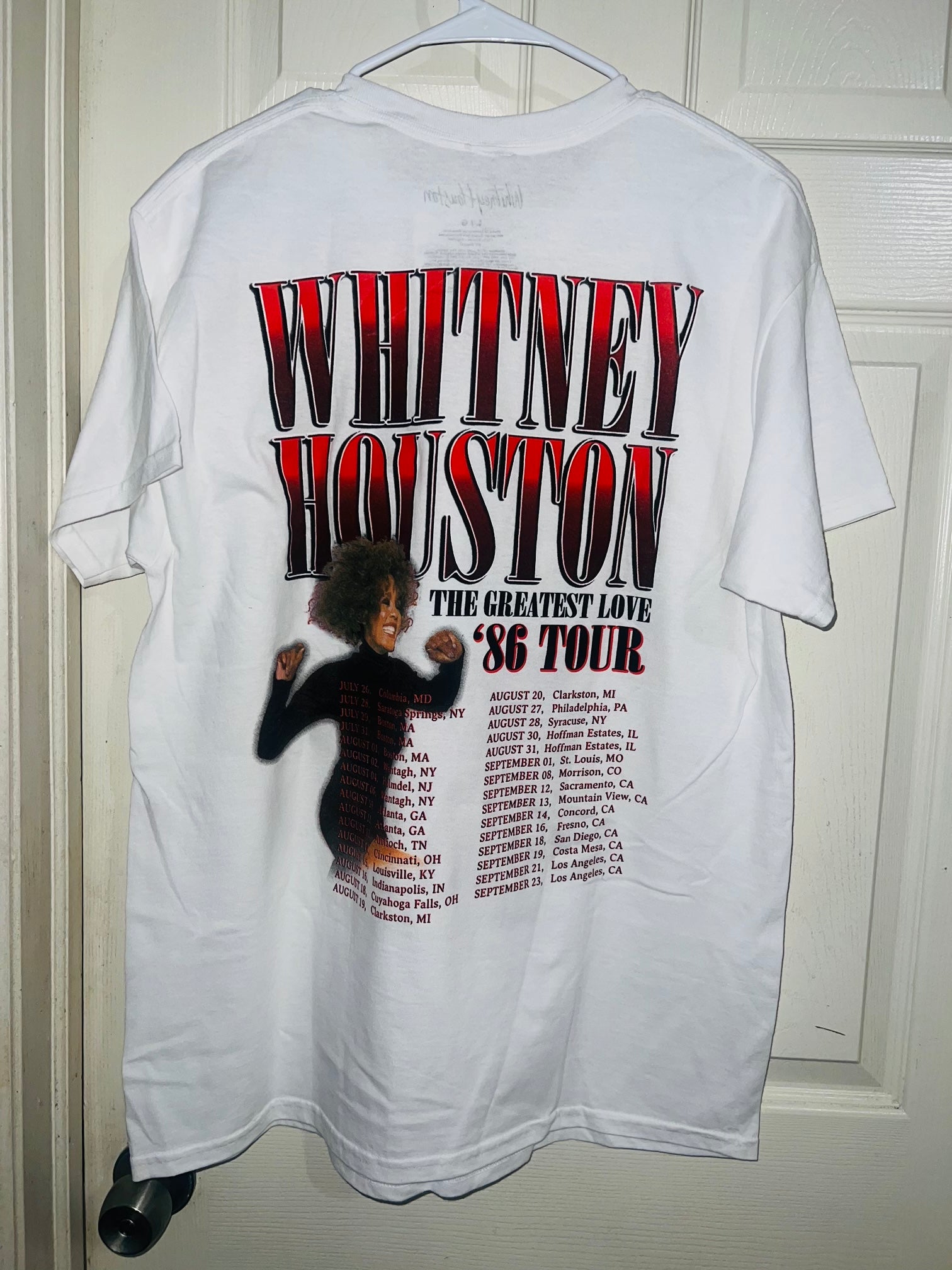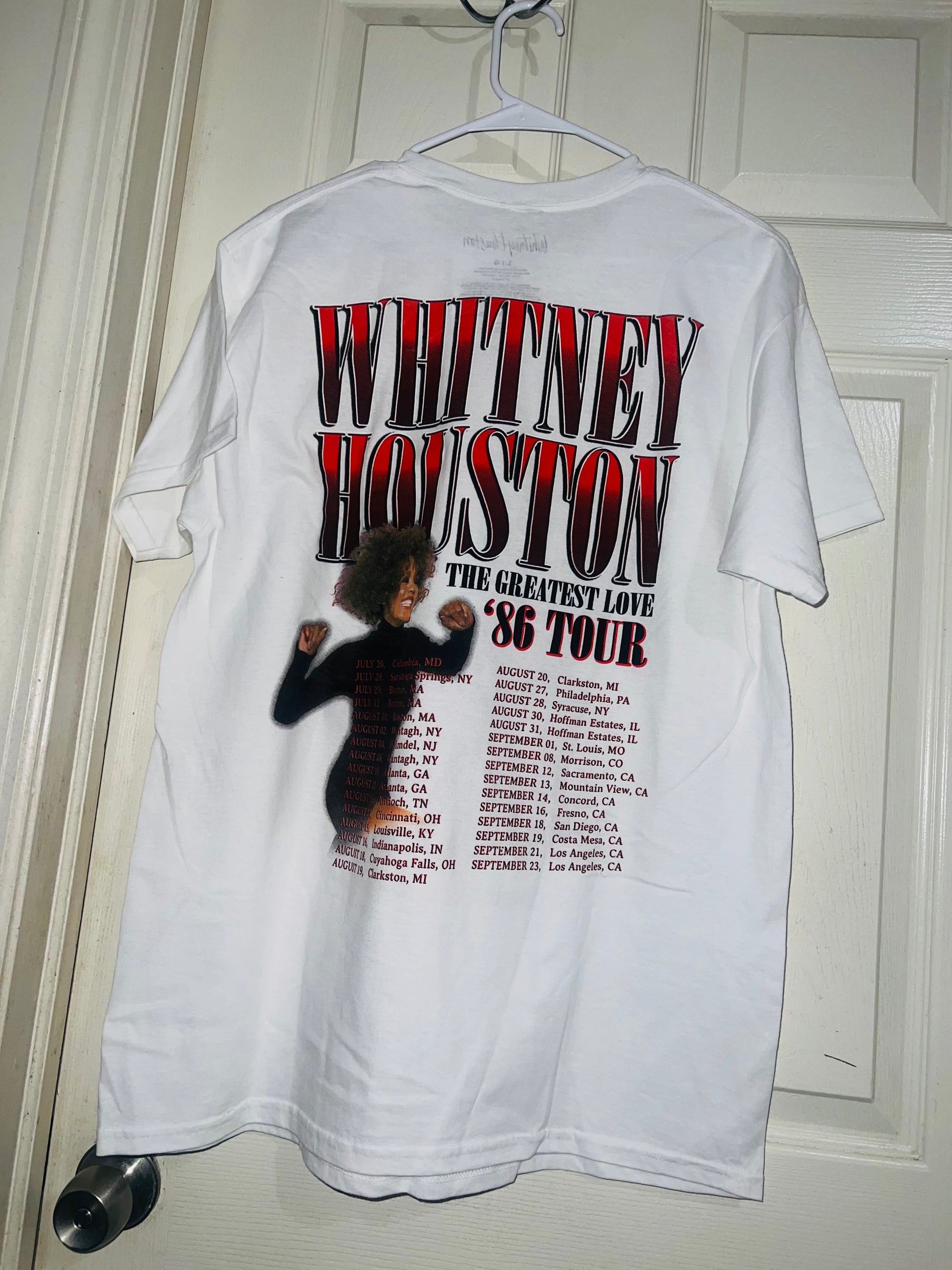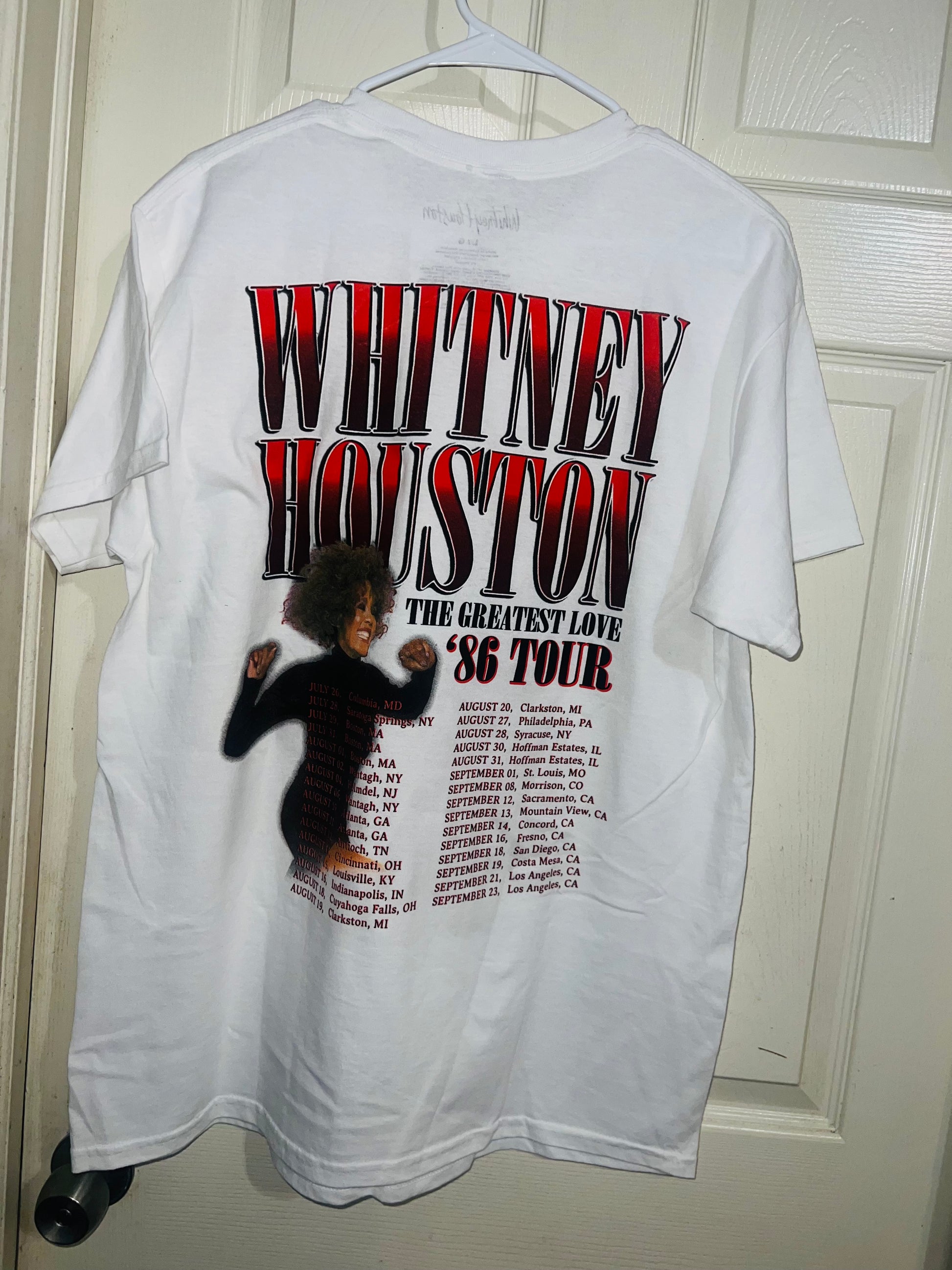 A white double sided Whitney Houston “The Greatest Love” 1986 Tour tee. On the back has a cool graphic with the cities and dates. Oversized, size L/XL.