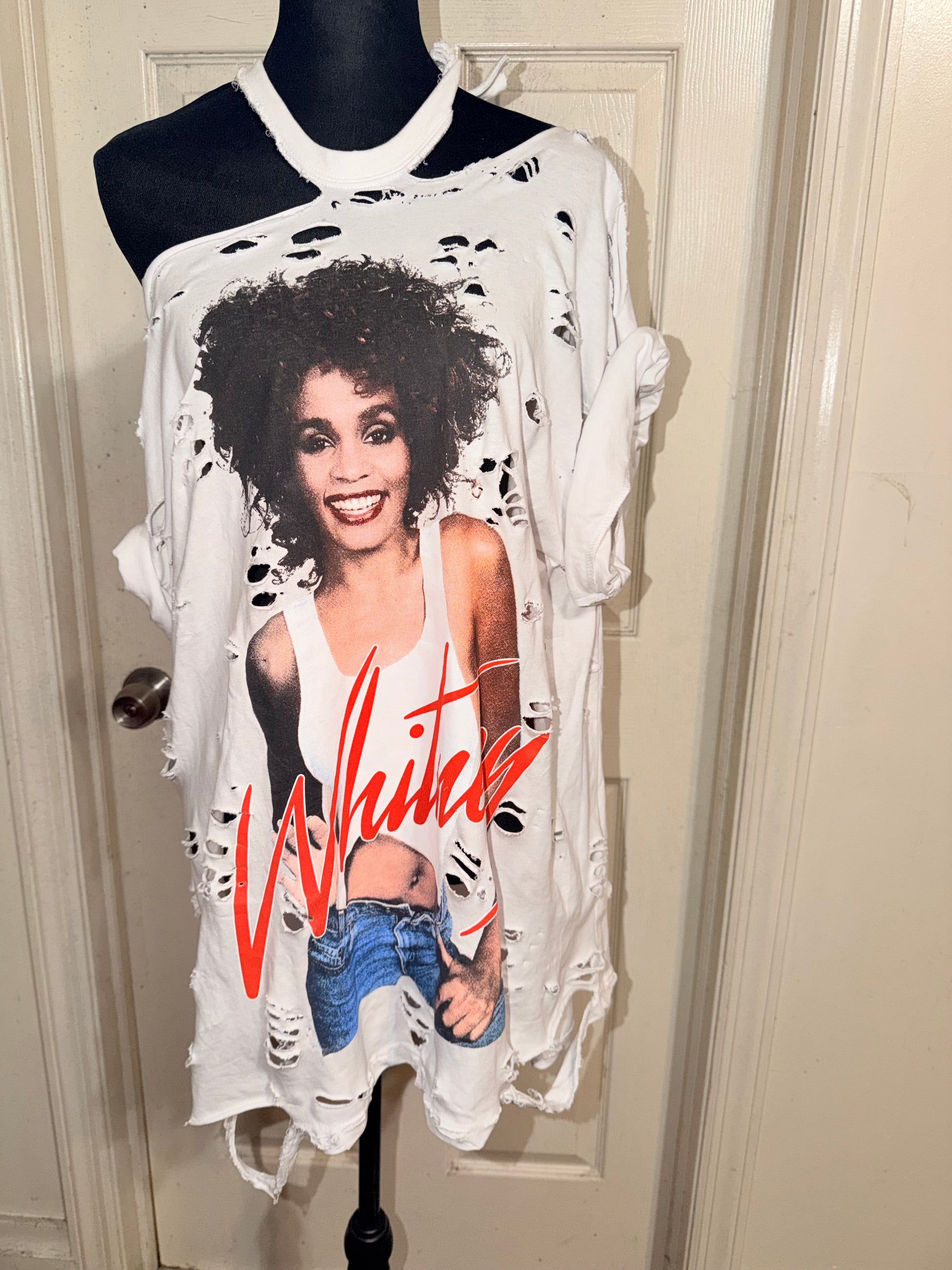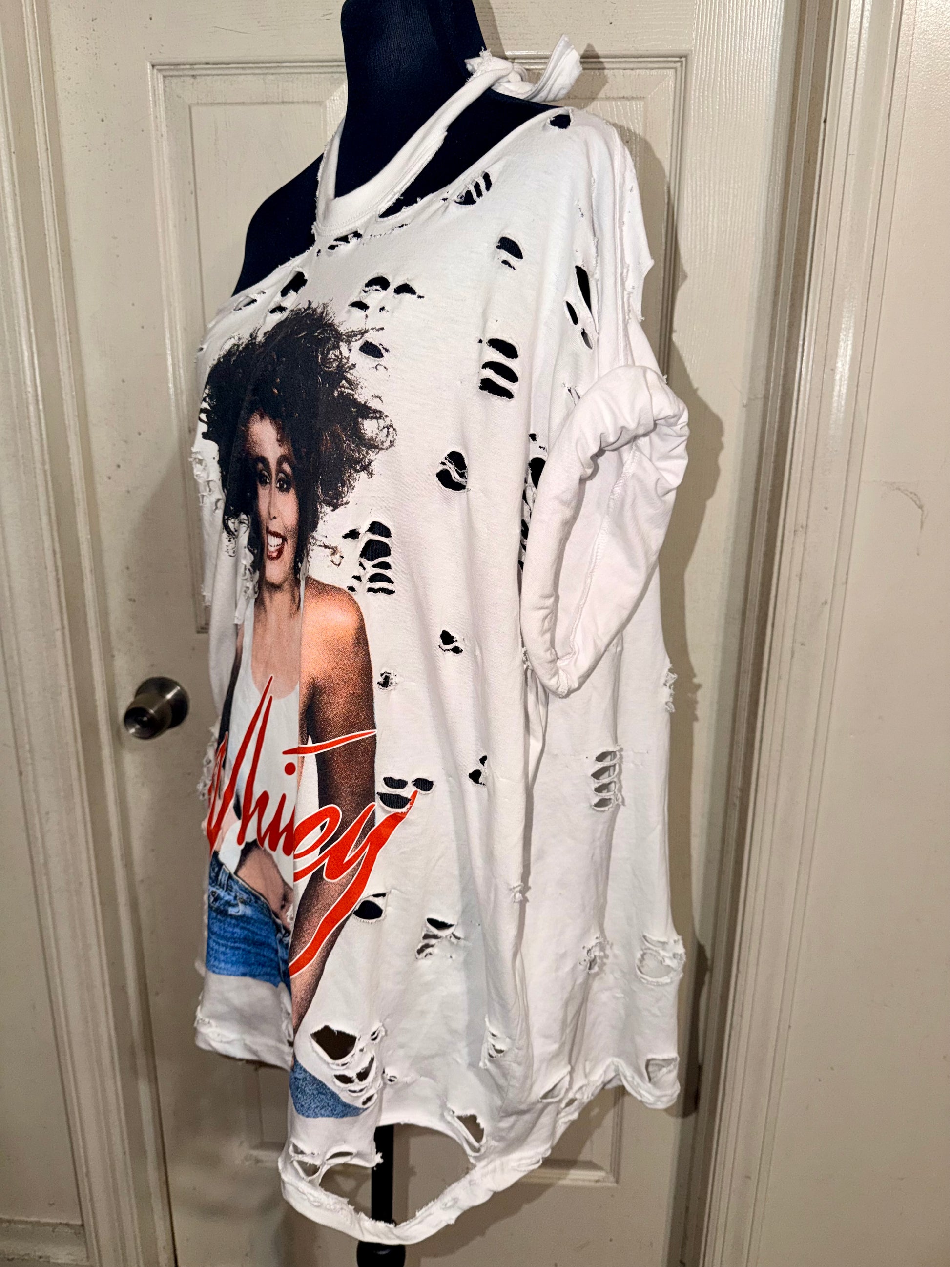 This is now a preorder. If you’d like distressed differently, there’s a different product link for that! A Whitney Houston white tee with the new redone “Like Kim” 2.0 neckline with a tied neck cut off of the shirt. Soo cute. Oversized. As is.